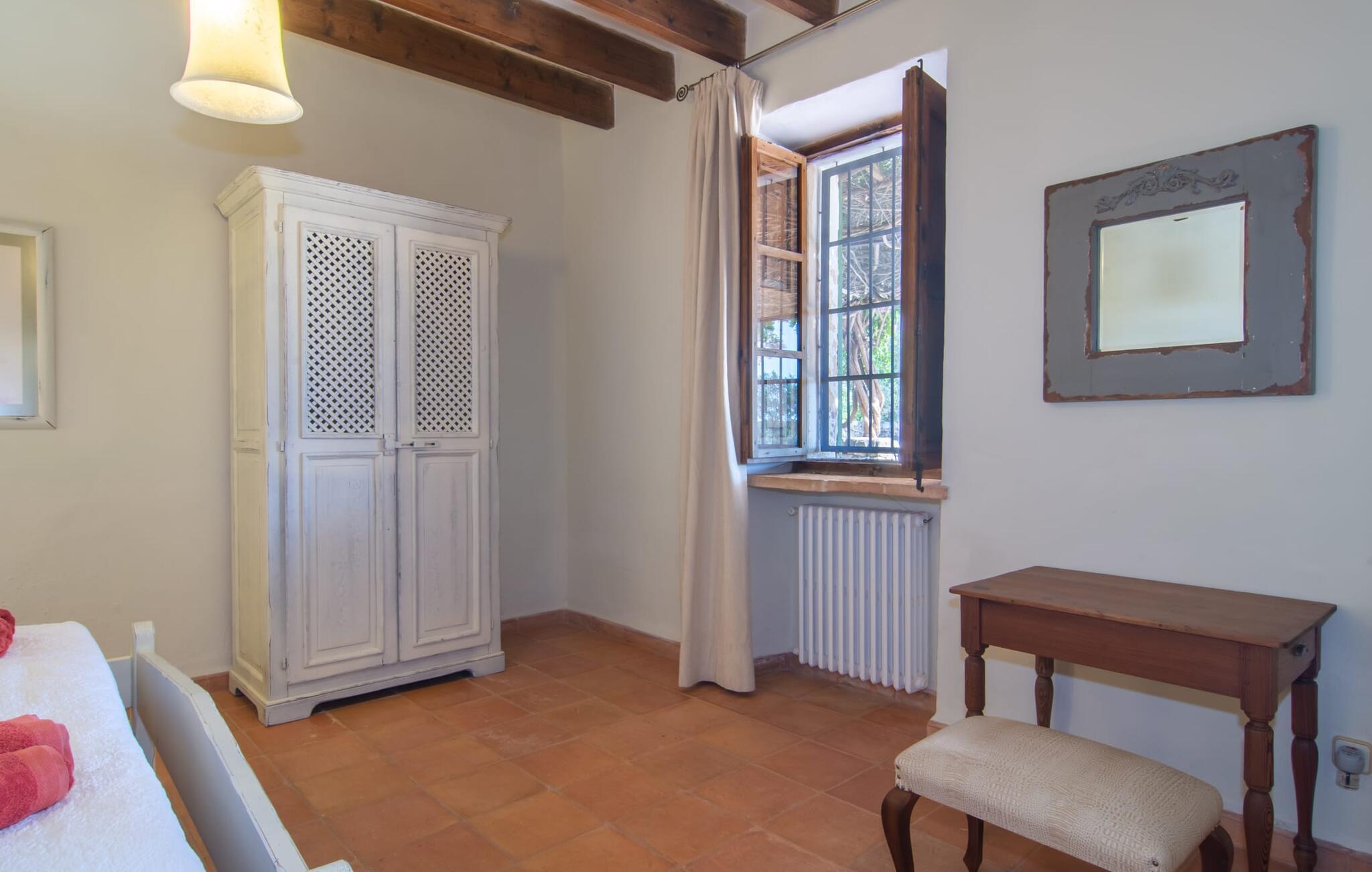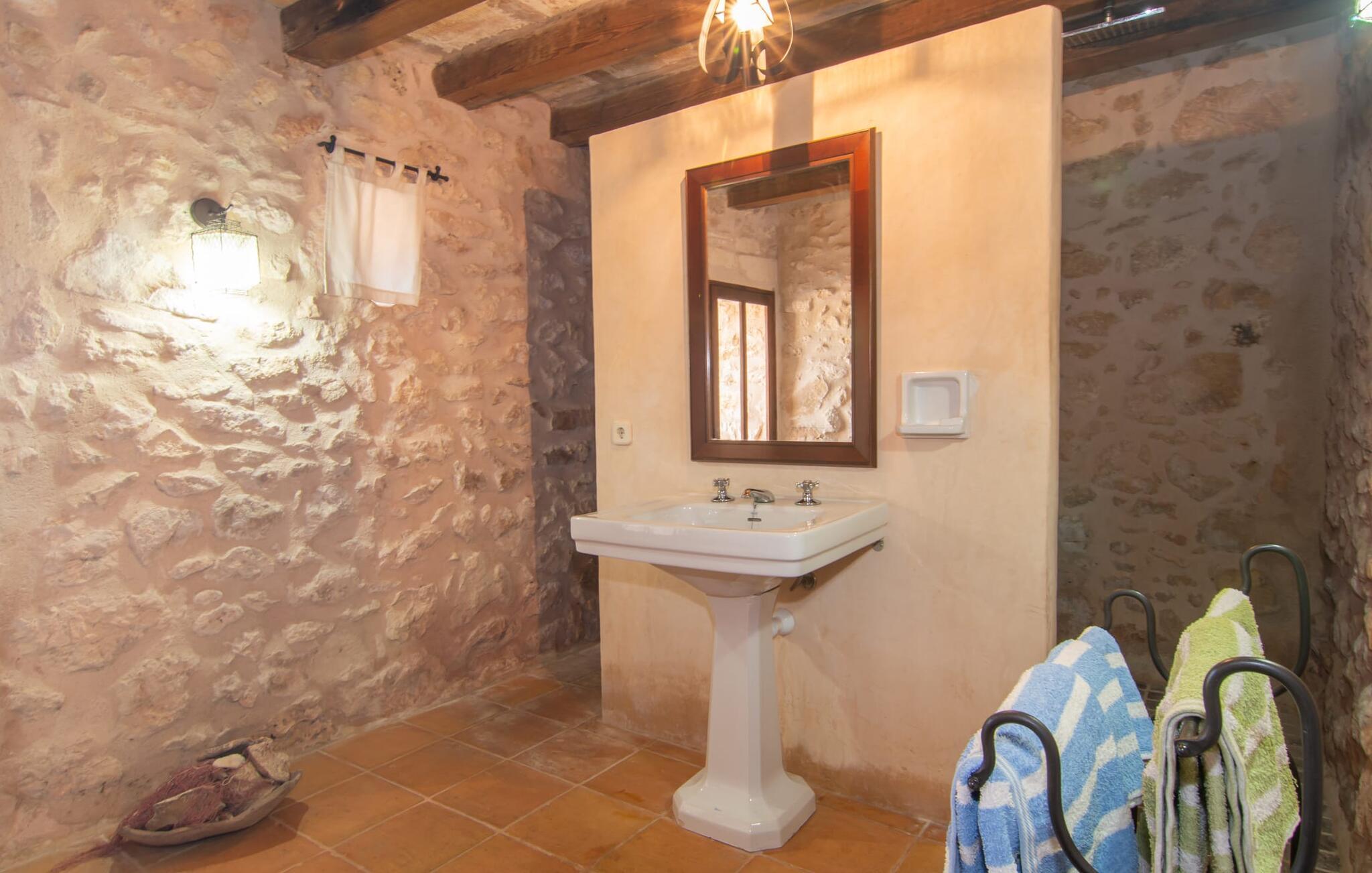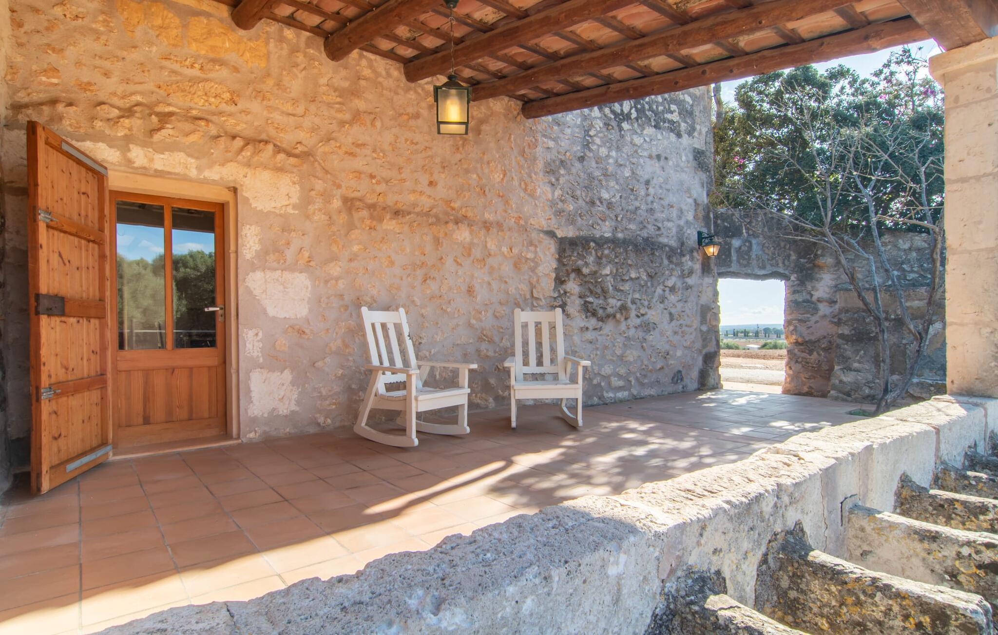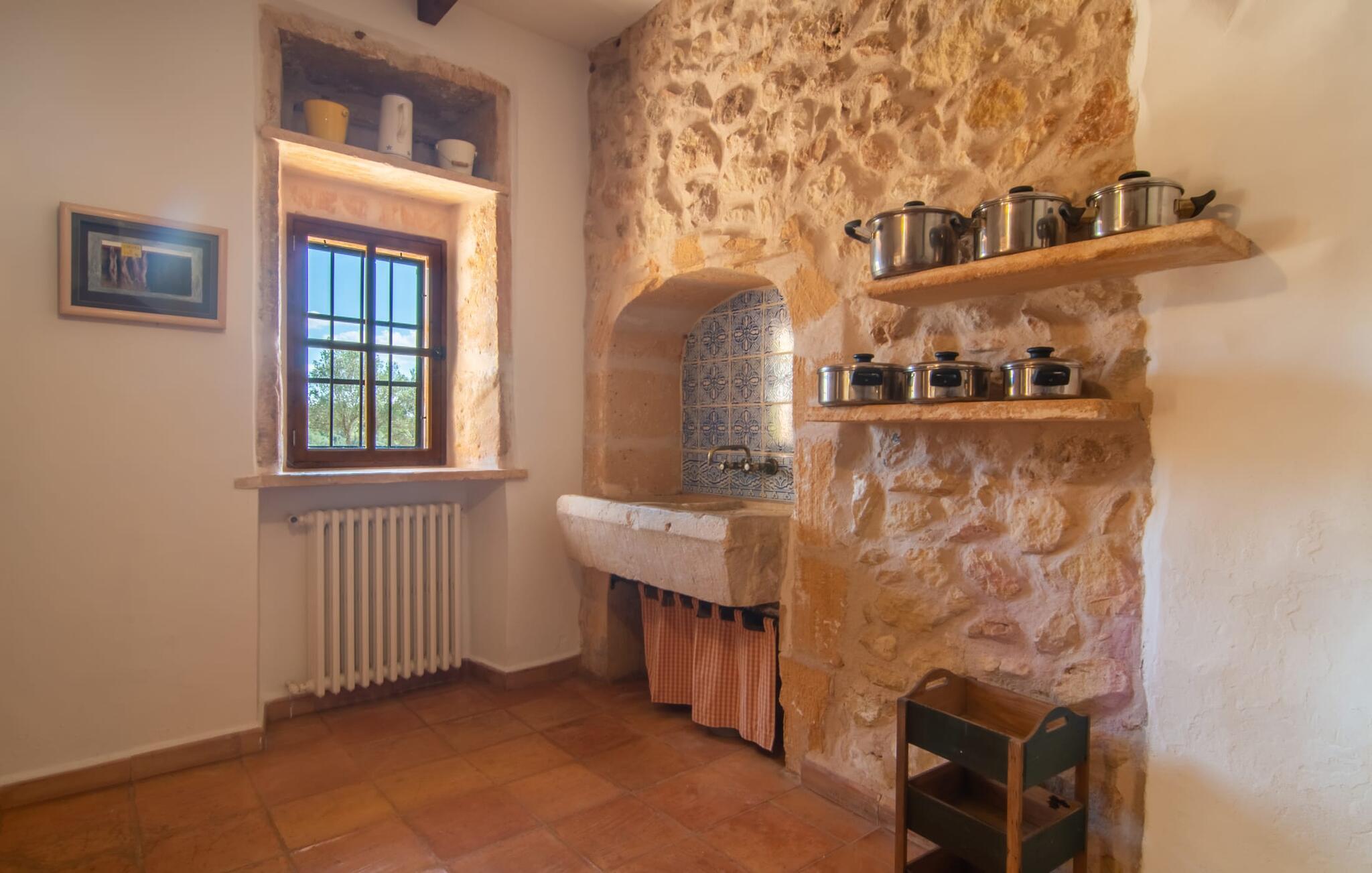 Langs den rustikke snoede sti mod Villa "Conies Vell" står det hurtigt klart, at der er tale om et virkelig elegant feriehus. Den rummelige, velholdte ejendom vil straks imponere jer, ligesom selve den herskabelige ejendom, der på mange sider er omgivet af brugbare terrasser og en idyllisk have. De høje palmer i den rummelige gårdhave samt de forskellige udendørs elementer, der er samlet omkring dette sted, er en sand fryd for øjet. Her venter en grøn græsplæne, som er et godt sted for små feriegæster at løbe rundt og lege. På den rummelige terrasse, der strækker sig over flere sider af huset, kan I nyde, hvad I vil, enten i det fri eller alternativt under det smukke, naturlige tag. Under de tætte vinstokke sidder I direkte ved huset og samtidig i umiddelbar nærhed af poolen, som I kan se evt. Et rundt spisebord med stole inviterer jer til at spise i en hyggelig atmosfære. Den åbne stue og spisestue i den lille tilstødende bygning er mindst lige så attraktiv. Her kan I slappe helt af i det helt afkølede sofahjørne eller sidde ved spisebordet. Det direkte tilstødende udendørs køkken og grill giver jer mulighed for at tilberede mad al fresco og tilbringe hele dagen udendørs i varmt vejr. Om aftenen er dette simpelthen et vidunderligt sted at afslutte en tilfredsstillende dag. Der er endda lys her! De sportsentusiaster blandt jer vil nyde at spille en eller to kampe på det mobile bordtennisbord, samt spille basketballkurven i gården. Et ord om poolen: Den 10 m lange pool er flisebelagt i en lys nuance af blå og varierer i dybden mellem 0,6 og 1,8 m. Den omkringliggende terrasse er udstyret med i alt otte komfortable liggestole, som I kan nyde solen på stråler af hjertens lyst nyde og samtidig komme jer fra en hektisk hverdag. To parasoller er tilgængelige, hvis det er nødvendigt for at beskytte jer mod stærke UV-stråler. Der er en parkeringsplads til jeres lejebil lige ved siden af bygningen. Og bag huset bor der et yndigt æsel i hans fold. Den større vej ligger 500 m fra villaen, men der er næsten ingen trafik. En spisestue indrettet i landlig stil, som er tilgængelig direkte fra husets terrasse, byder sine besøgende velkommen med et lyst og meget hjemligt præg. Dette værelse er indrettet både økonomisk og smagfuldt, så det behagelige indtryk af rummelighed og overskuelighed ikke er gået på kompromis på nogen måde. Hvide vægge og lofter, naturfarvede synlige bjælker og terracottafarvede gulvfliser skaber et meget harmonisk samspil, som suppleres af originale vintage-stykker og skaber en unik stemning. Gennem en bred bue kommer I ind i den hyggelige stue, hvor en munter, farverig sofa inviterer til afslapning. Det store fladskærms-tv med satellitforbindelse er tilgængeligt samt det lille musikanlæg og er til rådighed for gode underholdningsmuligheder. I vil måske også fordybe jer i en god bog eller en god samtale. Køkkenet, som også er tilgængeligt fra spisestuen, er udstyret med alt hvad I behøver til daglige behov, herunder en kedel og en Nespresso/espressomaskine. Meget individuelt og drømmende designede soveværelser tilbyder ikke kun plads nok til alle, der rejser med jer, men tilbyder også noget for enhver smag og sikrer en afslappende søvn. Der er et separat soveværelse med badeværelse, som kun er tilgængeligt udefra og derfor giver en helt unik mulighed for at trække sig tilbage og finde ro. Generelt er badeværelserne rummelige og ikke kun praktiske, men også æstetisk designet. Hårtørrere og strygejern er til rådighed i huset, så I ikke behøver at bekymre jer om at tage jeres egen med hjemmefra. Myggenet er også tilgængelige for jeres komfort. Fra villaen kan I nå centrum af Manacor på få minutter i bil. Her kan I opleve det ugentlige marked hver mandag. Porto Cristo er omkring 16 kilometer væk. Der finder I flere store supermarkeder, hvoraf nogle endda har åbent på søndage og helligdage. Den maleriske promenade inviterer jer til at tage en afslappet spadseretur. Nogle nærliggende strande betragtes stadig som rigtige insidertips og er kendetegnet ved, at de er ubebyggede. Den rummelige villa "Conies Vell" har en charmerende landlig beliggenhed og er omgivet af en kæmpe grund. Et supermarked og et bageri ligger kun 5 minutter væk i bil. Den smukke bugt Cala Varques ligger omkring 17 kilometer væk. Andre strande som Cala Mandia ligger i samme afstand.