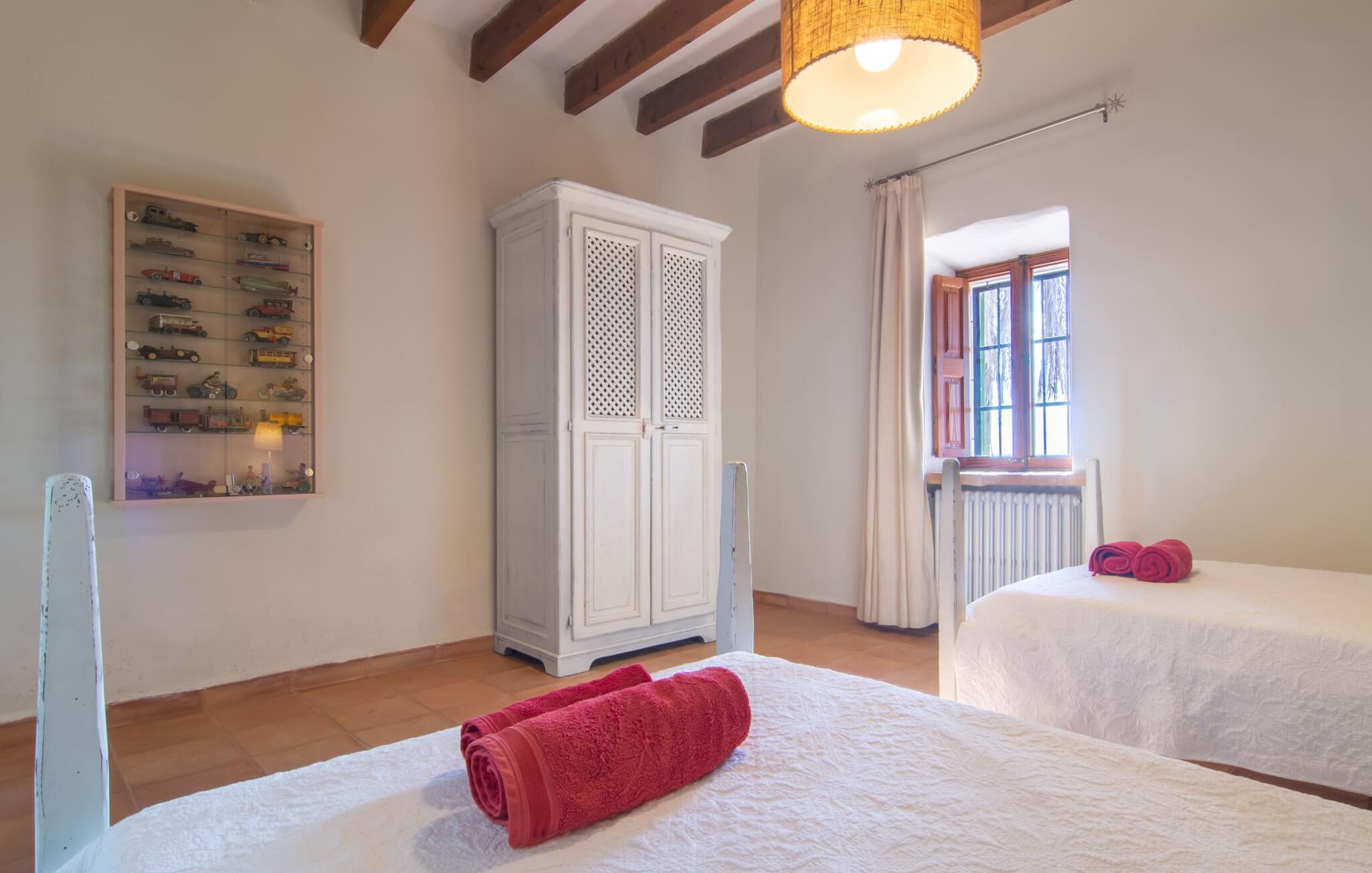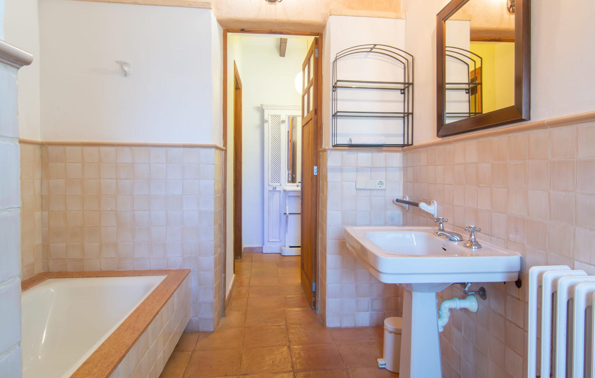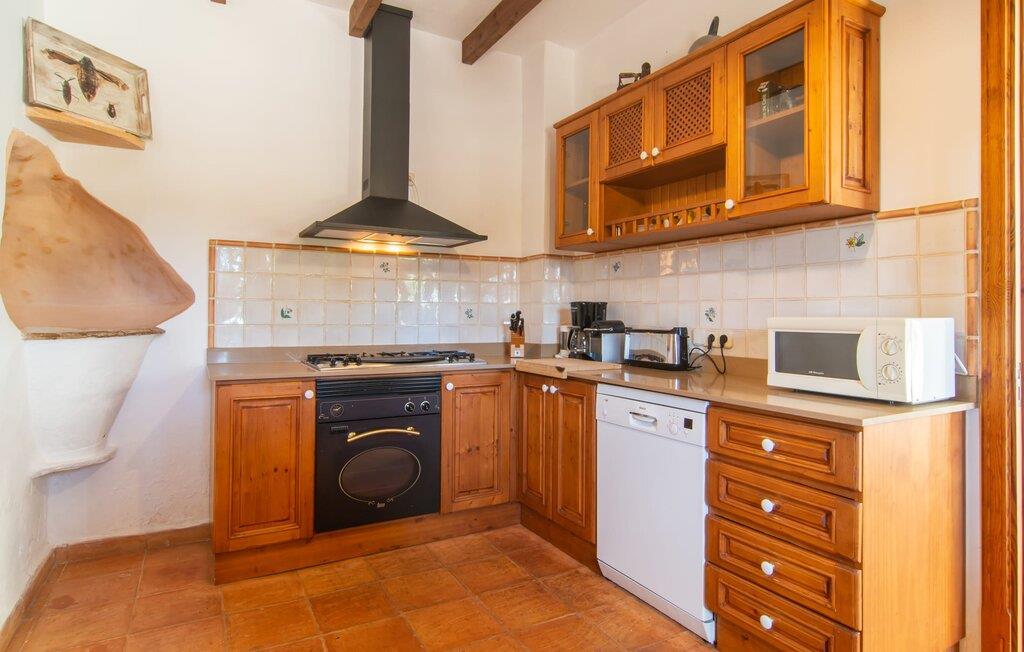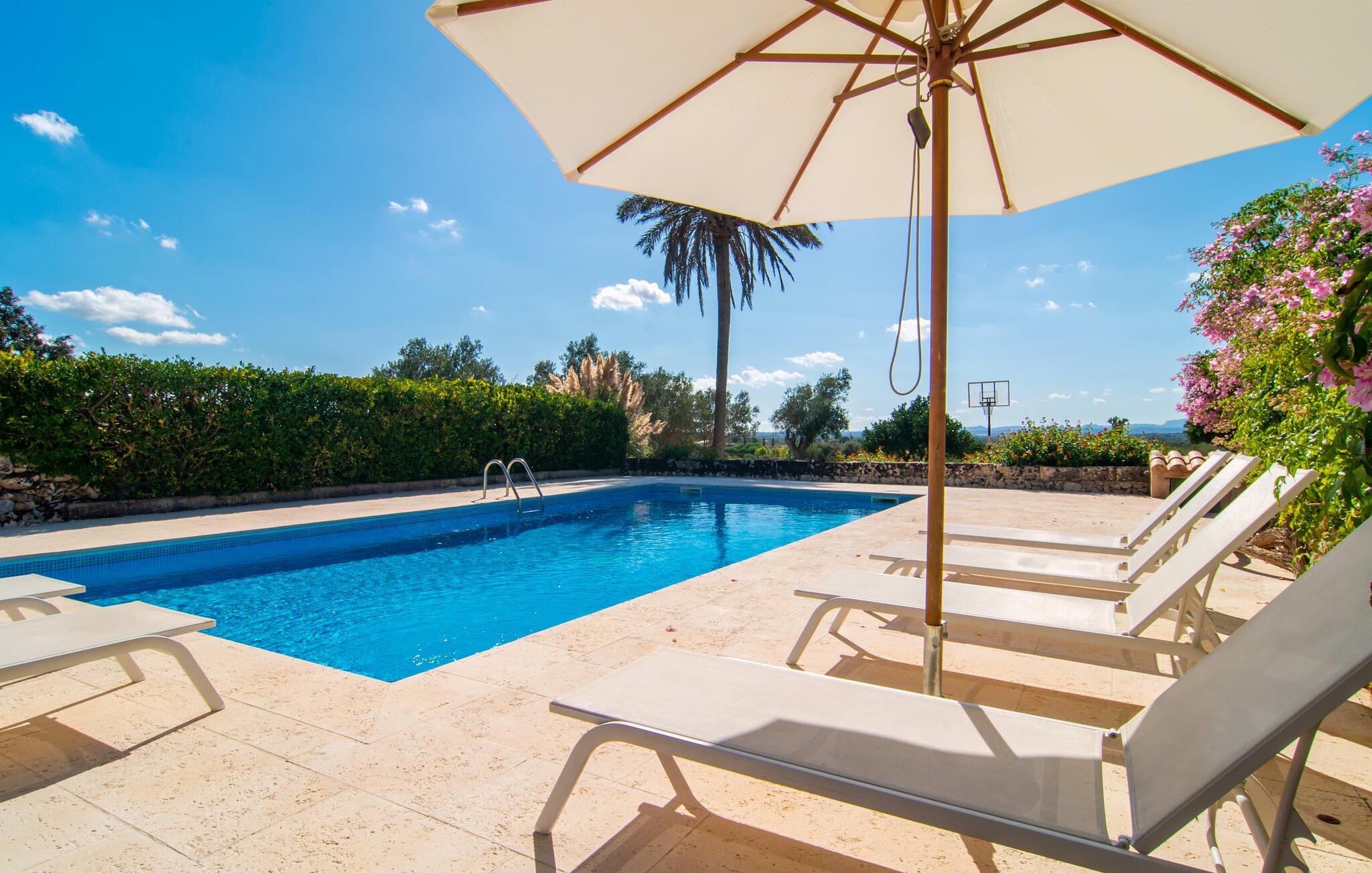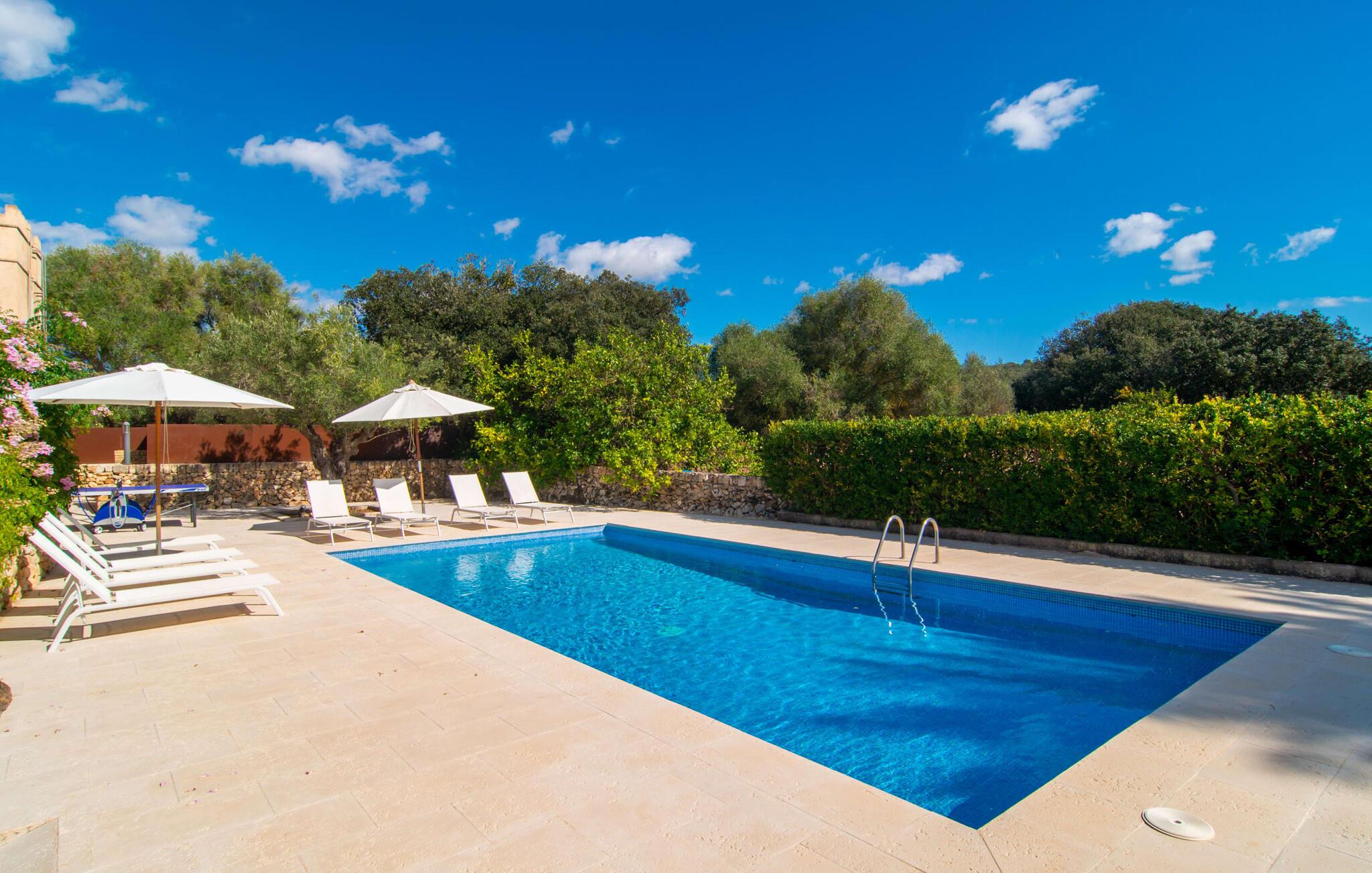 Langs den rustikke snoede sti mod Villa "Conies Vell" står det hurtigt klart, at der er tale om et virkelig elegant feriehus. Den rummelige, velholdte ejendom vil straks imponere jer, ligesom selve den herskabelige ejendom, der på mange sider er omgivet af brugbare terrasser og en idyllisk have. De høje palmer i den rummelige gårdhave samt de forskellige udendørs elementer, der er samlet omkring dette sted, er en sand fryd for øjet. Her venter en grøn græsplæne, som er et godt sted for små feriegæster at løbe rundt og lege. På den rummelige terrasse, der strækker sig over flere sider af huset, kan I nyde, hvad I vil, enten i det fri eller alternativt under det smukke, naturlige tag. Under de tætte vinstokke sidder I direkte ved huset og samtidig i umiddelbar nærhed af poolen, som I kan se evt. Et rundt spisebord med stole inviterer jer til at spise i en hyggelig atmosfære. Den åbne stue og spisestue i den lille tilstødende bygning er mindst lige så attraktiv. Her kan I slappe helt af i det helt afkølede sofahjørne eller sidde ved spisebordet. Det direkte tilstødende udendørs køkken og grill giver jer mulighed for at tilberede mad al fresco og tilbringe hele dagen udendørs i varmt vejr. Om aftenen er dette simpelthen et vidunderligt sted at afslutte en tilfredsstillende dag. Der er endda lys her! De sportsentusiaster blandt jer vil nyde at spille en eller to kampe på det mobile bordtennisbord, samt spille basketballkurven i gården. Et ord om poolen: Den 10 m lange pool er flisebelagt i en lys nuance af blå og varierer i dybden mellem 0,6 og 1,8 m. Den omkringliggende terrasse er udstyret med i alt otte komfortable liggestole, som I kan nyde solen på stråler af hjertens lyst nyde og samtidig komme jer fra en hektisk hverdag. To parasoller er tilgængelige, hvis det er nødvendigt for at beskytte jer mod stærke UV-stråler. Der er en parkeringsplads til jeres lejebil lige ved siden af bygningen. Og bag huset bor der et yndigt æsel i hans fold. Den større vej ligger 500 m fra villaen, men der er næsten ingen trafik. En spisestue indrettet i landlig stil, som er tilgængelig direkte fra husets terrasse, byder sine besøgende velkommen med et lyst og meget hjemligt præg. Dette værelse er indrettet både økonomisk og smagfuldt, så det behagelige indtryk af rummelighed og overskuelighed ikke er gået på kompromis på nogen måde. Hvide vægge og lofter, naturfarvede synlige bjælker og terracottafarvede gulvfliser skaber et meget harmonisk samspil, som suppleres af originale vintage-stykker og skaber en unik stemning. Gennem en bred bue kommer I ind i den hyggelige stue, hvor en munter, farverig sofa inviterer til afslapning. Det store fladskærms-tv med satellitforbindelse er tilgængeligt samt det lille musikanlæg og er til rådighed for gode underholdningsmuligheder. I vil måske også fordybe jer i en god bog eller en god samtale. Køkkenet, som også er tilgængeligt fra spisestuen, er udstyret med alt hvad I behøver til daglige behov, herunder en kedel og en Nespresso/espressomaskine. Meget individuelt og drømmende designede soveværelser tilbyder ikke kun plads nok til alle, der rejser med jer, men tilbyder også noget for enhver smag og sikrer en afslappende søvn. Der er et separat soveværelse med badeværelse, som kun er tilgængeligt udefra og derfor giver en helt unik mulighed for at trække sig tilbage og finde ro. Generelt er badeværelserne rummelige og ikke kun praktiske, men også æstetisk designet. Hårtørrere og strygejern er til rådighed i huset, så I ikke behøver at bekymre jer om at tage jeres egen med hjemmefra. Myggenet er også tilgængelige for jeres komfort. Fra villaen kan I nå centrum af Manacor på få minutter i bil. Her kan I opleve det ugentlige marked hver mandag. Porto Cristo er omkring 16 kilometer væk. Der finder I flere store supermarkeder, hvoraf nogle endda har åbent på søndage og helligdage. Den maleriske promenade inviterer jer til at tage en afslappet spadseretur. Nogle nærliggende strande betragtes stadig som rigtige insidertips og er kendetegnet ved, at de er ubebyggede. Den rummelige villa "Conies Vell" har en charmerende landlig beliggenhed og er omgivet af en kæmpe grund. Et supermarked og et bageri ligger kun 5 minutter væk i bil. Den smukke bugt Cala Varques ligger omkring 17 kilometer væk. Andre strande som Cala Mandia ligger i samme afstand.