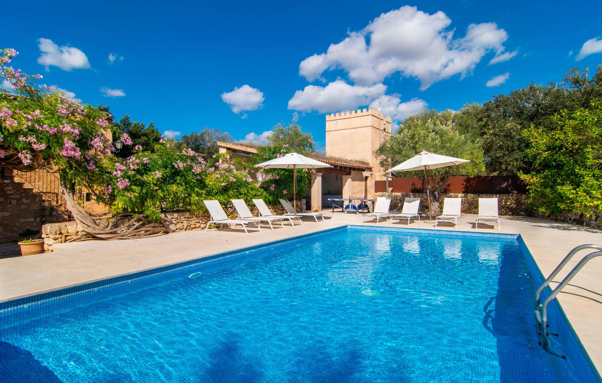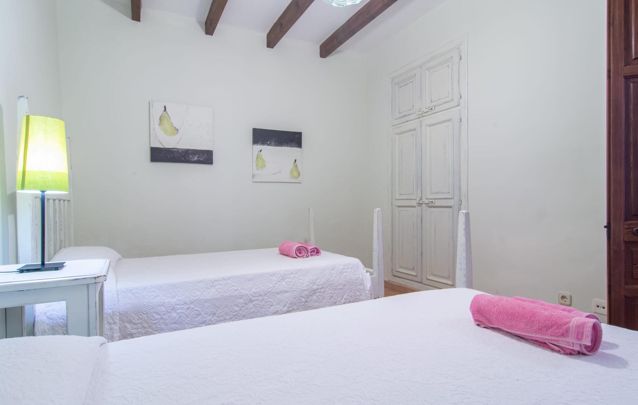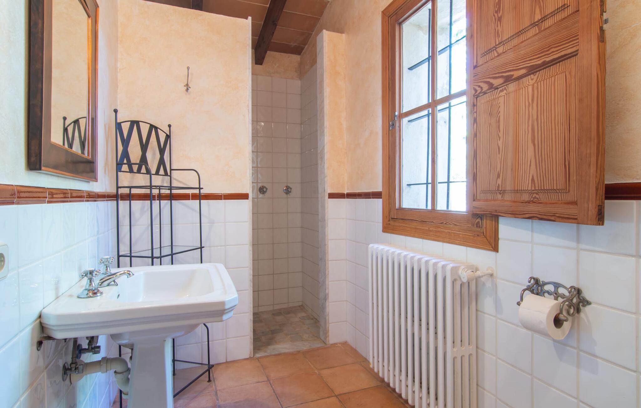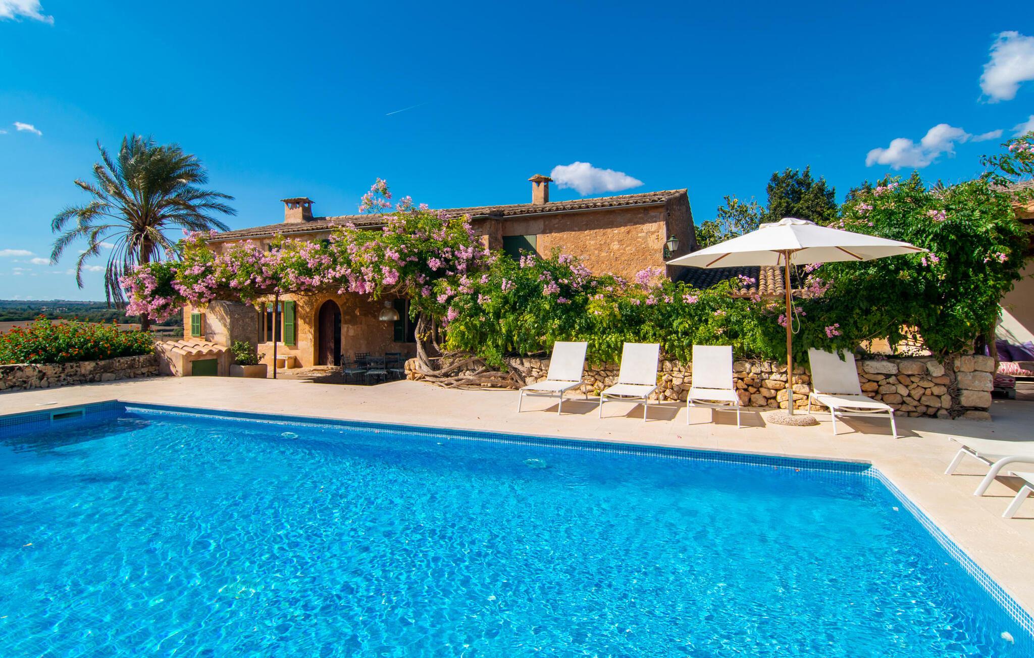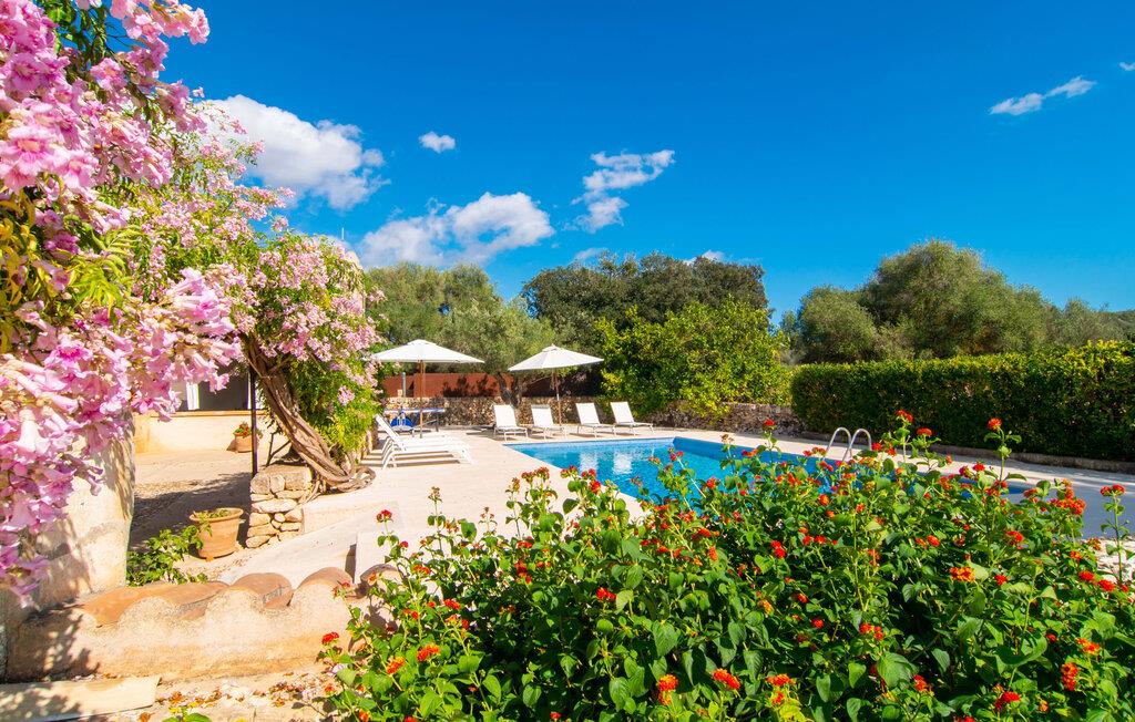 Langs den rustikke snoede sti mod Villa "Conies Vell" står det hurtigt klart, at der er tale om et virkelig elegant feriehus. Den rummelige, velholdte ejendom vil straks imponere jer, ligesom selve den herskabelige ejendom, der på mange sider er omgivet af brugbare terrasser og en idyllisk have. De høje palmer i den rummelige gårdhave samt de forskellige udendørs elementer, der er samlet omkring dette sted, er en sand fryd for øjet. Her venter en grøn græsplæne, som er et godt sted for små feriegæster at løbe rundt og lege. På den rummelige terrasse, der strækker sig over flere sider af huset, kan I nyde, hvad I vil, enten i det fri eller alternativt under det smukke, naturlige tag. Under de tætte vinstokke sidder I direkte ved huset og samtidig i umiddelbar nærhed af poolen, som I kan se evt. Et rundt spisebord med stole inviterer jer til at spise i en hyggelig atmosfære. Den åbne stue og spisestue i den lille tilstødende bygning er mindst lige så attraktiv. Her kan I slappe helt af i det helt afkølede sofahjørne eller sidde ved spisebordet. Det direkte tilstødende udendørs køkken og grill giver jer mulighed for at tilberede mad al fresco og tilbringe hele dagen udendørs i varmt vejr. Om aftenen er dette simpelthen et vidunderligt sted at afslutte en tilfredsstillende dag. Der er endda lys her! De sportsentusiaster blandt jer vil nyde at spille en eller to kampe på det mobile bordtennisbord, samt spille basketballkurven i gården. Et ord om poolen: Den 10 m lange pool er flisebelagt i en lys nuance af blå og varierer i dybden mellem 0,6 og 1,8 m. Den omkringliggende terrasse er udstyret med i alt otte komfortable liggestole, som I kan nyde solen på stråler af hjertens lyst nyde og samtidig komme jer fra en hektisk hverdag. To parasoller er tilgængelige, hvis det er nødvendigt for at beskytte jer mod stærke UV-stråler. Der er en parkeringsplads til jeres lejebil lige ved siden af bygningen. Og bag huset bor der et yndigt æsel i hans fold. Den større vej ligger 500 m fra villaen, men der er næsten ingen trafik. En spisestue indrettet i landlig stil, som er tilgængelig direkte fra husets terrasse, byder sine besøgende velkommen med et lyst og meget hjemligt præg. Dette værelse er indrettet både økonomisk og smagfuldt, så det behagelige indtryk af rummelighed og overskuelighed ikke er gået på kompromis på nogen måde. Hvide vægge og lofter, naturfarvede synlige bjælker og terracottafarvede gulvfliser skaber et meget harmonisk samspil, som suppleres af originale vintage-stykker og skaber en unik stemning. Gennem en bred bue kommer I ind i den hyggelige stue, hvor en munter, farverig sofa inviterer til afslapning. Det store fladskærms-tv med satellitforbindelse er tilgængeligt samt det lille musikanlæg og er til rådighed for gode underholdningsmuligheder. I vil måske også fordybe jer i en god bog eller en god samtale. Køkkenet, som også er tilgængeligt fra spisestuen, er udstyret med alt hvad I behøver til daglige behov, herunder en kedel og en Nespresso/espressomaskine. Meget individuelt og drømmende designede soveværelser tilbyder ikke kun plads nok til alle, der rejser med jer, men tilbyder også noget for enhver smag og sikrer en afslappende søvn. Der er et separat soveværelse med badeværelse, som kun er tilgængeligt udefra og derfor giver en helt unik mulighed for at trække sig tilbage og finde ro. Generelt er badeværelserne rummelige og ikke kun praktiske, men også æstetisk designet. Hårtørrere og strygejern er til rådighed i huset, så I ikke behøver at bekymre jer om at tage jeres egen med hjemmefra. Myggenet er også tilgængelige for jeres komfort. Fra villaen kan I nå centrum af Manacor på få minutter i bil. Her kan I opleve det ugentlige marked hver mandag. Porto Cristo er omkring 16 kilometer væk. Der finder I flere store supermarkeder, hvoraf nogle endda har åbent på søndage og helligdage. Den maleriske promenade inviterer jer til at tage en afslappet spadseretur. Nogle nærliggende strande betragtes stadig som rigtige insidertips og er kendetegnet ved, at de er ubebyggede. Den rummelige villa "Conies Vell" har en charmerende landlig beliggenhed og er omgivet af en kæmpe grund. Et supermarked og et bageri ligger kun 5 minutter væk i bil. Den smukke bugt Cala Varques ligger omkring 17 kilometer væk. Andre strande som Cala Mandia ligger i samme afstand.