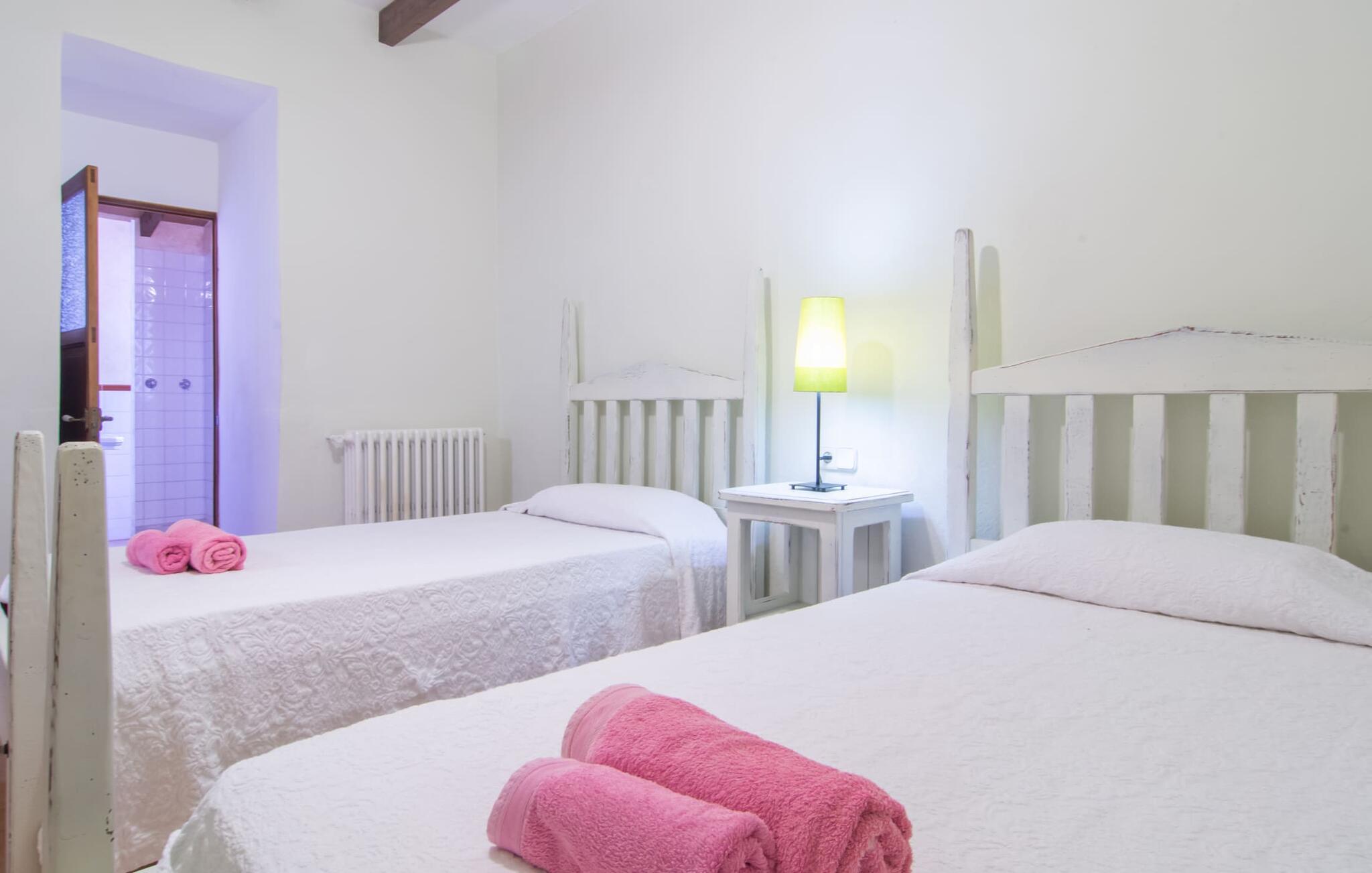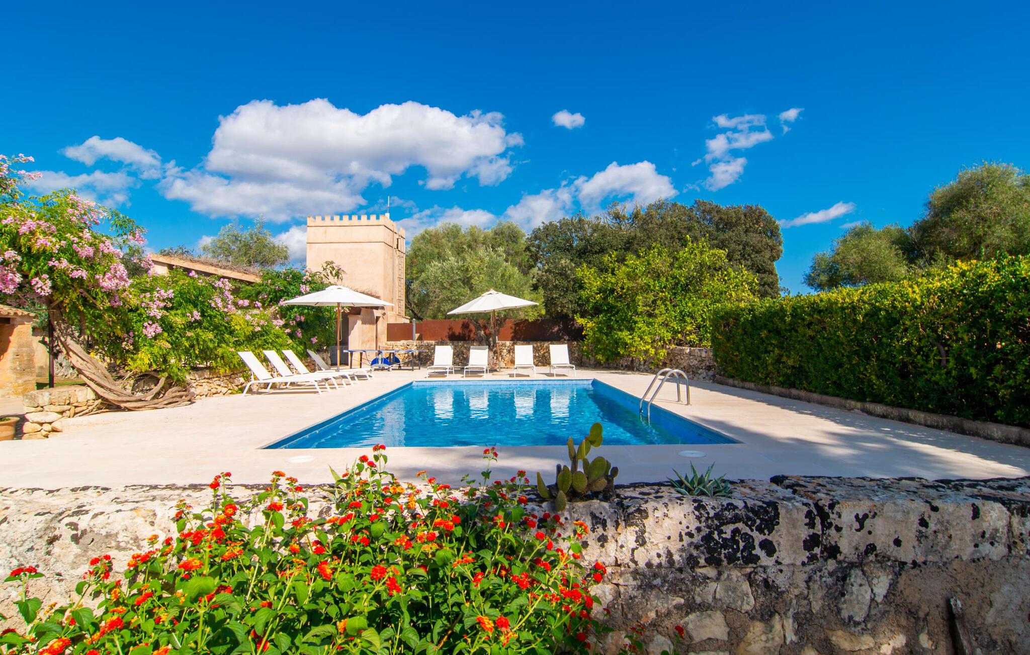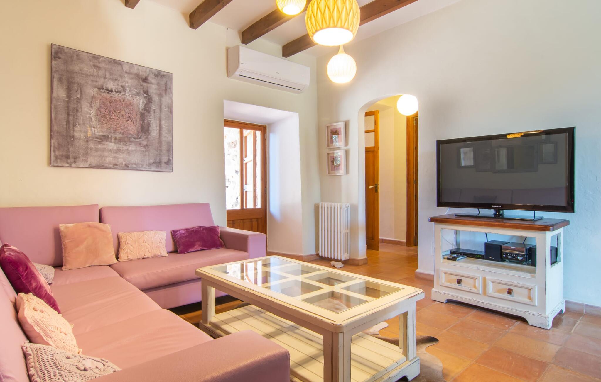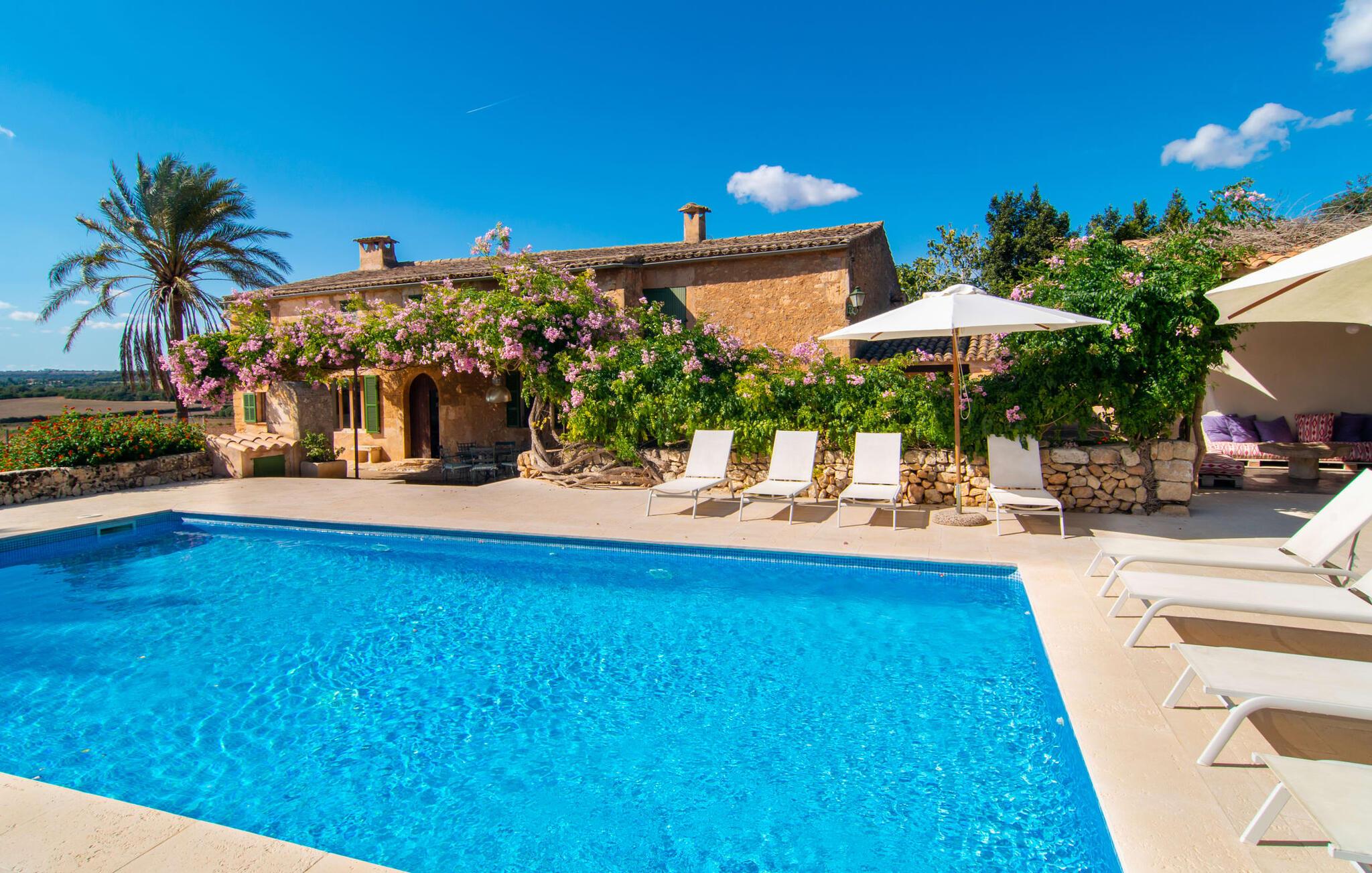 Langs den rustikke snoede sti mod Villa "Conies Vell" står det hurtigt klart, at der er tale om et virkelig elegant feriehus. Den rummelige, velholdte ejendom vil straks imponere jer, ligesom selve den herskabelige ejendom, der på mange sider er omgivet af brugbare terrasser og en idyllisk have. De høje palmer i den rummelige gårdhave samt de forskellige udendørs elementer, der er samlet omkring dette sted, er en sand fryd for øjet. Her venter en grøn græsplæne, som er et godt sted for små feriegæster at løbe rundt og lege. På den rummelige terrasse, der strækker sig over flere sider af huset, kan I nyde, hvad I vil, enten i det fri eller alternativt under det smukke, naturlige tag. Under de tætte vinstokke sidder I direkte ved huset og samtidig i umiddelbar nærhed af poolen, som I kan se evt. Et rundt spisebord med stole inviterer jer til at spise i en hyggelig atmosfære. Den åbne stue og spisestue i den lille tilstødende bygning er mindst lige så attraktiv. Her kan I slappe helt af i det helt afkølede sofahjørne eller sidde ved spisebordet. Det direkte tilstødende udendørs køkken og grill giver jer mulighed for at tilberede mad al fresco og tilbringe hele dagen udendørs i varmt vejr. Om aftenen er dette simpelthen et vidunderligt sted at afslutte en tilfredsstillende dag. Der er endda lys her! De sportsentusiaster blandt jer vil nyde at spille en eller to kampe på det mobile bordtennisbord, samt spille basketballkurven i gården. Et ord om poolen: Den 10 m lange pool er flisebelagt i en lys nuance af blå og varierer i dybden mellem 0,6 og 1,8 m. Den omkringliggende terrasse er udstyret med i alt otte komfortable liggestole, som I kan nyde solen på stråler af hjertens lyst nyde og samtidig komme jer fra en hektisk hverdag. To parasoller er tilgængelige, hvis det er nødvendigt for at beskytte jer mod stærke UV-stråler. Der er en parkeringsplads til jeres lejebil lige ved siden af bygningen. Og bag huset bor der et yndigt æsel i hans fold. Den større vej ligger 500 m fra villaen, men der er næsten ingen trafik. En spisestue indrettet i landlig stil, som er tilgængelig direkte fra husets terrasse, byder sine besøgende velkommen med et lyst og meget hjemligt præg. Dette værelse er indrettet både økonomisk og smagfuldt, så det behagelige indtryk af rummelighed og overskuelighed ikke er gået på kompromis på nogen måde. Hvide vægge og lofter, naturfarvede synlige bjælker og terracottafarvede gulvfliser skaber et meget harmonisk samspil, som suppleres af originale vintage-stykker og skaber en unik stemning. Gennem en bred bue kommer I ind i den hyggelige stue, hvor en munter, farverig sofa inviterer til afslapning. Det store fladskærms-tv med satellitforbindelse er tilgængeligt samt det lille musikanlæg og er til rådighed for gode underholdningsmuligheder. I vil måske også fordybe jer i en god bog eller en god samtale. Køkkenet, som også er tilgængeligt fra spisestuen, er udstyret med alt hvad I behøver til daglige behov, herunder en kedel og en Nespresso/espressomaskine. Meget individuelt og drømmende designede soveværelser tilbyder ikke kun plads nok til alle, der rejser med jer, men tilbyder også noget for enhver smag og sikrer en afslappende søvn. Der er et separat soveværelse med badeværelse, som kun er tilgængeligt udefra og derfor giver en helt unik mulighed for at trække sig tilbage og finde ro. Generelt er badeværelserne rummelige og ikke kun praktiske, men også æstetisk designet. Hårtørrere og strygejern er til rådighed i huset, så I ikke behøver at bekymre jer om at tage jeres egen med hjemmefra. Myggenet er også tilgængelige for jeres komfort. Fra villaen kan I nå centrum af Manacor på få minutter i bil. Her kan I opleve det ugentlige marked hver mandag. Porto Cristo er omkring 16 kilometer væk. Der finder I flere store supermarkeder, hvoraf nogle endda har åbent på søndage og helligdage. Den maleriske promenade inviterer jer til at tage en afslappet spadseretur. Nogle nærliggende strande betragtes stadig som rigtige insidertips og er kendetegnet ved, at de er ubebyggede. Den rummelige villa "Conies Vell" har en charmerende landlig beliggenhed og er omgivet af en kæmpe grund. Et supermarked og et bageri ligger kun 5 minutter væk i bil. Den smukke bugt Cala Varques ligger omkring 17 kilometer væk. Andre strande som Cala Mandia ligger i samme afstand.