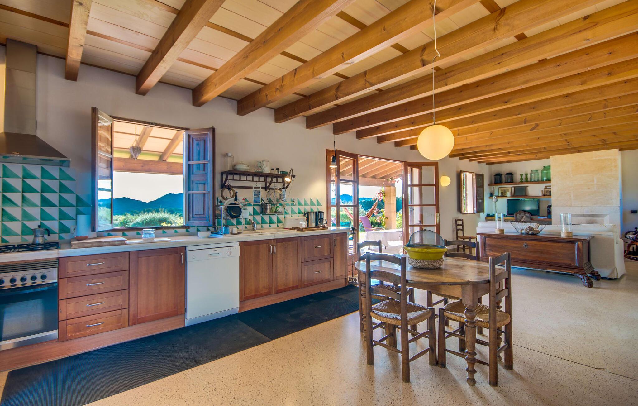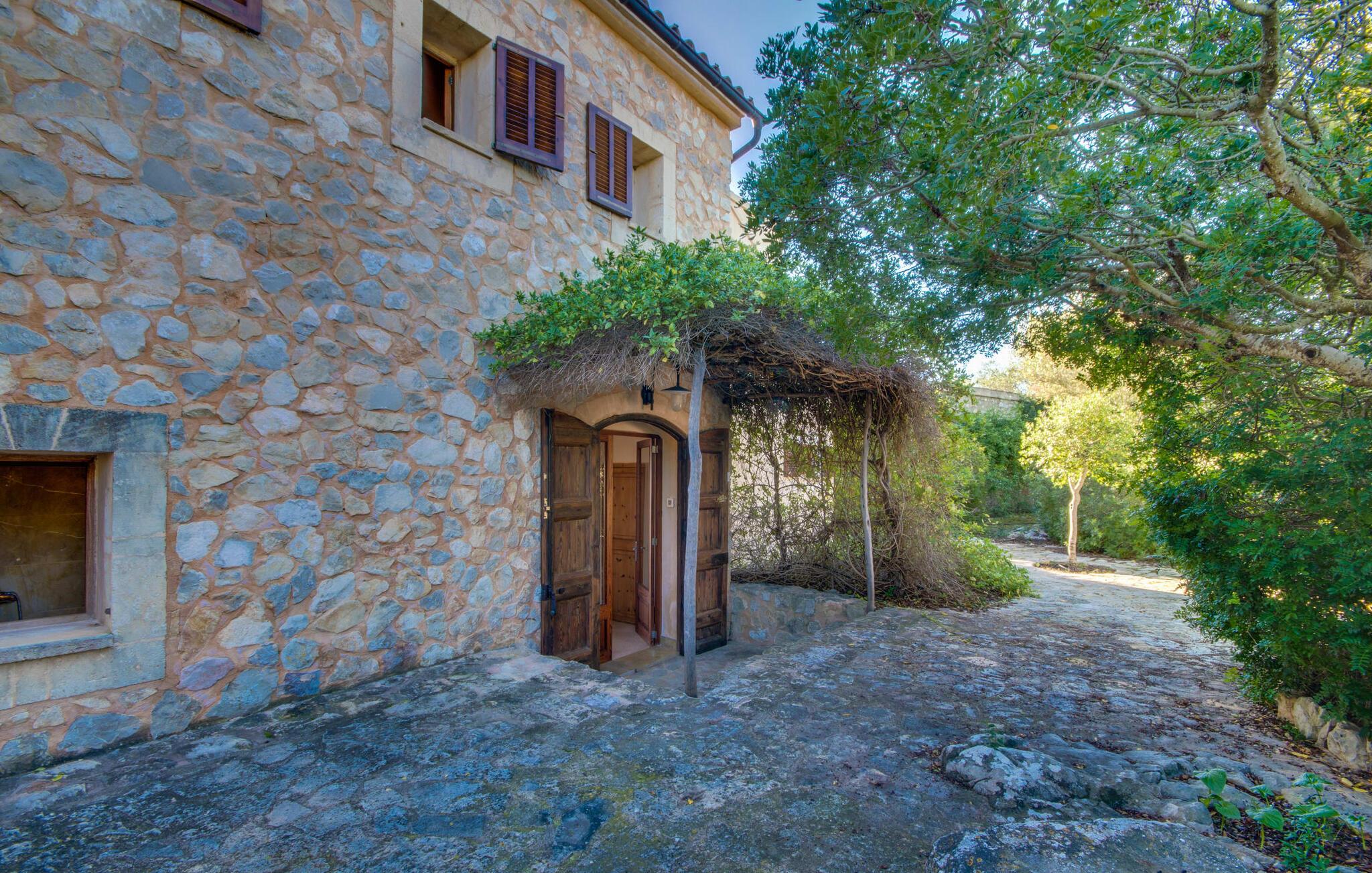 Med træskodder og lyse facade er villaen i to etager lige så indbydende som den enorme ejendom, der emmer af en herligt afslappet atmosfære i naturlige omgivelser. Stor værdi for pengene: en fantastisk have med masser af smukke hjørner, små trapper, citrontræer, lyse blomster og alt hvad jeres middelhavshjerte begærer. Som om det ikke var nok, byder "Corralot" også på en vidunderlig udsigt, som I kan nyde fra en af de overdækkede terrasser. Når I sidder i hængekøjen eller på de mange sæder til at lege, grille eller slappe af, ser tiden ud til at stå stille. De store dobbeltdøre fører direkte ind i stue/alrum med køkken, hvilket gør det til et charmerende åbent område. Og: kølige drinks er altid lige ved hånden! Den store, forfriskende pool med udendørs bad og træterrasse ligger ca. 180 m fra huset. Ren natur, skove og bølgende bakker – her er I omgivet af intet andet end et harmonisk, smukt landskab. Med et skydetag, en ekstra mobil baldakin og nok liggestole - vil I ikke forlade denne lille oase. I kan i øvrigt komme til villaen via en rustik, lidt smal landesti - men I bliver belønnet med en skyggefuld parkeringsplads under træerne. Indenfor er der rustik stil på i alt 245 m² med mange flotte træelementer og smagfuld indretning. I den store stue med åbent køkken og spiseplads skaber pejs og gyngestole en hyggelig atmosfære. Åbne loftsbjælker og en matchende væghylde, hvori fladskærms-tv og cd- og dvd-afspillere er diskret skjult. Med stor sans for detaljer blev gamle møbler forvandlet til et bord eller en kommode. Og så det grønne og hvide flisekøkken med stort køleskab, opvaskemaskine, mikroovn, brødrister, elkedel, kaffemaskine – for at være ærlig er der ikke noget, der ikke findes her. Der er endda en høj stol til børn; Familier er altid velkomne. Ovenpå har villaen tre soveværelser med dobbeltsenge og to badeværelser, et af dem en-suite. De er alle smukt møblerede og babysengen kan også bruges. Lille særegenskab: tagterrassen med en fantastisk udsigt. Det fjerde soveværelse med dobbeltseng med en-suite badeværelse er i et lille anneks. Hvis både dobbeltdøre og det ekstra vindue åbnes, smelter indendørs- og udendørsarealerne sammen til et hyggeligt loungeområde med udsigt. På den fortryllede terrasse med dens naturlige pergola og brosten vil aftenen udendørs bestemt være aftenens højdepunkt. Mange vil nyde den afslappede atmosfære omgivet af grønne områder - trods alt er villaen med sin vidunderlige udsigt og fuldstændige privatliv det helt rigtige sted til dette. Ikke desto mindre er der seværdige udflugtsmål i nærheden - den fantastiske beliggenhed på østsiden af øen gør det muligt at nå hver af dem! Kun omkring 6 km adskiller "Corralot" fra Manacor, Mallorcas næststørste by. Her kan I slentre gennem den livlige gågade og den historiske bykerne eller inkludere et besøg på en perlefabrik på jeres program. De nærliggende Cuevas del Drach-dragehuler i Porto Cristo er fulde af hemmeligheder. Og naturelskere vil sætte pris på den økologiske cykel- og vandrerute Via Verde, som starter i Manacor og krydser det varierede landskab. Den paradisiske bugt Cala Varques og den lille sandstrand Cala d'Es Serral er kun omkring 6 km væk - forhåbentlig er der stadig lidt tid til et besøg? Den rolige villa "Corralot" er omgivet af grønne områder i den østlige del af øen, sydøst for Manacor. Den maleriske by og et ugentligt marked samt diverse butikker, supermarkeder, caféer og restauranter ligger ca. 6 km væk. Den paradisiske bugt Cala Torta med dens uberørte natur eller den lille sandstrand Cala d'Es Serral er kun få minutter væk i bil.