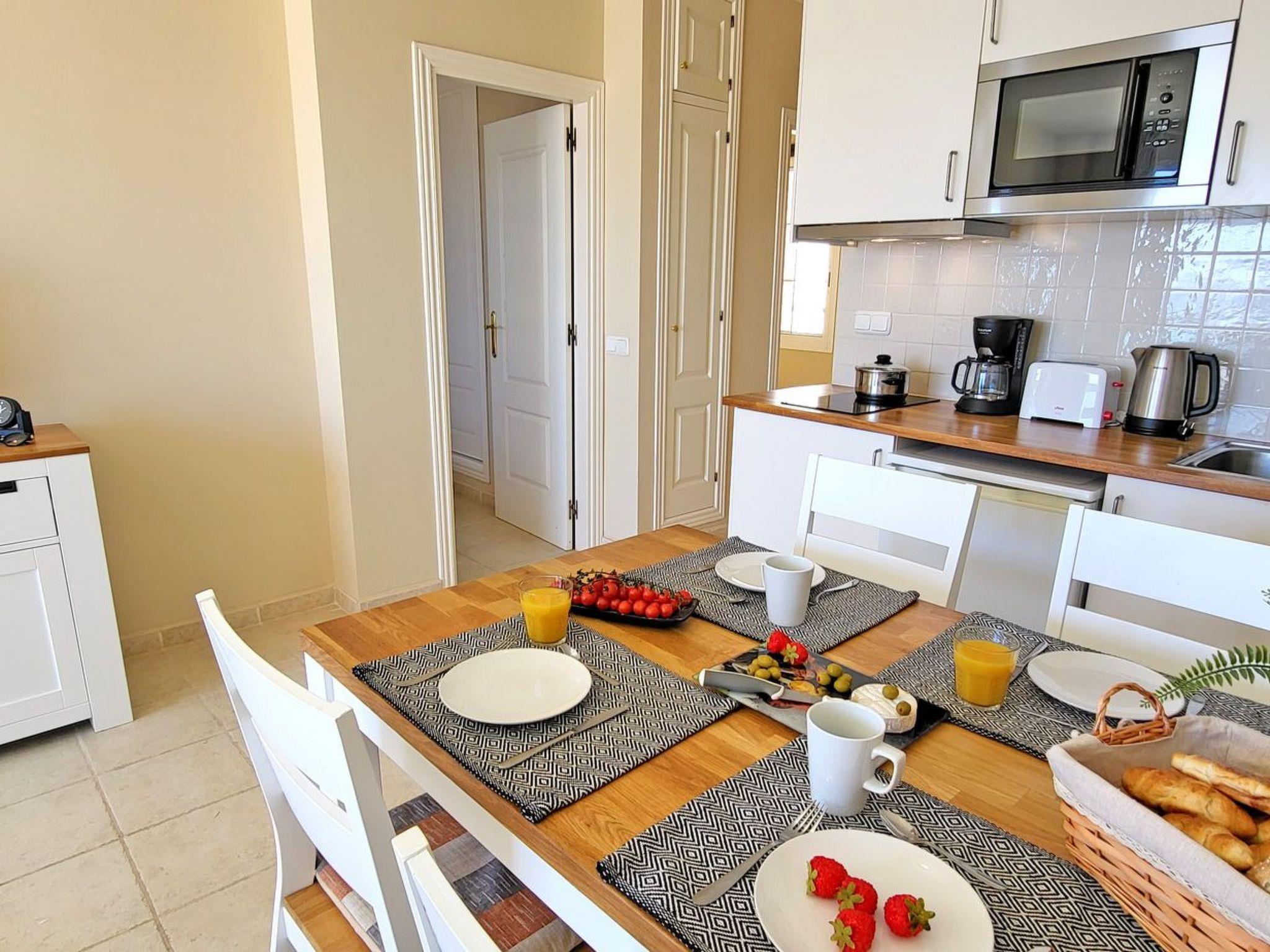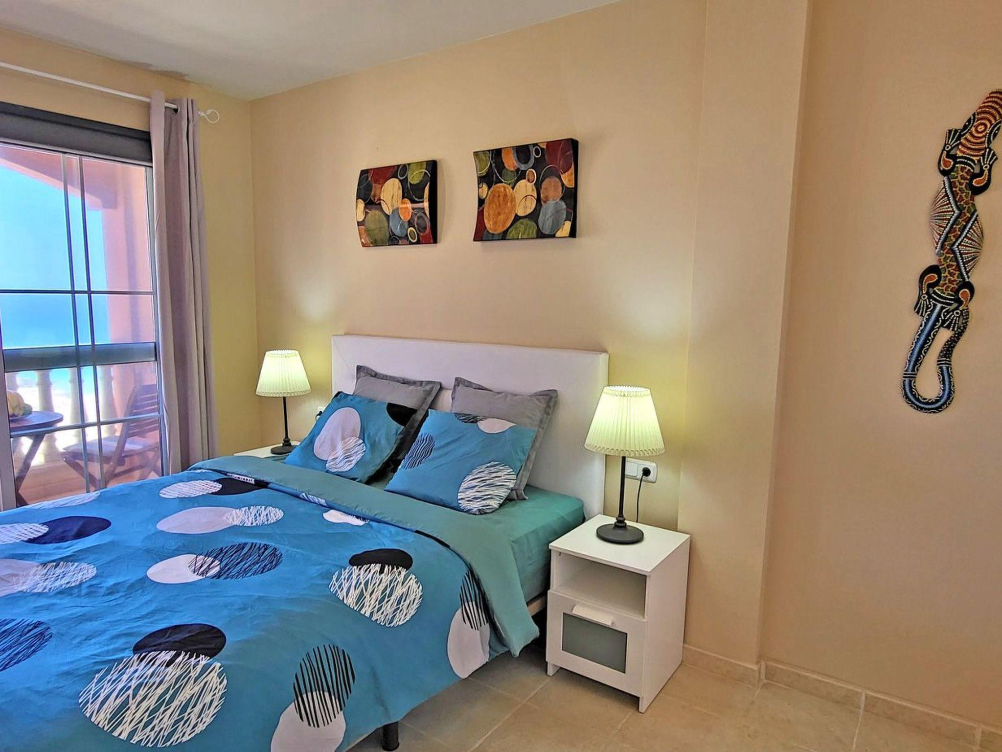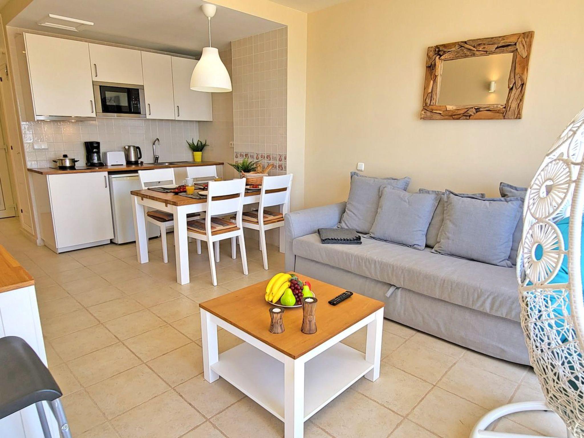 The modern furnished holiday flat offers space for a maximum of 5 people, is equipped with a bedroom with a double bed and its own exit to the balcony with a wonderful view of the ocean, another bedroom with a single bed, as well as a comfortable pull-out sofa bed for 2 more people in the living room. There is also an open-plan kitchen with dining area and a bathroom with shower and washing machine in the living area.
