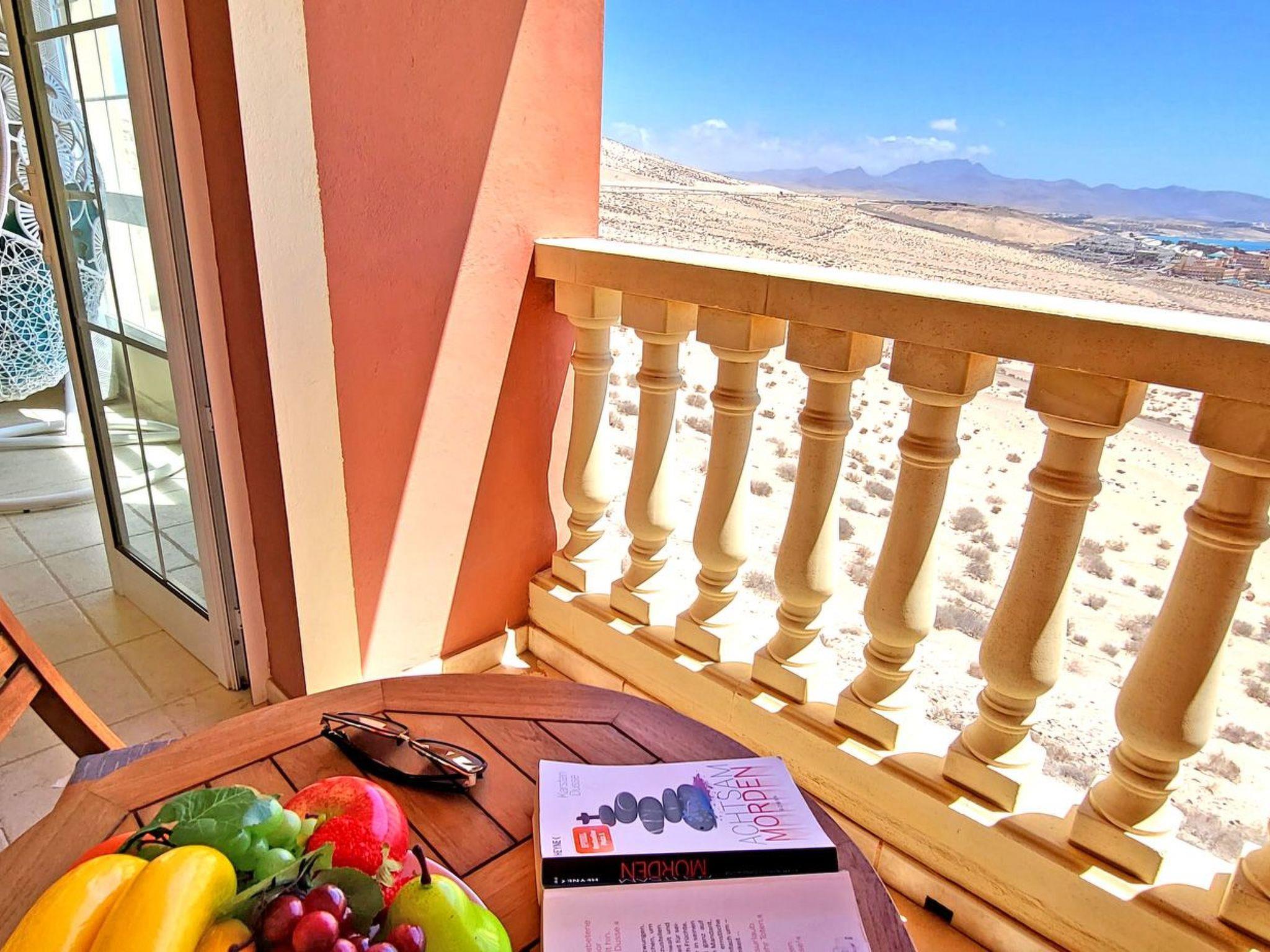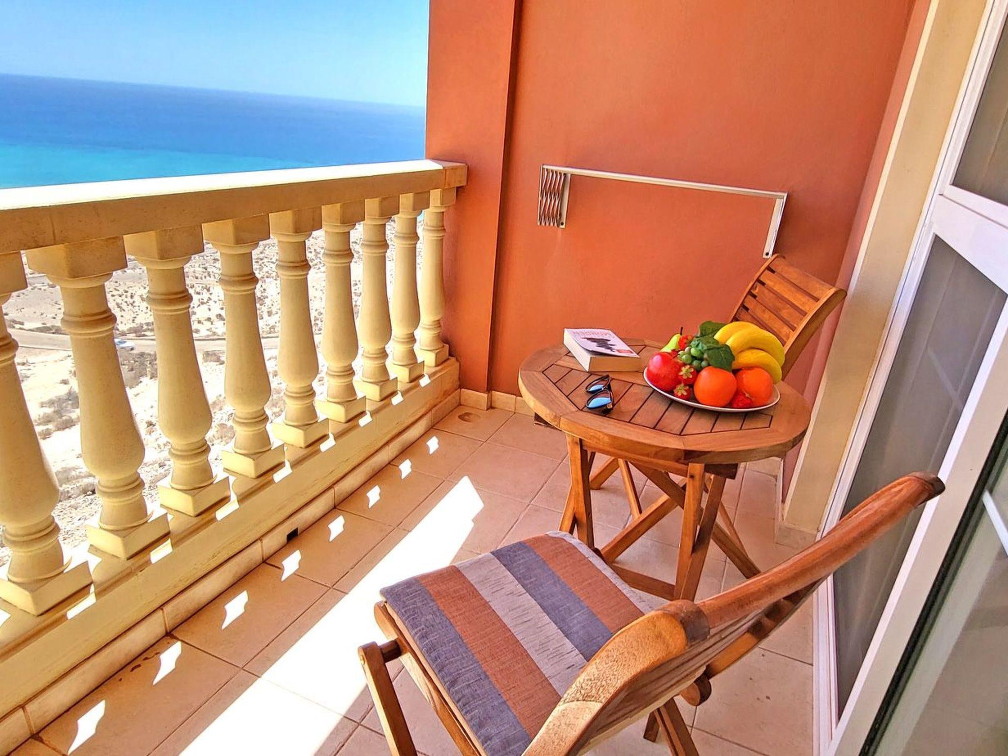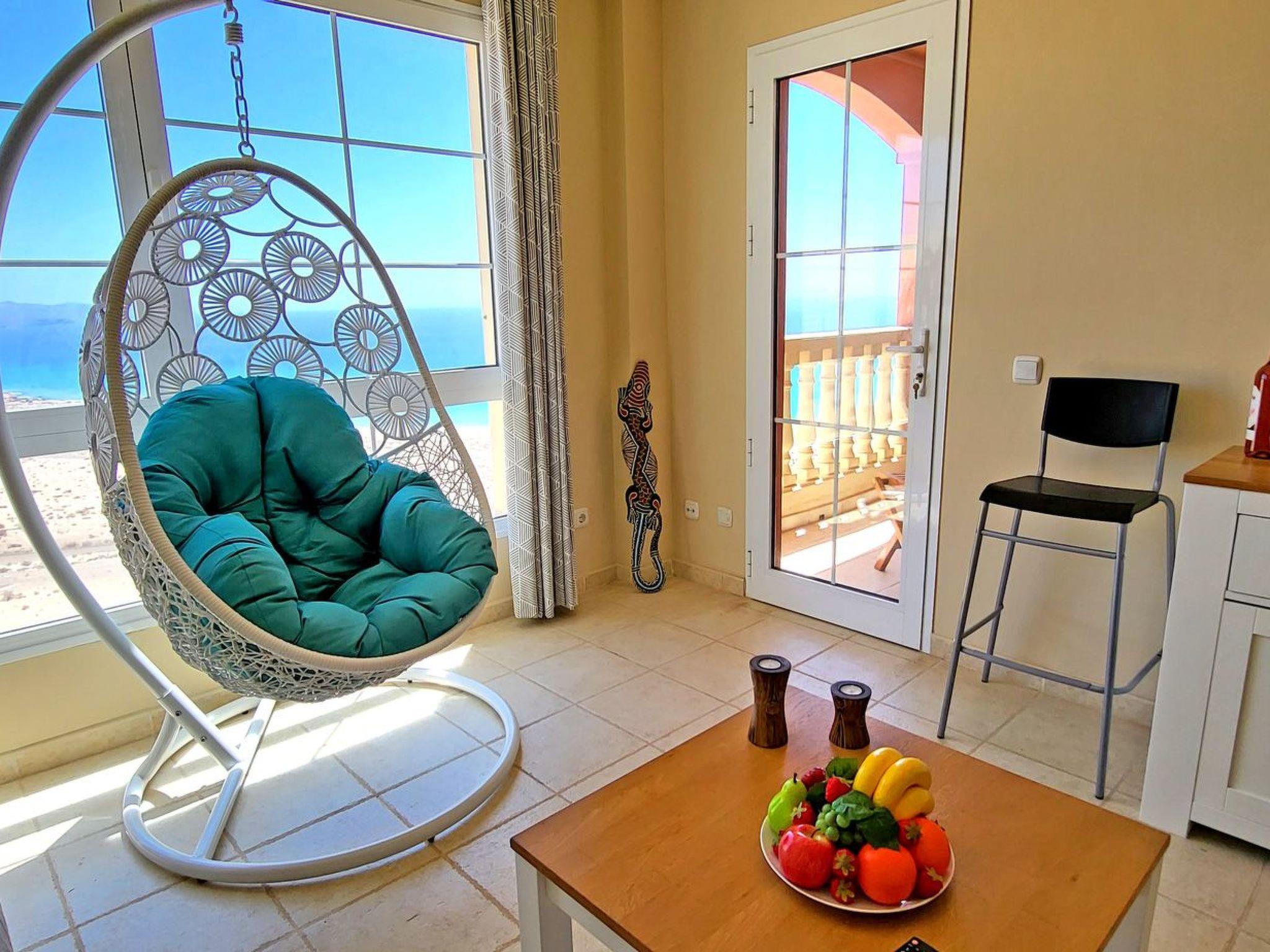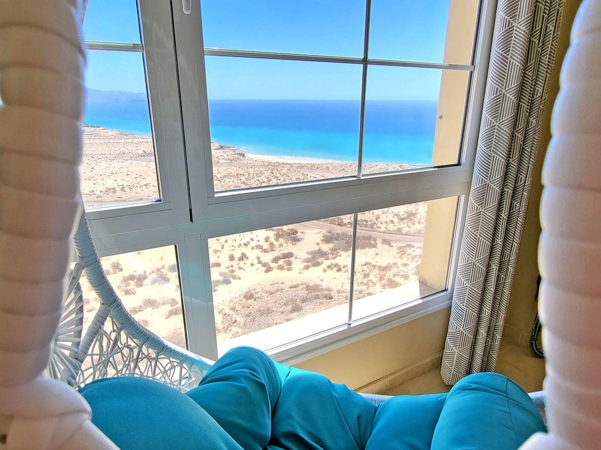 The highlight of the flat is the balcony with breathtaking panoramic views of the turquoise ocean, the sandy beach SOTAVENTO, the magnificent view of the mountains and the town of Costa Calma, which you can enjoy not only from the balcony, but thanks to the large windows in the living room, even during a cosy breakfast at the table, while relaxing on the couch or on the beautiful hanging chair right in front of the window.