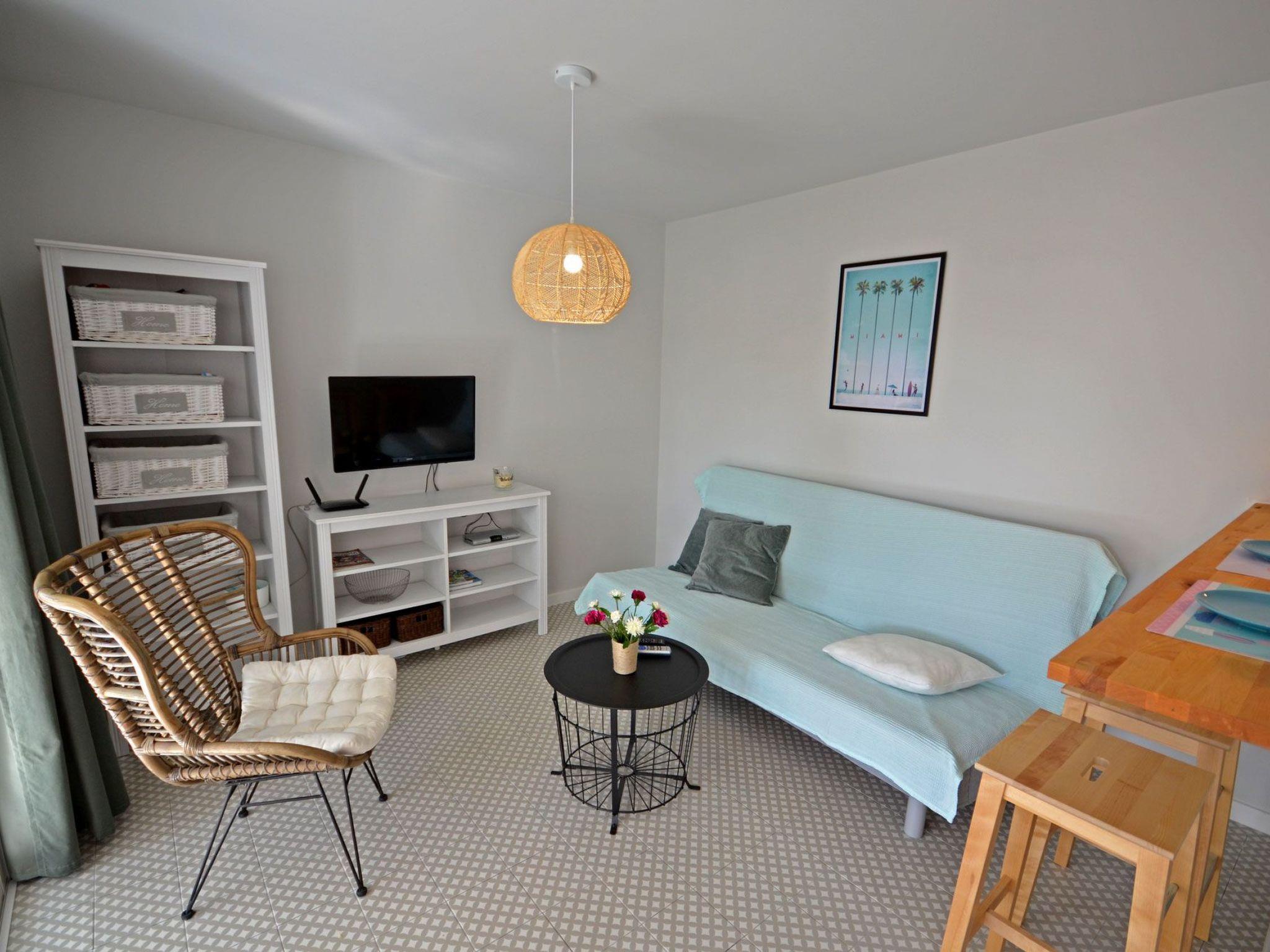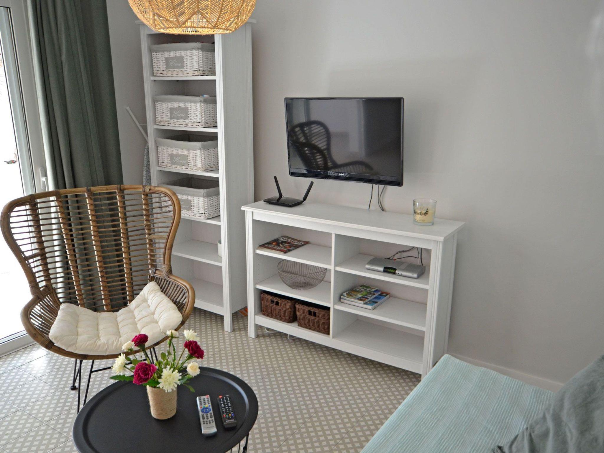 A beautiful apartment with living room with a sofa bed for 2 persons and an open kitchen, a large bathroom with shower, a bedroom with a double bed for 2 persons and a terrace surrounded by greenery and palm trees. Just a few meters away is the community pool with sun loungers, which invites you to sunbathe, play and swim. In itself the apartment is modern and at the same time comfortably furnished, bright and pleasant. The living room with open kitchen has everything you need for everyday use, be it cutlery, pots, cups or other cooking utensils. Furthermore, the kitchen is equipped with a stove, oven, refrigerator, coffee maker and toaster. In the bathroom, which offers plenty of space, has a sink, toilet, shower and is also equipped with a washing machine. The bedroom with window has a double bed 1.60 m, a wardrobe with plenty of storage space and two bedside cabinets. Thanks to the large window / patio door in the living room, it is bright and pleasant, through which you can look out on the terrace and go out, where you can enjoy the day with a large table or on the sun loungers in the countryside.Bedroom:
