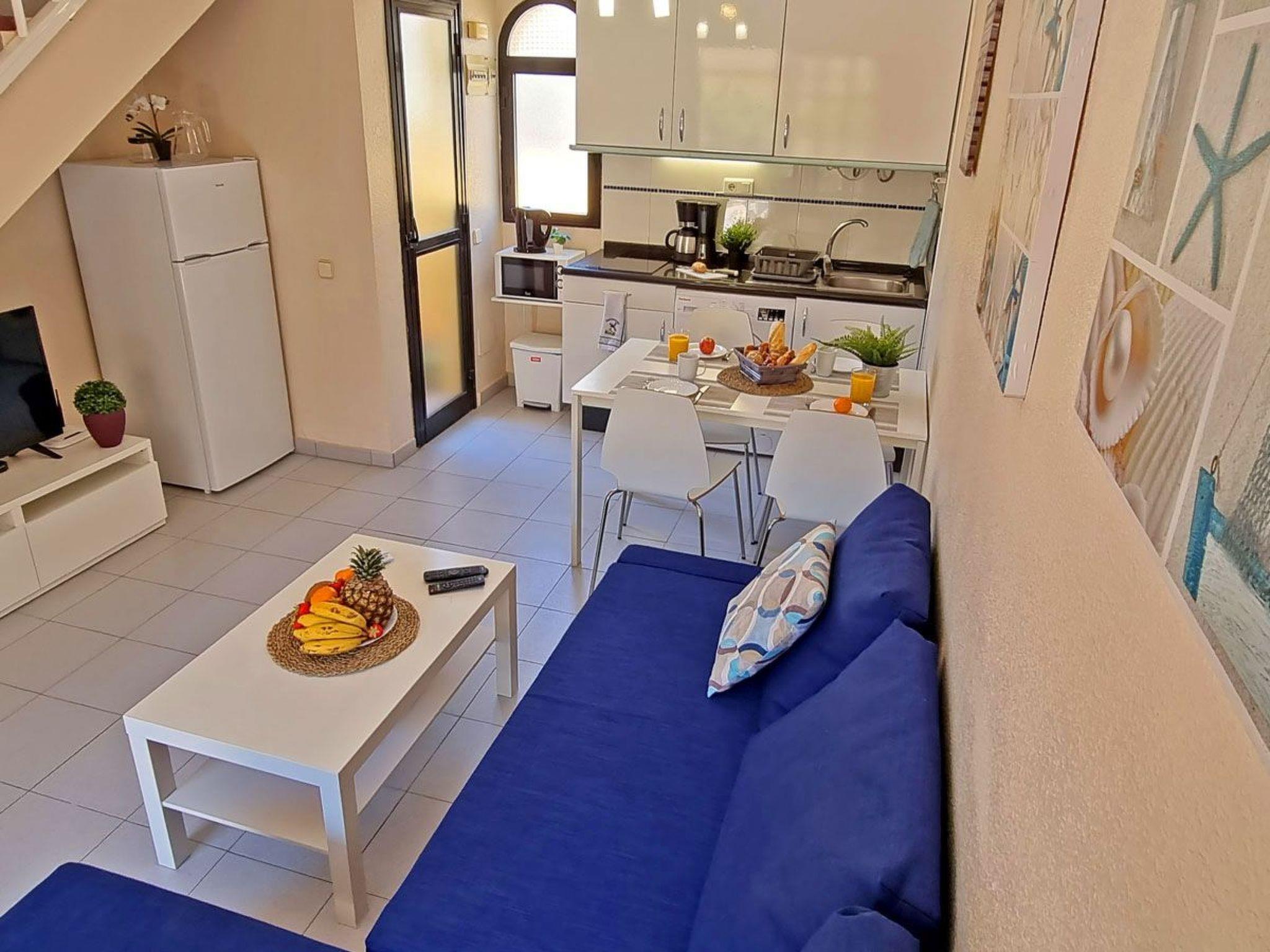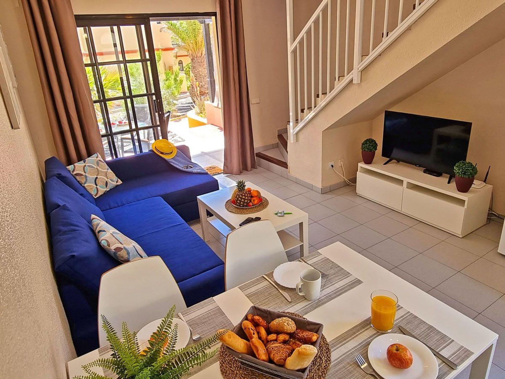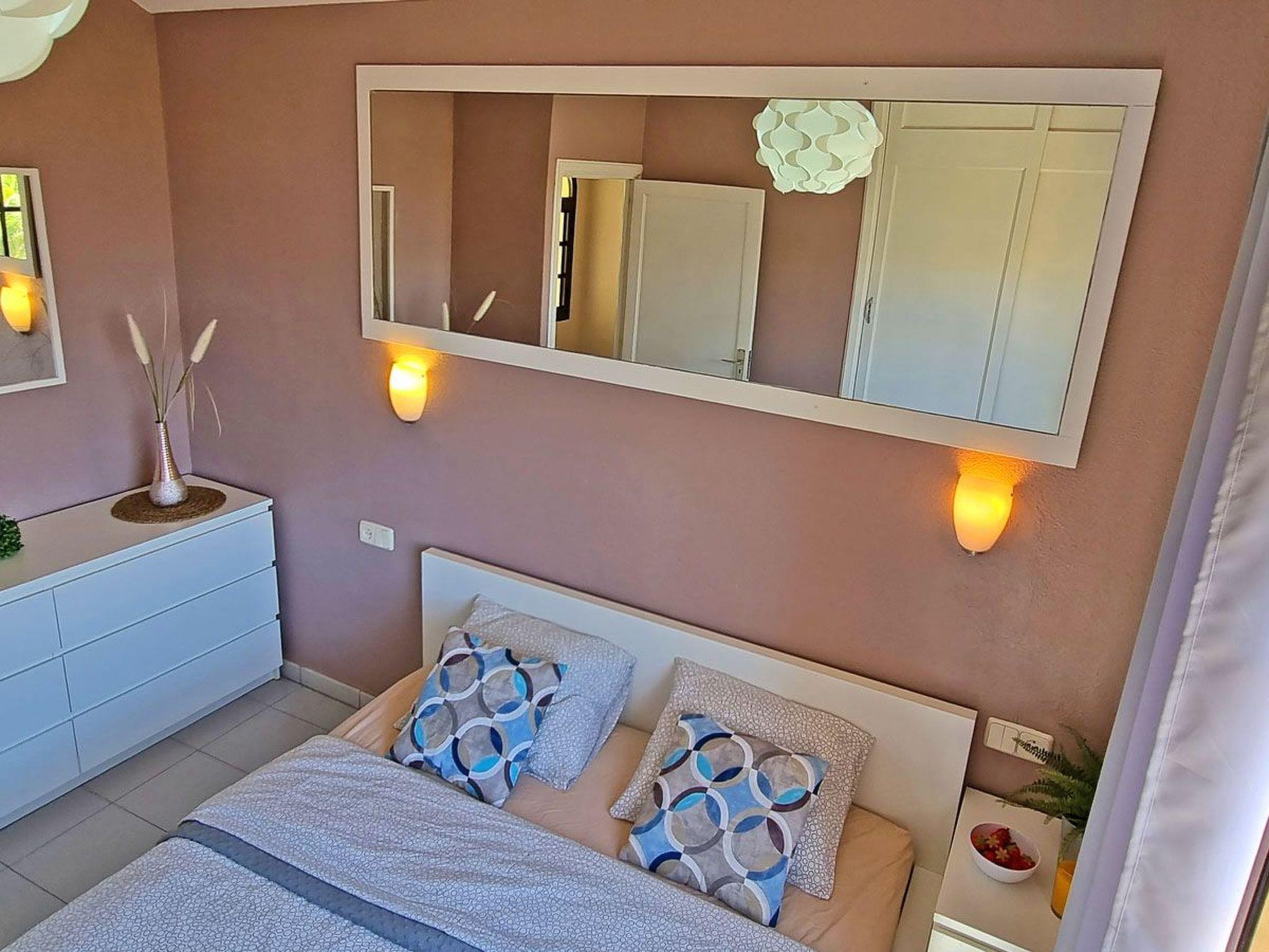 The 2-storey flat for max. 4 people is a modern and cosily furnished terraced bungalow in a quiet residential complex on Costa Calma, Fuerteventura. Downstairs there is a living room with an open-plan kitchenette and dining area, as well as direct access to the terrace. The stairs lead upstairs to the bedroom with double bed and the bathroom with bathtub, washbasin, toilet and window. The entire flat is fully furnished and equipped with all the useful things you need for everyday life, such as bed linen, towels, cutlery, cooking utensils, plates, cups and glasses. In the bedroom you will find a double bed, a large chest of drawers and a large wardrobe. In the kitchen you will find a fridge, kettle, coffee machine, cooker and microwave. In the open-plan living area there is space for a dining area, sofa bed, coffee table and TV. The terrace is also equipped with a table, seating and a tumble dryer. In fact, you have everything you need to feel almost at home.bedroom: