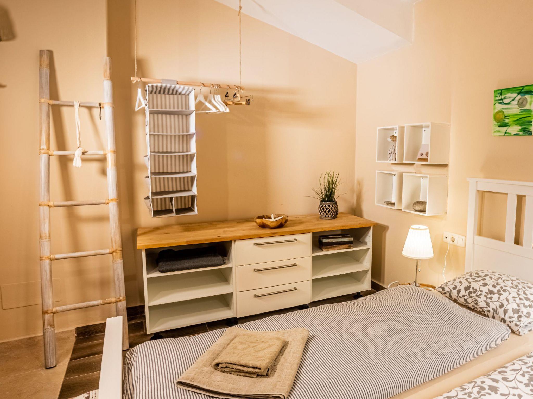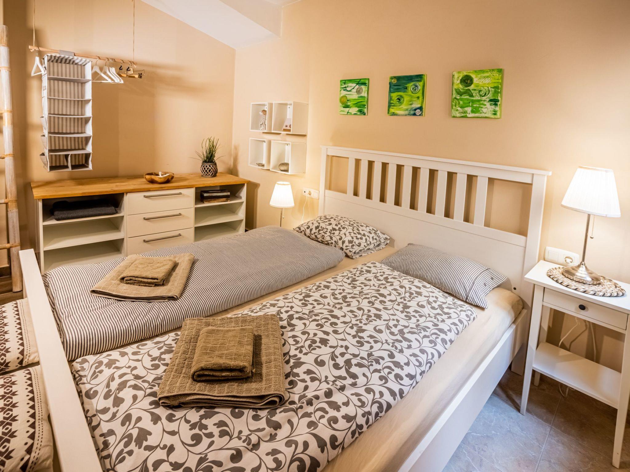 The bedroom has a 160 cm wide double bed with a length of 200 cm.