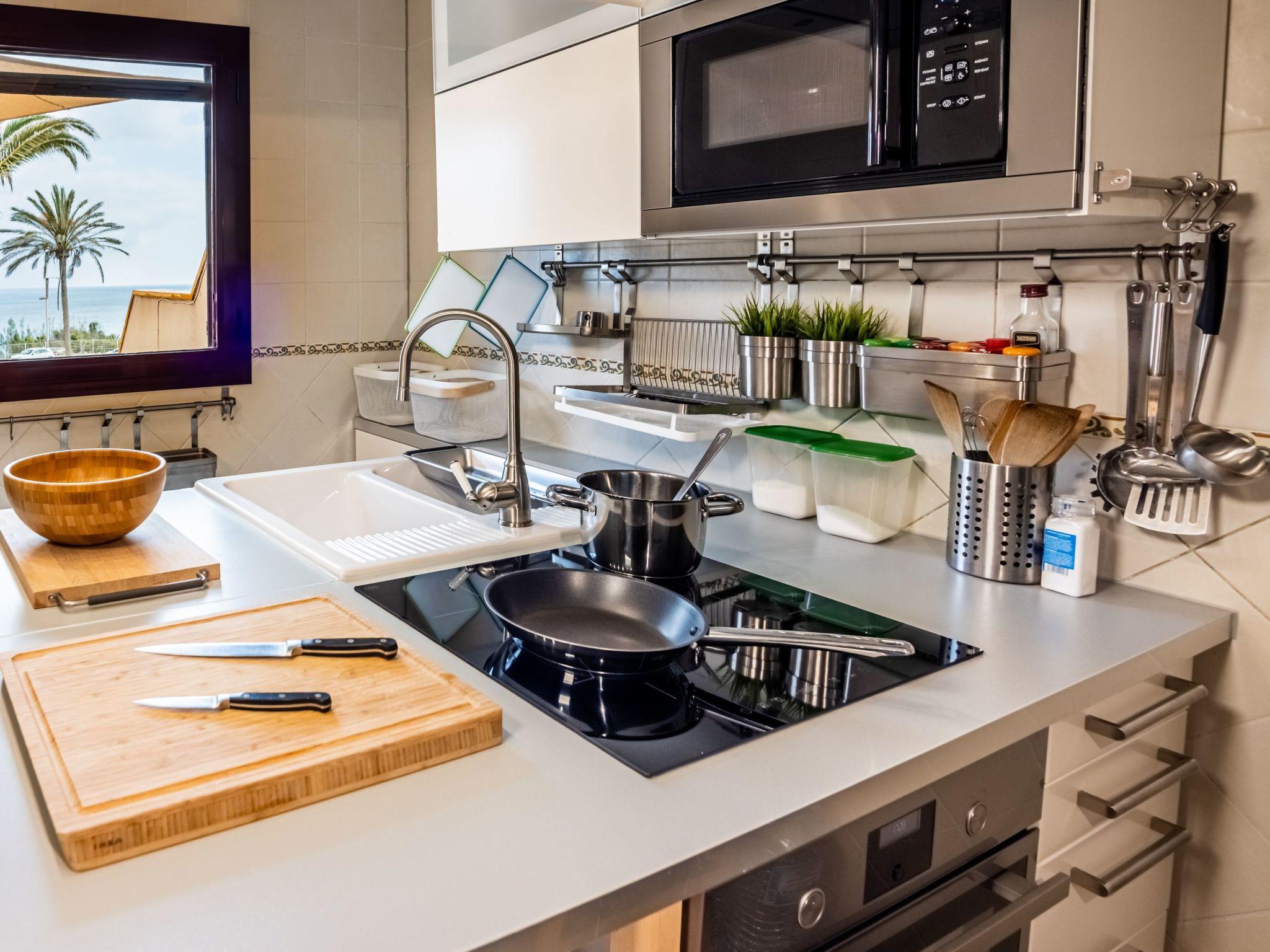 The modern flat is just a 3-minute walk from the beach.