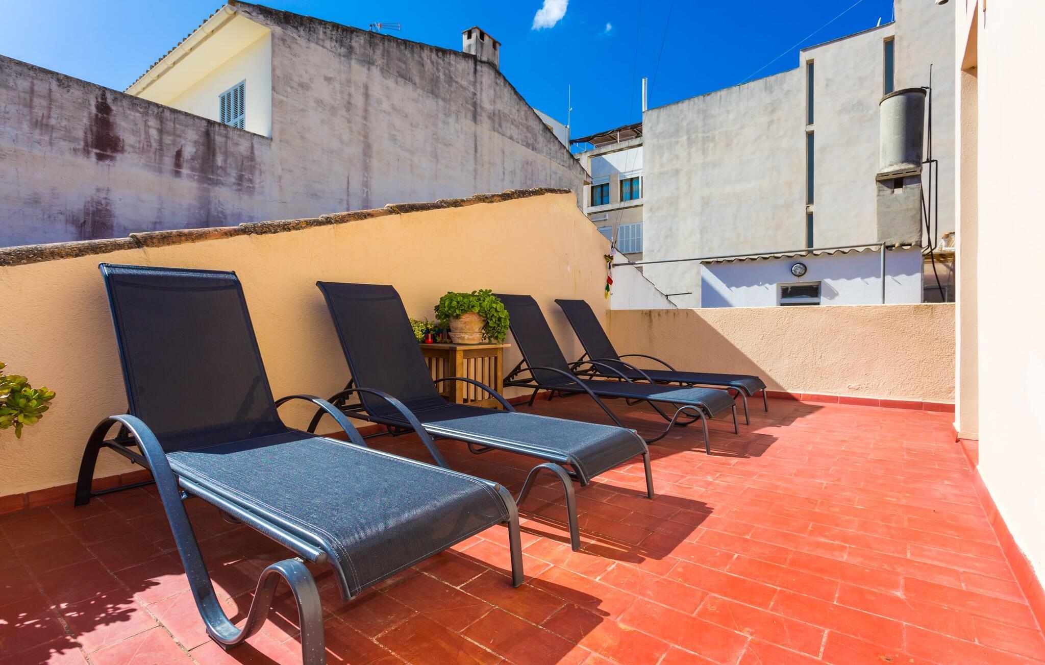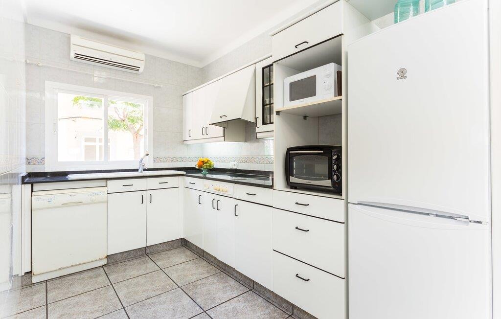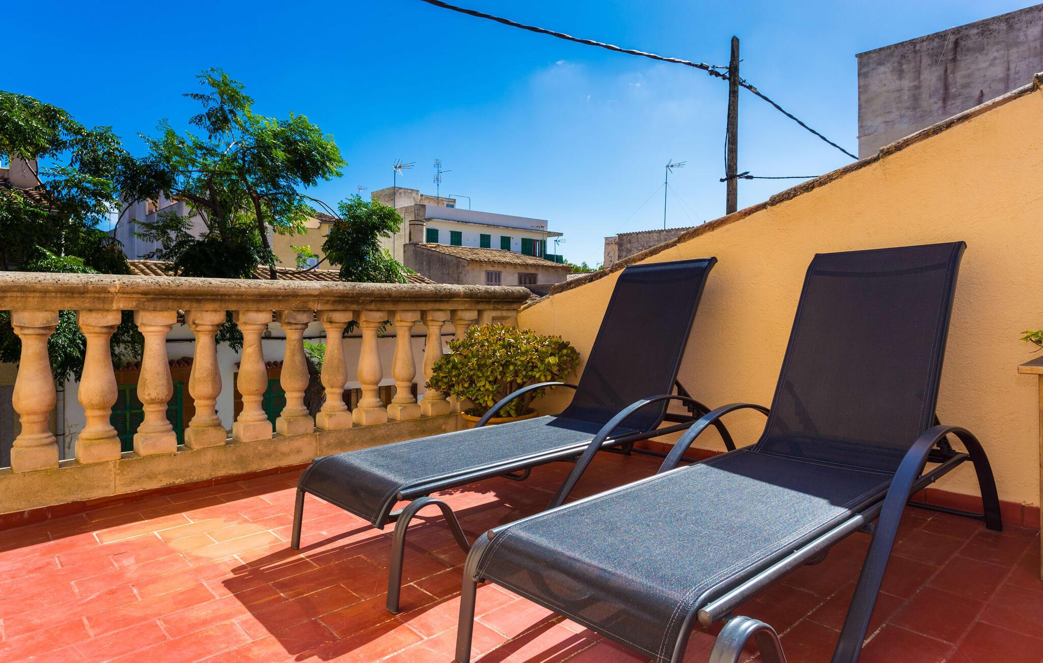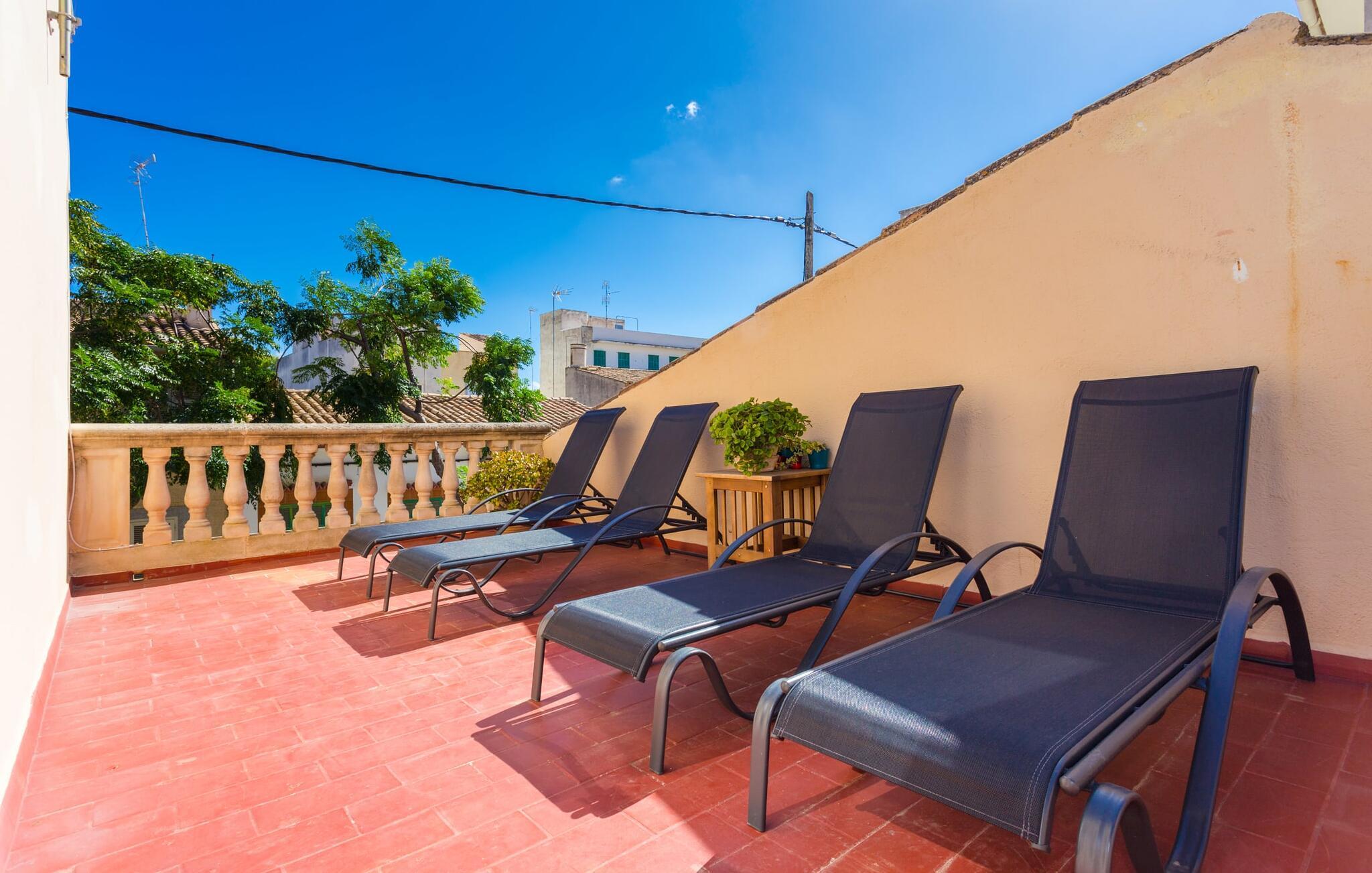 Rækkehuset "Costa d'en Blau" er den perfekte bolig, hvis I ikke vil gå glip af charmen ved byinfrastruktur og samtidig længes efter et hyggeligt tilflugtssted, der også kan rumme større rejsegrupper. En gade med træer fører jer til huset, som er indrettet i okker og orange toner og har en smuk tagterrasse og liggestole på første sal. Her kan I nyde den vidunderlige blå himmel og middelhavsklimaet, mens I forkæler jer selv med en god ferielæsning eller en hyggelig snak. Selve huset er indrettet på en meget moderne måde, domineret af lyse, venlige farver og subtile kunstværker på væggene, som hurtigt formidler en subtil, hjemlig følelse. Indgangspartiet i stueetagen leder ind i en stue med en stor hjørnesofa, hvor I også kan se tv hjemmefra takket være satellitteknologi. Der er også et hvidt spisebord til fælles måltider. Disse kan I tilberede i det rummelige tilstødende køkken, som er fuldt udstyret og gør husarbejdet lettere med mikroovn og opvaskemaskine. I hjørnet af rummet er der en markant sten, der minder om et hjemligt springvand og giver villaen en behagelig atmosfære. Et af soveværelserne med en dobbeltseng er også i stueetagen, ligesom et meget smagfuldt badeværelse med komforten fra et badekar til en sensuel afslutning på dagen. På øverste etage er der yderligere to soveværelser med dobbeltsenge, samt to værelser med hver en enkeltseng og endnu et badeværelse. Grib jeres badedragt og gå på to minutter til den smukke sandstrand, kendt for sin karakteristiske havn og strandpromenade med en særlig maritim flair. Hvis I har lyst til en rolig dag med svømning, anbefaler vi et besøg i Cala Petita naturlige fjord, 3 km væk. S'Illot, 8 km væk, byder også på alt hvad I behøver til en vidunderlig dag på stranden. Efter hjemkomsten kan I slentre gennem den maleriske gamle bydel i Porto Colom og nyde frisk fisk, for eksempel i restauranten Sa Sal. På grund af den centrale beliggenhed kan trafikken høres fra tagterrassen. Hvis I har lyst til at køle af, kan I besøge grottesystemet Coves del Drac, som har den største underjordiske sø i Europa. Blot et stenkast fra den idylliske Playa de Porto Cristo er rækkehuset "Costa d'en Blau" den perfekte mulighed for alle, der leder efter den samlede pakke af hav og urban flair! Promenaden og yachtklubben er inden for gåafstand, det samme er udsøgte restauranter og drypstenshulerne Coves del Drac. En 20-minutters kørsel tager jer til den større by Manacor, hvor I kan shoppe omfattende. De mange attraktive sandstrande på østkysten er også let tilgængelige.
