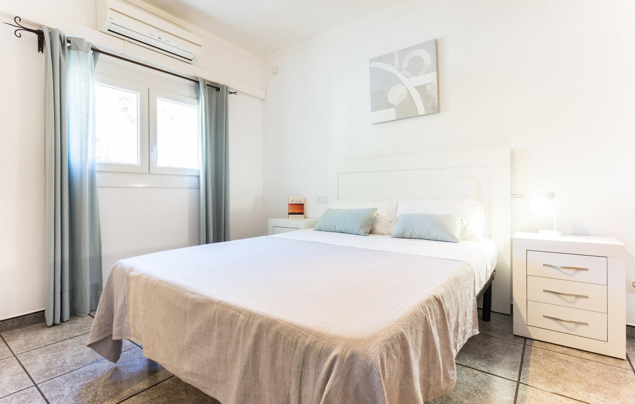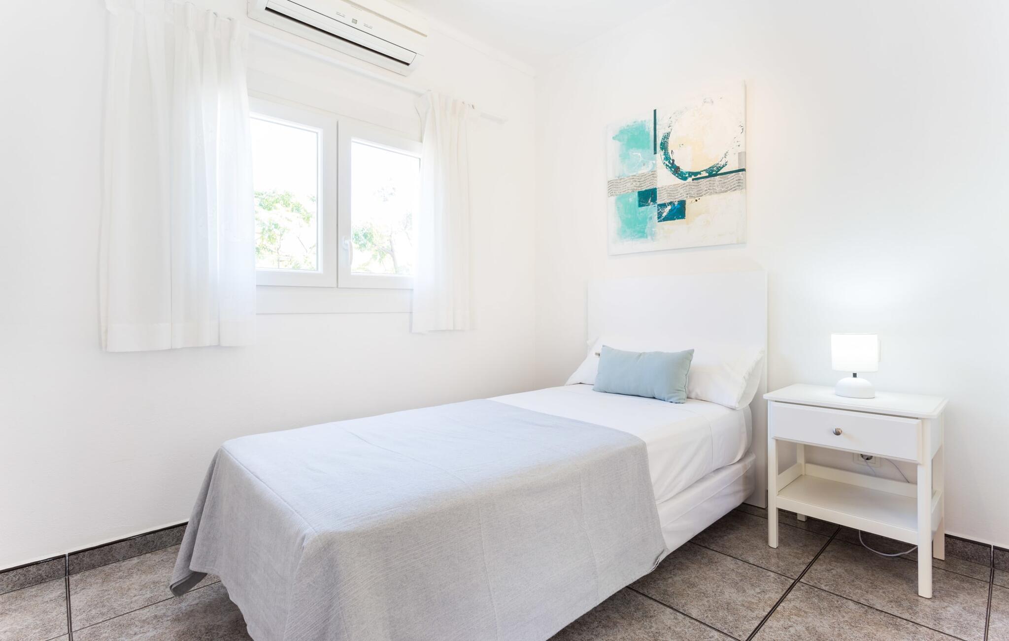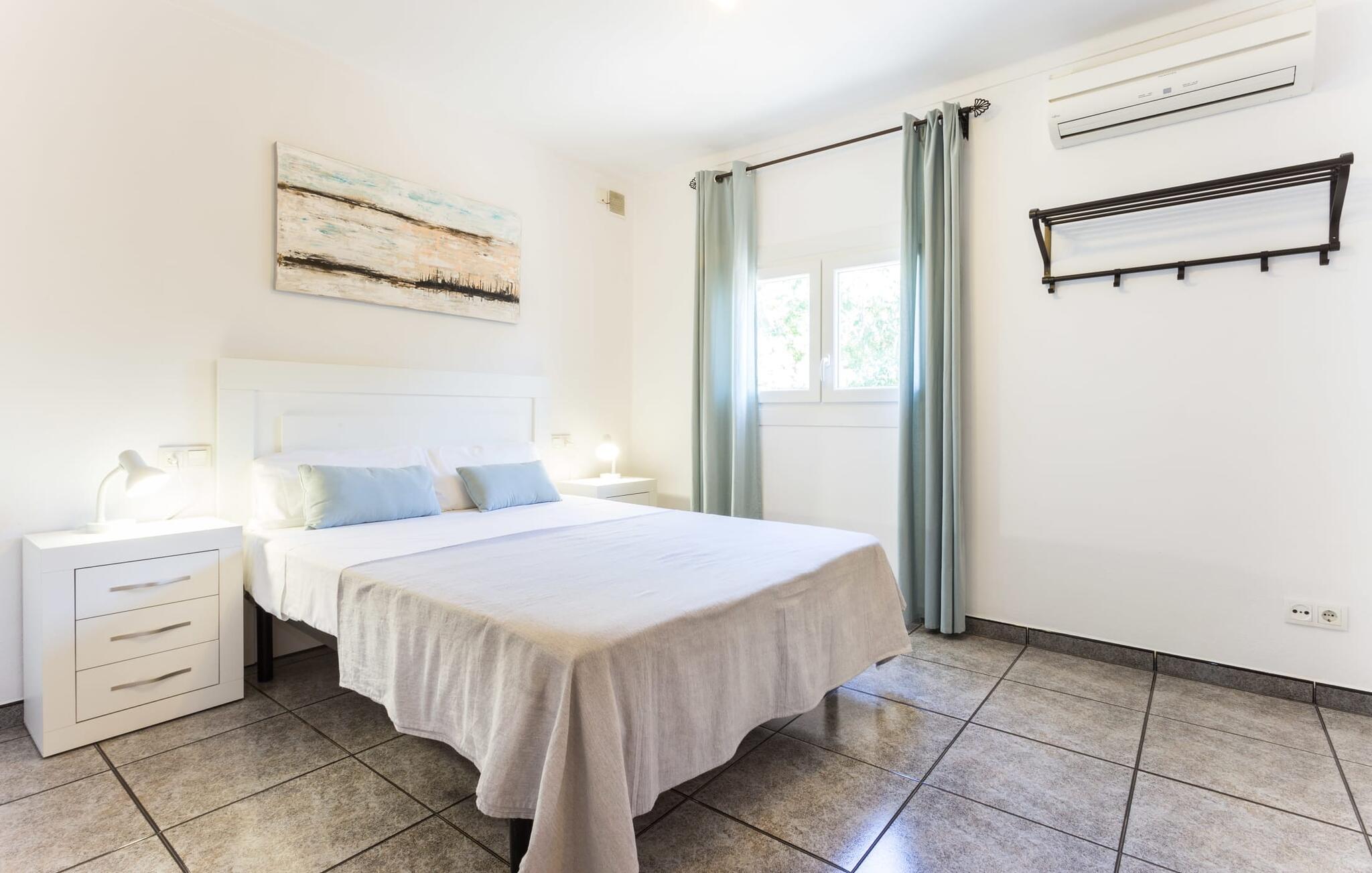 Rækkehuset "Costa d'en Blau" er den perfekte bolig, hvis I ikke vil gå glip af charmen ved byinfrastruktur og samtidig længes efter et hyggeligt tilflugtssted, der også kan rumme større rejsegrupper. En gade med træer fører jer til huset, som er indrettet i okker og orange toner og har en smuk tagterrasse og liggestole på første sal. Her kan I nyde den vidunderlige blå himmel og middelhavsklimaet, mens I forkæler jer selv med en god ferielæsning eller en hyggelig snak. Selve huset er indrettet på en meget moderne måde, domineret af lyse, venlige farver og subtile kunstværker på væggene, som hurtigt formidler en subtil, hjemlig følelse. Indgangspartiet i stueetagen leder ind i en stue med en stor hjørnesofa, hvor I også kan se tv hjemmefra takket være satellitteknologi. Der er også et hvidt spisebord til fælles måltider. Disse kan I tilberede i det rummelige tilstødende køkken, som er fuldt udstyret og gør husarbejdet lettere med mikroovn og opvaskemaskine. I hjørnet af rummet er der en markant sten, der minder om et hjemligt springvand og giver villaen en behagelig atmosfære. Et af soveværelserne med en dobbeltseng er også i stueetagen, ligesom et meget smagfuldt badeværelse med komforten fra et badekar til en sensuel afslutning på dagen. På øverste etage er der yderligere to soveværelser med dobbeltsenge, samt to værelser med hver en enkeltseng og endnu et badeværelse. Grib jeres badedragt og gå på to minutter til den smukke sandstrand, kendt for sin karakteristiske havn og strandpromenade med en særlig maritim flair. Hvis I har lyst til en rolig dag med svømning, anbefaler vi et besøg i Cala Petita naturlige fjord, 3 km væk. S'Illot, 8 km væk, byder også på alt hvad I behøver til en vidunderlig dag på stranden. Efter hjemkomsten kan I slentre gennem den maleriske gamle bydel i Porto Colom og nyde frisk fisk, for eksempel i restauranten Sa Sal. På grund af den centrale beliggenhed kan trafikken høres fra tagterrassen. Hvis I har lyst til at køle af, kan I besøge grottesystemet Coves del Drac, som har den største underjordiske sø i Europa. Blot et stenkast fra den idylliske Playa de Porto Cristo er rækkehuset "Costa d'en Blau" den perfekte mulighed for alle, der leder efter den samlede pakke af hav og urban flair! Promenaden og yachtklubben er inden for gåafstand, det samme er udsøgte restauranter og drypstenshulerne Coves del Drac. En 20-minutters kørsel tager jer til den større by Manacor, hvor I kan shoppe omfattende. De mange attraktive sandstrande på østkysten er også let tilgængelige.