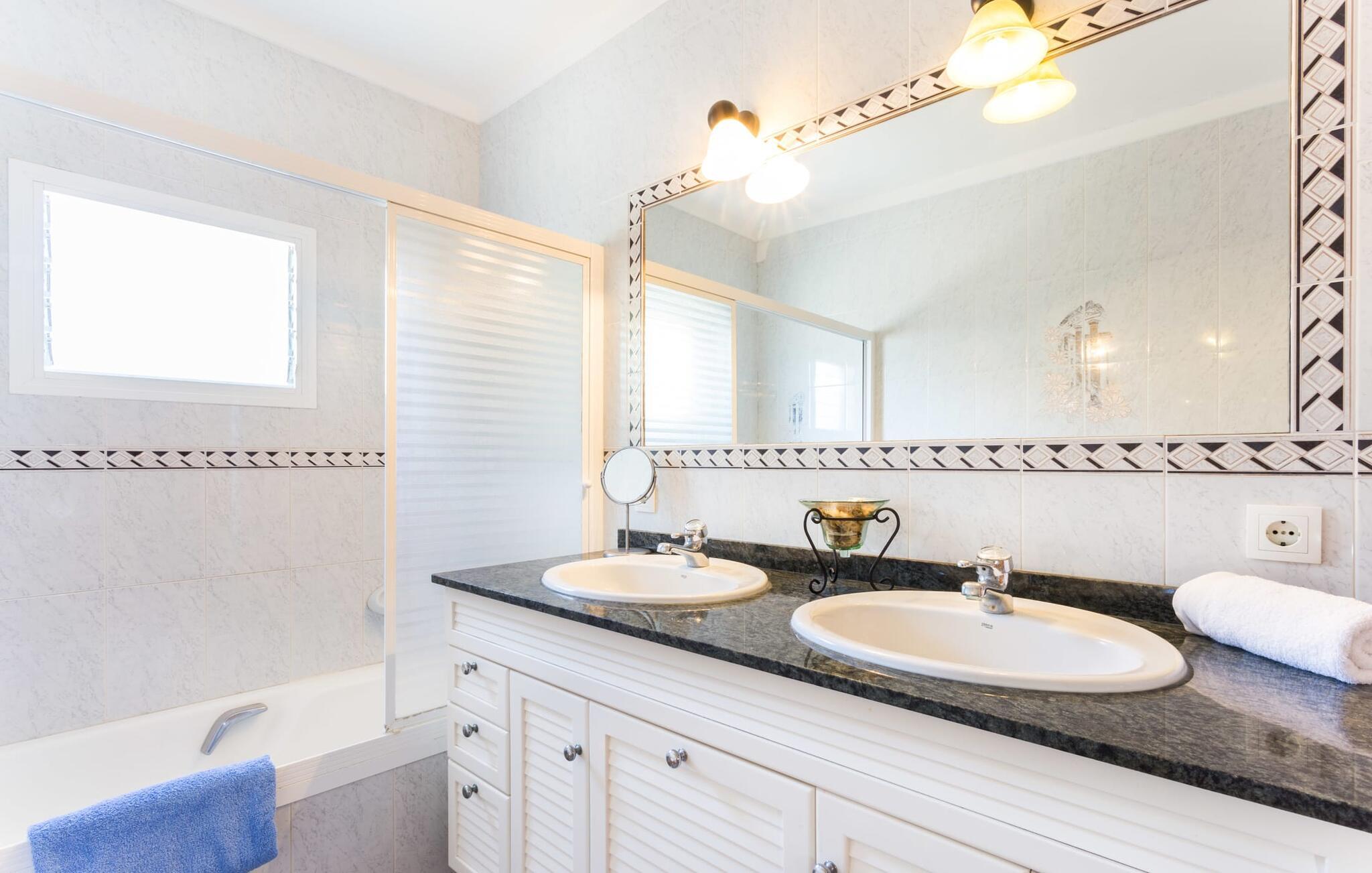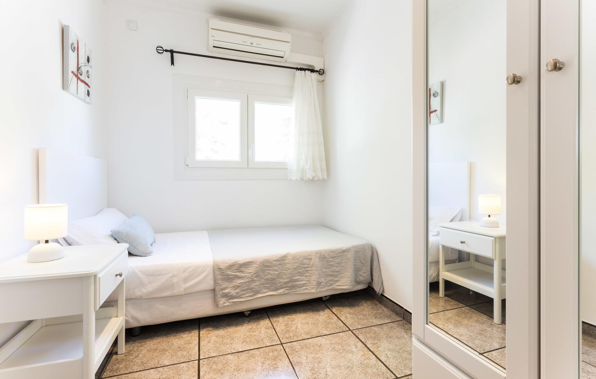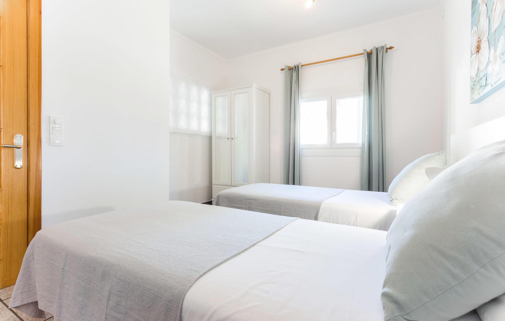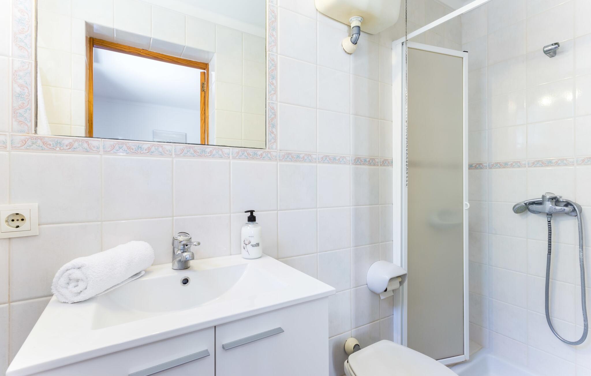 Rækkehuset "Costa d'en Blau" er den perfekte bolig, hvis I ikke vil gå glip af charmen ved byinfrastruktur og samtidig længes efter et hyggeligt tilflugtssted, der også kan rumme større rejsegrupper. En gade med træer fører jer til huset, som er indrettet i okker og orange toner og har en smuk tagterrasse og liggestole på første sal. Her kan I nyde den vidunderlige blå himmel og middelhavsklimaet, mens I forkæler jer selv med en god ferielæsning eller en hyggelig snak. Selve huset er indrettet på en meget moderne måde, domineret af lyse, venlige farver og subtile kunstværker på væggene, som hurtigt formidler en subtil, hjemlig følelse. Indgangspartiet i stueetagen leder ind i en stue med en stor hjørnesofa, hvor I også kan se tv hjemmefra takket være satellitteknologi. Der er også et hvidt spisebord til fælles måltider. Disse kan I tilberede i det rummelige tilstødende køkken, som er fuldt udstyret og gør husarbejdet lettere med mikroovn og opvaskemaskine. I hjørnet af rummet er der en markant sten, der minder om et hjemligt springvand og giver villaen en behagelig atmosfære. Et af soveværelserne med en dobbeltseng er også i stueetagen, ligesom et meget smagfuldt badeværelse med komforten fra et badekar til en sensuel afslutning på dagen. På øverste etage er der yderligere to soveværelser med dobbeltsenge, samt to værelser med hver en enkeltseng og endnu et badeværelse. Grib jeres badedragt og gå på to minutter til den smukke sandstrand, kendt for sin karakteristiske havn og strandpromenade med en særlig maritim flair. Hvis I har lyst til en rolig dag med svømning, anbefaler vi et besøg i Cala Petita naturlige fjord, 3 km væk. S'Illot, 8 km væk, byder også på alt hvad I behøver til en vidunderlig dag på stranden. Efter hjemkomsten kan I slentre gennem den maleriske gamle bydel i Porto Colom og nyde frisk fisk, for eksempel i restauranten Sa Sal. På grund af den centrale beliggenhed kan trafikken høres fra tagterrassen. Hvis I har lyst til at køle af, kan I besøge grottesystemet Coves del Drac, som har den største underjordiske sø i Europa. Blot et stenkast fra den idylliske Playa de Porto Cristo er rækkehuset "Costa d'en Blau" den perfekte mulighed for alle, der leder efter den samlede pakke af hav og urban flair! Promenaden og yachtklubben er inden for gåafstand, det samme er udsøgte restauranter og drypstenshulerne Coves del Drac. En 20-minutters kørsel tager jer til den større by Manacor, hvor I kan shoppe omfattende. De mange attraktive sandstrande på østkysten er også let tilgængelige.