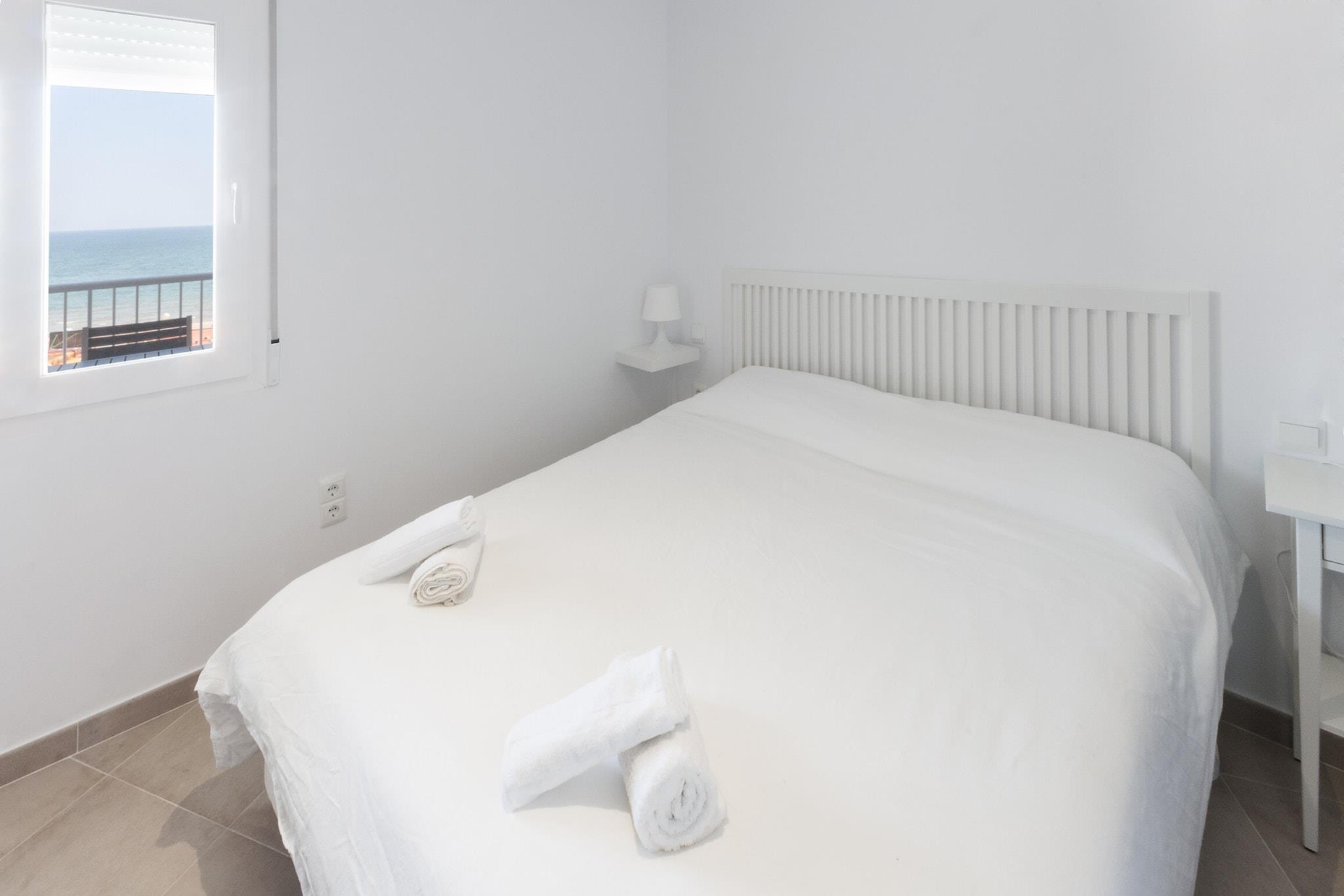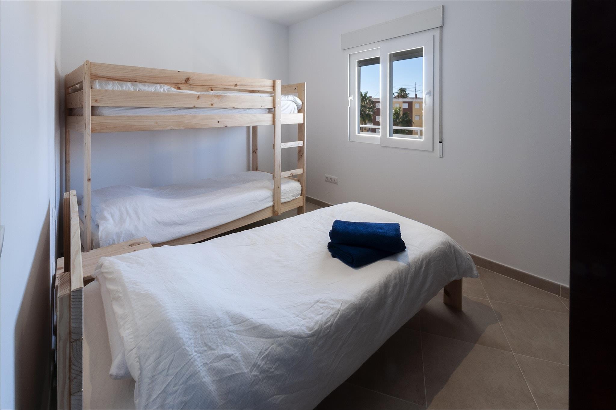 Udsigt over havets terrasse Denne moderne lejlighed ligger på 4. sal med elevator og tilbyder en betagende udsigt over bølgerne, hvilket skaber en fredfyldt og afslappende atmosfære. Træd ud på terrassen eller kig gennem gulv-til-loft-glasdørene i stuen for at nyde horisonten. Uderummet er perfekt til morgenkaffe eller aftendrinks, mens du lytter til havets blide rytme. Rummeligt moderne interiør Indvendigt forbinder en stue/spisestue i åbent plan problemfrit med et fuldt udstyret køkken med induktionskomfur, ovn og rigelig arbejdsplads. Slap af på den store sofa efter at have lavet et måltid ved spisebordet. Tre soveværelser rummer alle gæster komfortabelt: et med køje og enkeltseng, to med dobbeltsenge (en en-suite). Et brusebadeværelse, kanaler med aircondition og ekstra senge, barneseng og høje stole sikrer et behageligt ophold. Vaskefaciliteter omfatter vaskemaskine, tørretumbler, strygejern og strygebræt. Kystnære beliggenhed og spisning Daimuz er en charmerende kystby med varm gæstfrihed og en fin sandstrand, der strækker sig 3 km. Nyd lokale middelhavsretter på nærliggende restauranter eller udforsk Oliva Nova Golfbane 17 km væk. Essentials såsom supermarkeder, offentlig transport og kulturelle attraktioner er inden for rækkevidde, hvilket gør denne lejlighed ideel for familier, der søger en afslappende ferie ved havet. Kæledyr er ikke tilladt, og arrangementer er forbudt.