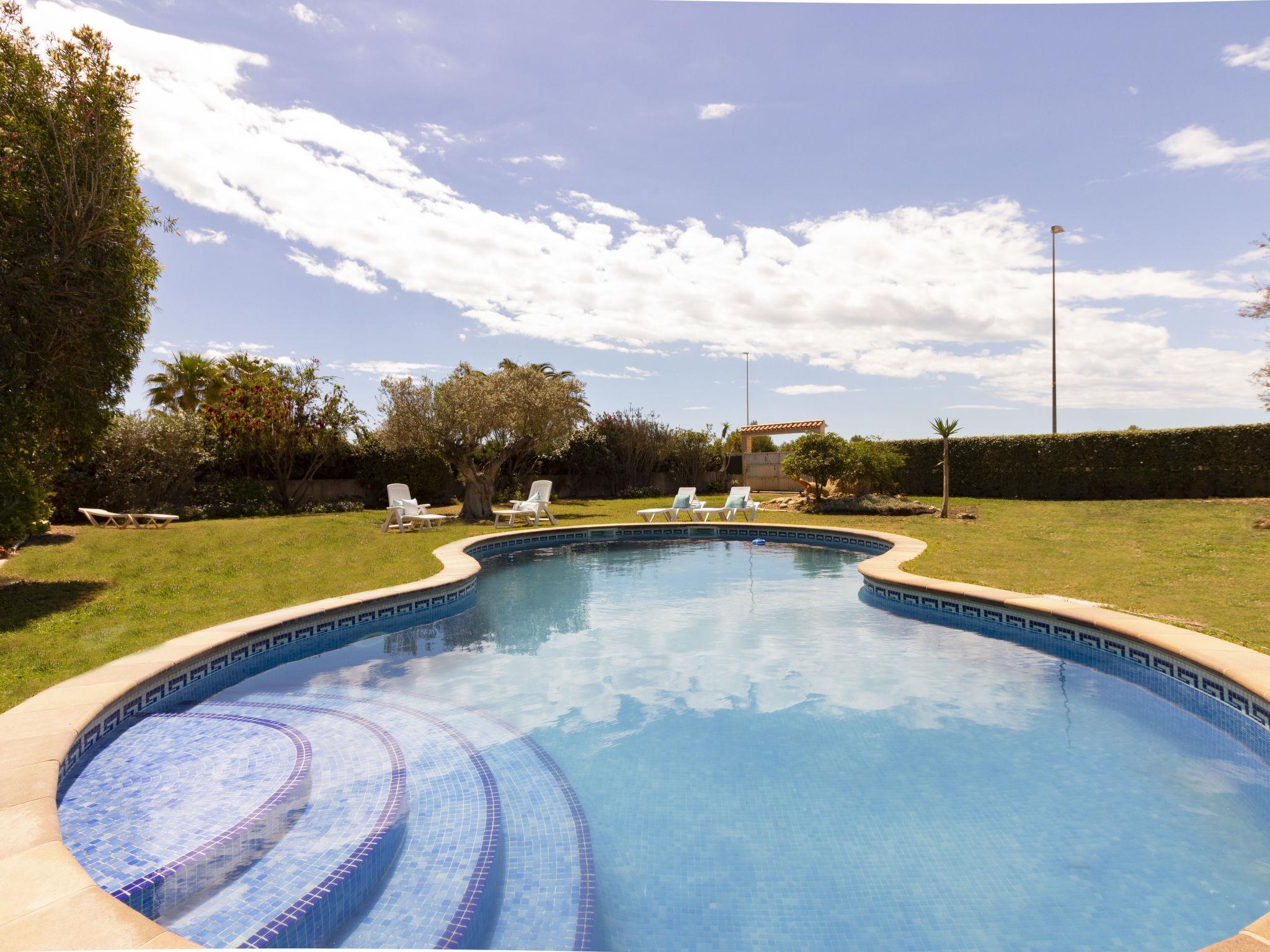 Urb. Riumar 8 km from Deltebre: Beautiful, comfortable house "El Jardi", built in 2000. In a quiet, sunny position residential area (villas), 200 m from the sea, 200 m from the beach. Private: large, beautiful garden (fenced) with lawn 1'800 m2, swimming pool kidney shaped (9 x 4 m, depth 180 cm, seasonal availability: 01.Jan. - 31.Dec.) with internal staircase. Outdoor shower, terrace (50 m2), garden furniture, barbecue, parking on the premises. Grocery 200 m, supermarket 8 km, restaurant, bar 200 m, bus stop "Riumar" 400 m, railway station "Aldea- Amposta" 25 km. Groups of teenagers on request only.