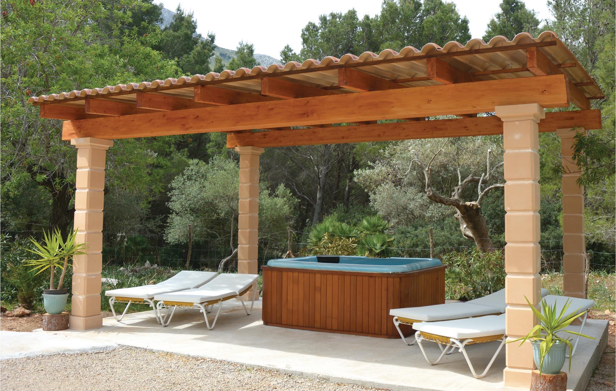 Udendørsområdet er perfekt til at nyde det mediterrane klima. I kan tage en forfriskende dukkert i spabadet eller slappe af på en af liggestolene. Den overdækkede terrasse med siddepladser indbyder til afslapning, mens I nyder den imponerende udsigt til bjergene.