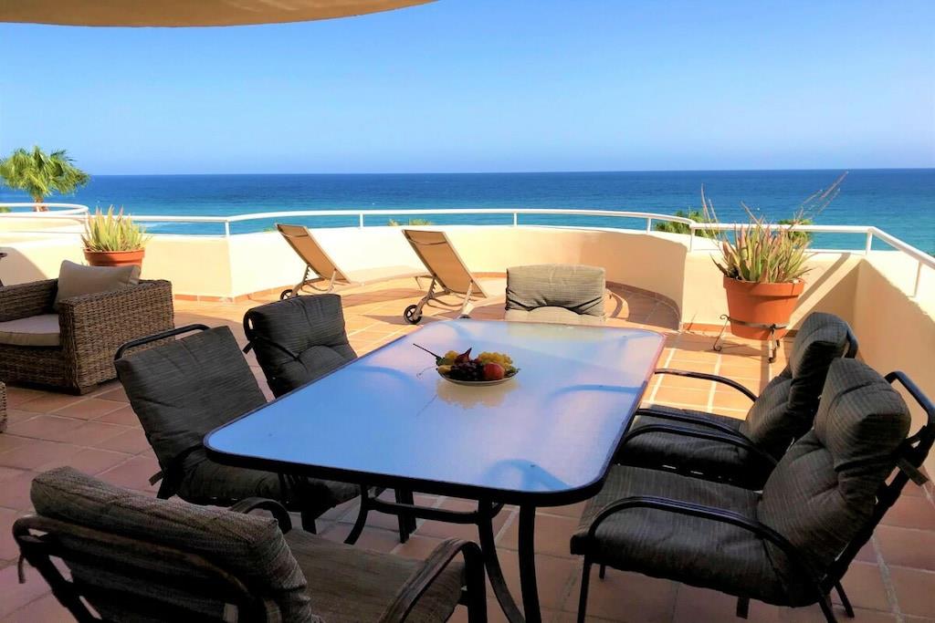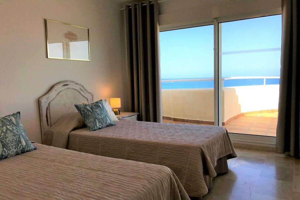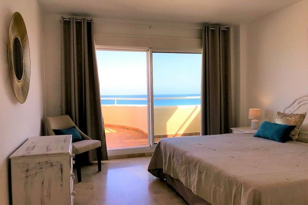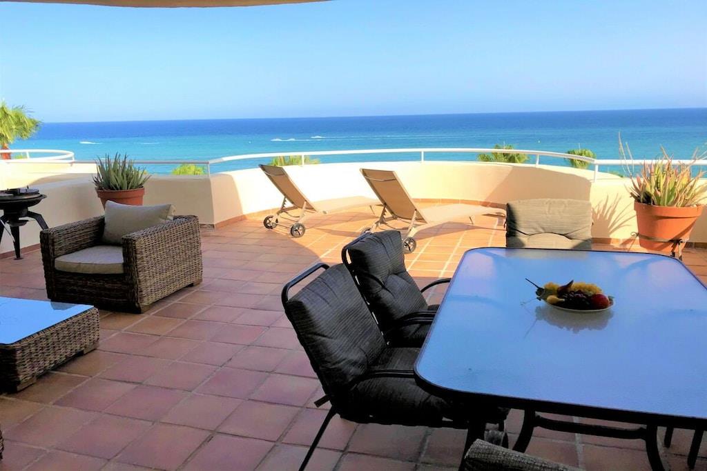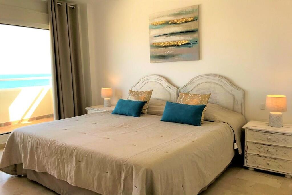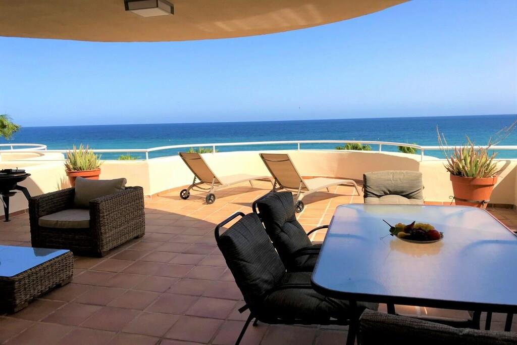 Wir vermieten unsere einzigartige Strandwohnung Penthouse Bermuda Beach 2 an der Costa del Sol. Die Wohnung ist sehr geräumig (280m² inkl. Terrassen) und bietet somit sehr viel Platz und Komfort. Die Wohnung wurde im Jahr 2020 aufwendig renoviert & neu eingerichtet. Im Eingangsgeschoss erwarten Sie dass große Wohn-Esszimmer, die komplett ausgestattete neue Küche, ein Gäste-WC und ein Abstellraum. Das Wohnzimmer verfügt über einen großen Essbereich für 6 Personen und einen bequemen Wohnbereich mit Sofas und Stuhl. Wenn Sie im Wohnzimmer sitzen, sehen Sie direkt aufs offene Meer hinaus! Vom Wohnzimmer haben Sie direkten Zugang zur 60m² großen, teilweise überdachten, Hauptterrasse. Hier können Sie Ihr Frühstück oder Abendessen entspannt in der Sonne genießen und dem Meer lauschen. Hier haben Sie eine große Lounge-Garnitur mit 3-er Sofa und 2 Sessel dazu 2 Sonnenliegen. TRAUMHAFTER AUSBLICK ÜBER DIE GESAMTE KÜSTE! Daneben gibt es einen großen Esstisch und einen Grill. Durch eine Innentreppe gelangt man ins 1.OG, woch sich alle Schlafzimmer befinden. Alle Schlafzimmer sind sehr geräumig und verfügen über eingebaute Wandschränke mit mehr als ausreichend Stauraum. Das Hauptschlafzimmer ist grösser und bietet ein Doppelbett und ein eigenes en-suite-Vollbad mit Doppelwaschbecken, WC, Bidet und Badewanne mit Dusche an. Vor dem Hauptschlafzimmer und dem 2.Gästezimmer befindet sich eine zweite große Terrasse mit einem zweiten Gartentisch. Wenn Sie in Ihrem Bett liegen, schauen Sie aufs offene Meer hinaus! Die restlichen Schlafzimmer verfügen über Einzelbetten und teilen sich ein Duschbad im Gang. Über eine Innentreppe gelangt man schließlich ins 2 OG., wo sich die 50m² große Dachterrasse befindet. Von dieser Terrasse aus genießt man einen wunderschönen Rund-Um-Blick über die gesamte nahe Küste von Estepona bis nach Gibraltar und Nordafrika. Sonnenhungrige haben hier bis spät abends direkten Sonnenschein.