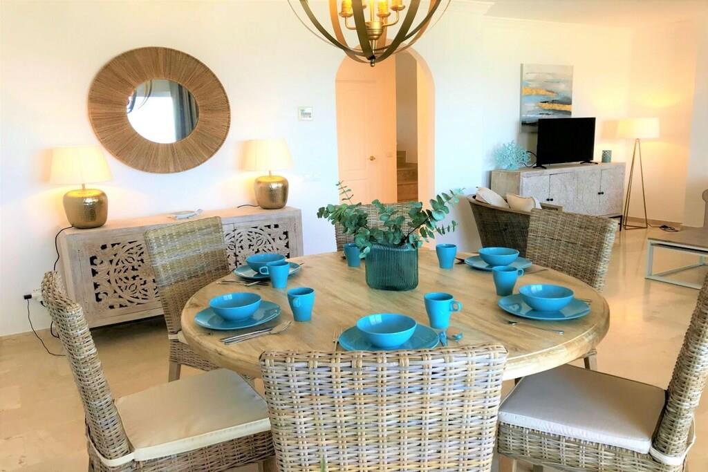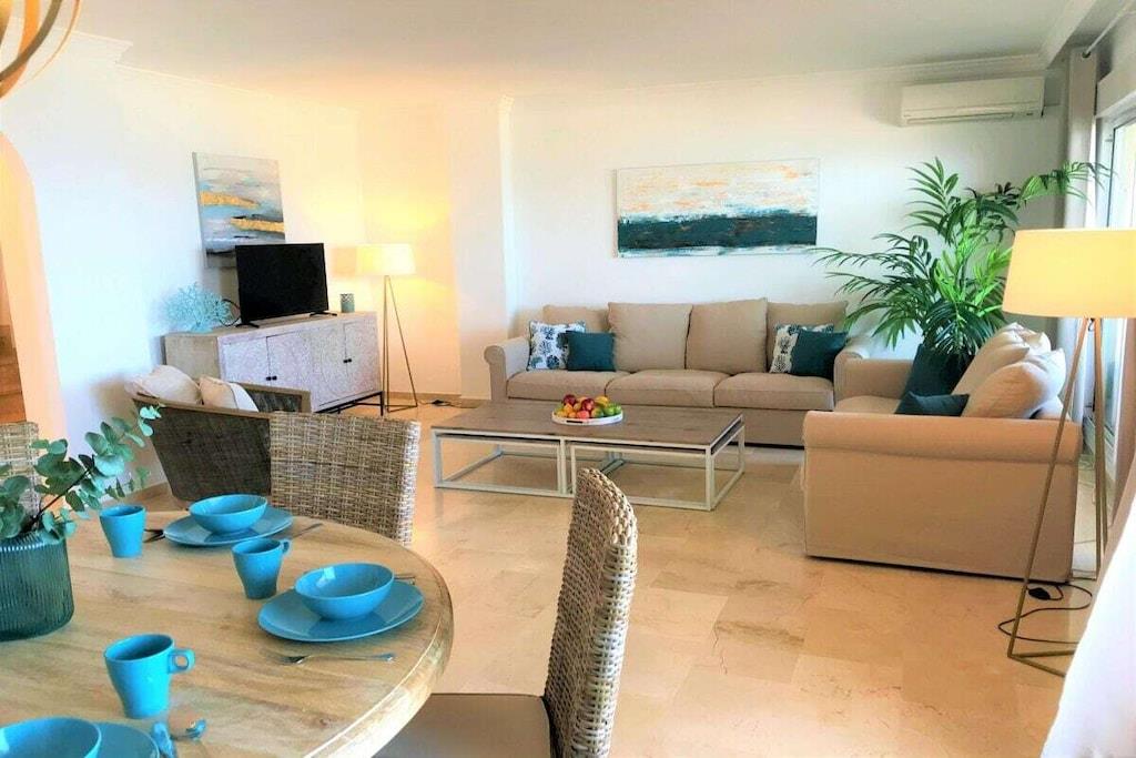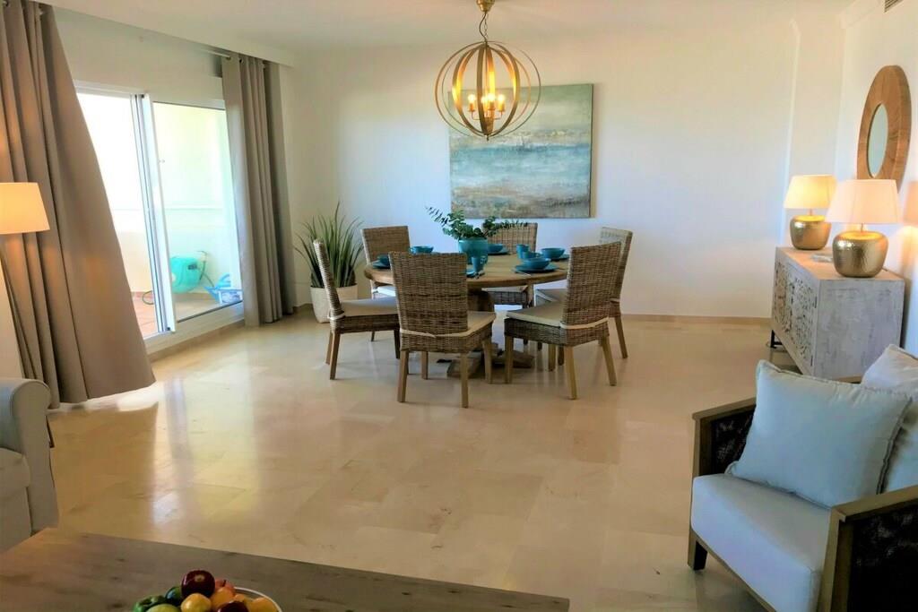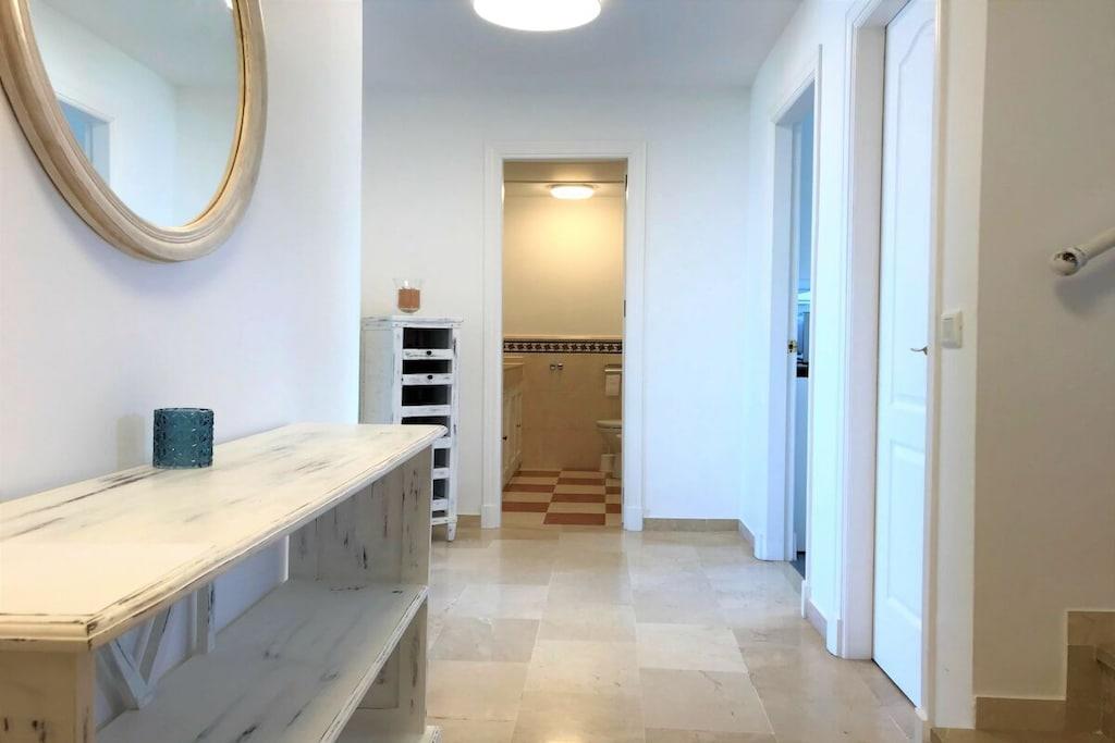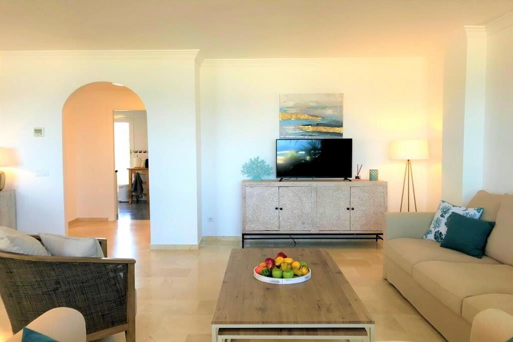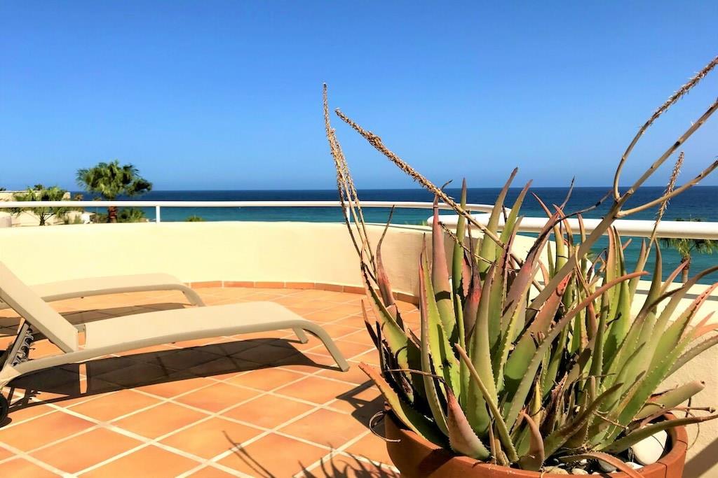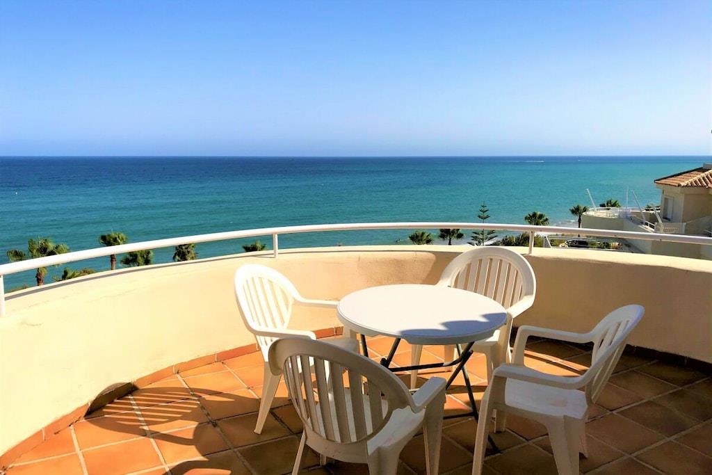 Wir vermieten unsere einzigartige Strandwohnung Penthouse Bermuda Beach 2 an der Costa del Sol. Die Wohnung ist sehr geräumig (280m² inkl. Terrassen) und bietet somit sehr viel Platz und Komfort. Die Wohnung wurde im Jahr 2020 aufwendig renoviert & neu eingerichtet. Im Eingangsgeschoss erwarten Sie dass große Wohn-Esszimmer, die komplett ausgestattete neue Küche, ein Gäste-WC und ein Abstellraum. Das Wohnzimmer verfügt über einen großen Essbereich für 6 Personen und einen bequemen Wohnbereich mit Sofas und Stuhl. Wenn Sie im Wohnzimmer sitzen, sehen Sie direkt aufs offene Meer hinaus! Vom Wohnzimmer haben Sie direkten Zugang zur 60m² großen, teilweise überdachten, Hauptterrasse. Hier können Sie Ihr Frühstück oder Abendessen entspannt in der Sonne genießen und dem Meer lauschen. Hier haben Sie eine große Lounge-Garnitur mit 3-er Sofa und 2 Sessel dazu 2 Sonnenliegen. TRAUMHAFTER AUSBLICK ÜBER DIE GESAMTE KÜSTE! Daneben gibt es einen großen Esstisch und einen Grill. Durch eine Innentreppe gelangt man ins 1.OG, woch sich alle Schlafzimmer befinden. Alle Schlafzimmer sind sehr geräumig und verfügen über eingebaute Wandschränke mit mehr als ausreichend Stauraum. Das Hauptschlafzimmer ist grösser und bietet ein Doppelbett und ein eigenes en-suite-Vollbad mit Doppelwaschbecken, WC, Bidet und Badewanne mit Dusche an. Vor dem Hauptschlafzimmer und dem 2.Gästezimmer befindet sich eine zweite große Terrasse mit einem zweiten Gartentisch. Wenn Sie in Ihrem Bett liegen, schauen Sie aufs offene Meer hinaus! Die restlichen Schlafzimmer verfügen über Einzelbetten und teilen sich ein Duschbad im Gang. Über eine Innentreppe gelangt man schließlich ins 2 OG., wo sich die 50m² große Dachterrasse befindet. Von dieser Terrasse aus genießt man einen wunderschönen Rund-Um-Blick über die gesamte nahe Küste von Estepona bis nach Gibraltar und Nordafrika. Sonnenhungrige haben hier bis spät abends direkten Sonnenschein.