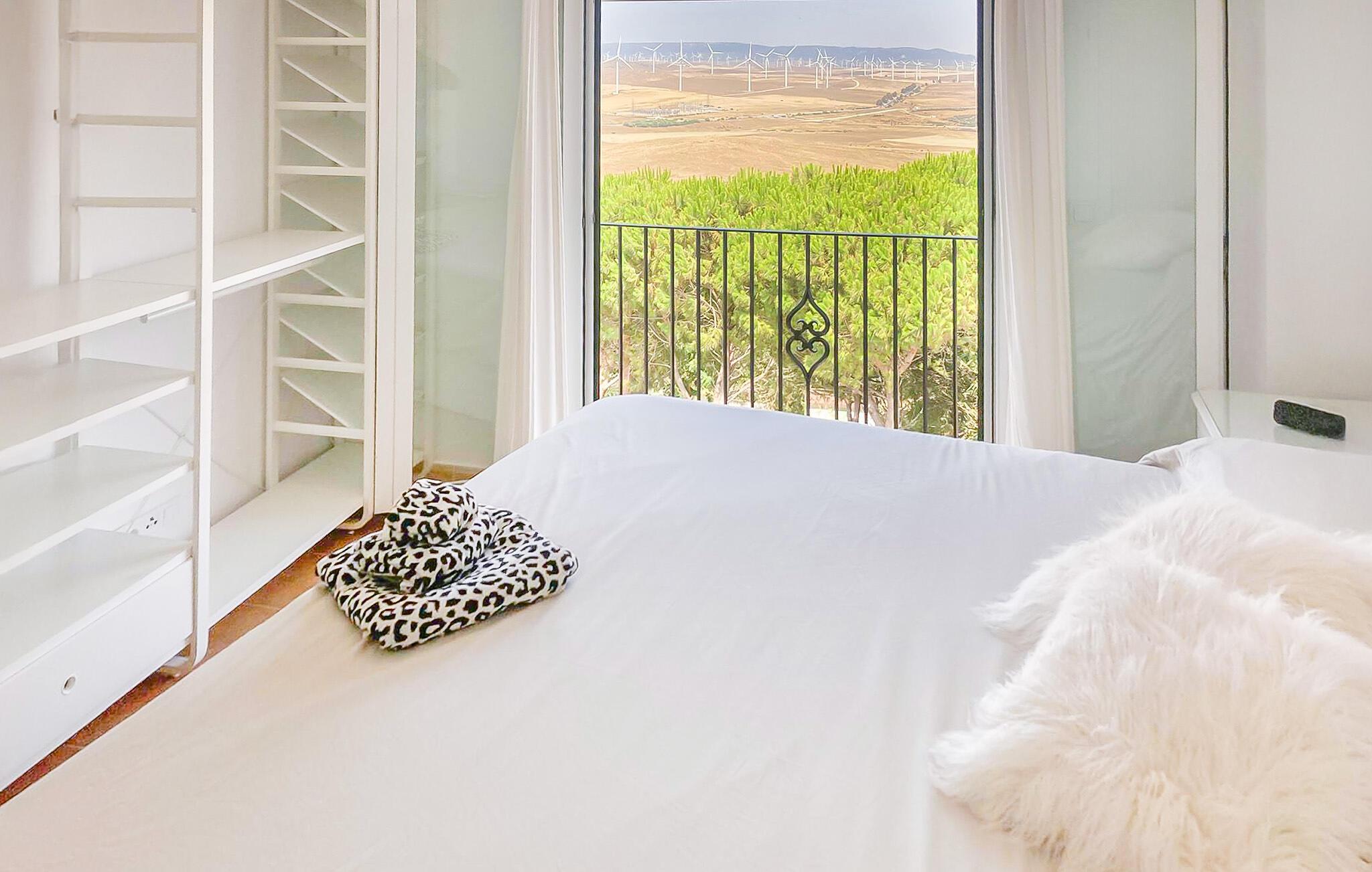 Nyd en afslappende ferie i denne ferielejlighed med betagende udsigt over det omkringliggende landskab. Oplev Andalusien, når den er mest autentisk. Jeres hyggelige lejlighed er ideel til par eller små familier. Nyd fred og ro, omgivet af natur, beliggende blandt bølgende bakker og kun få kilometer fra kysten. Nyd panoramaudsigten over det grønne landskab. Slap af i den komfortable sofa foran fjernsynet og tilbring hyggelige timer ved pejsen. Store vinduer og lyse farver skaber en indbydende atmosfære, mens de smagfulde møbler sikrer komfort. Tilbered andalusiske retter i det charmerende køkken, mens I kigger ud over bakkerne. Åbn altandørene og lad den friske havluft komme ind. Nyd udsigten og slap af om aftenen med et glas vin, mens solen går ned over landskabet. Udforsk området omkring Facinas. Tag en vandretur i naturparken Los Alcornocales, besøg regionens hvide landsbyer, eller oplev strandene i Tarifa, Zahara de los Atunes og Bolonia. Den historiske by Cádiz og den maurisk inspirerede by Vejer de la Frontera er også et besøg værd.