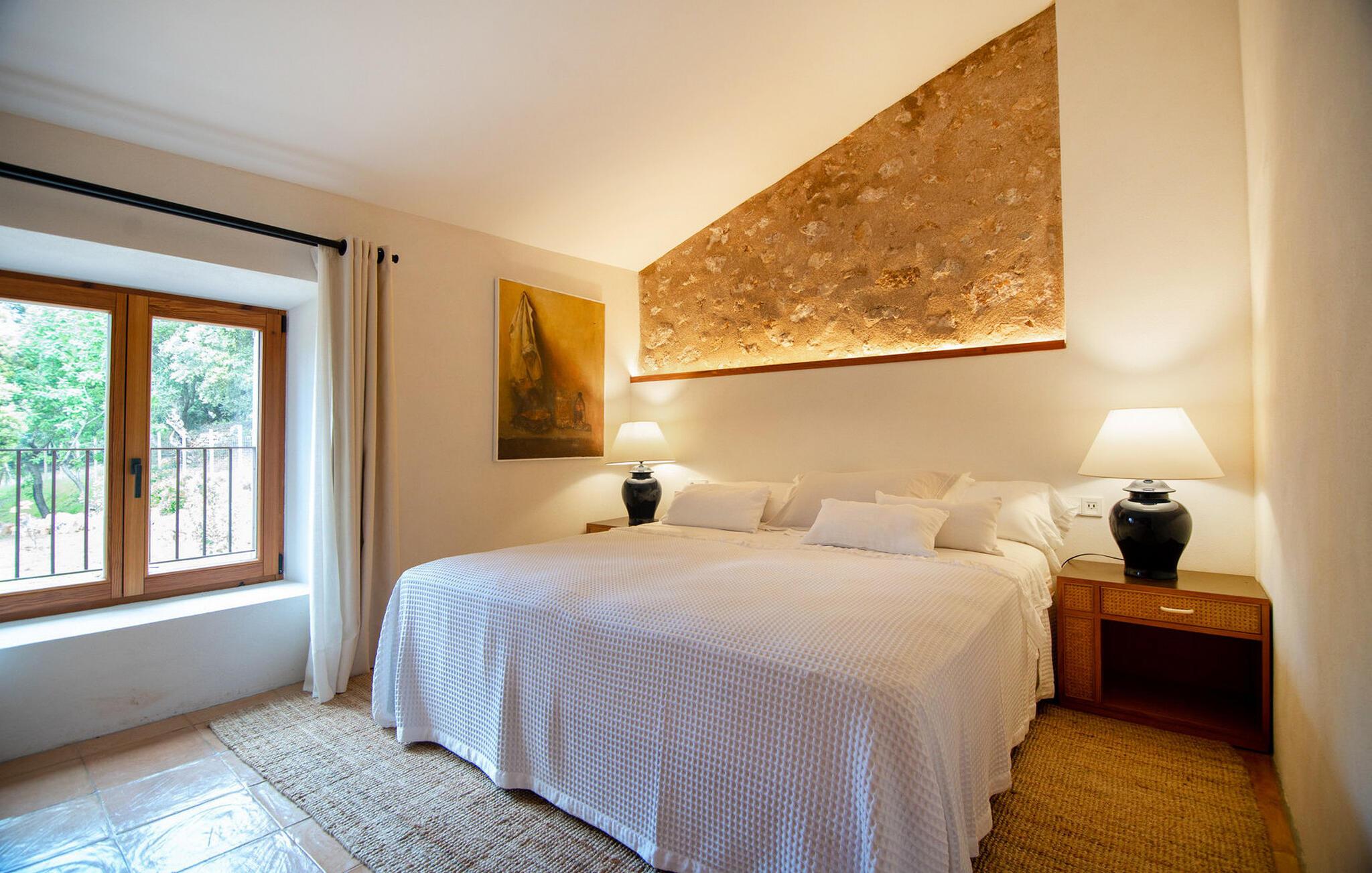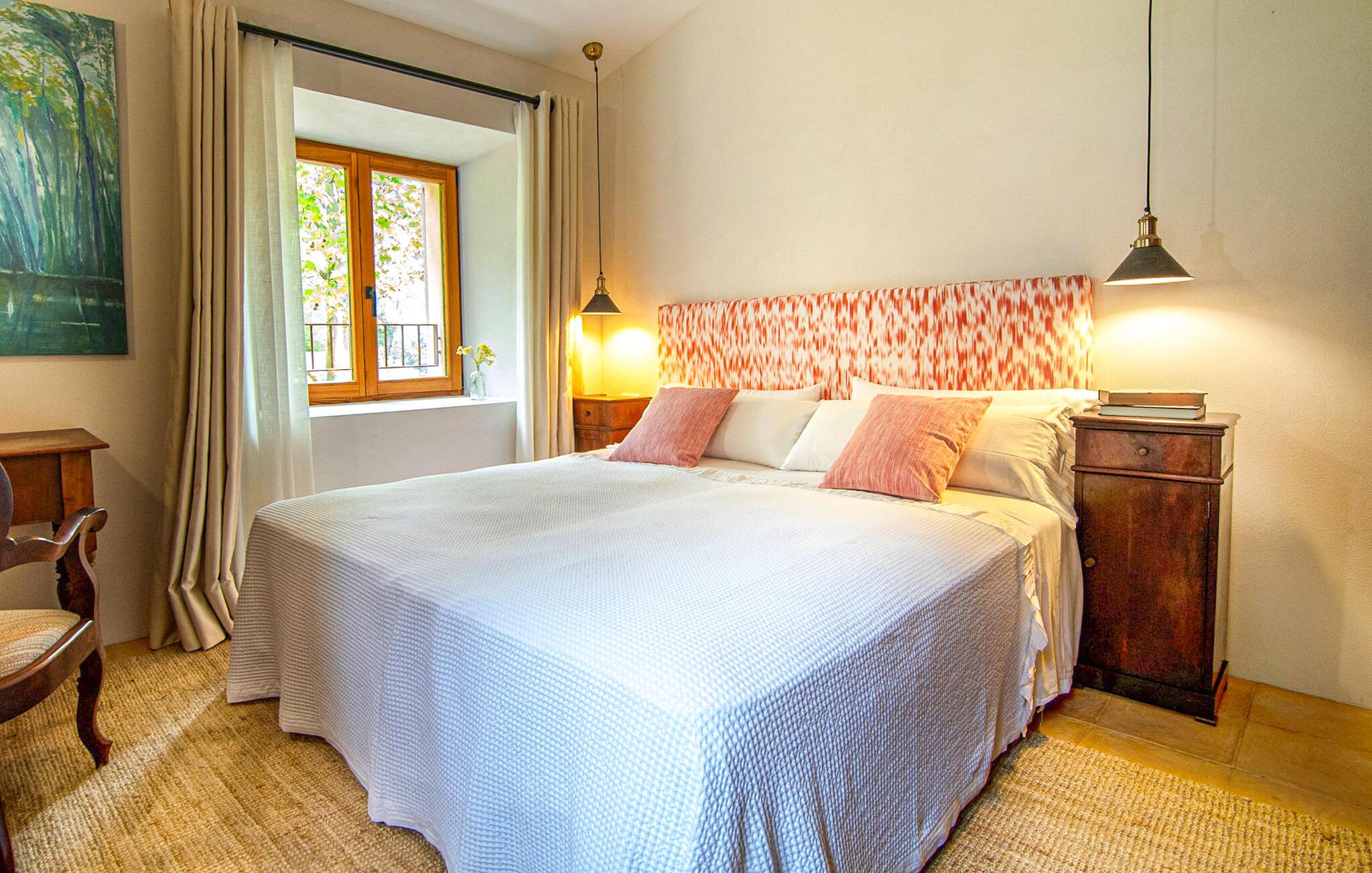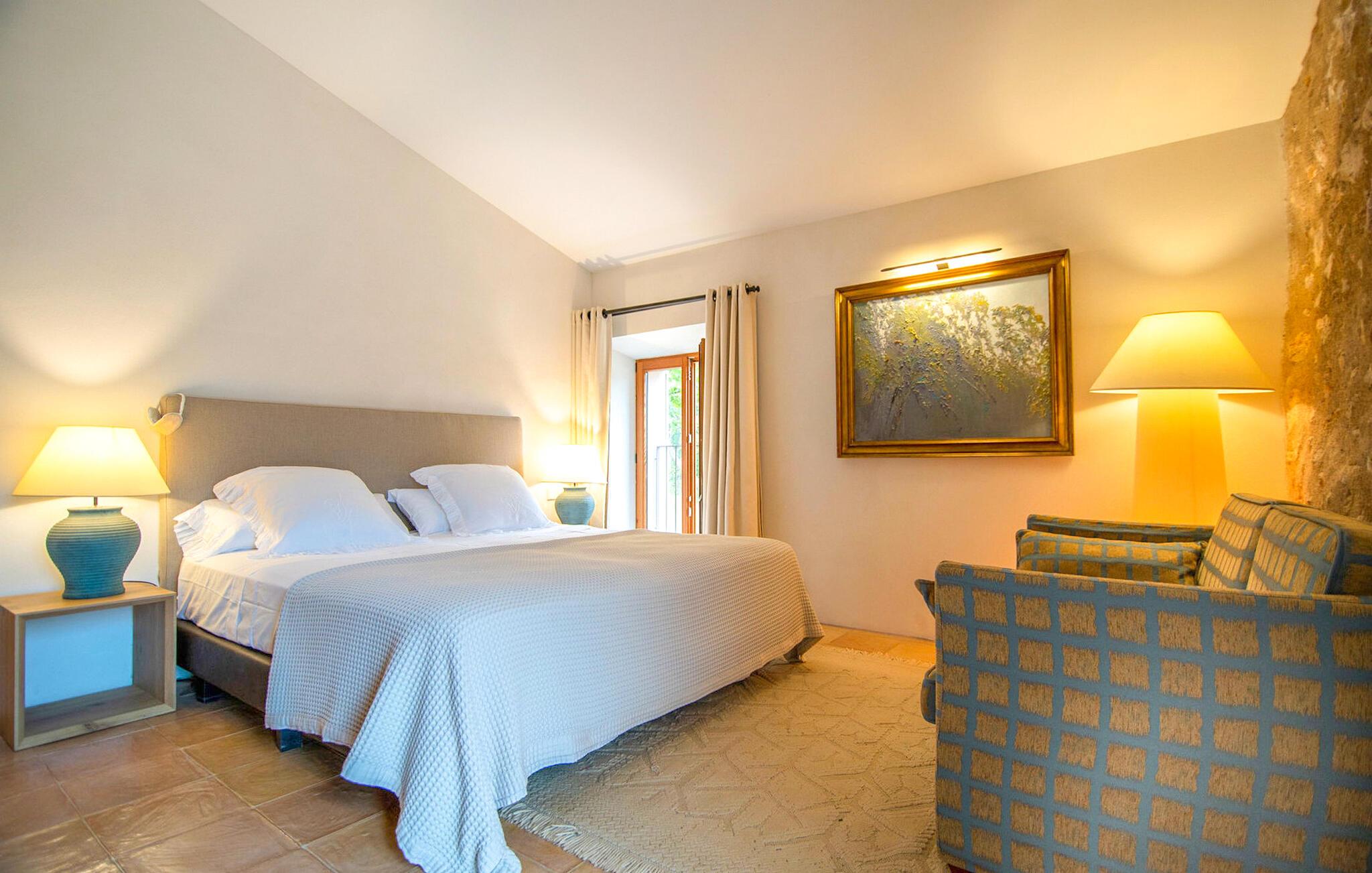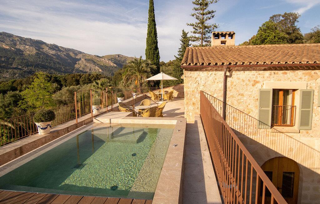 Den luksuriøst renoverede Can Guillem-Bet ejendom ser tilbage på 600 års historie og tilbyder smagfuldt restaureret indkvartering for op til 12 gæster. Udearealet har et 12 x 4 meter stort bassin og et rummeligt spabad på tagterrassen, som byder på en sensationel udsigt over det omkringliggende bjerglandskab. Det elegante poolområde omfatter en subtilt skyggefuld lounge, en indbydende spiseplads for hele gruppen og et sommerkøkken med en muret grill. Tagterrassen med spabad byder på ekstra siddepladser med en vidunderlig udsigt over de idylliske omgivelser. Rundt om huset, med en vidunderlig udsigt over de velholdte haver, finder I andre hyggelige retreater. Takket være dens afsondrede beliggenhed kan I nyde absolut fred og maksimalt privatliv i denne eksklusive mallorcanske "besiddelse". Med et boligareal på næsten 800 m², fordelt på to etager, kan I forvente rummelige værelser, der kombinerer originale elementer med moderne indretning for maksimal komfort og hygge. Stueetagen har en stor stue med pejs og en anden, smagfuldt indrettet lounge, der åbner ud til den øverste jacuzzi-terrasse. Til jeres fornøjelse er der et indbydende køkken med stort spisebord og seks hyggelige soveværelser med dobbeltsenge, hver med eget badeværelse. Dette usædvanligt smukke feriehus byder på mange hyggelige indendørs retreater, selv når de er fuldt besat. Både det primære opholdsrum og soveværelserne er udstyret med aircondition og varme. Glæd jer til en afslappende ferie med familie eller venner midt i et idyllisk, uberørt naturlandskab. Fincaen "Can Guillem-Bet" ligger i en dal i den nordøstlige del af Tramuntana-bjergene. Der er gode shoppingmuligheder i Pollensa, 14 minutters kørsel derfra. Den maleriske havn i Puerto Pollensa med sine restauranter og promenade samt den lange sandstrand ligger 18 minutter væk i bil.
