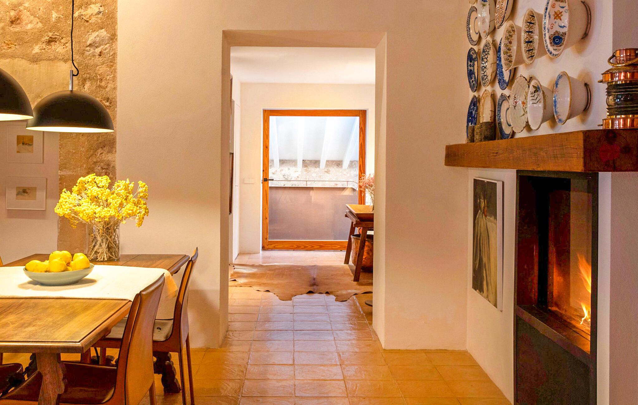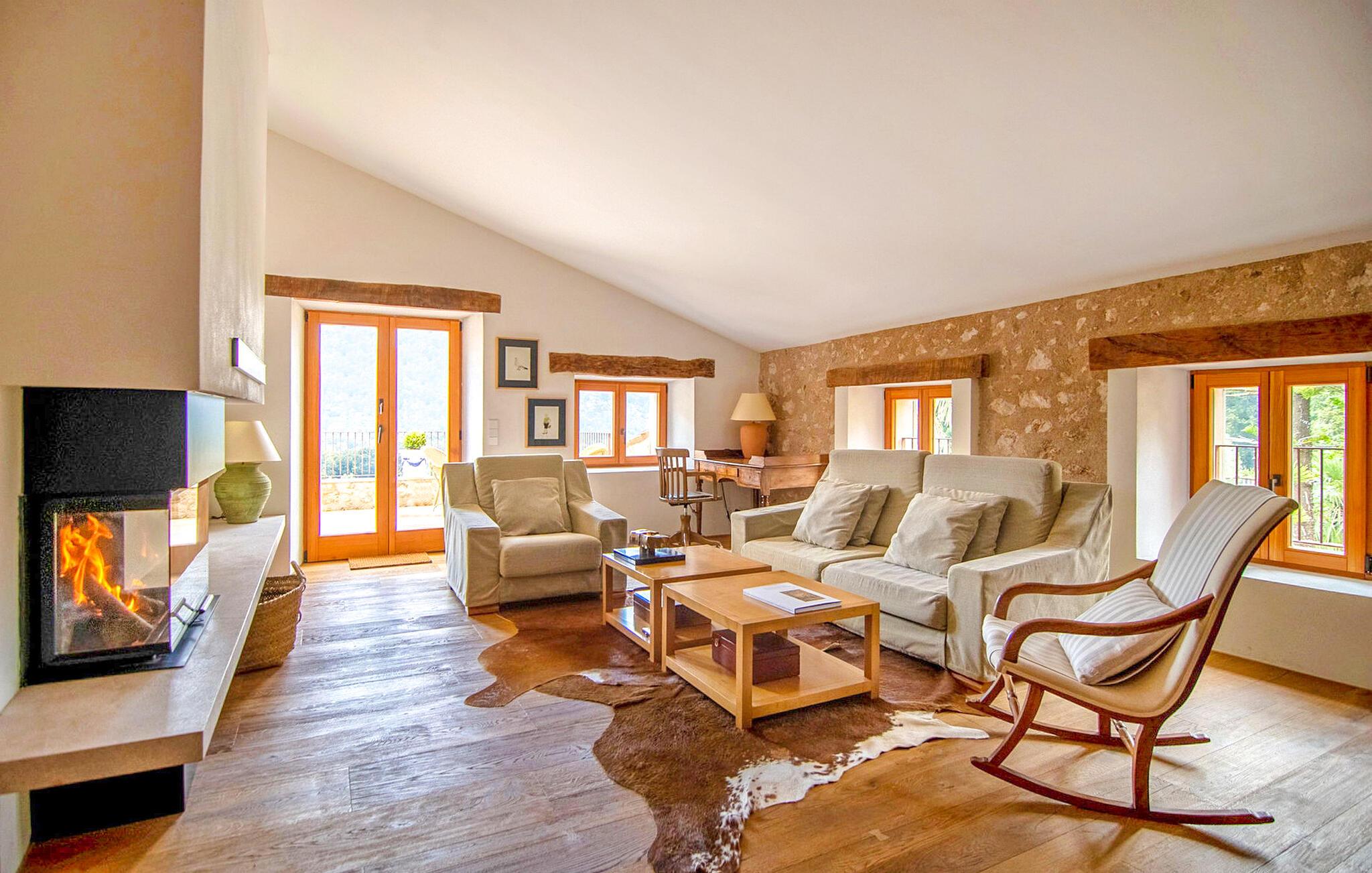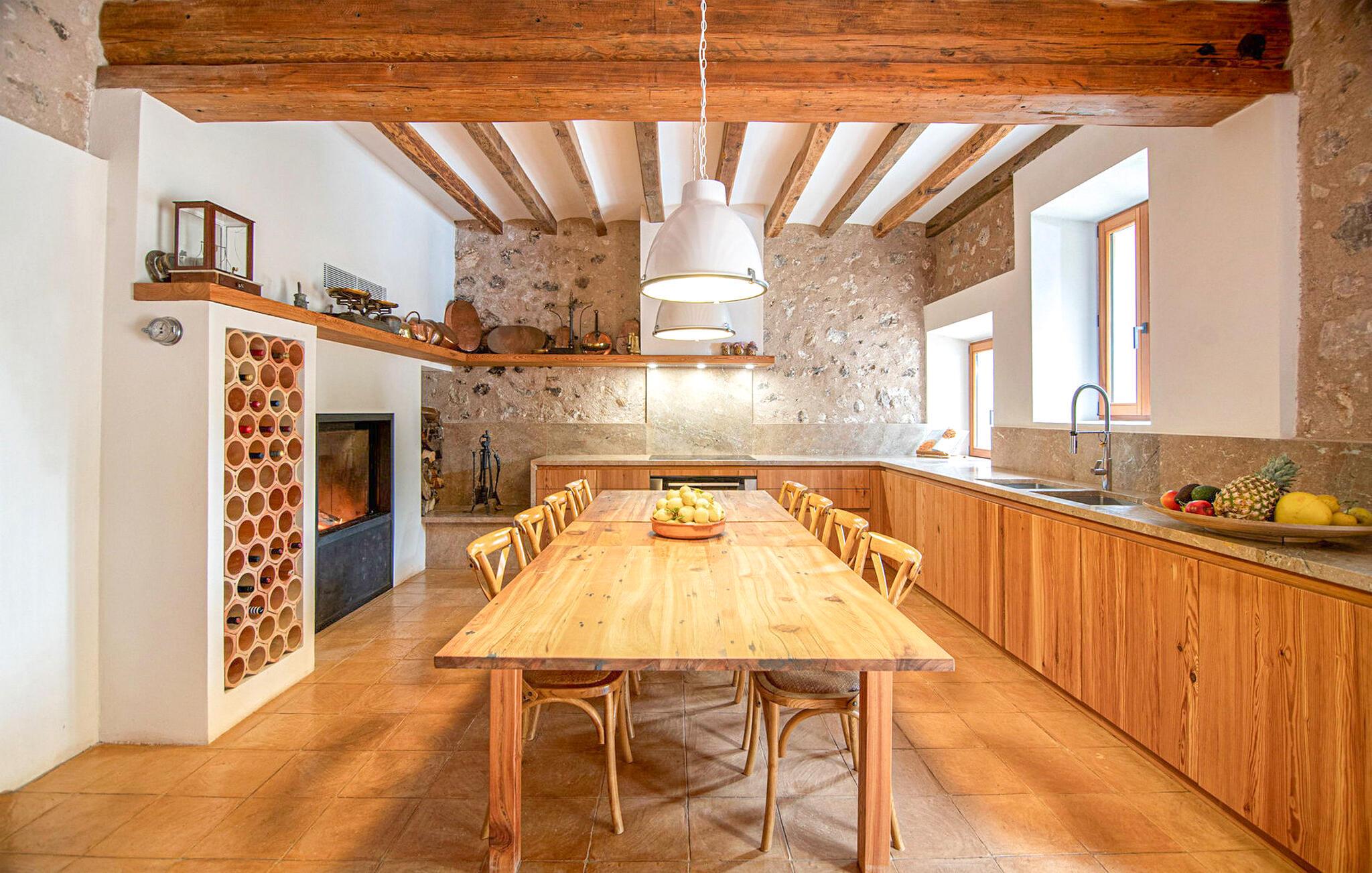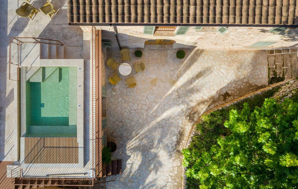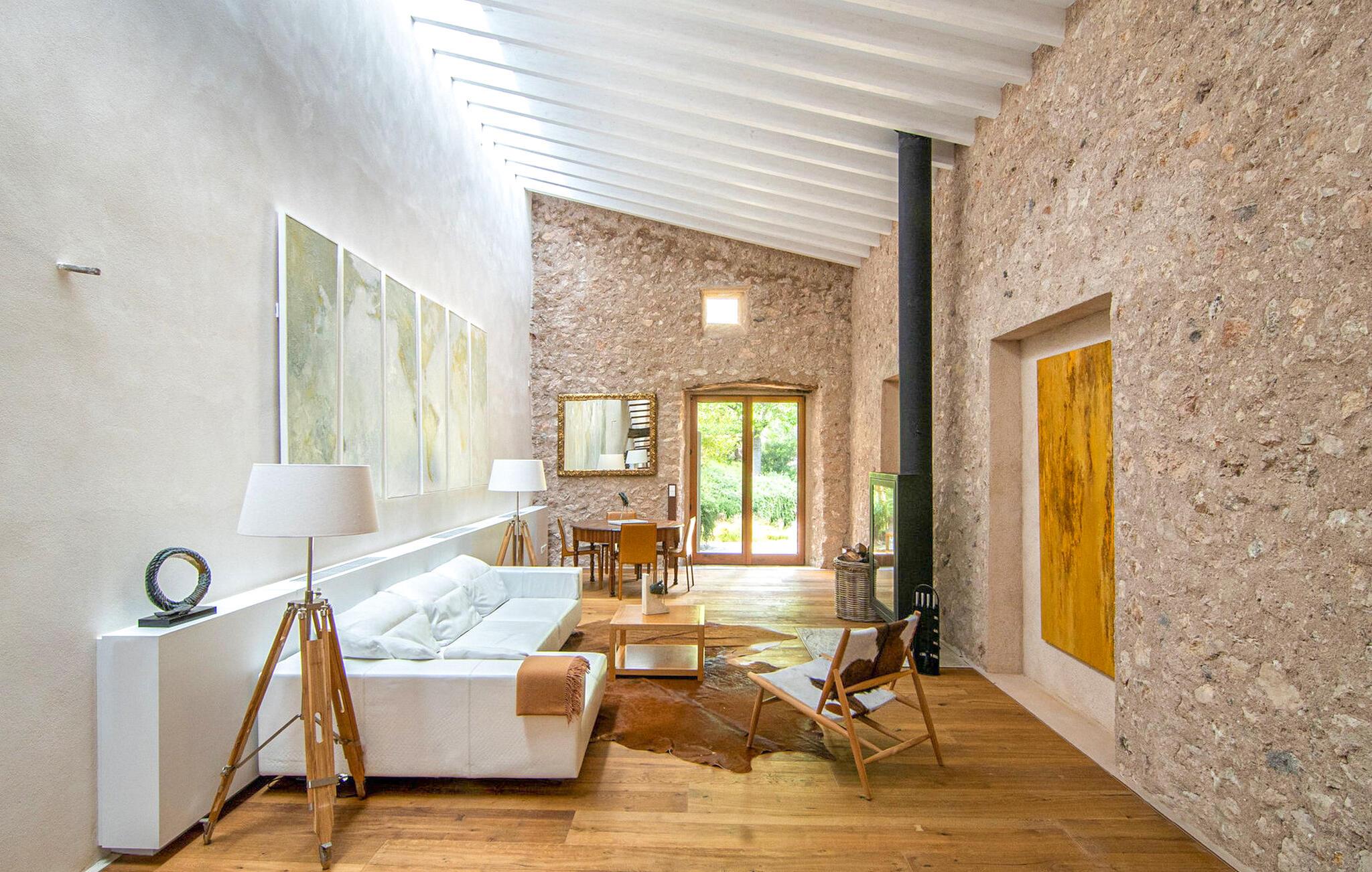 Den luksuriøst renoverede Can Guillem-Bet ejendom ser tilbage på 600 års historie og tilbyder smagfuldt restaureret indkvartering for op til 12 gæster. Udearealet har et 12 x 4 meter stort bassin og et rummeligt spabad på tagterrassen, som byder på en sensationel udsigt over det omkringliggende bjerglandskab. Det elegante poolområde omfatter en subtilt skyggefuld lounge, en indbydende spiseplads for hele gruppen og et sommerkøkken med en muret grill. Tagterrassen med spabad byder på ekstra siddepladser med en vidunderlig udsigt over de idylliske omgivelser. Rundt om huset, med en vidunderlig udsigt over de velholdte haver, finder I andre hyggelige retreater. Takket være dens afsondrede beliggenhed kan I nyde absolut fred og maksimalt privatliv i denne eksklusive mallorcanske "besiddelse". Med et boligareal på næsten 800 m², fordelt på to etager, kan I forvente rummelige værelser, der kombinerer originale elementer med moderne indretning for maksimal komfort og hygge. Stueetagen har en stor stue med pejs og en anden, smagfuldt indrettet lounge, der åbner ud til den øverste jacuzzi-terrasse. Til jeres fornøjelse er der et indbydende køkken med stort spisebord og seks hyggelige soveværelser med dobbeltsenge, hver med eget badeværelse. Dette usædvanligt smukke feriehus byder på mange hyggelige indendørs retreater, selv når de er fuldt besat. Både det primære opholdsrum og soveværelserne er udstyret med aircondition og varme. Glæd jer til en afslappende ferie med familie eller venner midt i et idyllisk, uberørt naturlandskab. Fincaen "Can Guillem-Bet" ligger i en dal i den nordøstlige del af Tramuntana-bjergene. Der er gode shoppingmuligheder i Pollensa, 14 minutters kørsel derfra. Den maleriske havn i Puerto Pollensa med sine restauranter og promenade samt den lange sandstrand ligger 18 minutter væk i bil.