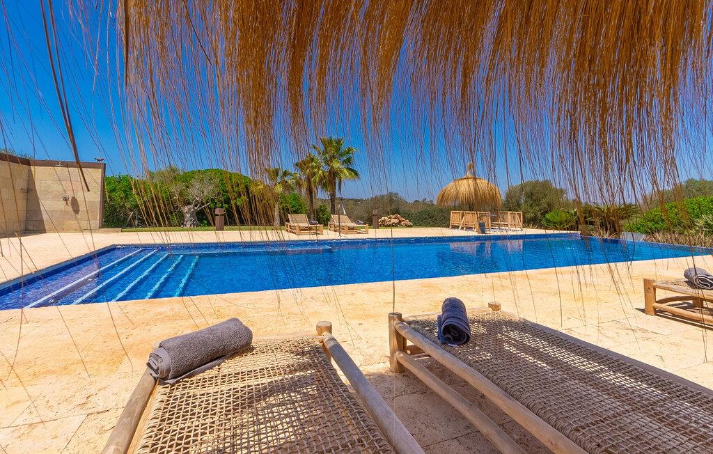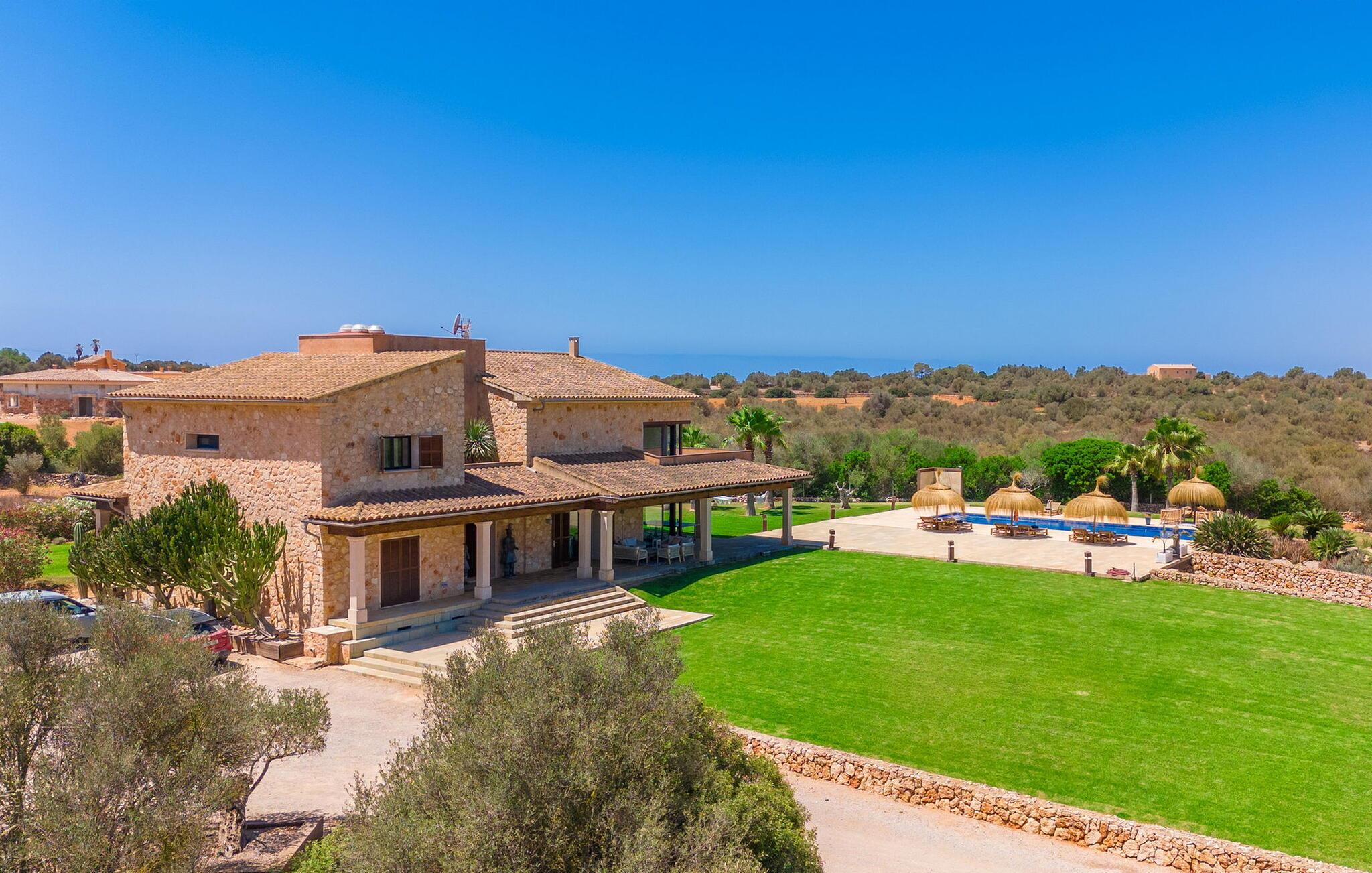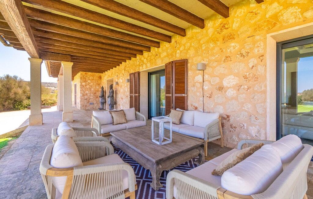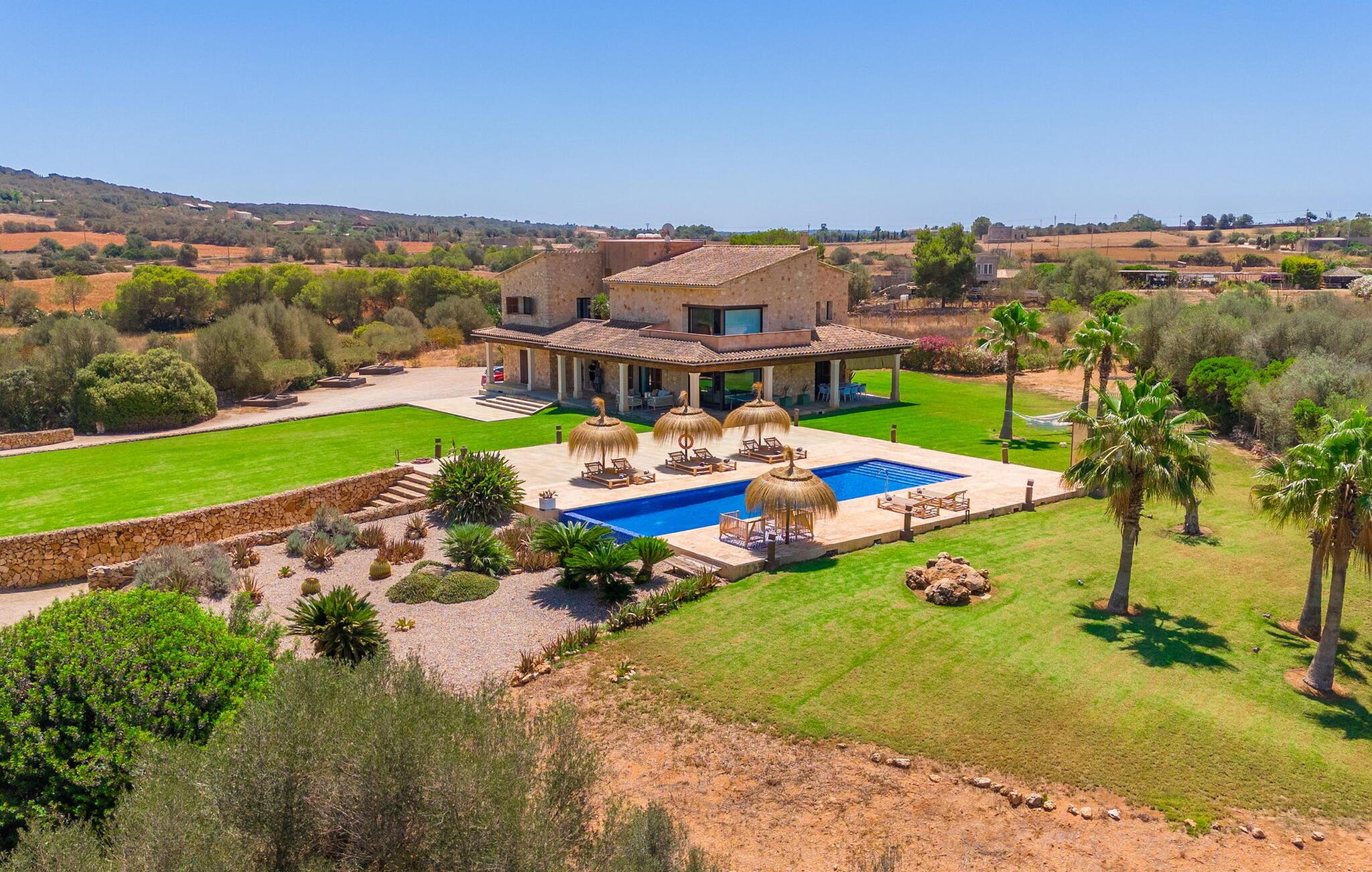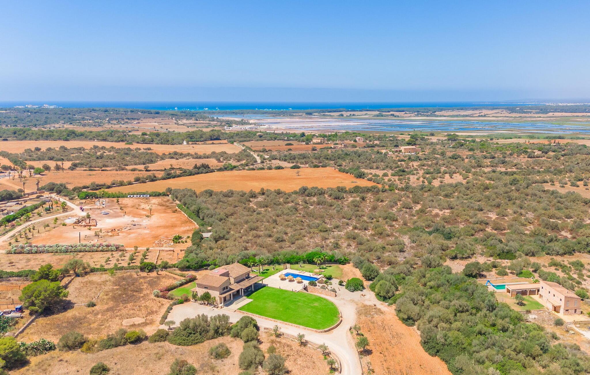 Stuehuset "Flor de Sal a Sa Canoveta" er perfekt til feriegæster med designkrav. Den rummelige ejendom er en drømmeagtig middelhavsoase fuld af palmer, frugt- og oliventræer, rummelige græsplæner og fænomenal udsigt. Midt i haven ligger den klorfri pool i XL-format og afslappet infinity-stil. En udendørs bruser med varmt vand og en hydromassagebruser i poolen fuldender luksusen. De komfortable designer liggestole på den omkringliggende solterrasse tilbyder også maksimal afslapning. Både unge og gamle kan nyde et socialt samvær ved bordtennisbordet eller på de overdækkede terrasser ved huset. Der kan grillen tilberedt på murstensgrillen nydes til middag. Det højkvalitets loungehjørne på den anden overdækkede terrasse giver jer mulighed for at fejre Mallorcas livskvalitet langt ud på natten. Mens bygningen fremstår typisk mallorcansk-rustik med dens klassiske stenbrud, vil du, når I træder ind i huset, blive overrasket af et strejf af luksus med en betagende smuk indretning i et puristisk design. De store gulv-til-loft vinduer lader den rummelige og åbne opholds- og spiseafdeling skinne. Downlights skaber den rigtige atmosfære i dette smarte bondehus. Møblerne af høj kvalitet, den gennemgående hvide stil og værelsernes rummelighed perfektionerer den postmoderne boligatmosfære fuld af ro. Det fuldt udstyrede køkken-alrum med ekstra siddepladser lader intet tilbage at ønske. Når I ser de klimatiserede soveværelser, hver for to personer, vil I opdage rummelige værelser med direkte adgang til terrassen eller balkonen, nogle med eget badeværelse, i eksklusivt design. I dette skønne feriehus for familier og venner finder børn og unge deres egen plads i fjerde og femte soveværelse med to enkeltsenge. "Flor de Sal a Sa Canoveta" står for mallorcanske ferier i perfektion og lethed, som I forventer hele året rundt. Luksusgårdhuset "Flor de Sal a Sa Canoveta" imponerer med en perfekt have med en klorfri XL-pool og fremragende møblerede terrasser. Den spektakulære smukke ejendom ligger i den sydlige del af øen mellem Campos og Colònia de Sant Père. I de omkringliggende landsbyer kan I shoppe eller besøge gode restauranter. Drømmestranden Es Trenc ligger kun 9 minutter væk i bil. Bemærk venligst, at denne ejendom ikke accepterer ungdomsgrupper eller polterabender. En ungdomsgruppe på denne ejendom består af personer på 25 år eller derunder. Book ikke denne ejendom, hvis I er en ungdomsgruppe eller polterabend, da jeres reservation vil blive afvist, når den er booket, hvilket også kan være tilfældet ved ankomst til ejendommen eller under jeres ophold, og I vil ikke modtage en refusion