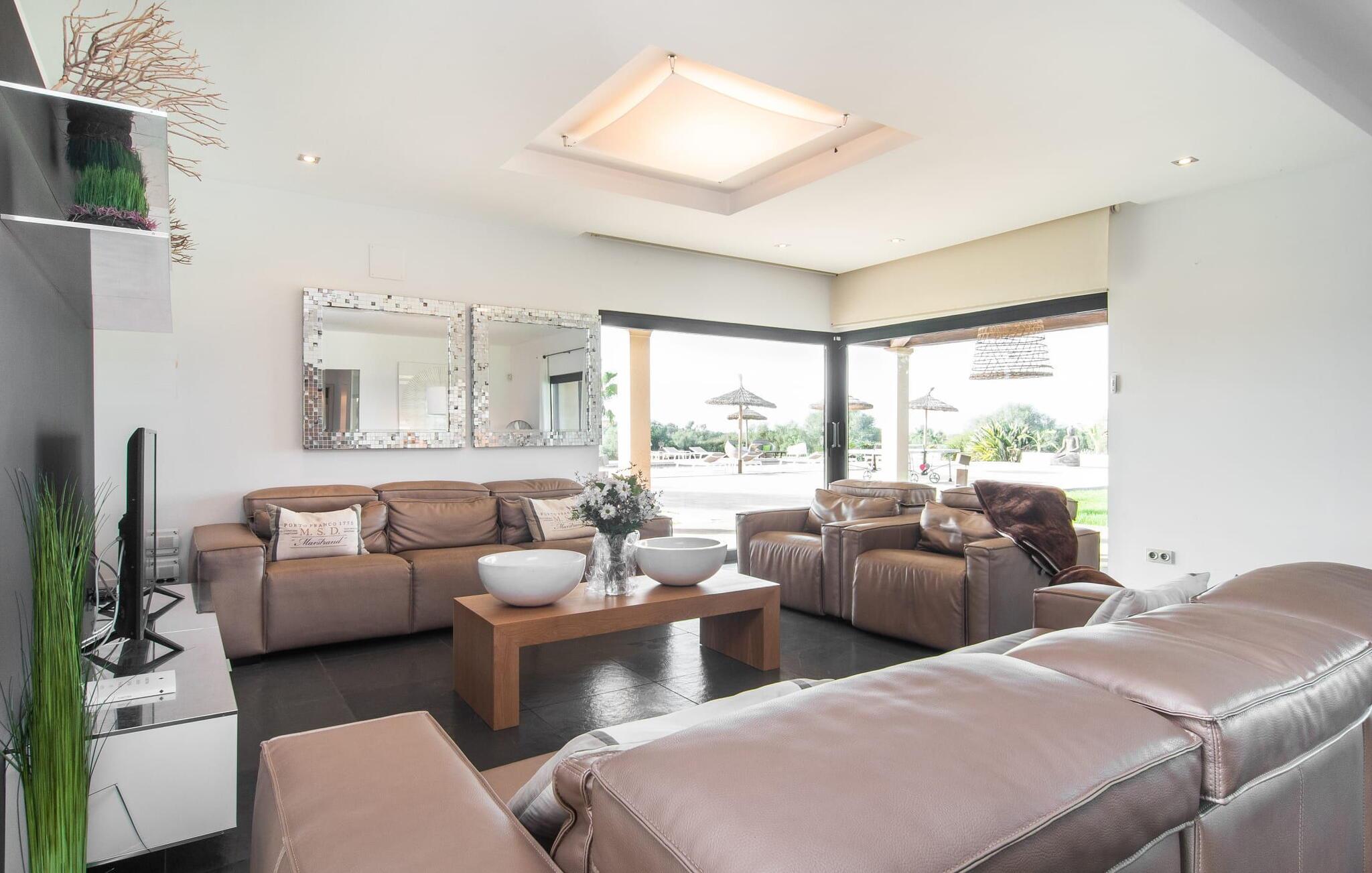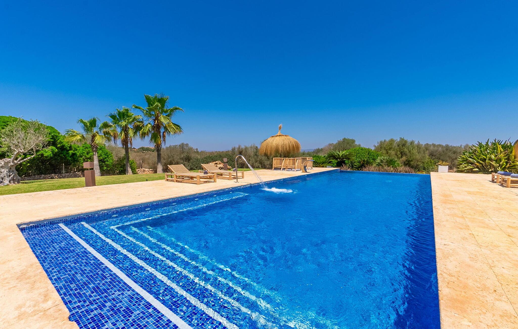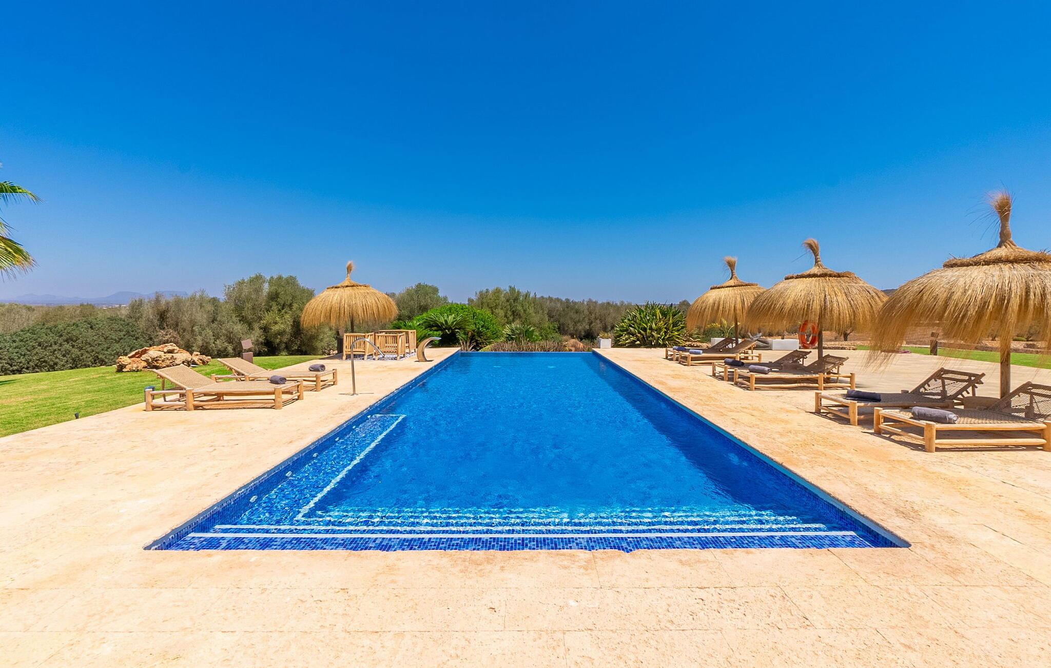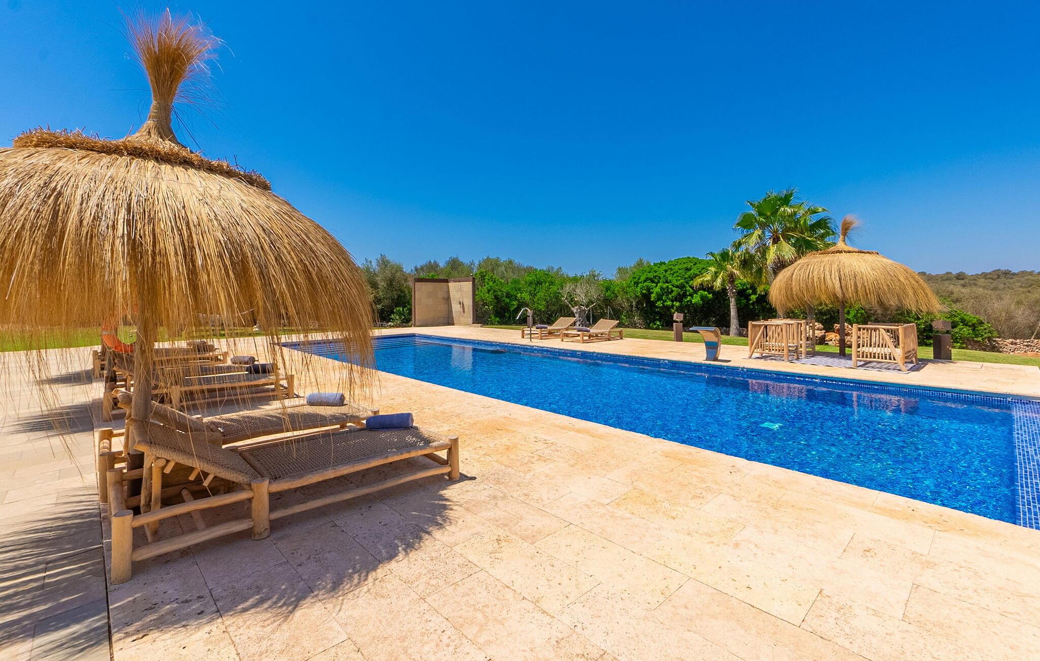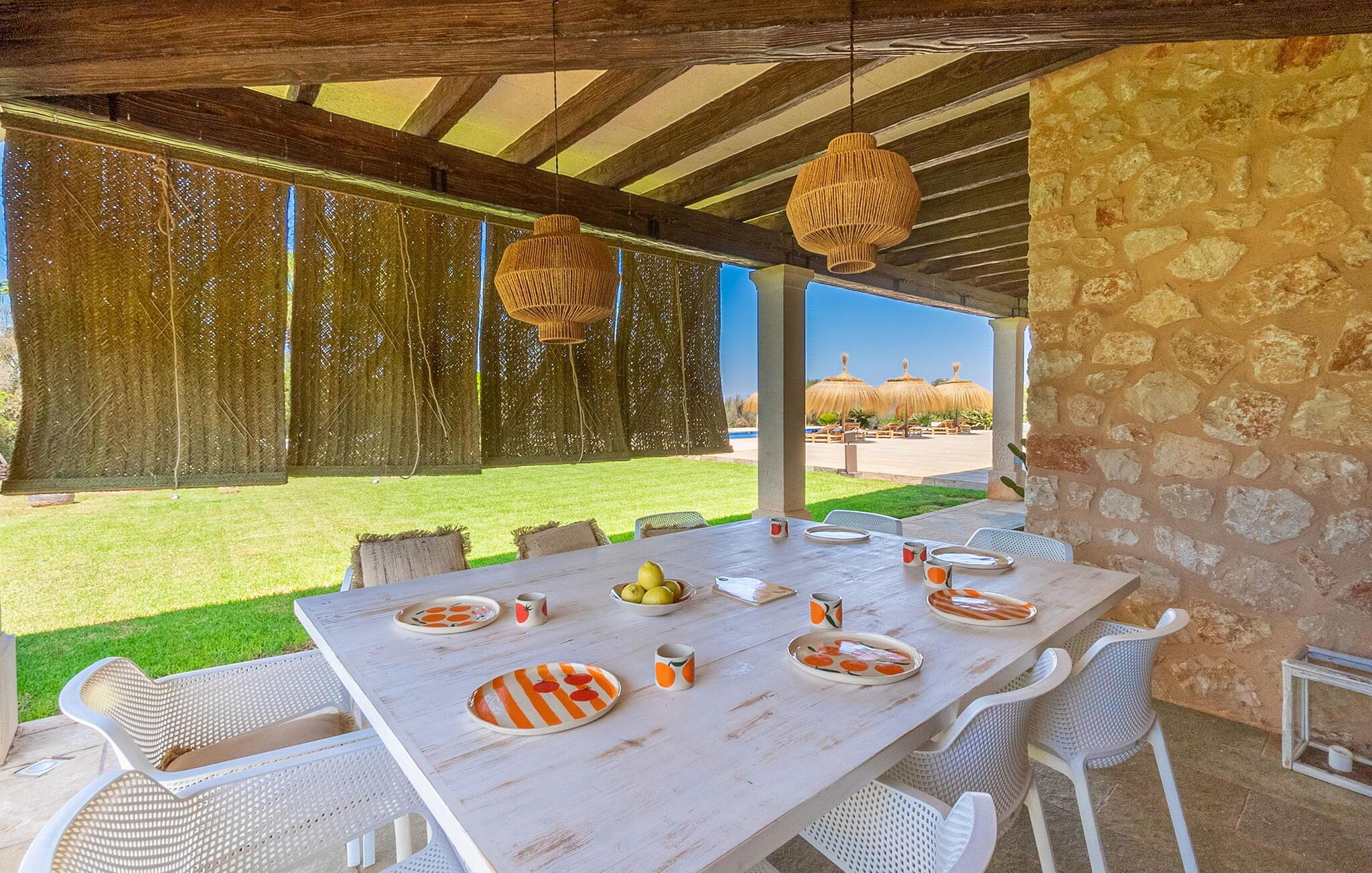 Stuehuset "Flor de Sal a Sa Canoveta" er perfekt til feriegæster med designkrav. Den rummelige ejendom er en drømmeagtig middelhavsoase fuld af palmer, frugt- og oliventræer, rummelige græsplæner og fænomenal udsigt. Midt i haven ligger den klorfri pool i XL-format og afslappet infinity-stil. En udendørs bruser med varmt vand og en hydromassagebruser i poolen fuldender luksusen. De komfortable designer liggestole på den omkringliggende solterrasse tilbyder også maksimal afslapning. Både unge og gamle kan nyde et socialt samvær ved bordtennisbordet eller på de overdækkede terrasser ved huset. Der kan grillen tilberedt på murstensgrillen nydes til middag. Det højkvalitets loungehjørne på den anden overdækkede terrasse giver jer mulighed for at fejre Mallorcas livskvalitet langt ud på natten. Mens bygningen fremstår typisk mallorcansk-rustik med dens klassiske stenbrud, vil du, når I træder ind i huset, blive overrasket af et strejf af luksus med en betagende smuk indretning i et puristisk design. De store gulv-til-loft vinduer lader den rummelige og åbne opholds- og spiseafdeling skinne. Downlights skaber den rigtige atmosfære i dette smarte bondehus. Møblerne af høj kvalitet, den gennemgående hvide stil og værelsernes rummelighed perfektionerer den postmoderne boligatmosfære fuld af ro. Det fuldt udstyrede køkken-alrum med ekstra siddepladser lader intet tilbage at ønske. Når I ser de klimatiserede soveværelser, hver for to personer, vil I opdage rummelige værelser med direkte adgang til terrassen eller balkonen, nogle med eget badeværelse, i eksklusivt design. I dette skønne feriehus for familier og venner finder børn og unge deres egen plads i fjerde og femte soveværelse med to enkeltsenge. "Flor de Sal a Sa Canoveta" står for mallorcanske ferier i perfektion og lethed, som I forventer hele året rundt. Luksusgårdhuset "Flor de Sal a Sa Canoveta" imponerer med en perfekt have med en klorfri XL-pool og fremragende møblerede terrasser. Den spektakulære smukke ejendom ligger i den sydlige del af øen mellem Campos og Colònia de Sant Père. I de omkringliggende landsbyer kan I shoppe eller besøge gode restauranter. Drømmestranden Es Trenc ligger kun 9 minutter væk i bil. Bemærk venligst, at denne ejendom ikke accepterer ungdomsgrupper eller polterabender. En ungdomsgruppe på denne ejendom består af personer på 25 år eller derunder. Book ikke denne ejendom, hvis I er en ungdomsgruppe eller polterabend, da jeres reservation vil blive afvist, når den er booket, hvilket også kan være tilfældet ved ankomst til ejendommen eller under jeres ophold, og I vil ikke modtage en refusion