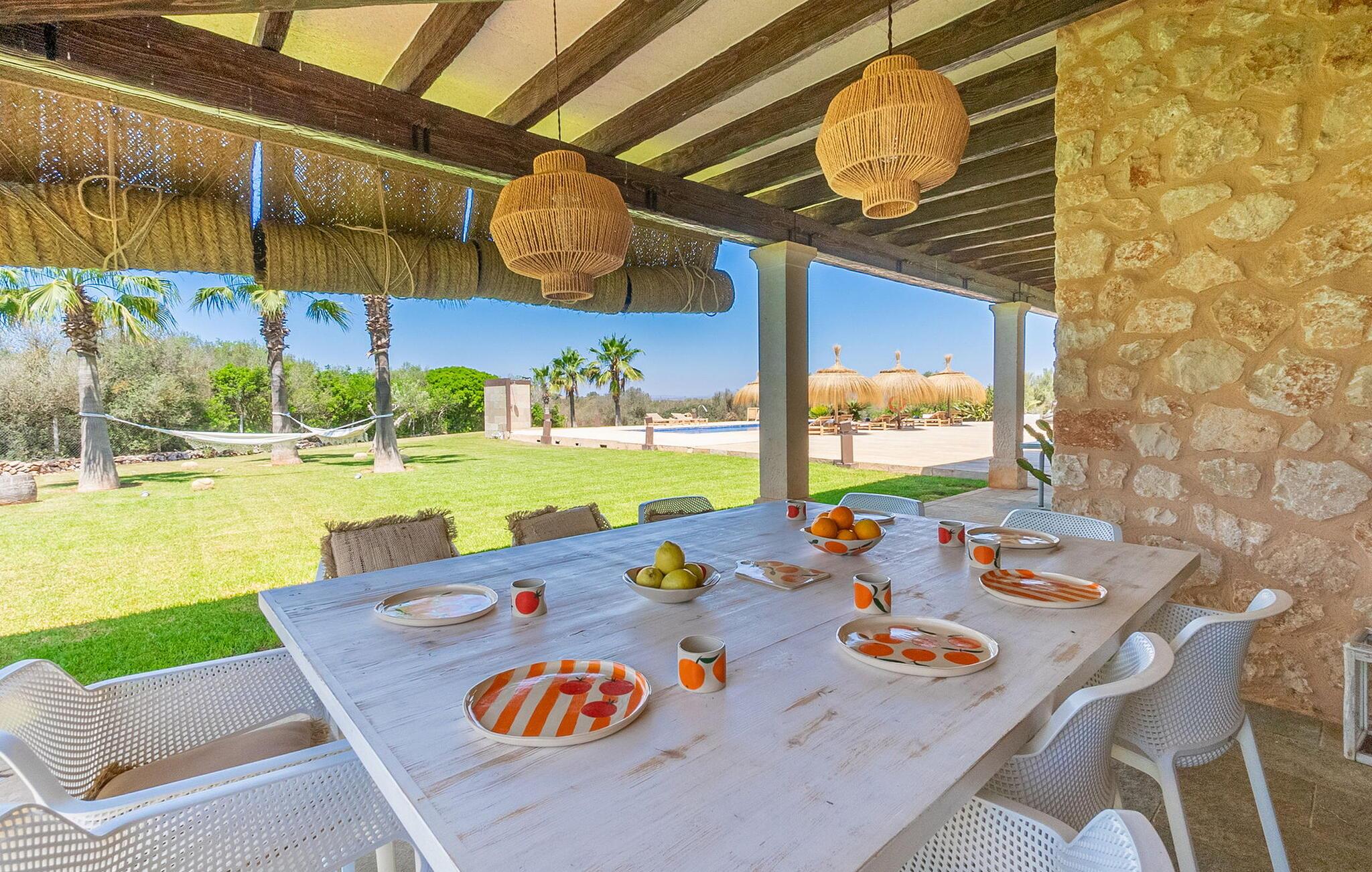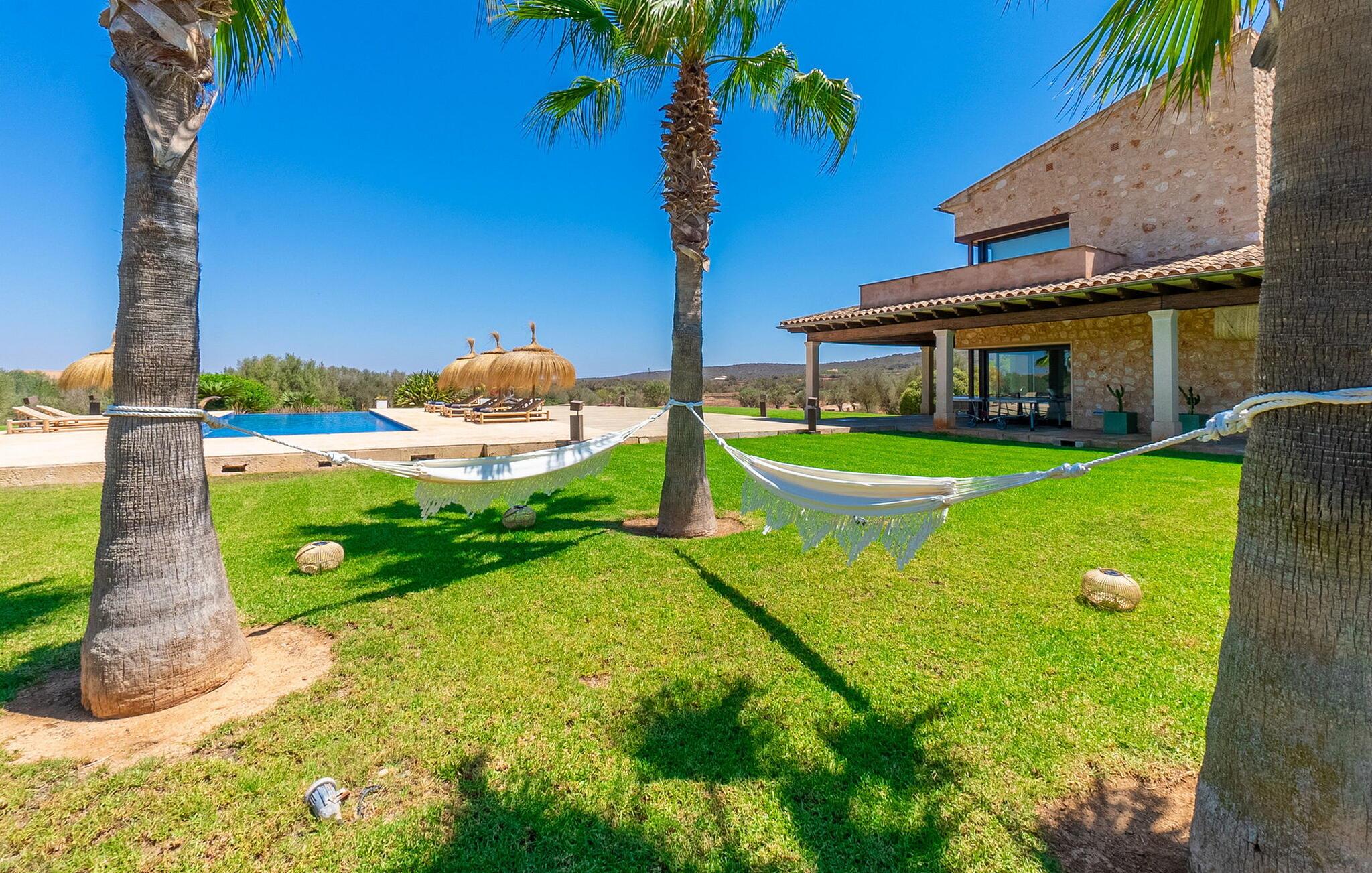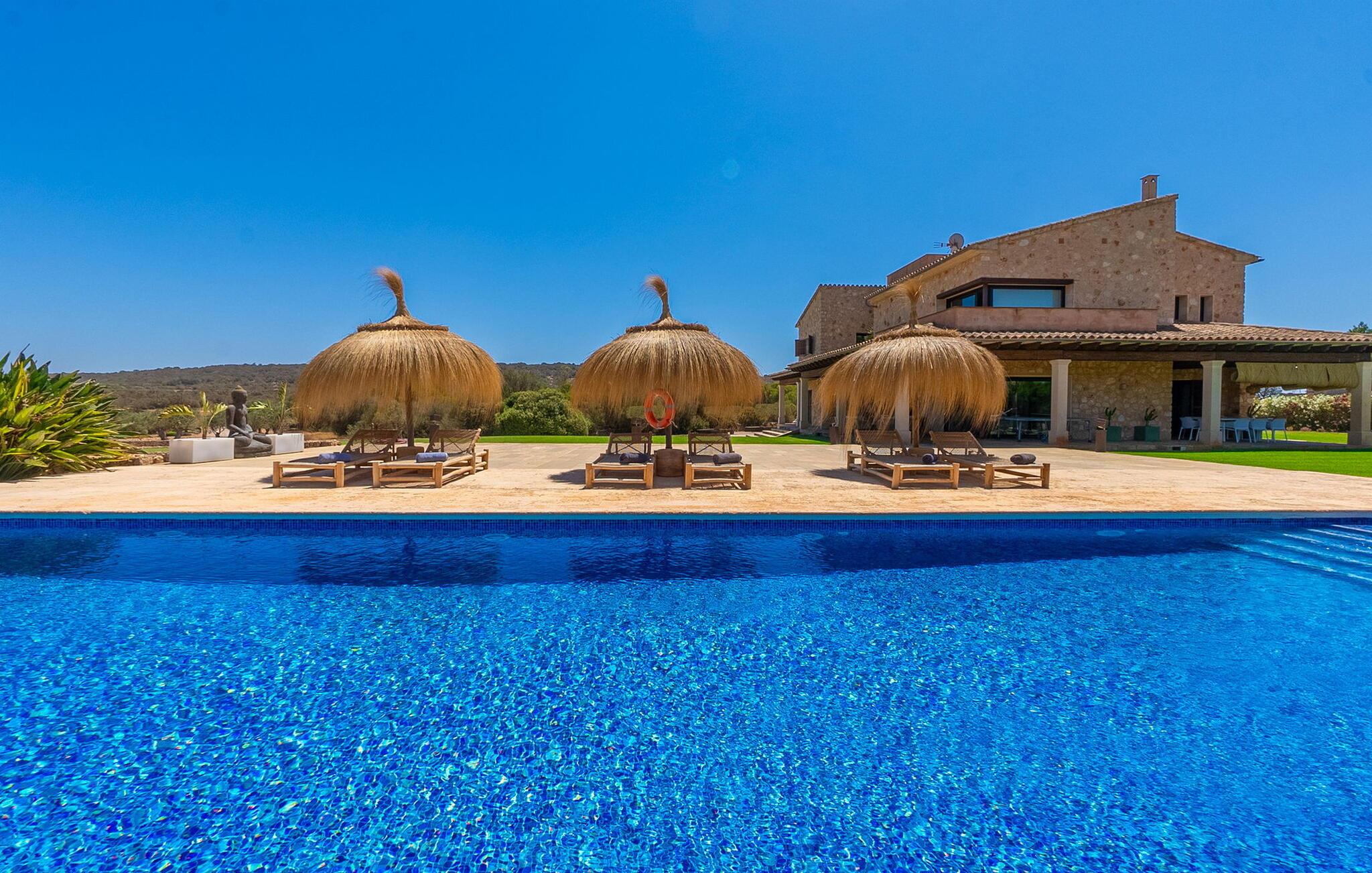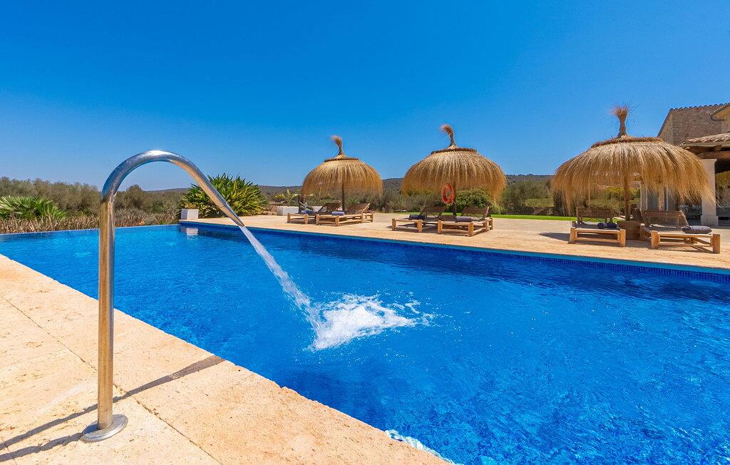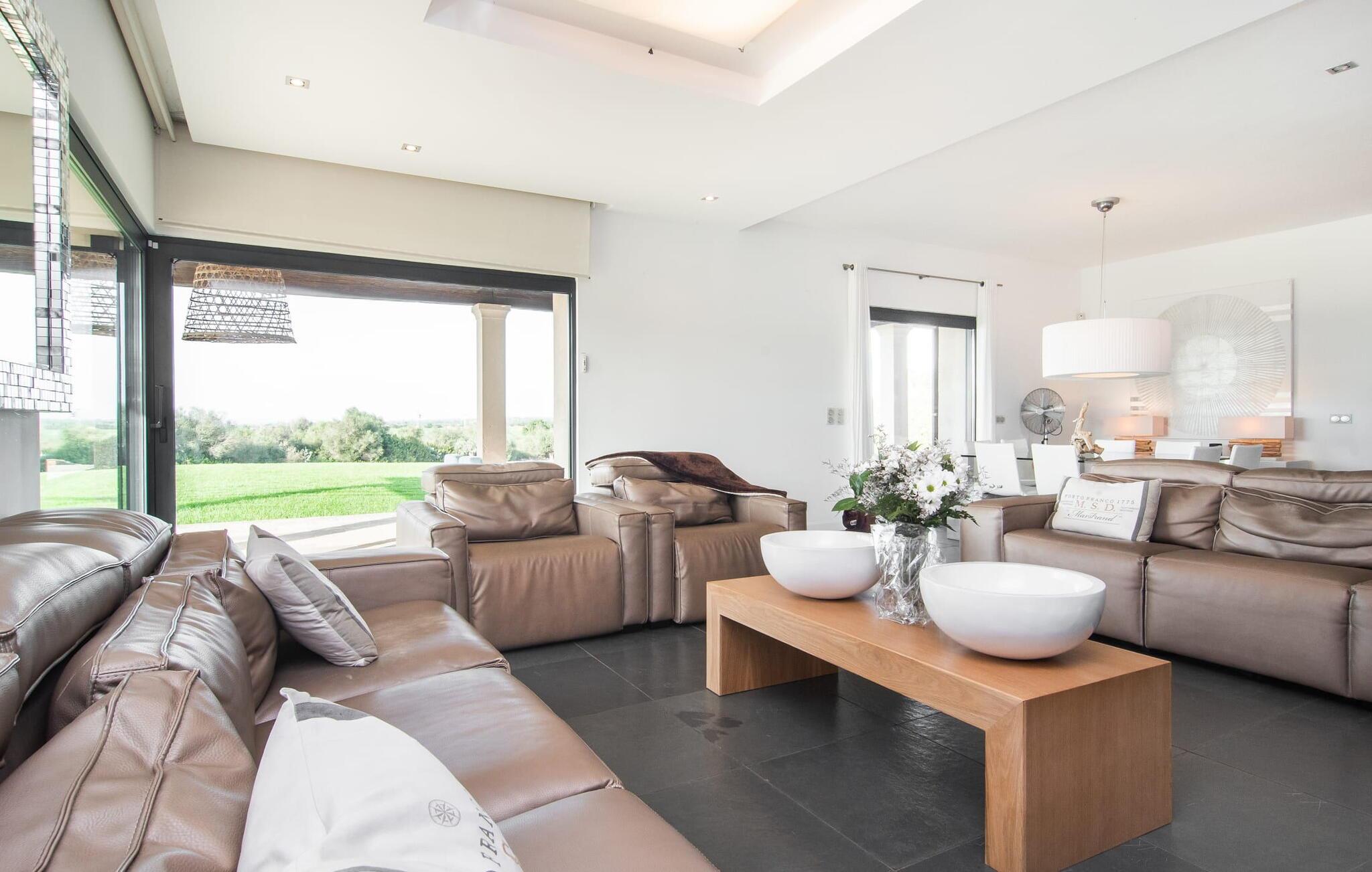 Stuehuset "Flor de Sal a Sa Canoveta" er perfekt til feriegæster med designkrav. Den rummelige ejendom er en drømmeagtig middelhavsoase fuld af palmer, frugt- og oliventræer, rummelige græsplæner og fænomenal udsigt. Midt i haven ligger den klorfri pool i XL-format og afslappet infinity-stil. En udendørs bruser med varmt vand og en hydromassagebruser i poolen fuldender luksusen. De komfortable designer liggestole på den omkringliggende solterrasse tilbyder også maksimal afslapning. Både unge og gamle kan nyde et socialt samvær ved bordtennisbordet eller på de overdækkede terrasser ved huset. Der kan grillen tilberedt på murstensgrillen nydes til middag. Det højkvalitets loungehjørne på den anden overdækkede terrasse giver jer mulighed for at fejre Mallorcas livskvalitet langt ud på natten. Mens bygningen fremstår typisk mallorcansk-rustik med dens klassiske stenbrud, vil du, når I træder ind i huset, blive overrasket af et strejf af luksus med en betagende smuk indretning i et puristisk design. De store gulv-til-loft vinduer lader den rummelige og åbne opholds- og spiseafdeling skinne. Downlights skaber den rigtige atmosfære i dette smarte bondehus. Møblerne af høj kvalitet, den gennemgående hvide stil og værelsernes rummelighed perfektionerer den postmoderne boligatmosfære fuld af ro. Det fuldt udstyrede køkken-alrum med ekstra siddepladser lader intet tilbage at ønske. Når I ser de klimatiserede soveværelser, hver for to personer, vil I opdage rummelige værelser med direkte adgang til terrassen eller balkonen, nogle med eget badeværelse, i eksklusivt design. I dette skønne feriehus for familier og venner finder børn og unge deres egen plads i fjerde og femte soveværelse med to enkeltsenge. "Flor de Sal a Sa Canoveta" står for mallorcanske ferier i perfektion og lethed, som I forventer hele året rundt. Luksusgårdhuset "Flor de Sal a Sa Canoveta" imponerer med en perfekt have med en klorfri XL-pool og fremragende møblerede terrasser. Den spektakulære smukke ejendom ligger i den sydlige del af øen mellem Campos og Colònia de Sant Père. I de omkringliggende landsbyer kan I shoppe eller besøge gode restauranter. Drømmestranden Es Trenc ligger kun 9 minutter væk i bil. Bemærk venligst, at denne ejendom ikke accepterer ungdomsgrupper eller polterabender. En ungdomsgruppe på denne ejendom består af personer på 25 år eller derunder. Book ikke denne ejendom, hvis I er en ungdomsgruppe eller polterabend, da jeres reservation vil blive afvist, når den er booket, hvilket også kan være tilfældet ved ankomst til ejendommen eller under jeres ophold, og I vil ikke modtage en refusion