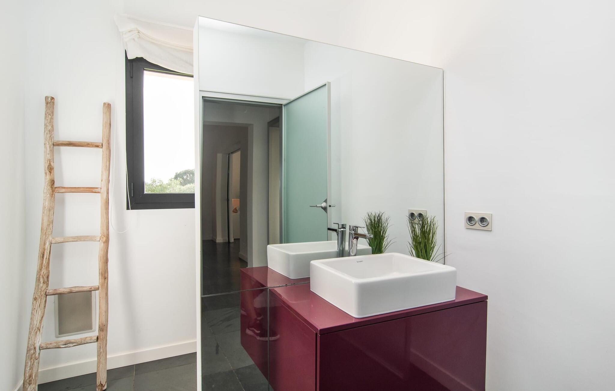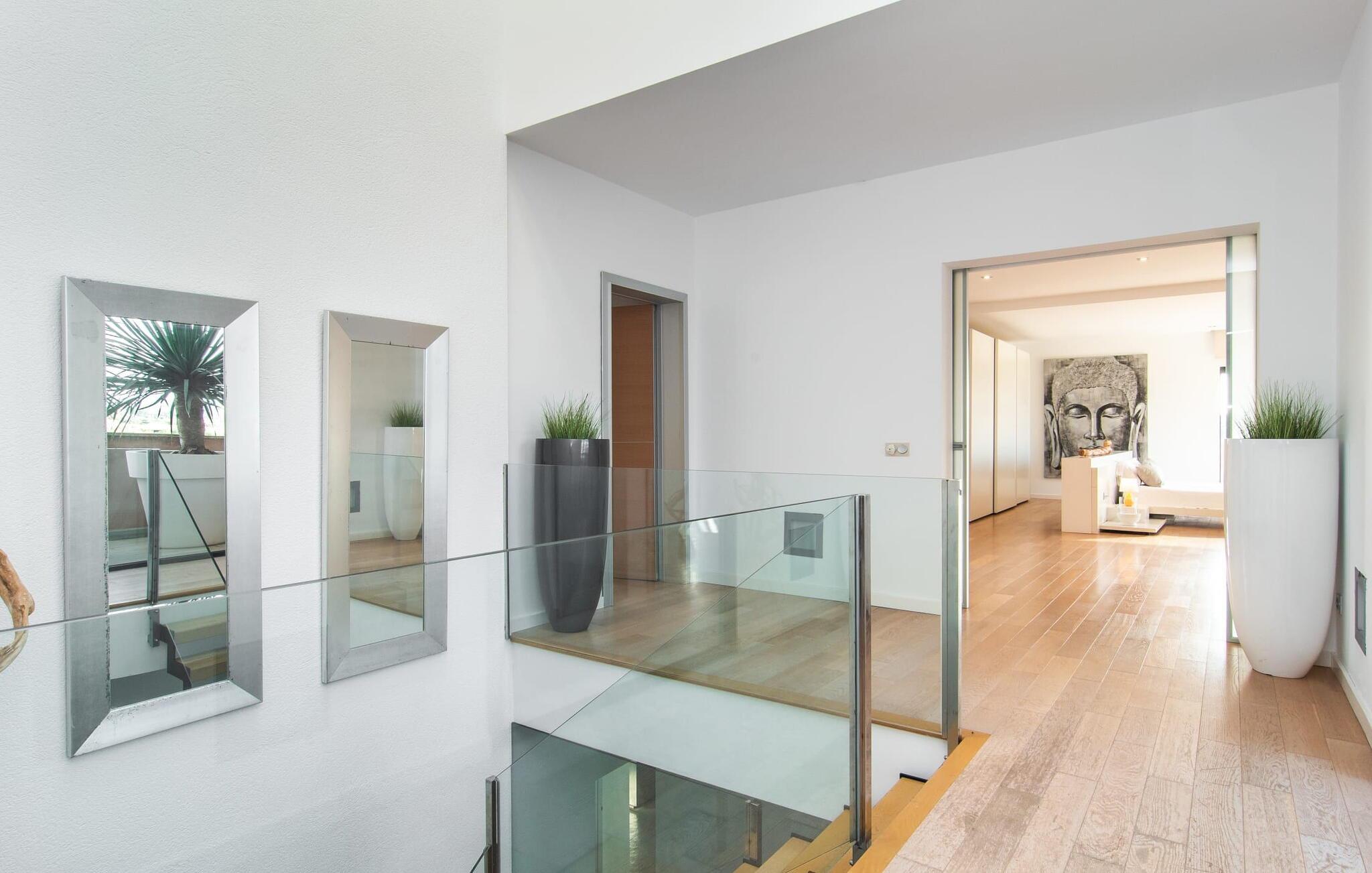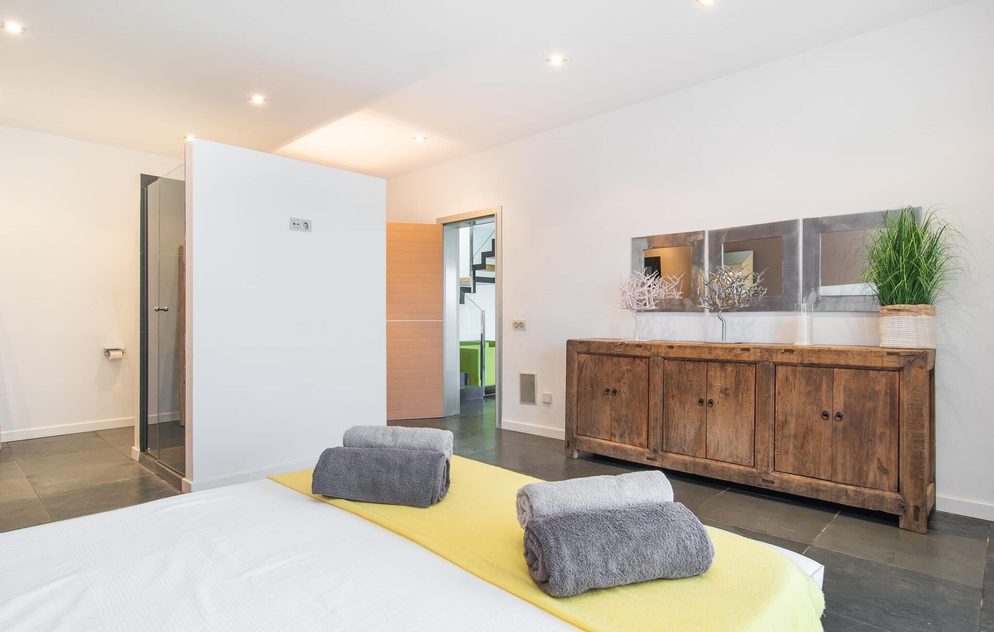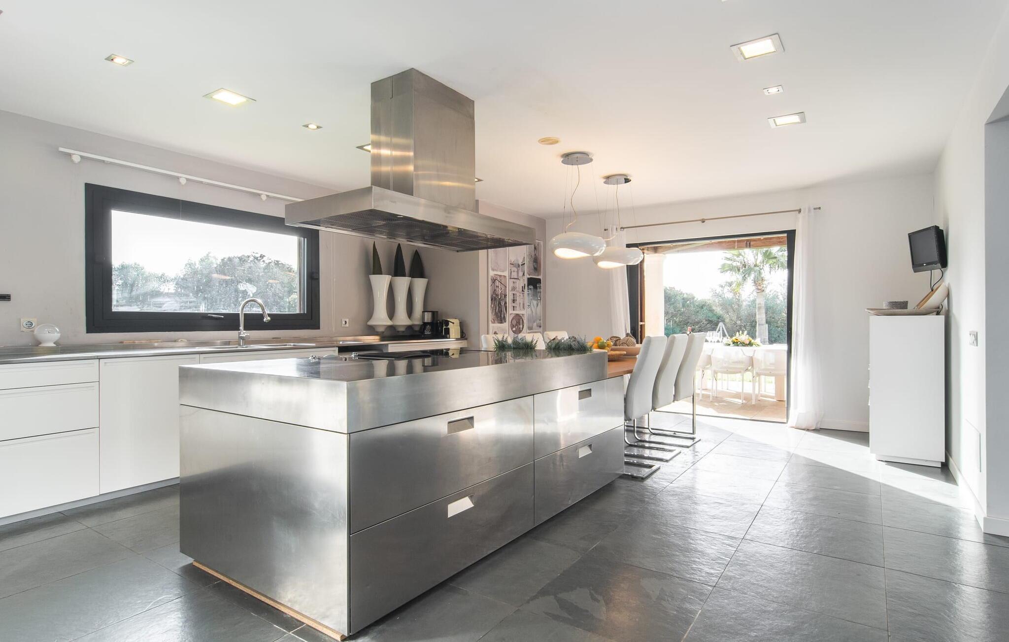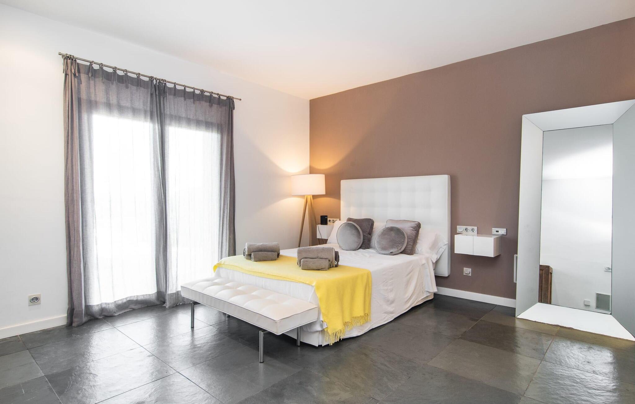 Stuehuset "Flor de Sal a Sa Canoveta" er perfekt til feriegæster med designkrav. Den rummelige ejendom er en drømmeagtig middelhavsoase fuld af palmer, frugt- og oliventræer, rummelige græsplæner og fænomenal udsigt. Midt i haven ligger den klorfri pool i XL-format og afslappet infinity-stil. En udendørs bruser med varmt vand og en hydromassagebruser i poolen fuldender luksusen. De komfortable designer liggestole på den omkringliggende solterrasse tilbyder også maksimal afslapning. Både unge og gamle kan nyde et socialt samvær ved bordtennisbordet eller på de overdækkede terrasser ved huset. Der kan grillen tilberedt på murstensgrillen nydes til middag. Det højkvalitets loungehjørne på den anden overdækkede terrasse giver jer mulighed for at fejre Mallorcas livskvalitet langt ud på natten. Mens bygningen fremstår typisk mallorcansk-rustik med dens klassiske stenbrud, vil du, når I træder ind i huset, blive overrasket af et strejf af luksus med en betagende smuk indretning i et puristisk design. De store gulv-til-loft vinduer lader den rummelige og åbne opholds- og spiseafdeling skinne. Downlights skaber den rigtige atmosfære i dette smarte bondehus. Møblerne af høj kvalitet, den gennemgående hvide stil og værelsernes rummelighed perfektionerer den postmoderne boligatmosfære fuld af ro. Det fuldt udstyrede køkken-alrum med ekstra siddepladser lader intet tilbage at ønske. Når I ser de klimatiserede soveværelser, hver for to personer, vil I opdage rummelige værelser med direkte adgang til terrassen eller balkonen, nogle med eget badeværelse, i eksklusivt design. I dette skønne feriehus for familier og venner finder børn og unge deres egen plads i fjerde og femte soveværelse med to enkeltsenge. "Flor de Sal a Sa Canoveta" står for mallorcanske ferier i perfektion og lethed, som I forventer hele året rundt. Luksusgårdhuset "Flor de Sal a Sa Canoveta" imponerer med en perfekt have med en klorfri XL-pool og fremragende møblerede terrasser. Den spektakulære smukke ejendom ligger i den sydlige del af øen mellem Campos og Colònia de Sant Père. I de omkringliggende landsbyer kan I shoppe eller besøge gode restauranter. Drømmestranden Es Trenc ligger kun 9 minutter væk i bil. Bemærk venligst, at denne ejendom ikke accepterer ungdomsgrupper eller polterabender. En ungdomsgruppe på denne ejendom består af personer på 25 år eller derunder. Book ikke denne ejendom, hvis I er en ungdomsgruppe eller polterabend, da jeres reservation vil blive afvist, når den er booket, hvilket også kan være tilfældet ved ankomst til ejendommen eller under jeres ophold, og I vil ikke modtage en refusion