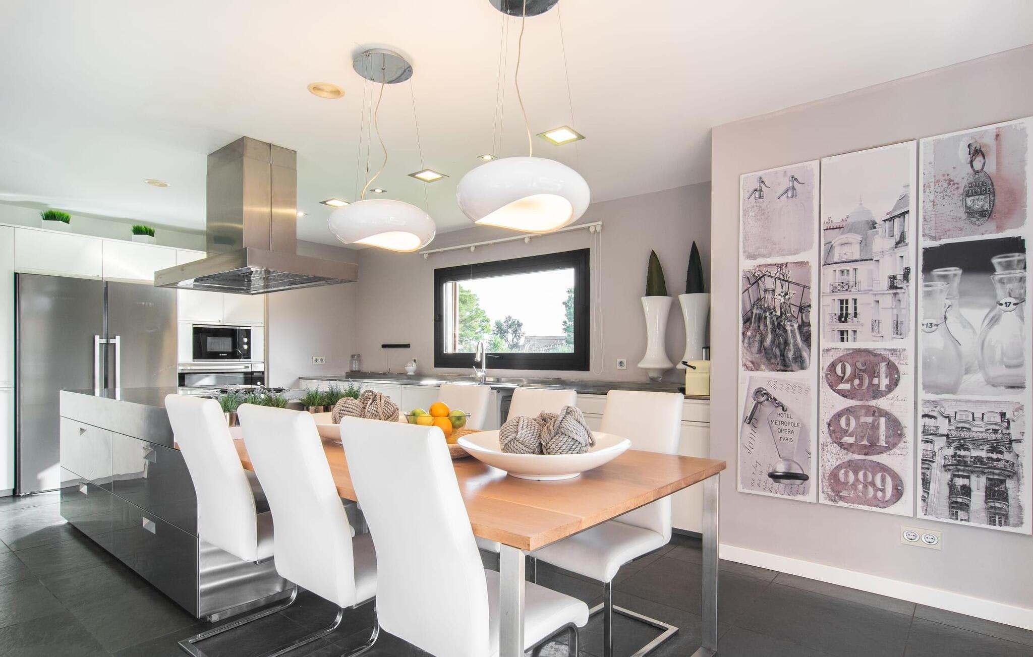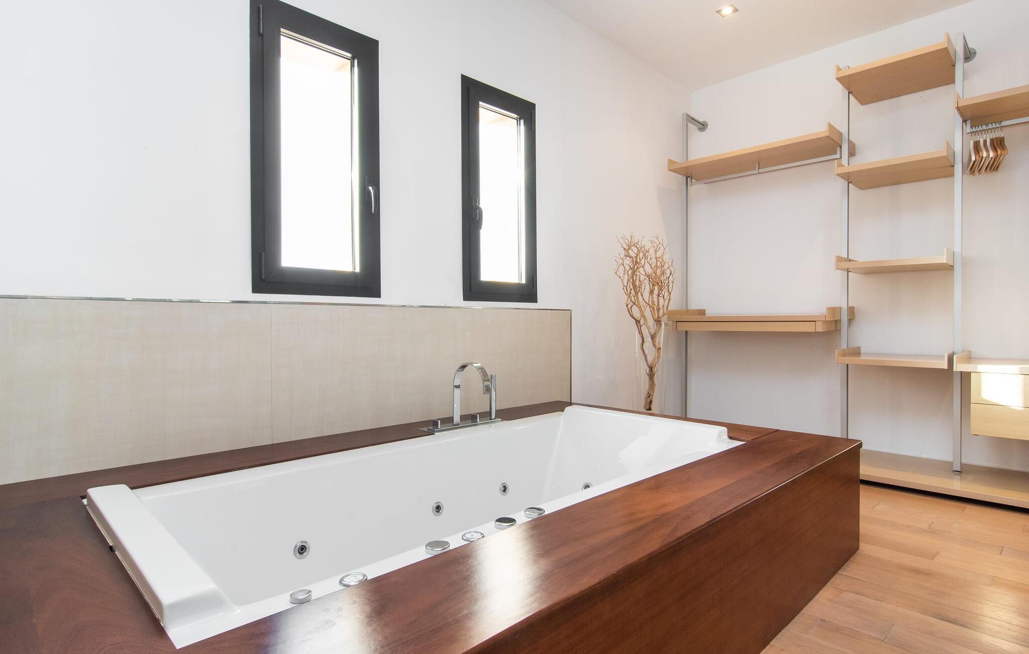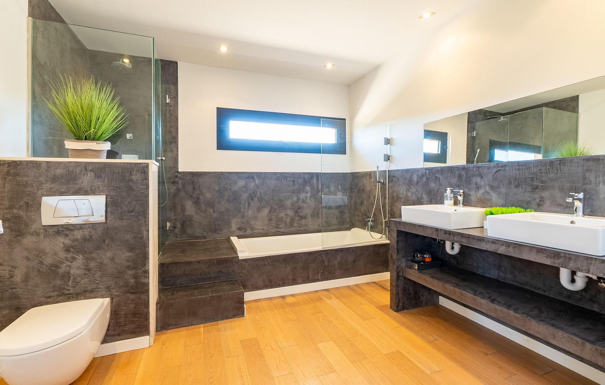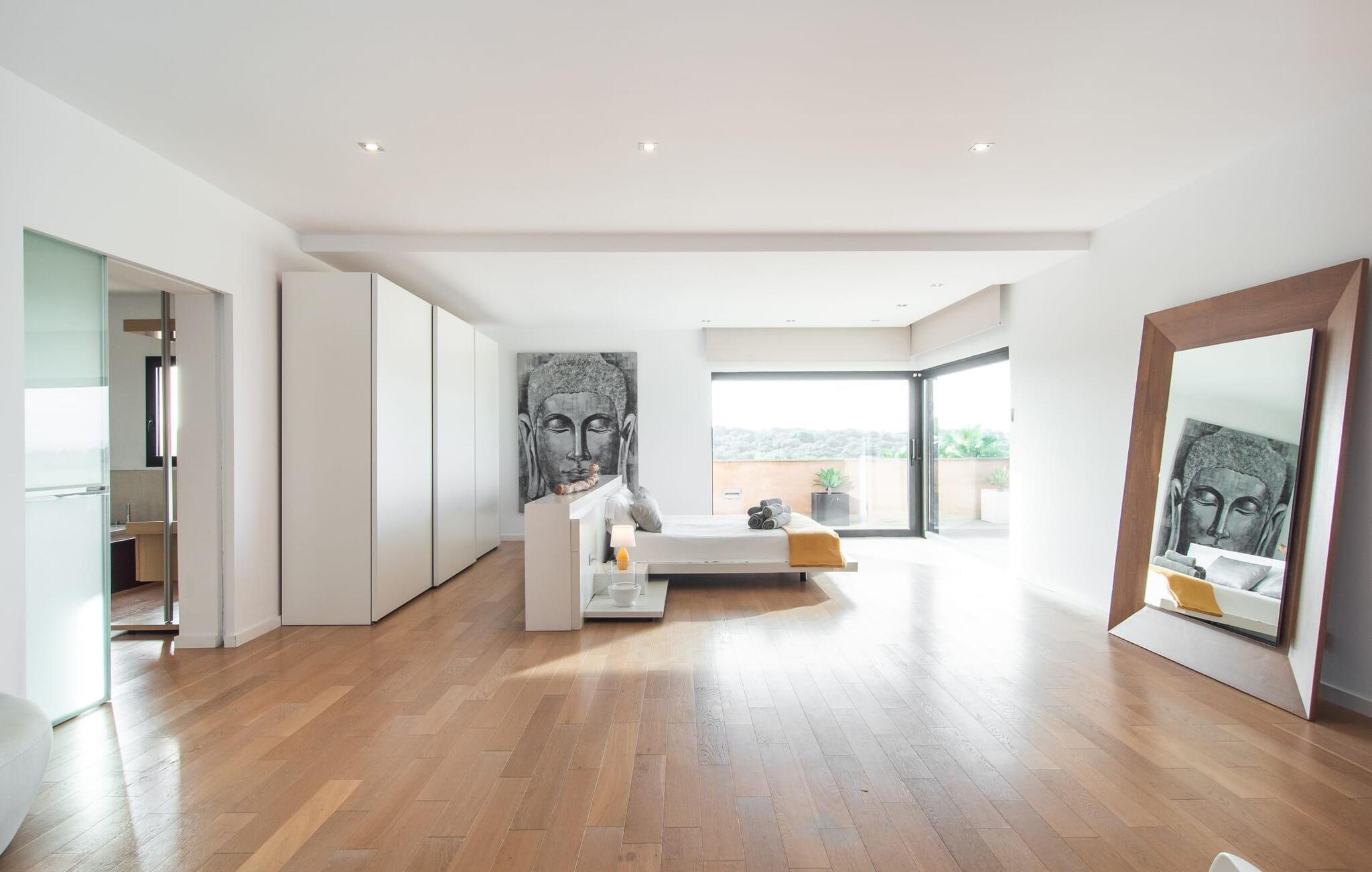Stuehuset "Flor de Sal a Sa Canoveta" er perfekt til feriegæster med designkrav. Den rummelige ejendom er en drømmeagtig middelhavsoase fuld af palmer, frugt- og oliventræer, rummelige græsplæner og fænomenal udsigt. Midt i haven ligger den klorfri pool i XL-format og afslappet infinity-stil. En udendørs bruser med varmt vand og en hydromassagebruser i poolen fuldender luksusen. De komfortable designer liggestole på den omkringliggende solterrasse tilbyder også maksimal afslapning. Både unge og gamle kan nyde et socialt samvær ved bordtennisbordet eller på de overdækkede terrasser ved huset. Der kan grillen tilberedt på murstensgrillen nydes til middag. Det højkvalitets loungehjørne på den anden overdækkede terrasse giver jer mulighed for at fejre Mallorcas livskvalitet langt ud på natten. Mens bygningen fremstår typisk mallorcansk-rustik med dens klassiske stenbrud, vil du, når I træder ind i huset, blive overrasket af et strejf af luksus med en betagende smuk indretning i et puristisk design. De store gulv-til-loft vinduer lader den rummelige og åbne opholds- og spiseafdeling skinne. Downlights skaber den rigtige atmosfære i dette smarte bondehus. Møblerne af høj kvalitet, den gennemgående hvide stil og værelsernes rummelighed perfektionerer den postmoderne boligatmosfære fuld af ro. Det fuldt udstyrede køkken-alrum med ekstra siddepladser lader intet tilbage at ønske. Når I ser de klimatiserede soveværelser, hver for to personer, vil I opdage rummelige værelser med direkte adgang til terrassen eller balkonen, nogle med eget badeværelse, i eksklusivt design. I dette skønne feriehus for familier og venner finder børn og unge deres egen plads i fjerde og femte soveværelse med to enkeltsenge. "Flor de Sal a Sa Canoveta" står for mallorcanske ferier i perfektion og lethed, som I forventer hele året rundt. Luksusgårdhuset "Flor de Sal a Sa Canoveta" imponerer med en perfekt have med en klorfri XL-pool og fremragende møblerede terrasser. Den spektakulære smukke ejendom ligger i den sydlige del af øen mellem Campos og Colònia de Sant Père. I de omkringliggende landsbyer kan I shoppe eller besøge gode restauranter. Drømmestranden Es Trenc ligger kun 9 minutter væk i bil. Bemærk venligst, at denne ejendom ikke accepterer ungdomsgrupper eller polterabender. En ungdomsgruppe på denne ejendom består af personer på 25 år eller derunder. Book ikke denne ejendom, hvis I er en ungdomsgruppe eller polterabend, da jeres reservation vil blive afvist, når den er booket, hvilket også kan være tilfældet ved ankomst til ejendommen eller under jeres ophold, og I vil ikke modtage en refusion