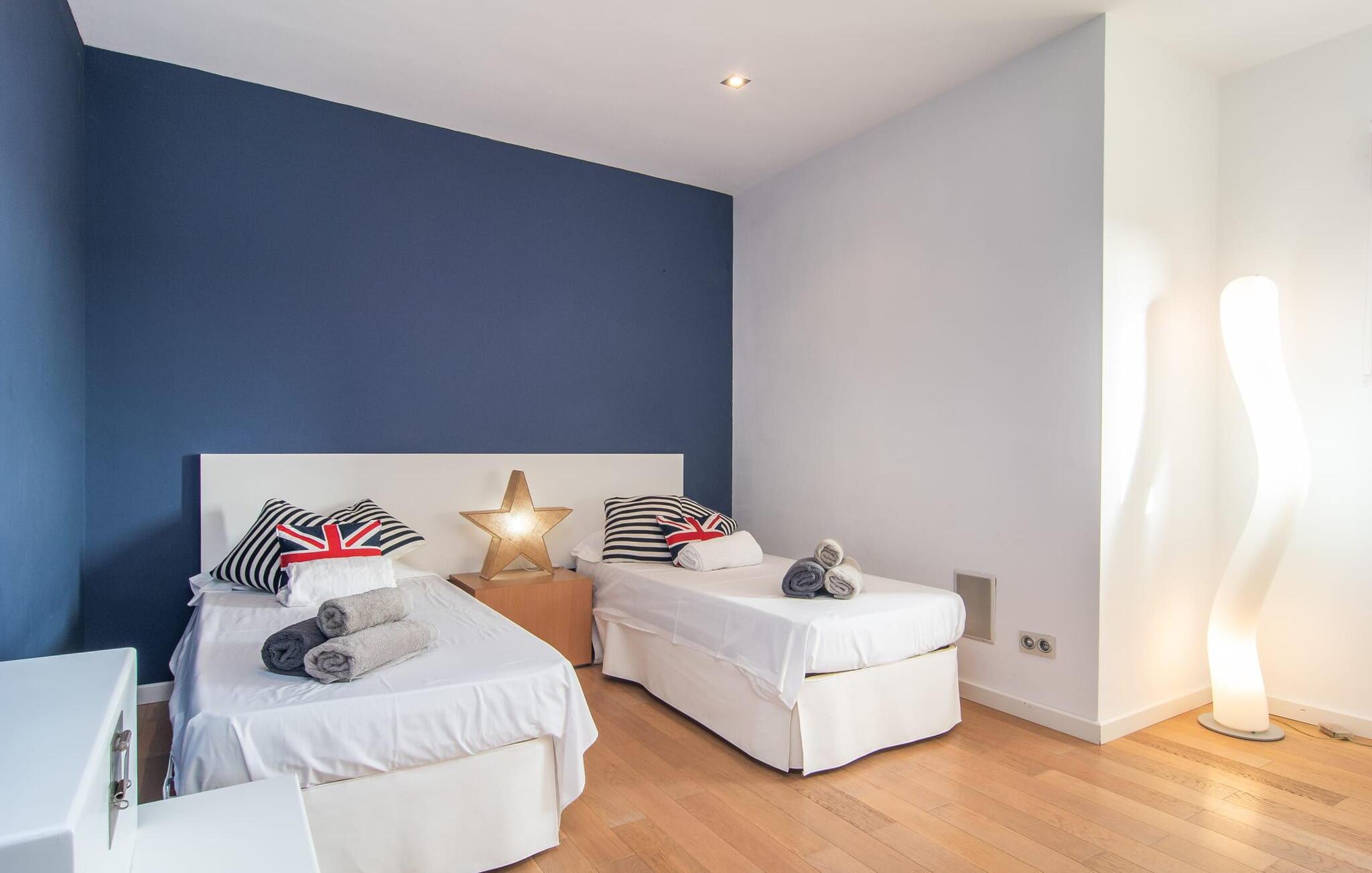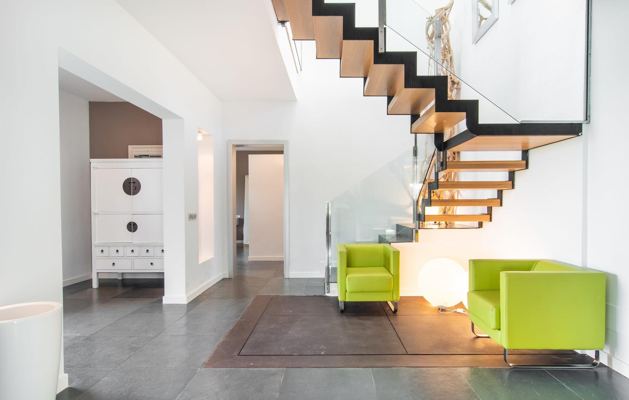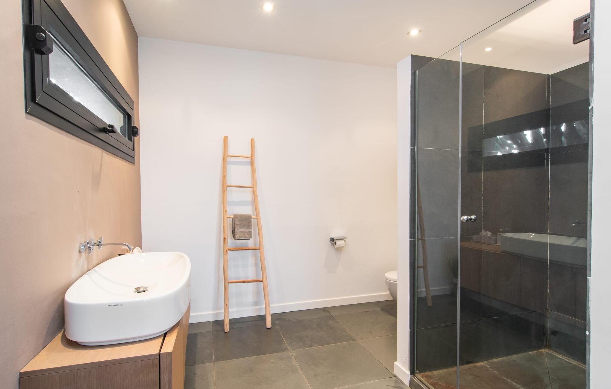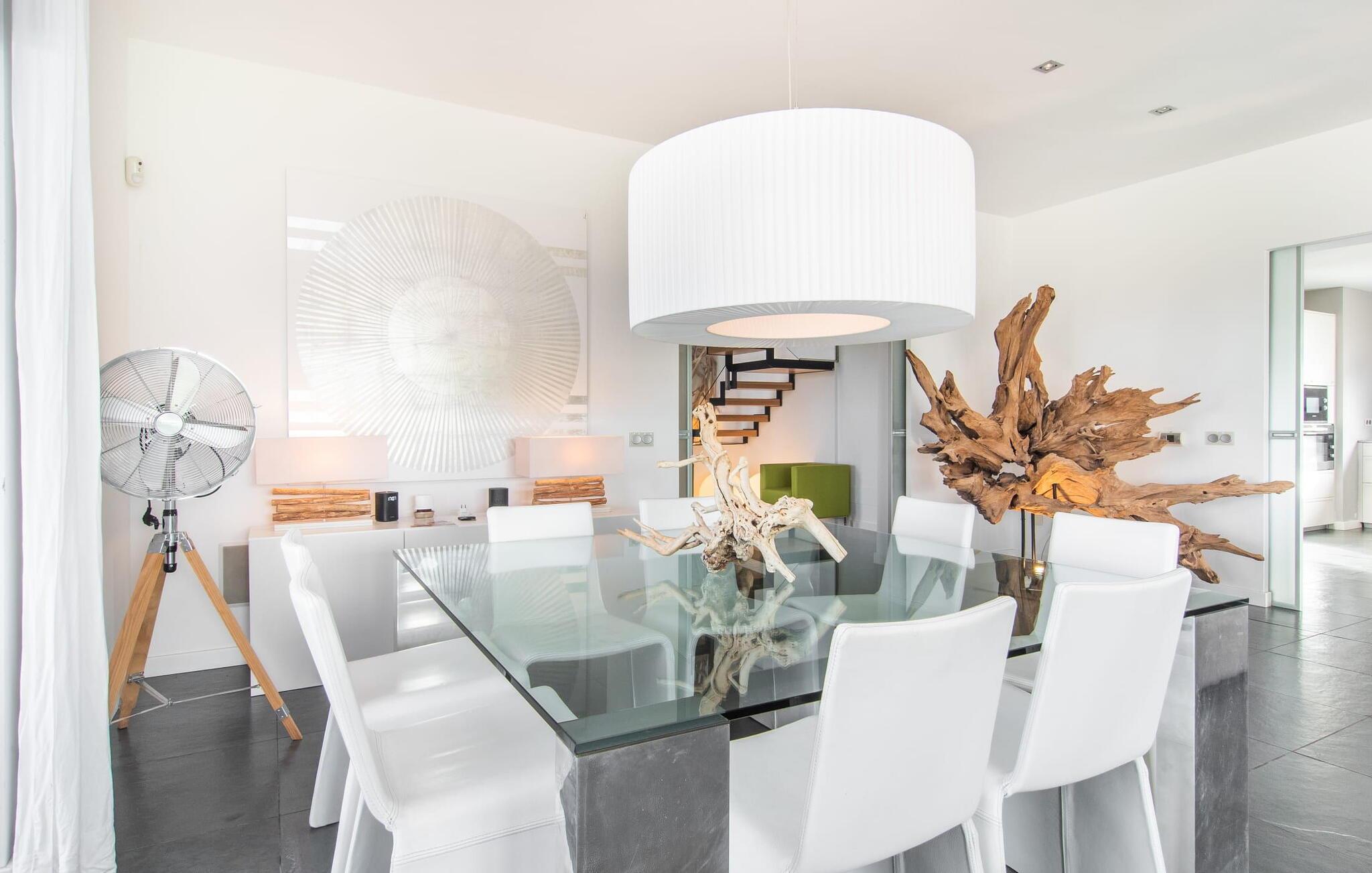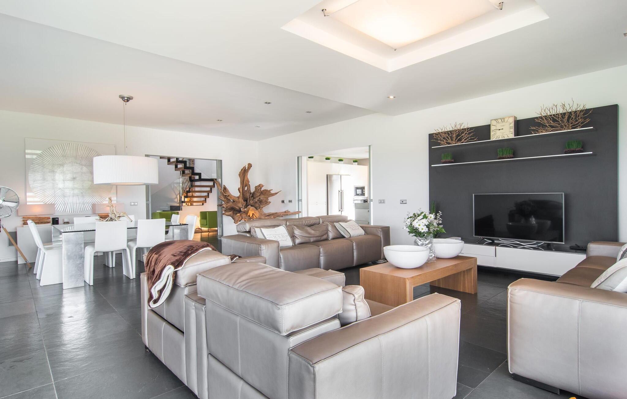 Stuehuset "Flor de Sal a Sa Canoveta" er perfekt til feriegæster med designkrav. Den rummelige ejendom er en drømmeagtig middelhavsoase fuld af palmer, frugt- og oliventræer, rummelige græsplæner og fænomenal udsigt. Midt i haven ligger den klorfri pool i XL-format og afslappet infinity-stil. En udendørs bruser med varmt vand og en hydromassagebruser i poolen fuldender luksusen. De komfortable designer liggestole på den omkringliggende solterrasse tilbyder også maksimal afslapning. Både unge og gamle kan nyde et socialt samvær ved bordtennisbordet eller på de overdækkede terrasser ved huset. Der kan grillen tilberedt på murstensgrillen nydes til middag. Det højkvalitets loungehjørne på den anden overdækkede terrasse giver jer mulighed for at fejre Mallorcas livskvalitet langt ud på natten. Mens bygningen fremstår typisk mallorcansk-rustik med dens klassiske stenbrud, vil du, når I træder ind i huset, blive overrasket af et strejf af luksus med en betagende smuk indretning i et puristisk design. De store gulv-til-loft vinduer lader den rummelige og åbne opholds- og spiseafdeling skinne. Downlights skaber den rigtige atmosfære i dette smarte bondehus. Møblerne af høj kvalitet, den gennemgående hvide stil og værelsernes rummelighed perfektionerer den postmoderne boligatmosfære fuld af ro. Det fuldt udstyrede køkken-alrum med ekstra siddepladser lader intet tilbage at ønske. Når I ser de klimatiserede soveværelser, hver for to personer, vil I opdage rummelige værelser med direkte adgang til terrassen eller balkonen, nogle med eget badeværelse, i eksklusivt design. I dette skønne feriehus for familier og venner finder børn og unge deres egen plads i fjerde og femte soveværelse med to enkeltsenge. "Flor de Sal a Sa Canoveta" står for mallorcanske ferier i perfektion og lethed, som I forventer hele året rundt. Luksusgårdhuset "Flor de Sal a Sa Canoveta" imponerer med en perfekt have med en klorfri XL-pool og fremragende møblerede terrasser. Den spektakulære smukke ejendom ligger i den sydlige del af øen mellem Campos og Colònia de Sant Père. I de omkringliggende landsbyer kan I shoppe eller besøge gode restauranter. Drømmestranden Es Trenc ligger kun 9 minutter væk i bil. Bemærk venligst, at denne ejendom ikke accepterer ungdomsgrupper eller polterabender. En ungdomsgruppe på denne ejendom består af personer på 25 år eller derunder. Book ikke denne ejendom, hvis I er en ungdomsgruppe eller polterabend, da jeres reservation vil blive afvist, når den er booket, hvilket også kan være tilfældet ved ankomst til ejendommen eller under jeres ophold, og I vil ikke modtage en refusion