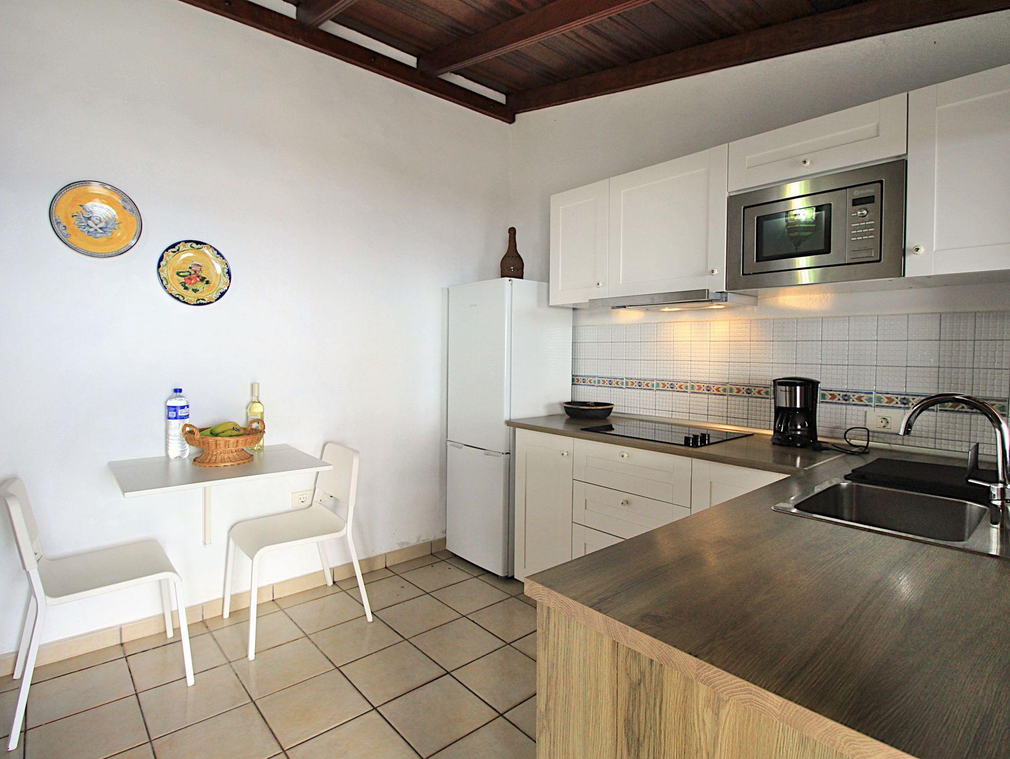 • Küche mit Tisch und 2 Stühlen Cerankochfeld (4 Platten), Mikrowelle, Toaster, Kaffeemaschine, Cafetera, Kühlschrank mit Gefrierfach, Waschmaschine