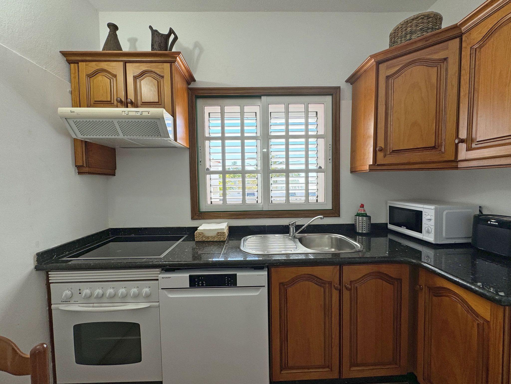 • Elektroherd (4 Felder), Mikrowelle, elektrische Kaffeemaschine, Cafetera, Toaster, Spülmaschine, Kühl-/Gefrierkombination
