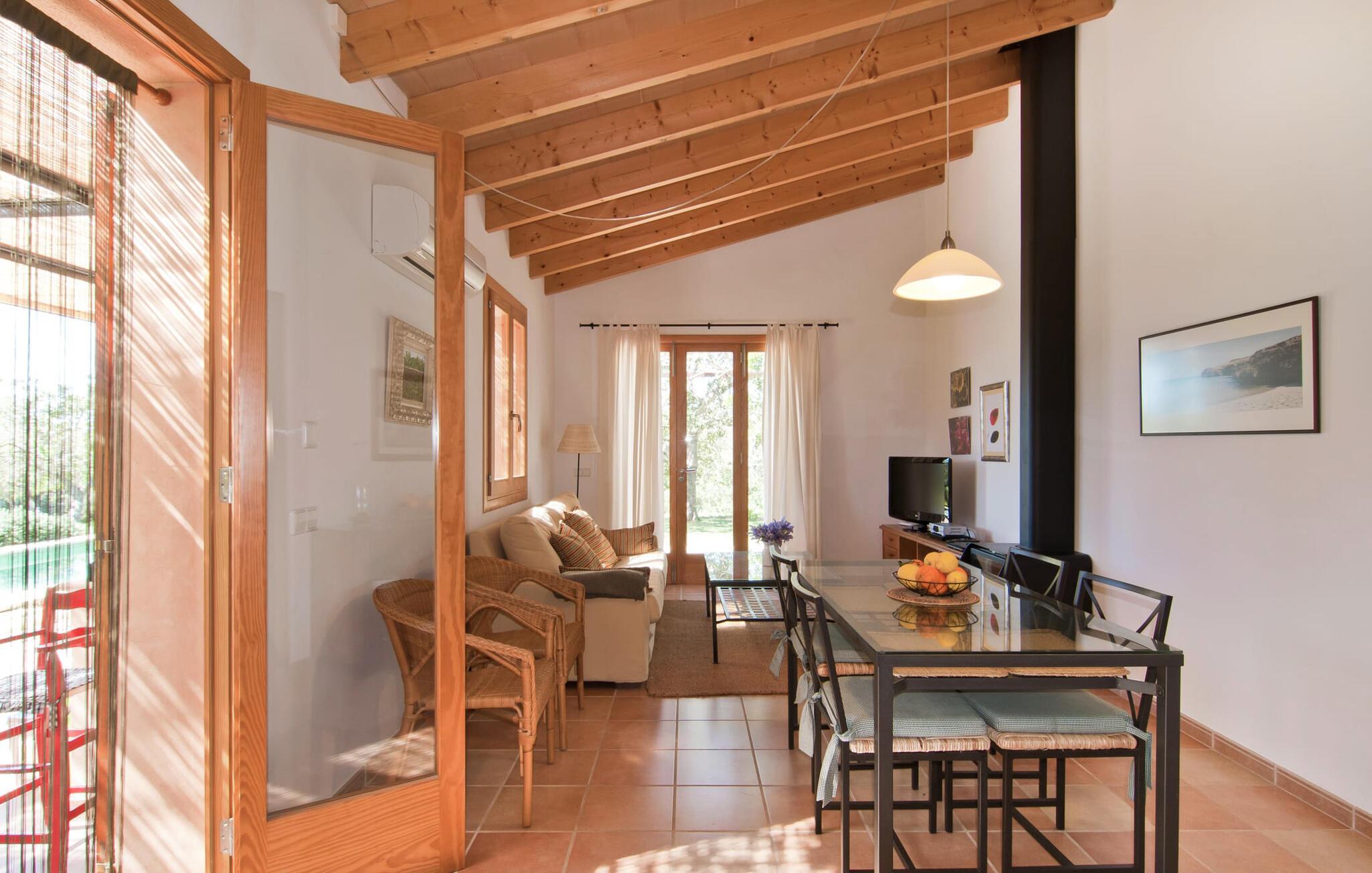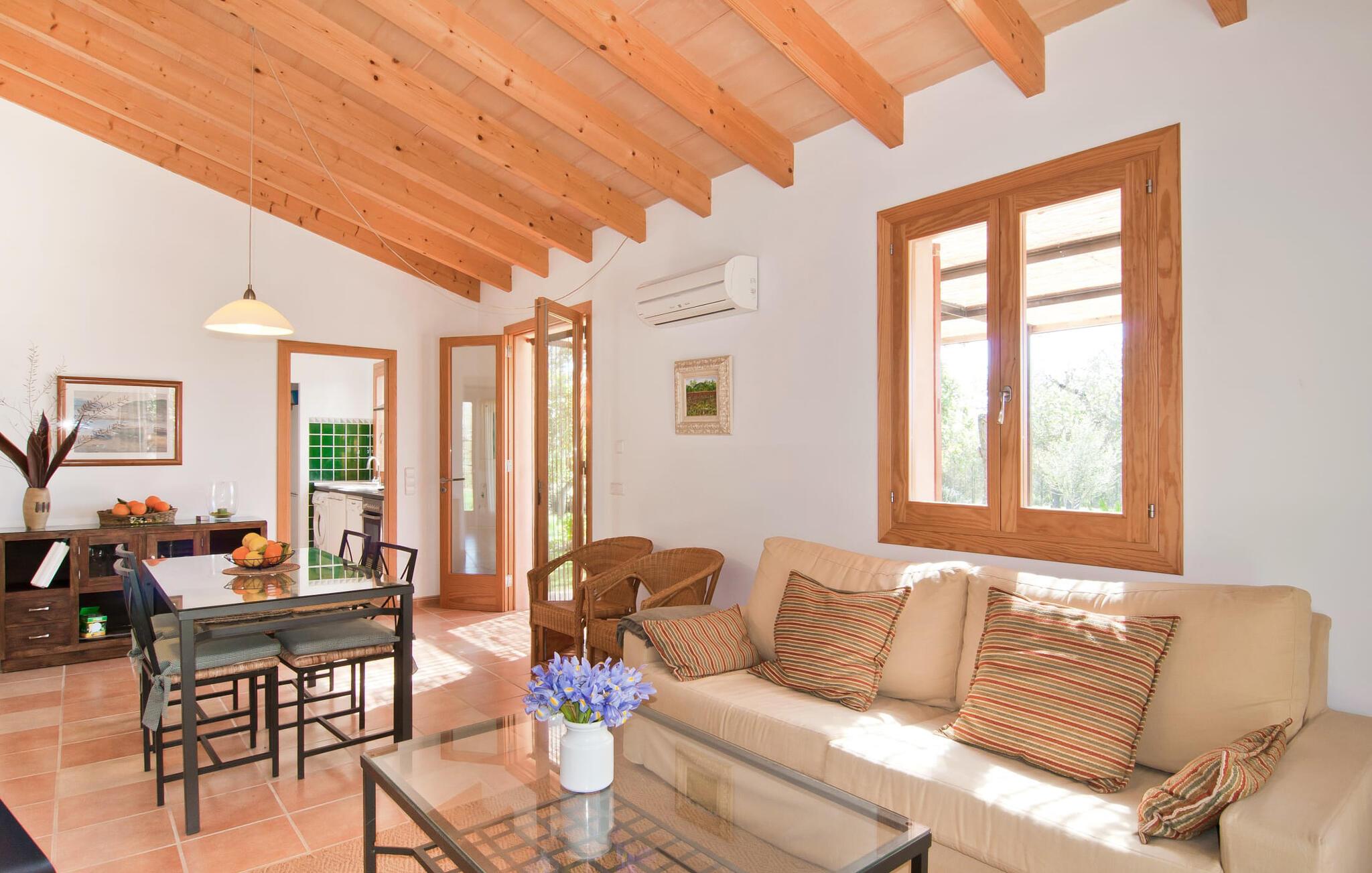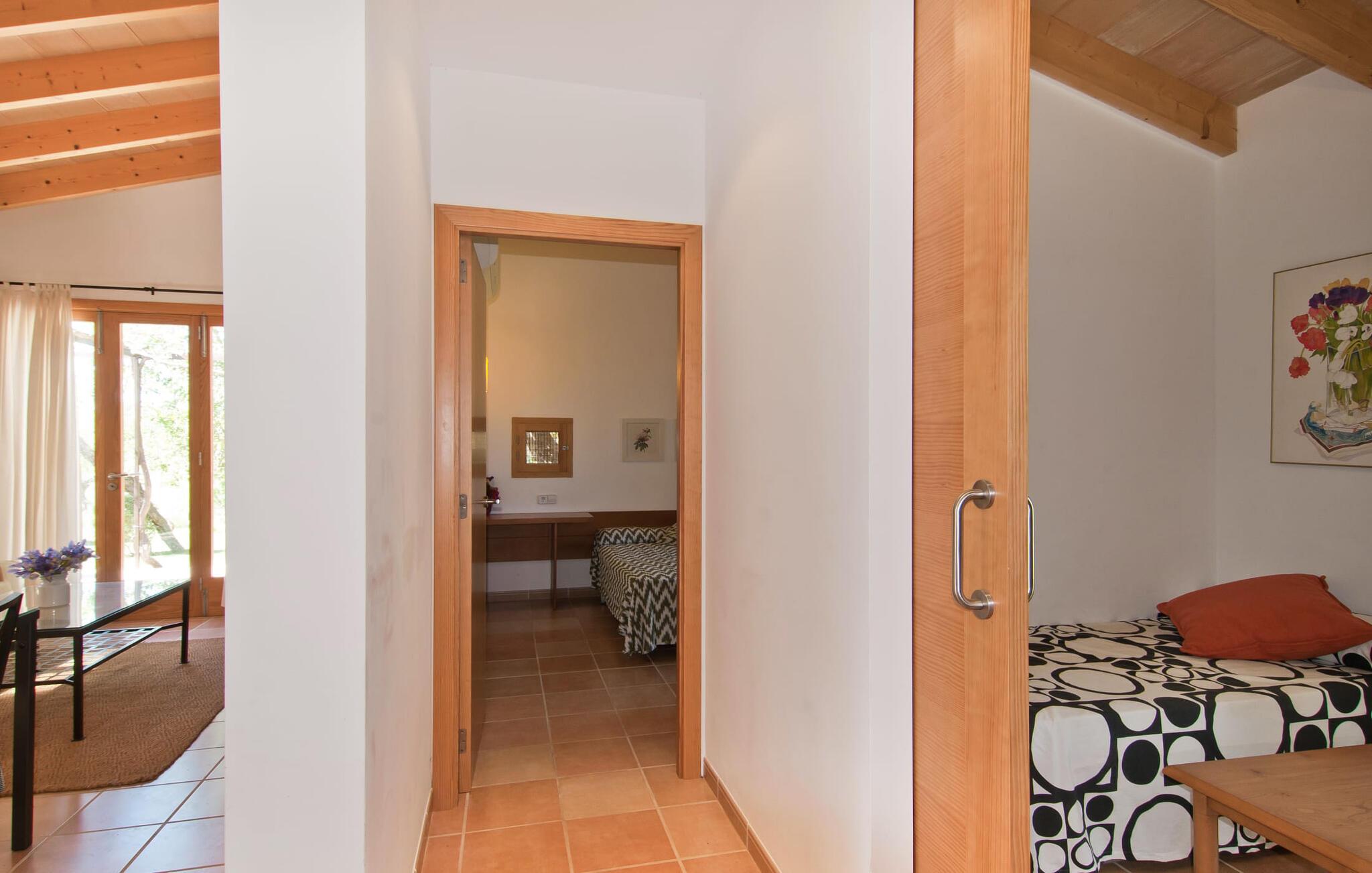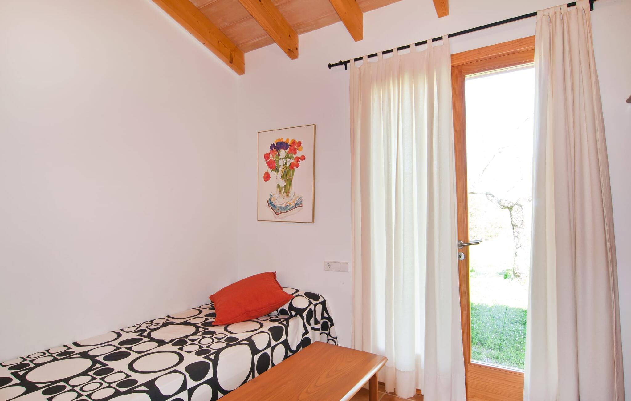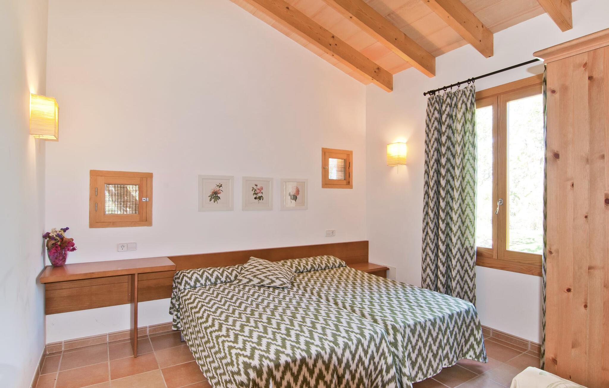 Dette særligt smukke feriehus er en fortryllende oase af fred, omgivet af natur og bekvemt beliggende nær Sant Llorent. Et område omgivet af frugttræer byder gæsterne hjerteligt velkommen og byder på udsigt over de idylliske haver med terrasser og græsplæner. Udendørsområdets højdepunkt er gemt i dets hjerte: den dekorativt flisebelagte swimmingpool. Til jeres afslapning er der to smukke små liggestole ved den 24 m² store pool, som kan nås via trapper. En udendørs bruser er også tilgængelig. Møblerne på den smagfuldt indrettede, lyse, bambusoverdækkede terrasse inviterer jer til at blive hængende og slappe af - og er også perfekt til en forfriskende drink. Det smukke spisebord i nærheden inviterer jer til at spise udenfor og nyde den landlige udsigt. Om aftenen vil I elske at sidde på dette attraktive lille sted og have en kulinarisk BBQ og nyde de friske lokale delikatesser, I købte dagen før. Ejendommens interiør fremstår rustikt og kærligt og byder på en fantastisk og hyggelig stemning. Terrassen fører til den kombinerede stue/spisestue, og køkkenet ligger på højre side. En dør fører lige ud til en gang, hvorfra I kan få adgang til soveværelserne. To af dem er dobbeltværelser, hvoraf det ene har eget badeværelse. Det andet badeværelse og enkeltværelset er også placeret her. Den behagelige atmosfære i dette hus understreges af dets smukke individuelle møbler og den harmoniske ramme af lette vægge, trælofter og terracotta fliser. På kølige aftener fremtryller den moderne pejs i stuen en hjemlig atmosfære og hyggelig varme, mens satellit-tv'et giver mulighed for at se en god film i den komfortable beige sofa. Køkkenet byder med sine markante grønne vægfliser og den smukke udsigt over det omkringliggende område alt hvad I behøver til hverdagsbrug - keramisk kogeplade, ovn, køleskab, mikroovn, elkedel og kaffemaskine. I de smukt møblerede soveværelser (hvoraf to har aircondition) er I garanteret en afslappende nat, og I vil være i stand til at komme jer bæredygtigt. Der er to senge, der måler 1,5 x 1,9 m og yderligere 0,9 x 1,9 m til rådighed. To lyse og fuldt funktionelle badeværelser fuldender interiøret. Praktisk talt kan landsbyens butikker hurtigt nås. Attraktive destinationer i nærheden af villaen er Manacor (12 km) og Artà (11 km). I disse to byer finder I alt, hvad I har brug for til jeres daglige behov. De tilbyder også et godt udvalg af restauranter med meget godt mallorcansk køkken. Flere strande i denne østlige del af øen er nemme at nå - som Cala Millor, Cala Bona og Sa Marjal. Cala Rajada er omkring 20 km væk i nordøst. Den lille villa "Garriga Nova" er et smukt indrettet og typisk mallorcansk feriehus. Det er i et virkelig roligt område, kun omkring fem minutters kørsel fra Sant Llorenc. Der er bageri, supermarked, apotek og restauranter. Nogle af de særligt smukke lokale strande kan nås hurtigt i bil.
