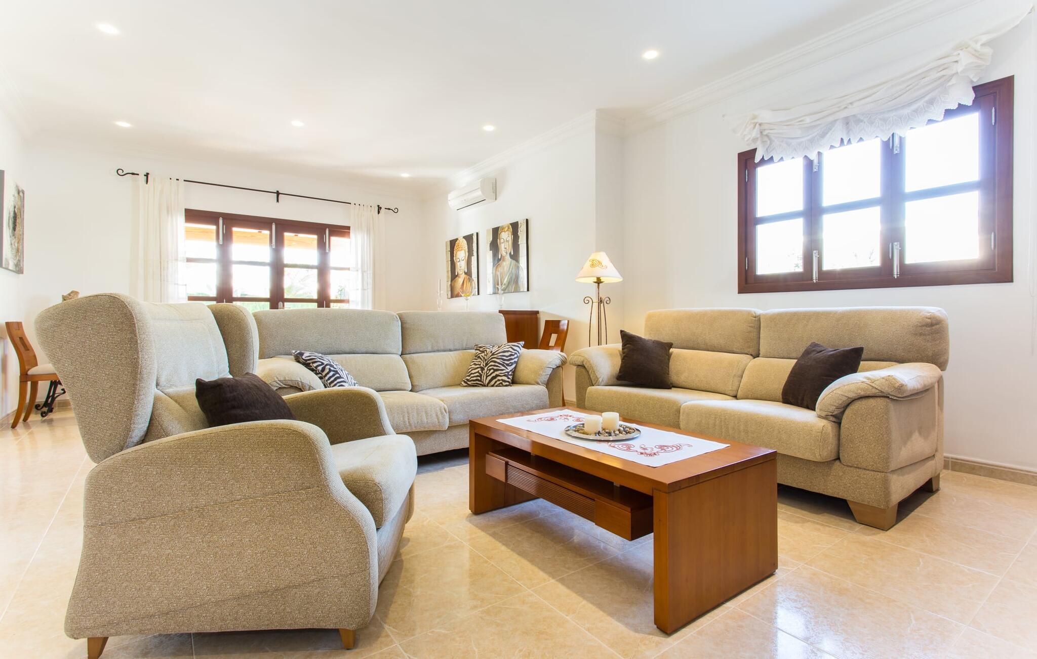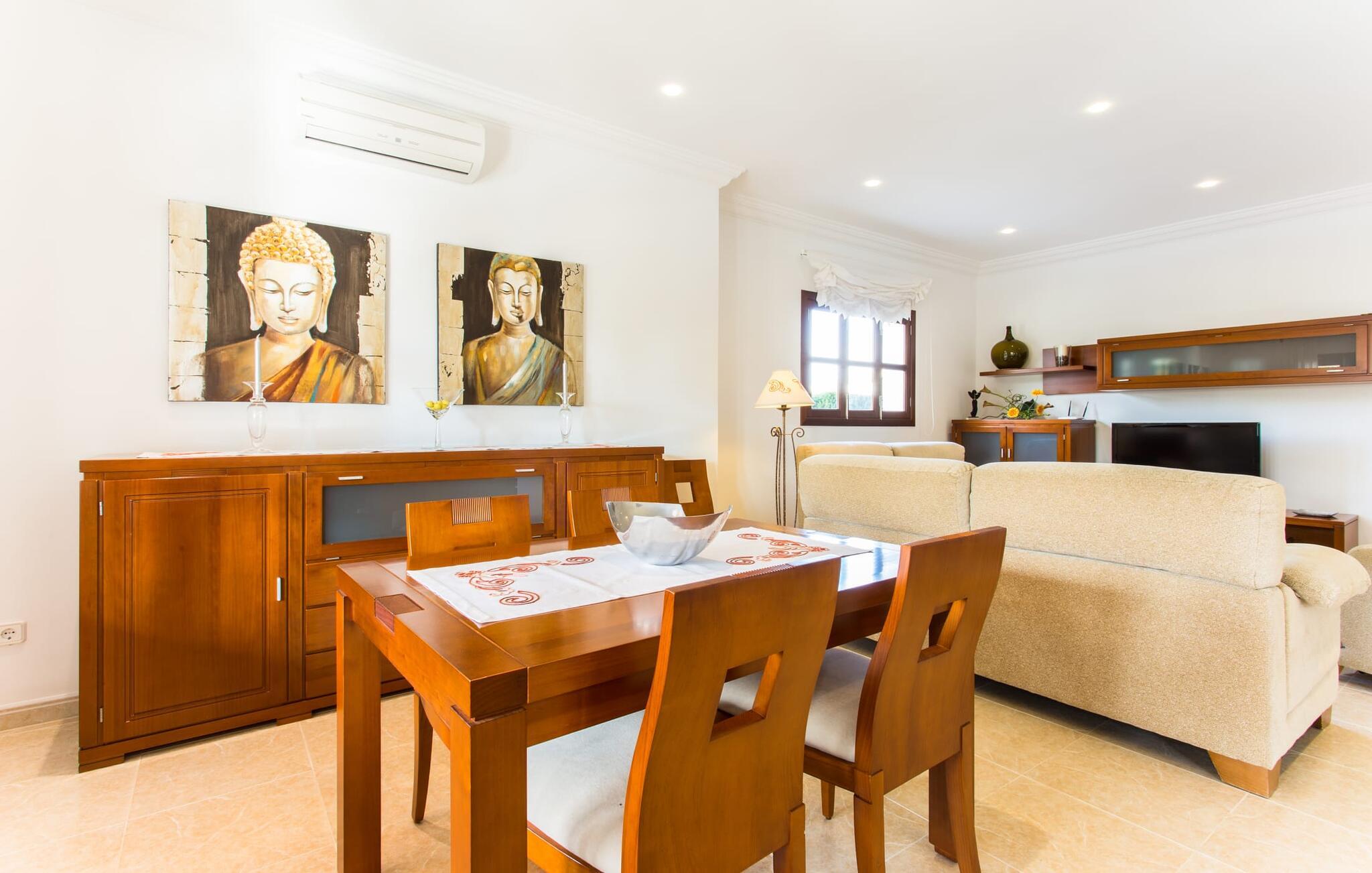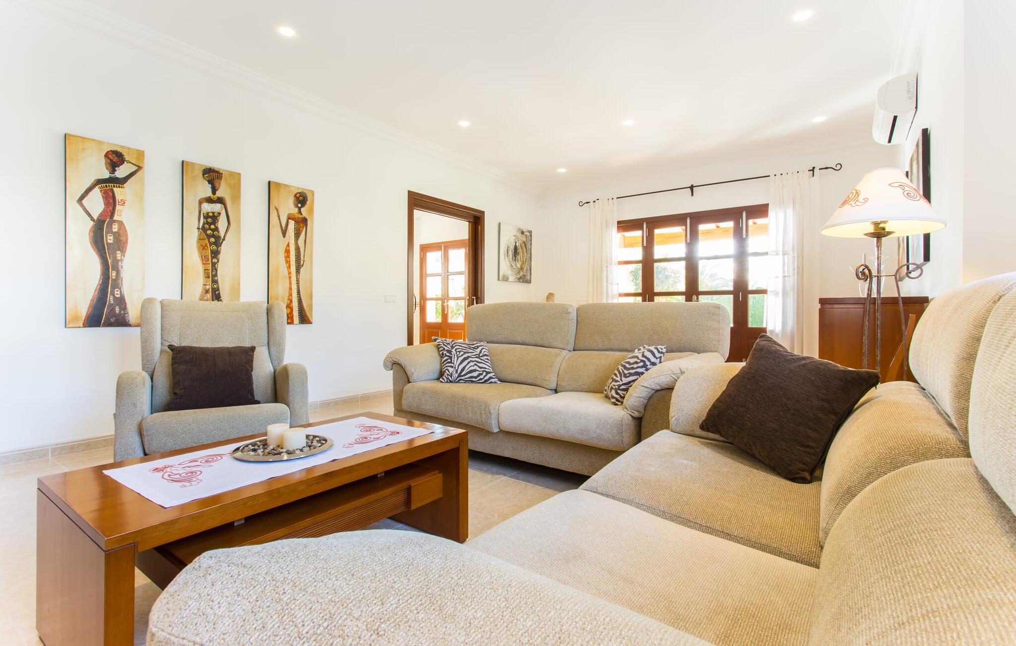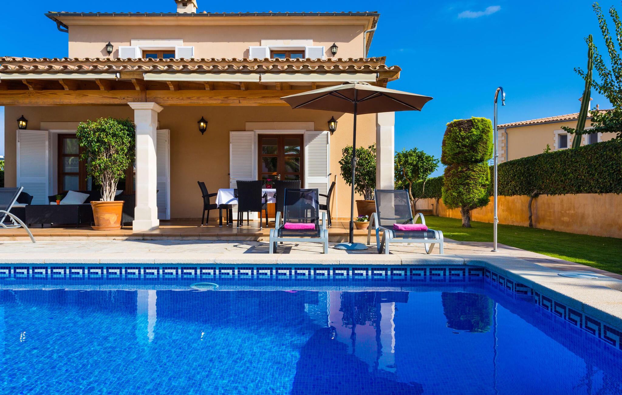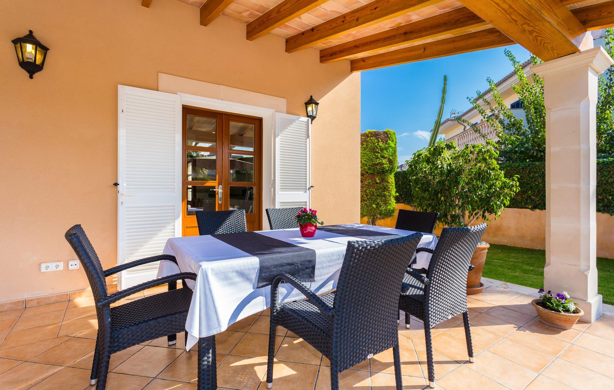 Den markante villa "Gatoses" er præget af helt jordnær elegance og tidløshed, hvor I kan føle jer hjemme. Så snart man træder ind i denne lille, men smukke ejendom, bliver omsorgen for de venlige ejere tydelig: Det starter med den smukke, velholdte have, som har store græsplæner fyldt med blomster. jeres privatliv er garanteret af en tyk grøn hæk, der grænser op til ejendommen. Der er talrige terracotta krukker på den vidunderligt skyggefulde veranda, og selve huset er smukt dekoreret med blomster og buske. Den overdækkede terrasse har udsigt over en pool med en kurve i den ene ende, der angiver, hvor pooltrinene begynder, og en bugtende mosaik rundt om kanten. Slap af i en af liggestolene og nyd solen på plænen eller naturstensterrassen. Hvide søjler understøtter taget over den rummelige terrasse, hvor denne farve også optræder på skodderne, hvilket skaber en smuk, skarp kontrast til selve rækkehusets jordfarver. Der er god plads til sidde- og spisepladserne med udendørsmøbler af høj kvalitet, også lavet af polyrattan. Start jeres dag med morgenmad sammen, spis en let frokost og tag hjem om aftenen - hvor premium gasgrillstationen venter på jer under et oplyst fortelt og gør hver dag i jeres ferie speciel. Dobbelte terrassedøre fører fra terrassen ind til stuen og spisestuen på fincaen. Møblerne er harmoniske i enhver henseende: et lyst stengulv, hvide vægge, mørke massive trædøre og højkvalitets møbler i massivt træ med et strejf af eksklusivitet, sammen med nøje udvalgte dekorative genstande og samtidskunst på væggene, sørger for noget bestemt. Et smukt harmonisk rum, hvor I kan føle jer hjemme. Fra stuen fører en dobbelt skydedør ind i det hyggelige, veludstyrede køkken. Med en hvid højglans køkkendel med gaskomfur og kogeplader, amerikansk køle/fryseskab i rustfrit stål, opvaskemaskine, mikroovn og meget mere bliver selvforplejning ikke nemmere! Og med en dør, der fører til den udendørs spiseplads, er det lige så praktisk at spise udendørs som at blive indendørs. Med to dobbeltværelser og et tredobbeltværelse kan villaen rumme op til syv personer. Tredobbeltværelset er særligt velegnet til forældre til et barn, der allerede er vokset nok og har brug for egen seng. Ved siden af soveværelset i stueetagen er der et badeværelse i beige toner med moderne bruseniche. Det andet badeværelse er tilgængeligt via gangen i de to soveværelser på øverste etage. Dette er et stilfuldt hvidt værelse med bambusgrønne accenter og et komfortabelt badeværelse. Også ovenpå er en romantisk altan med et opholdsområde, hvor I kan sidde og se nattehimlen og lytte til havets brusen. Intet andet end fint, let sand under fødderne, blåt havvand, der strækker sig til horisonten... En gåtur på den nærliggende strand, som er næsten 890 m lang, er et paradis for alle. Og gæster i "Gatoses"-rækkehuset kan komme dertil på ingen tid, da huset ligger kun 700 meter fra vandet og lige i hjertet af kystbyen Sa Coma, hvilket betyder, at mange attraktioner og faciliteter er kun en kort gåtur væk . Da beliggenheden midt i byen ikke altid er den mest rolige, er villaen perfekt til alle, der leder efter eget midlertidigt hjem i en noget mere travl beliggenhed, der giver mulighed for mange oplevelser også uden bil. Når I går langs promenaden, når I til sidst den nærliggende by S'Illot. Der er talrige sports- og fritidsmuligheder og endda en minigolfbane. Børn vil også elske et besøg i safariparken i den nordlige del af byen. Her er noget for enhver aldersgruppe - inklusive masser af muligheder for at slappe af og slappe af. Den attraktive byvilla "Gatoses" imponerer med sin stilfulde indretning og en perfekt beliggenhed nær den lille kystby Sa Coma nær Cala Millor. Shoppingmuligheder bugner rundt i byen, men på en søndag bør I tage til markedet i den berømte havneby Portocristo, kun få minutters kørsel væk. Smukke sandstrande med fremragende vandkvalitet som Sa Coma eller S'Illot er kun få minutters gang væk. De inviterer jer til at tage lange gåture på stranden.