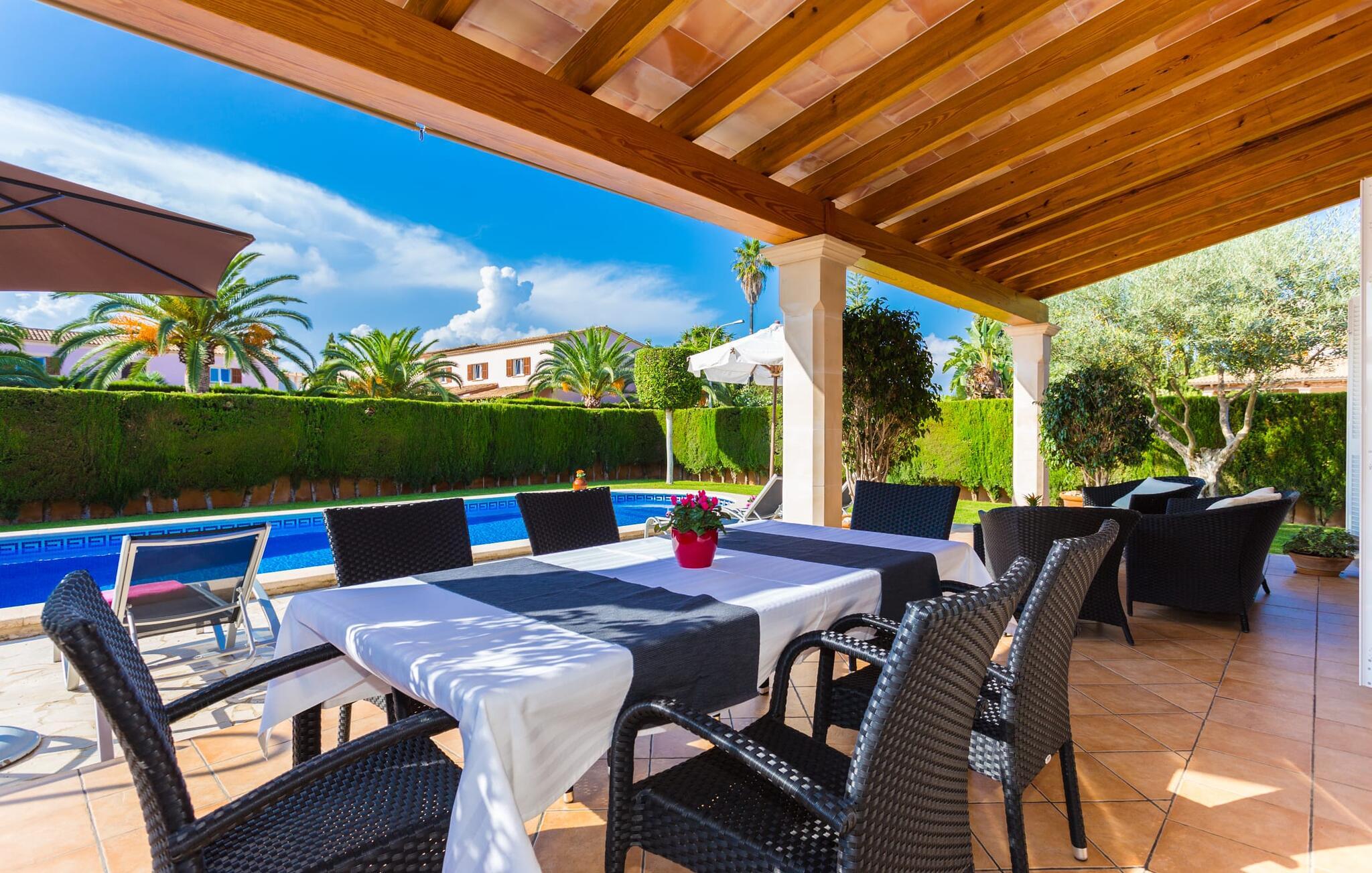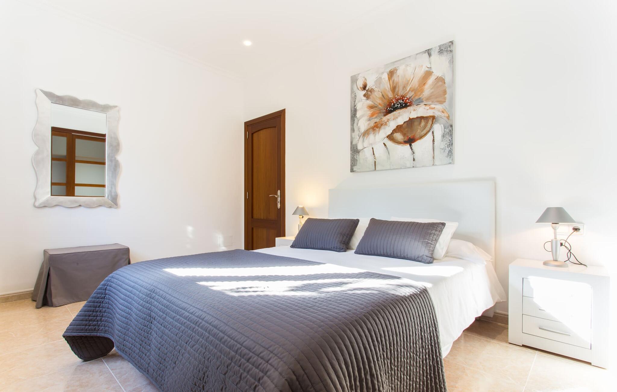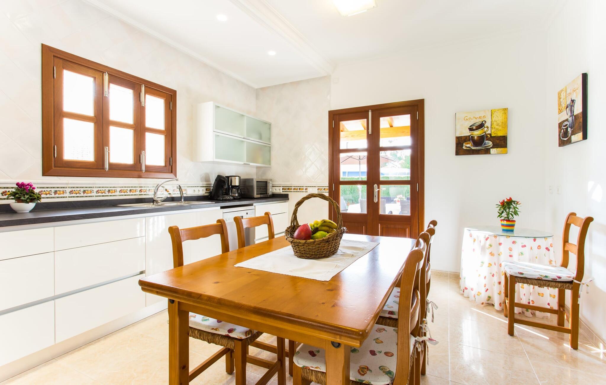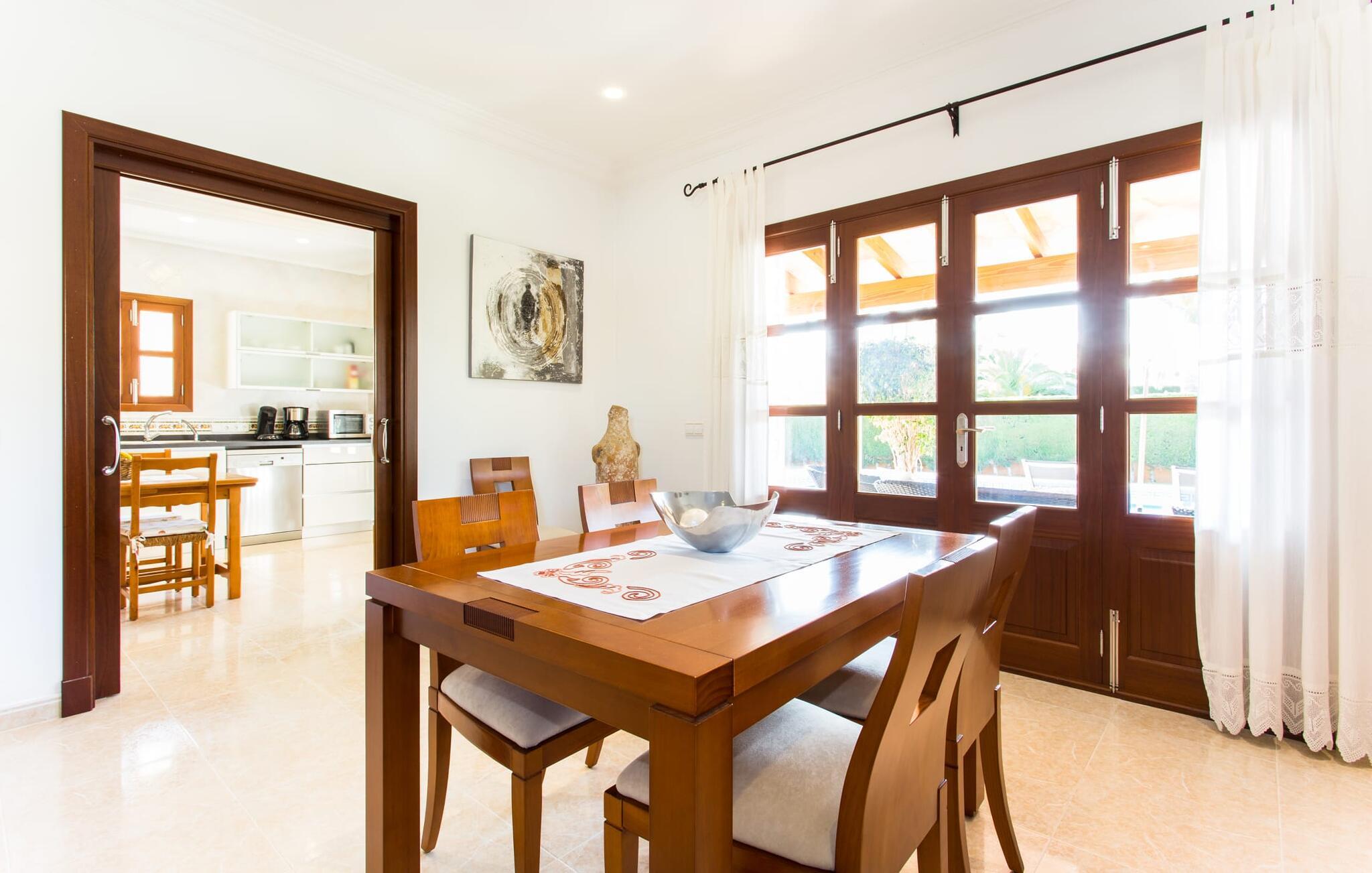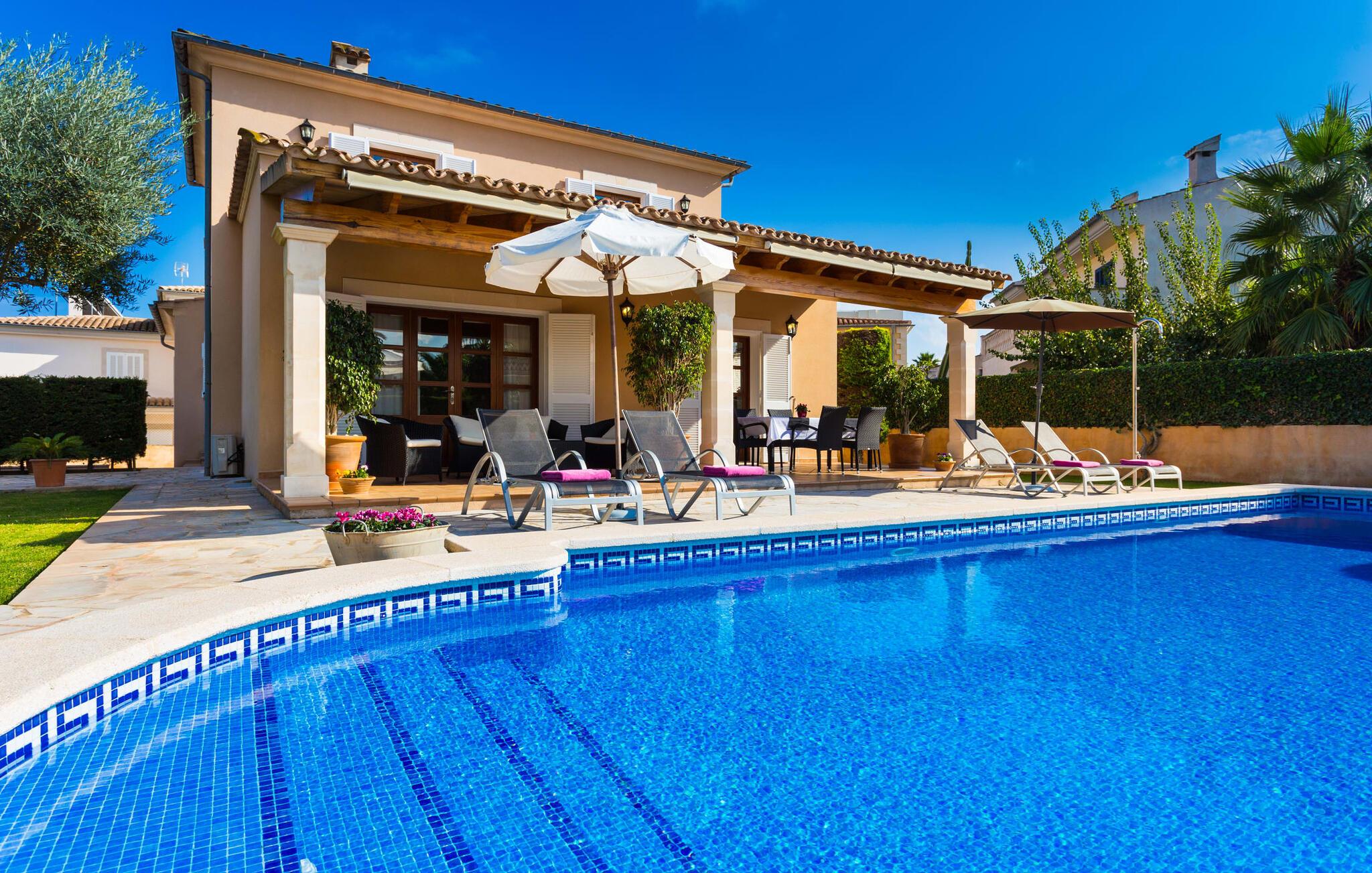 Den markante villa "Gatoses" er præget af helt jordnær elegance og tidløshed, hvor I kan føle jer hjemme. Så snart man træder ind i denne lille, men smukke ejendom, bliver omsorgen for de venlige ejere tydelig: Det starter med den smukke, velholdte have, som har store græsplæner fyldt med blomster. jeres privatliv er garanteret af en tyk grøn hæk, der grænser op til ejendommen. Der er talrige terracotta krukker på den vidunderligt skyggefulde veranda, og selve huset er smukt dekoreret med blomster og buske. Den overdækkede terrasse har udsigt over en pool med en kurve i den ene ende, der angiver, hvor pooltrinene begynder, og en bugtende mosaik rundt om kanten. Slap af i en af liggestolene og nyd solen på plænen eller naturstensterrassen. Hvide søjler understøtter taget over den rummelige terrasse, hvor denne farve også optræder på skodderne, hvilket skaber en smuk, skarp kontrast til selve rækkehusets jordfarver. Der er god plads til sidde- og spisepladserne med udendørsmøbler af høj kvalitet, også lavet af polyrattan. Start jeres dag med morgenmad sammen, spis en let frokost og tag hjem om aftenen - hvor premium gasgrillstationen venter på jer under et oplyst fortelt og gør hver dag i jeres ferie speciel. Dobbelte terrassedøre fører fra terrassen ind til stuen og spisestuen på fincaen. Møblerne er harmoniske i enhver henseende: et lyst stengulv, hvide vægge, mørke massive trædøre og højkvalitets møbler i massivt træ med et strejf af eksklusivitet, sammen med nøje udvalgte dekorative genstande og samtidskunst på væggene, sørger for noget bestemt. Et smukt harmonisk rum, hvor I kan føle jer hjemme. Fra stuen fører en dobbelt skydedør ind i det hyggelige, veludstyrede køkken. Med en hvid højglans køkkendel med gaskomfur og kogeplader, amerikansk køle/fryseskab i rustfrit stål, opvaskemaskine, mikroovn og meget mere bliver selvforplejning ikke nemmere! Og med en dør, der fører til den udendørs spiseplads, er det lige så praktisk at spise udendørs som at blive indendørs. Med to dobbeltværelser og et tredobbeltværelse kan villaen rumme op til syv personer. Tredobbeltværelset er særligt velegnet til forældre til et barn, der allerede er vokset nok og har brug for egen seng. Ved siden af soveværelset i stueetagen er der et badeværelse i beige toner med moderne bruseniche. Det andet badeværelse er tilgængeligt via gangen i de to soveværelser på øverste etage. Dette er et stilfuldt hvidt værelse med bambusgrønne accenter og et komfortabelt badeværelse. Også ovenpå er en romantisk altan med et opholdsområde, hvor I kan sidde og se nattehimlen og lytte til havets brusen. Intet andet end fint, let sand under fødderne, blåt havvand, der strækker sig til horisonten... En gåtur på den nærliggende strand, som er næsten 890 m lang, er et paradis for alle. Og gæster i "Gatoses"-rækkehuset kan komme dertil på ingen tid, da huset ligger kun 700 meter fra vandet og lige i hjertet af kystbyen Sa Coma, hvilket betyder, at mange attraktioner og faciliteter er kun en kort gåtur væk . Da beliggenheden midt i byen ikke altid er den mest rolige, er villaen perfekt til alle, der leder efter eget midlertidigt hjem i en noget mere travl beliggenhed, der giver mulighed for mange oplevelser også uden bil. Når I går langs promenaden, når I til sidst den nærliggende by S'Illot. Der er talrige sports- og fritidsmuligheder og endda en minigolfbane. Børn vil også elske et besøg i safariparken i den nordlige del af byen. Her er noget for enhver aldersgruppe - inklusive masser af muligheder for at slappe af og slappe af. Den attraktive byvilla "Gatoses" imponerer med sin stilfulde indretning og en perfekt beliggenhed nær den lille kystby Sa Coma nær Cala Millor. Shoppingmuligheder bugner rundt i byen, men på en søndag bør I tage til markedet i den berømte havneby Portocristo, kun få minutters kørsel væk. Smukke sandstrande med fremragende vandkvalitet som Sa Coma eller S'Illot er kun få minutters gang væk. De inviterer jer til at tage lange gåture på stranden.
