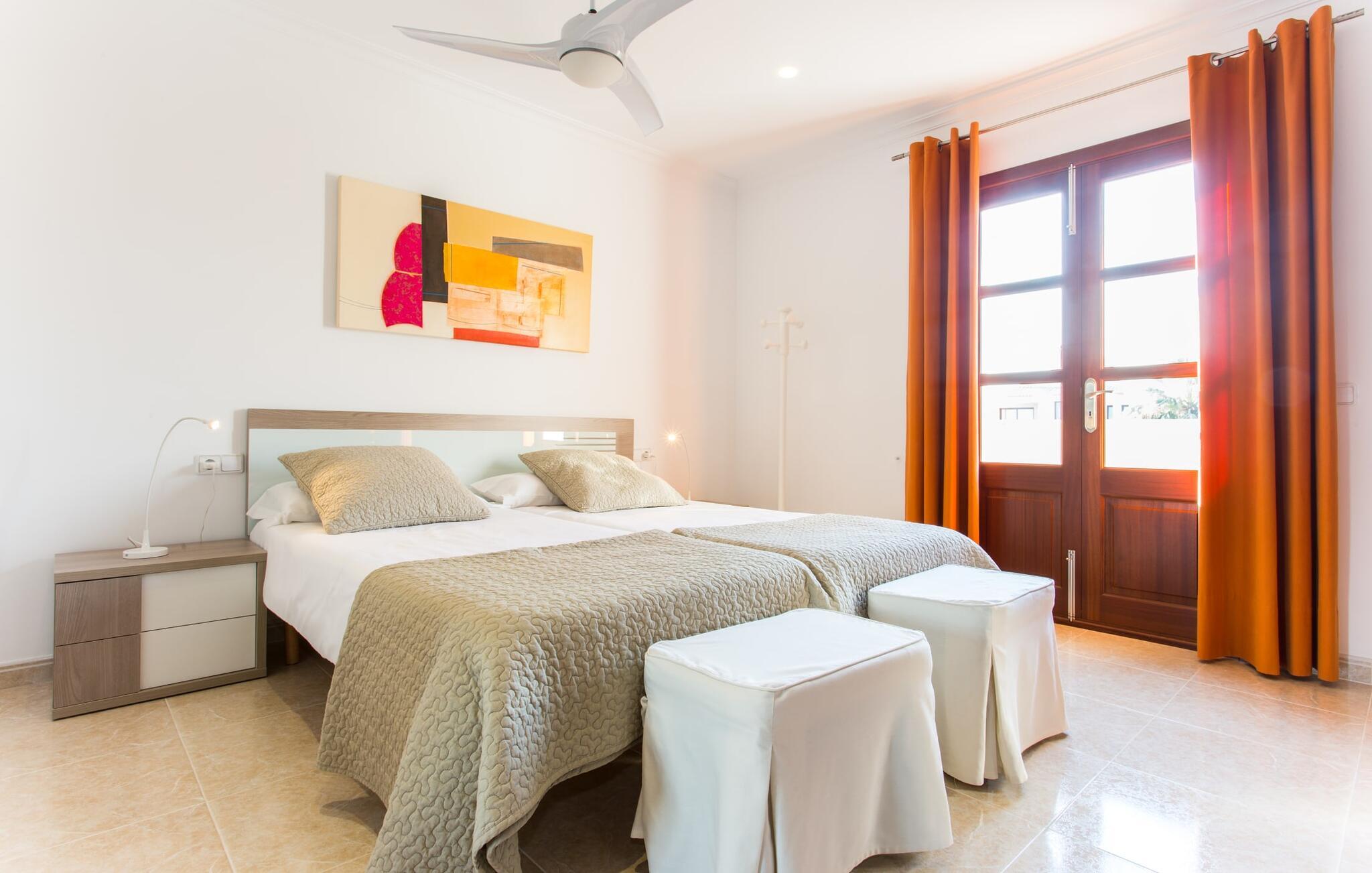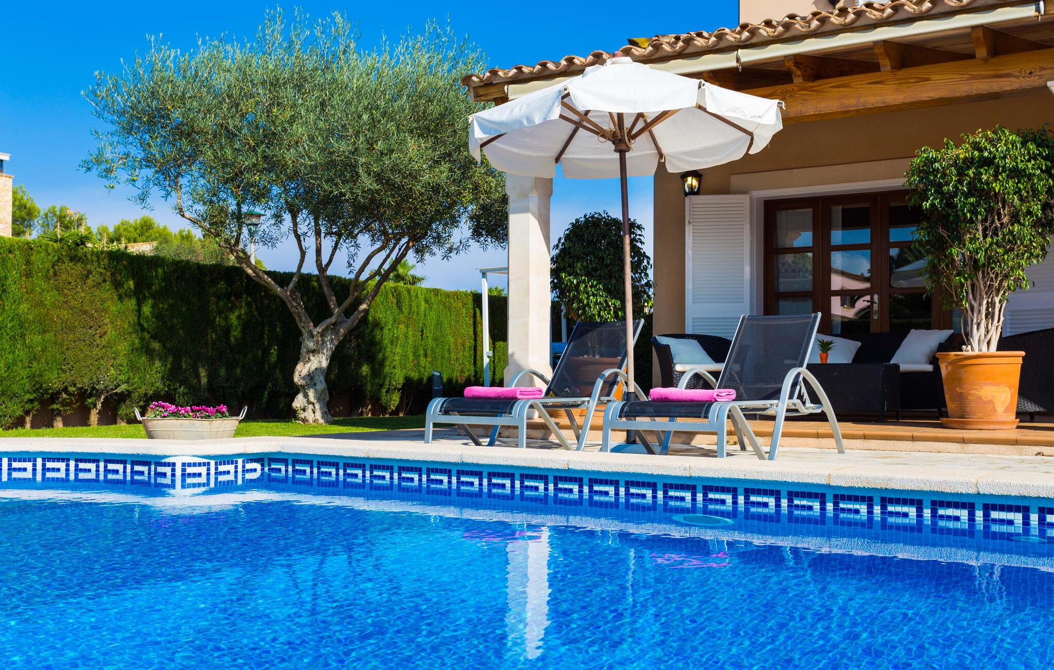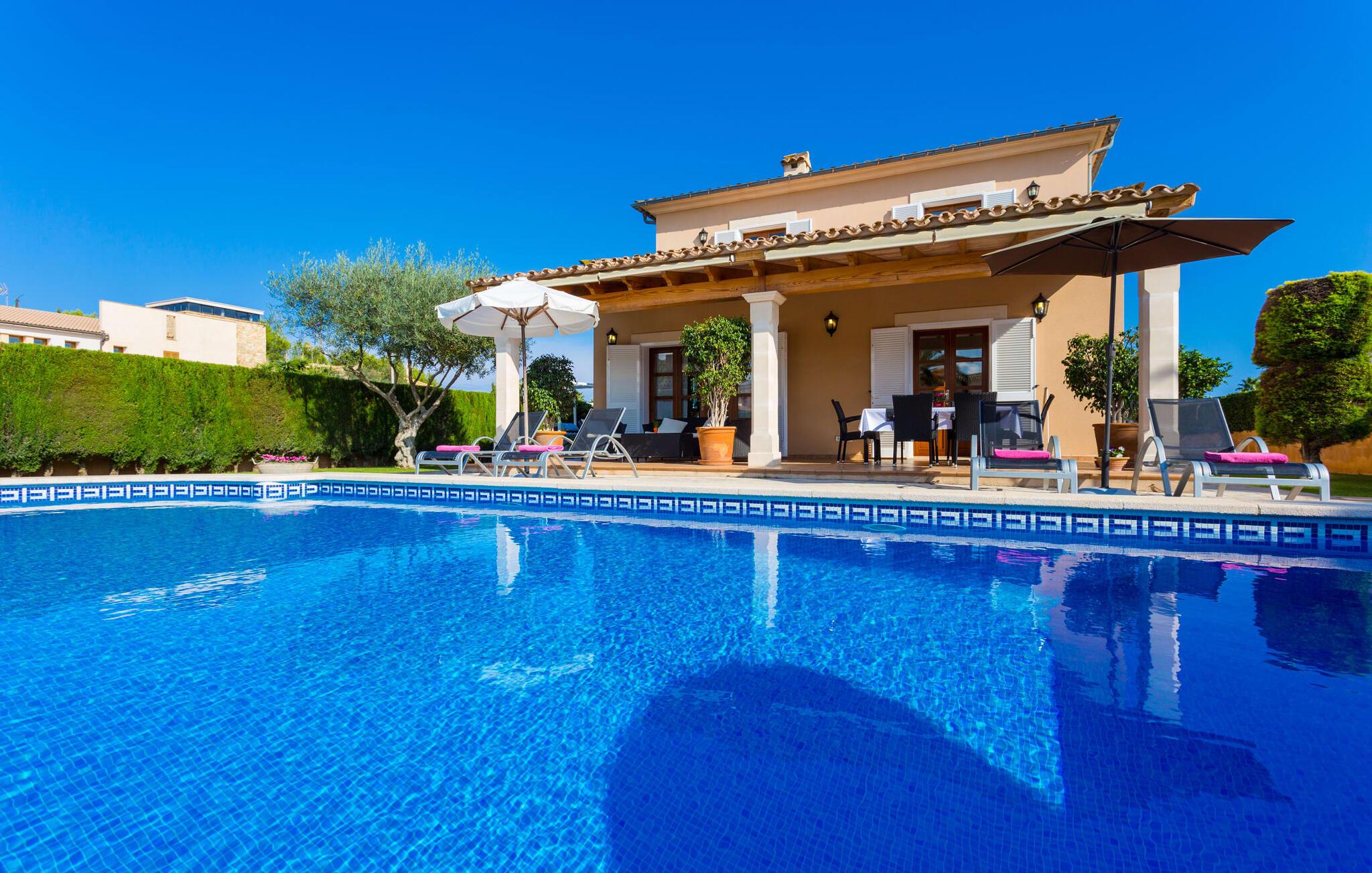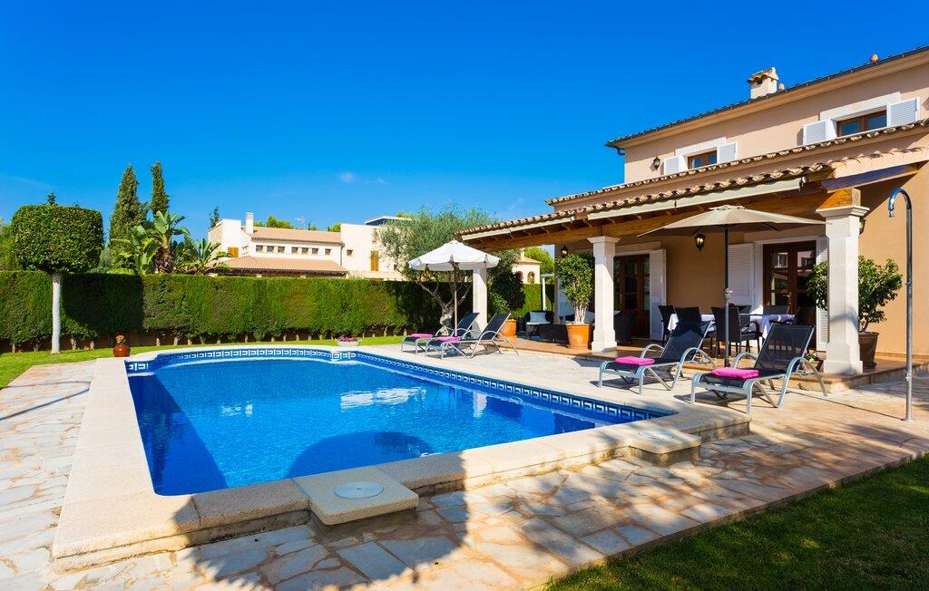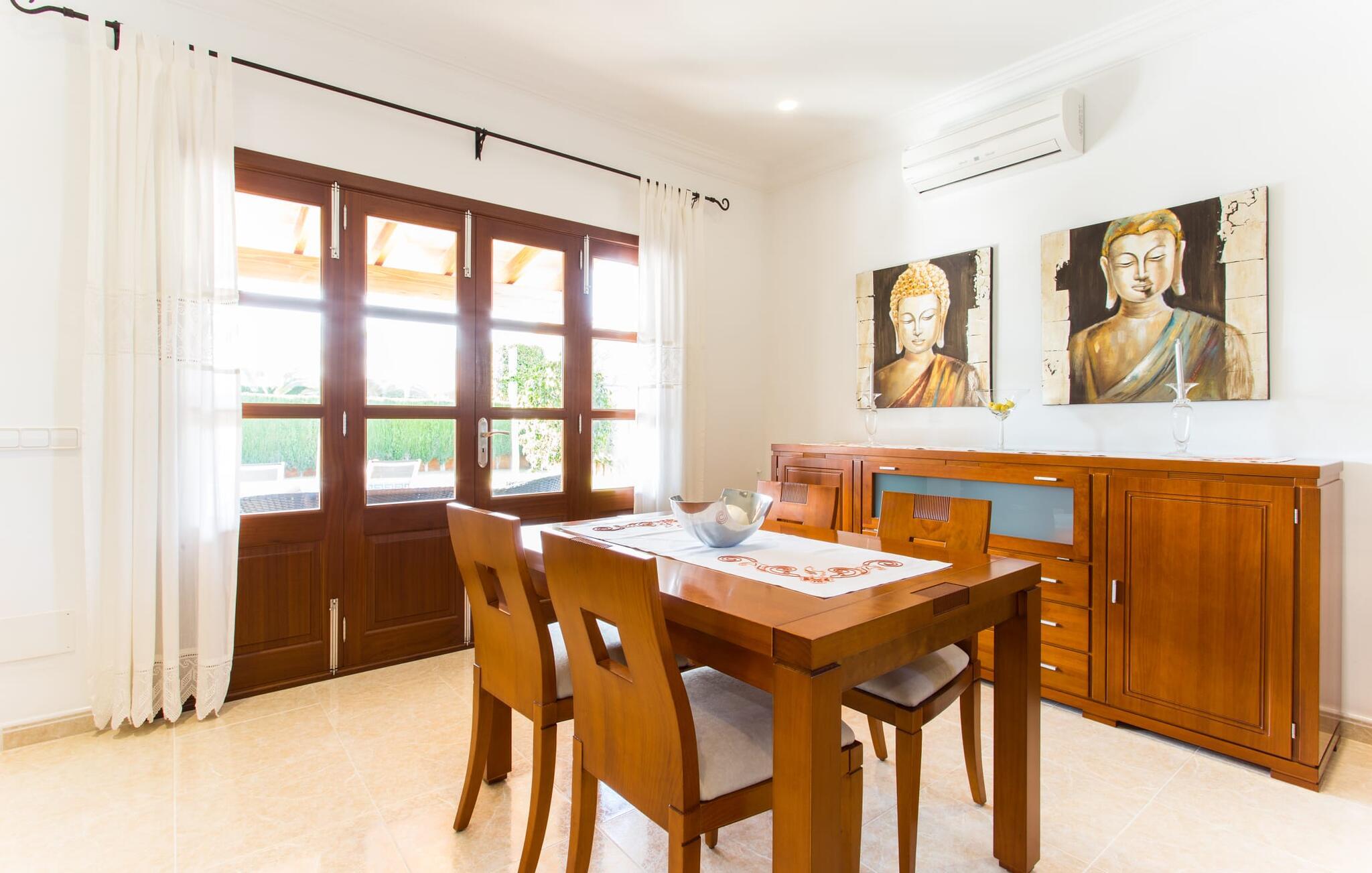 Den markante villa "Gatoses" er præget af helt jordnær elegance og tidløshed, hvor I kan føle jer hjemme. Så snart man træder ind i denne lille, men smukke ejendom, bliver omsorgen for de venlige ejere tydelig: Det starter med den smukke, velholdte have, som har store græsplæner fyldt med blomster. jeres privatliv er garanteret af en tyk grøn hæk, der grænser op til ejendommen. Der er talrige terracotta krukker på den vidunderligt skyggefulde veranda, og selve huset er smukt dekoreret med blomster og buske. Den overdækkede terrasse har udsigt over en pool med en kurve i den ene ende, der angiver, hvor pooltrinene begynder, og en bugtende mosaik rundt om kanten. Slap af i en af liggestolene og nyd solen på plænen eller naturstensterrassen. Hvide søjler understøtter taget over den rummelige terrasse, hvor denne farve også optræder på skodderne, hvilket skaber en smuk, skarp kontrast til selve rækkehusets jordfarver. Der er god plads til sidde- og spisepladserne med udendørsmøbler af høj kvalitet, også lavet af polyrattan. Start jeres dag med morgenmad sammen, spis en let frokost og tag hjem om aftenen - hvor premium gasgrillstationen venter på jer under et oplyst fortelt og gør hver dag i jeres ferie speciel. Dobbelte terrassedøre fører fra terrassen ind til stuen og spisestuen på fincaen. Møblerne er harmoniske i enhver henseende: et lyst stengulv, hvide vægge, mørke massive trædøre og højkvalitets møbler i massivt træ med et strejf af eksklusivitet, sammen med nøje udvalgte dekorative genstande og samtidskunst på væggene, sørger for noget bestemt. Et smukt harmonisk rum, hvor I kan føle jer hjemme. Fra stuen fører en dobbelt skydedør ind i det hyggelige, veludstyrede køkken. Med en hvid højglans køkkendel med gaskomfur og kogeplader, amerikansk køle/fryseskab i rustfrit stål, opvaskemaskine, mikroovn og meget mere bliver selvforplejning ikke nemmere! Og med en dør, der fører til den udendørs spiseplads, er det lige så praktisk at spise udendørs som at blive indendørs. Med to dobbeltværelser og et tredobbeltværelse kan villaen rumme op til syv personer. Tredobbeltværelset er særligt velegnet til forældre til et barn, der allerede er vokset nok og har brug for egen seng. Ved siden af soveværelset i stueetagen er der et badeværelse i beige toner med moderne bruseniche. Det andet badeværelse er tilgængeligt via gangen i de to soveværelser på øverste etage. Dette er et stilfuldt hvidt værelse med bambusgrønne accenter og et komfortabelt badeværelse. Også ovenpå er en romantisk altan med et opholdsområde, hvor I kan sidde og se nattehimlen og lytte til havets brusen. Intet andet end fint, let sand under fødderne, blåt havvand, der strækker sig til horisonten... En gåtur på den nærliggende strand, som er næsten 890 m lang, er et paradis for alle. Og gæster i "Gatoses"-rækkehuset kan komme dertil på ingen tid, da huset ligger kun 700 meter fra vandet og lige i hjertet af kystbyen Sa Coma, hvilket betyder, at mange attraktioner og faciliteter er kun en kort gåtur væk . Da beliggenheden midt i byen ikke altid er den mest rolige, er villaen perfekt til alle, der leder efter eget midlertidigt hjem i en noget mere travl beliggenhed, der giver mulighed for mange oplevelser også uden bil. Når I går langs promenaden, når I til sidst den nærliggende by S'Illot. Der er talrige sports- og fritidsmuligheder og endda en minigolfbane. Børn vil også elske et besøg i safariparken i den nordlige del af byen. Her er noget for enhver aldersgruppe - inklusive masser af muligheder for at slappe af og slappe af. Den attraktive byvilla "Gatoses" imponerer med sin stilfulde indretning og en perfekt beliggenhed nær den lille kystby Sa Coma nær Cala Millor. Shoppingmuligheder bugner rundt i byen, men på en søndag bør I tage til markedet i den berømte havneby Portocristo, kun få minutters kørsel væk. Smukke sandstrande med fremragende vandkvalitet som Sa Coma eller S'Illot er kun få minutters gang væk. De inviterer jer til at tage lange gåture på stranden.