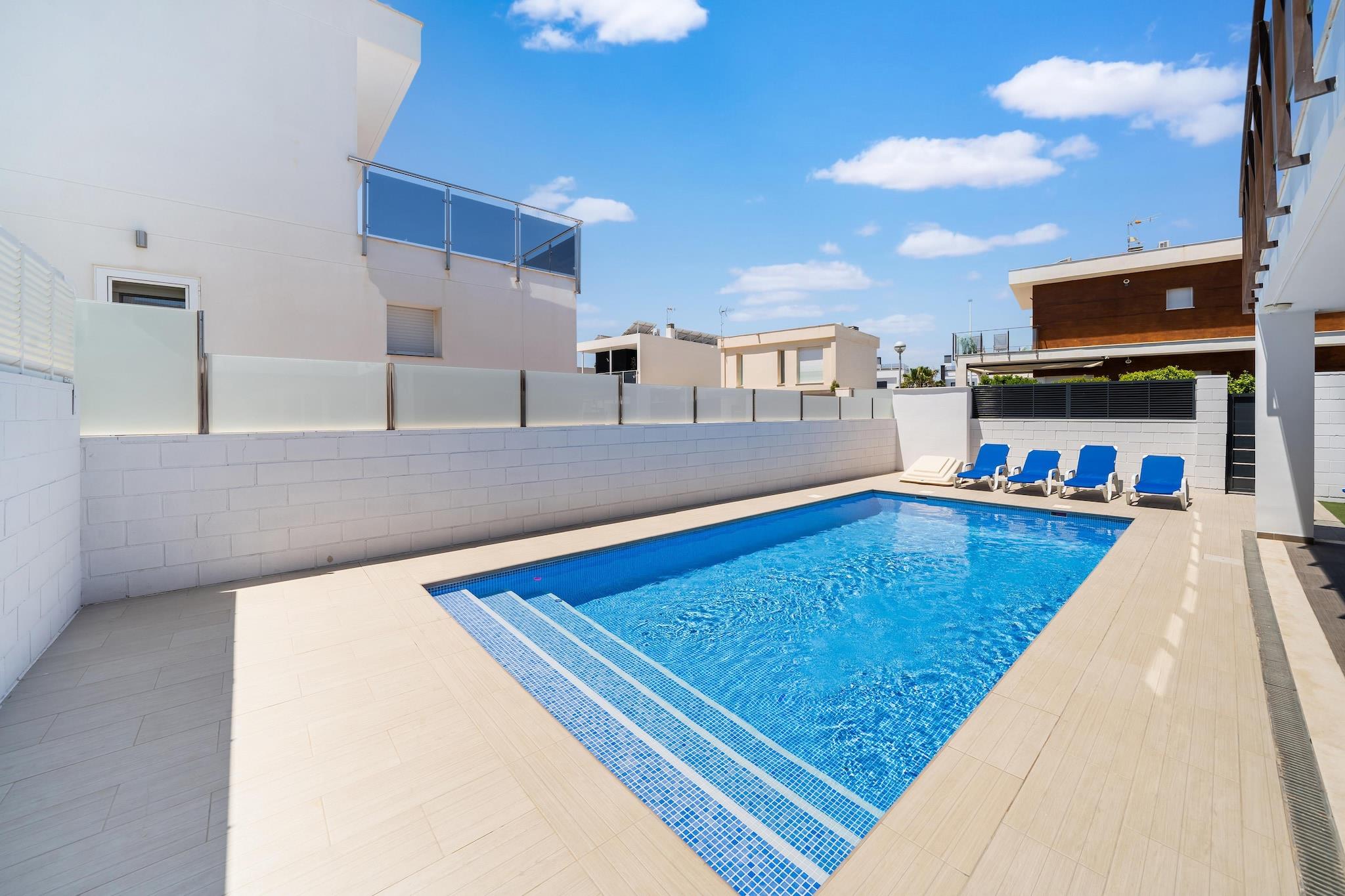 Afslapning ved poolen Træd ind i denne indbydende villa i Gran Alacant, hvor en privat swimmingpool tilbyder et forfriskende tilflugtssted under den spanske sol. Med fire soveværelser, der kan rumme op til otte gæster, er den ideel til familier eller grupper, der leder efter plads og komfort. Nyd solrige morgener ved poolen eller slap af i den møblerede have med en kølig drink efter en dag med udforskning. Nærliggende strande og spisning Kun 5 km væk, Carabassi Beach giver blødt sand og blide bølger til en perfekt stranddag. Santa Pola er også inden for rækkevidde for yderligere kysteventyr. Til hverdagens behov er det nærmeste supermarked og lokale restauranter kun 900 meter væk, hvilket gør friske måltider og forsyninger let tilgængelige uden at miste dyrebar ferietid. Komfortabelt interiør Indvendigt har villaen en rummelig opholdsstue med aircondition med tv og et fuldt udstyret køkken klar til hjemmelavede måltider. Tøjvask er nemt med to vaskemaskiner, og familievenlige faciliteter omfatter en barneseng og høj stol. Parkering er tilgængelig på selve ejendommen, og Alicante Lufthavn ligger kun 10 km væk, hvilket giver mulighed for en jævn ankomst og afgang.