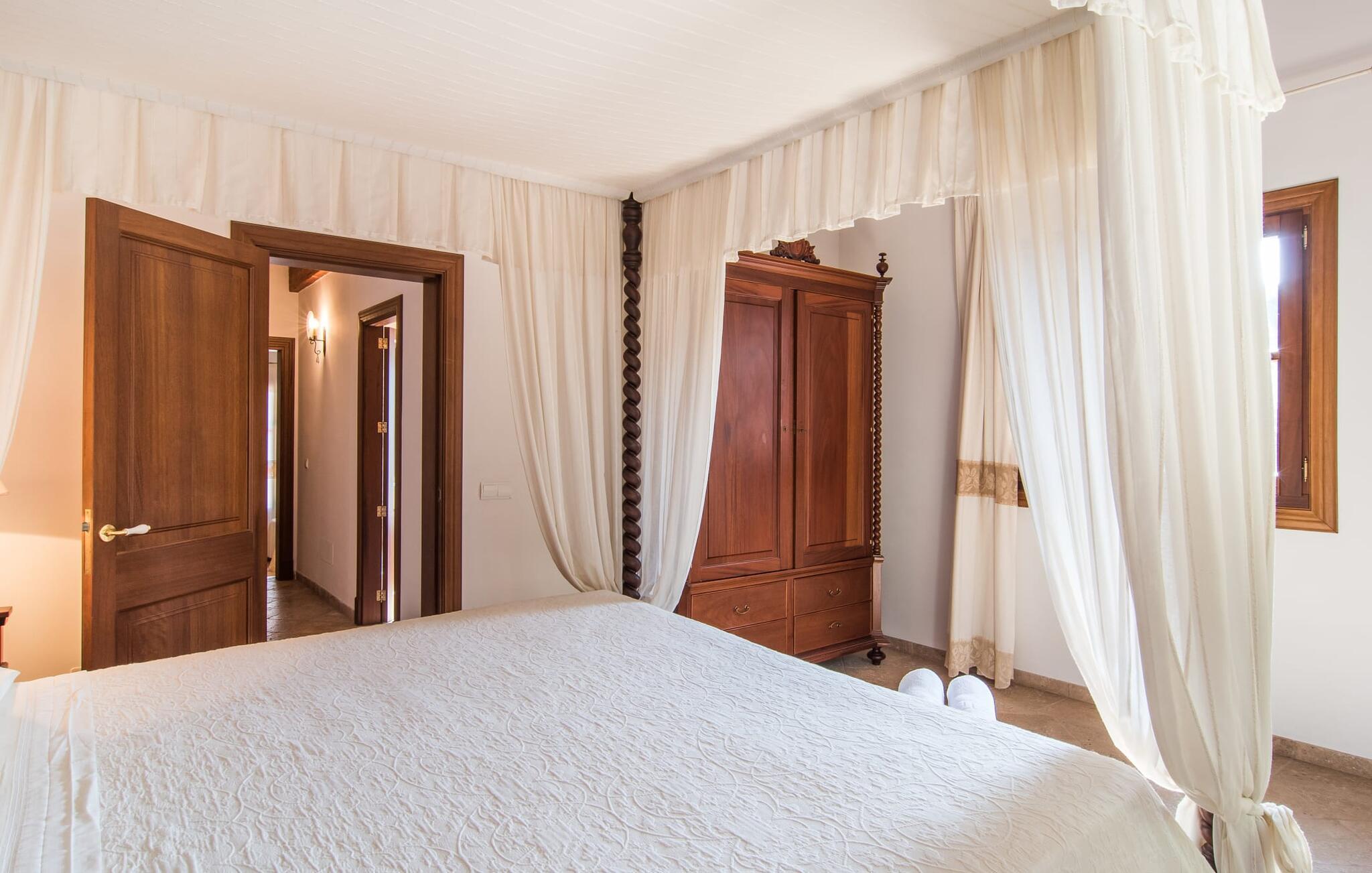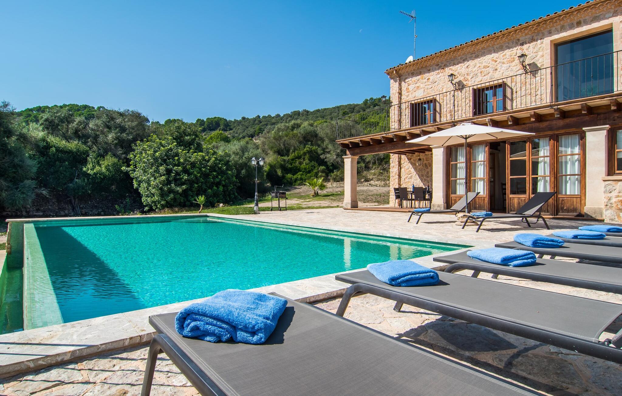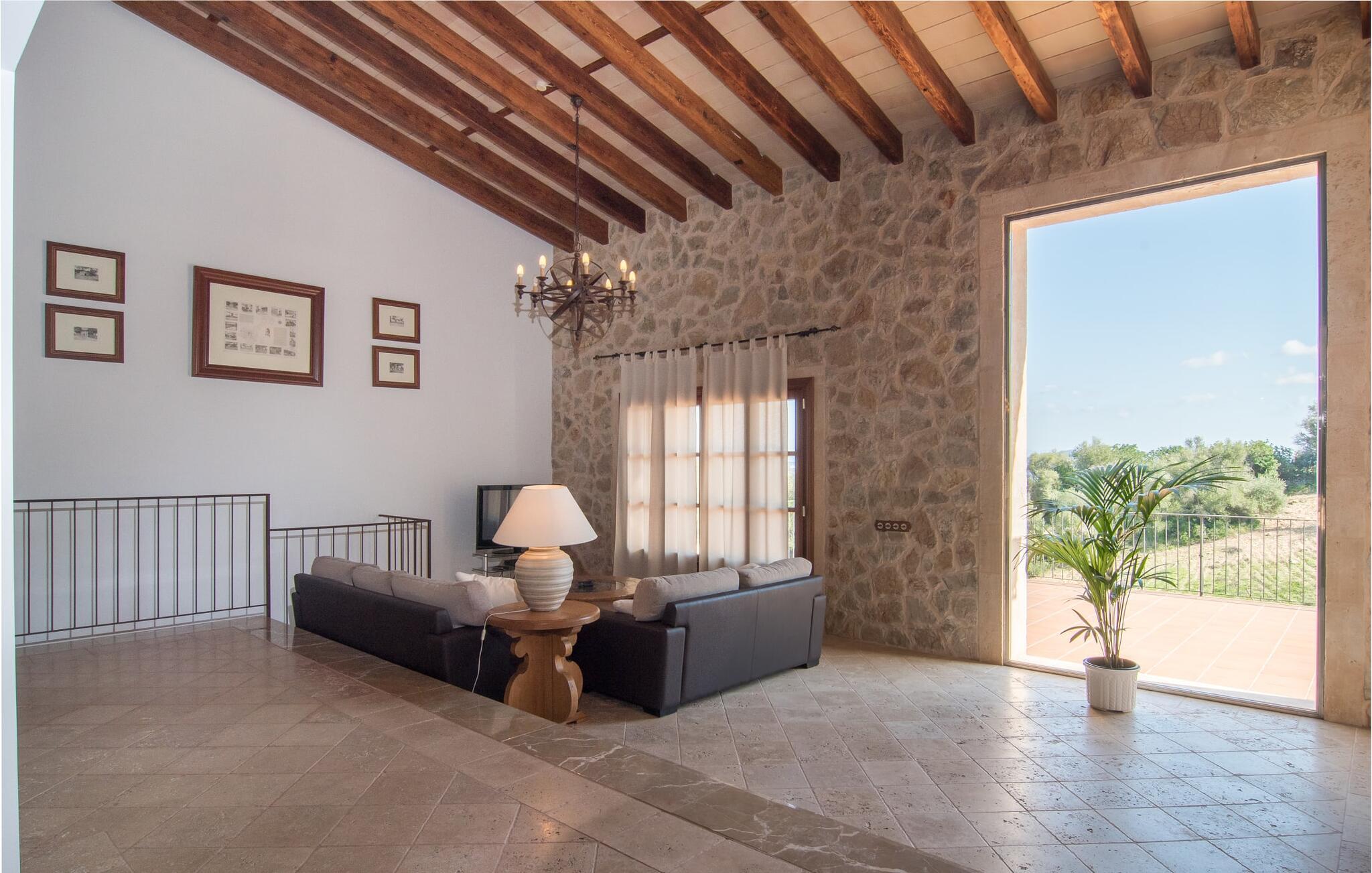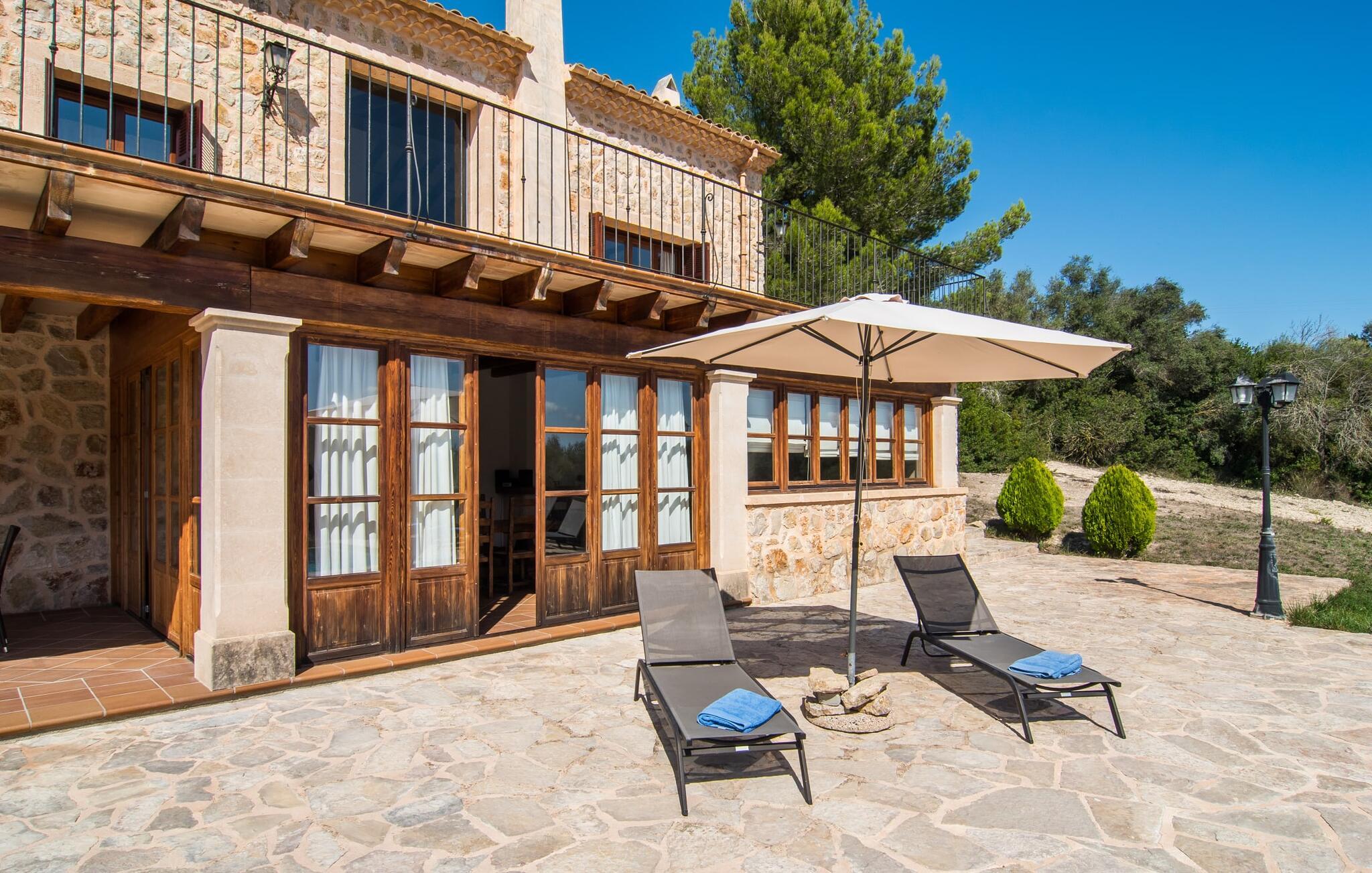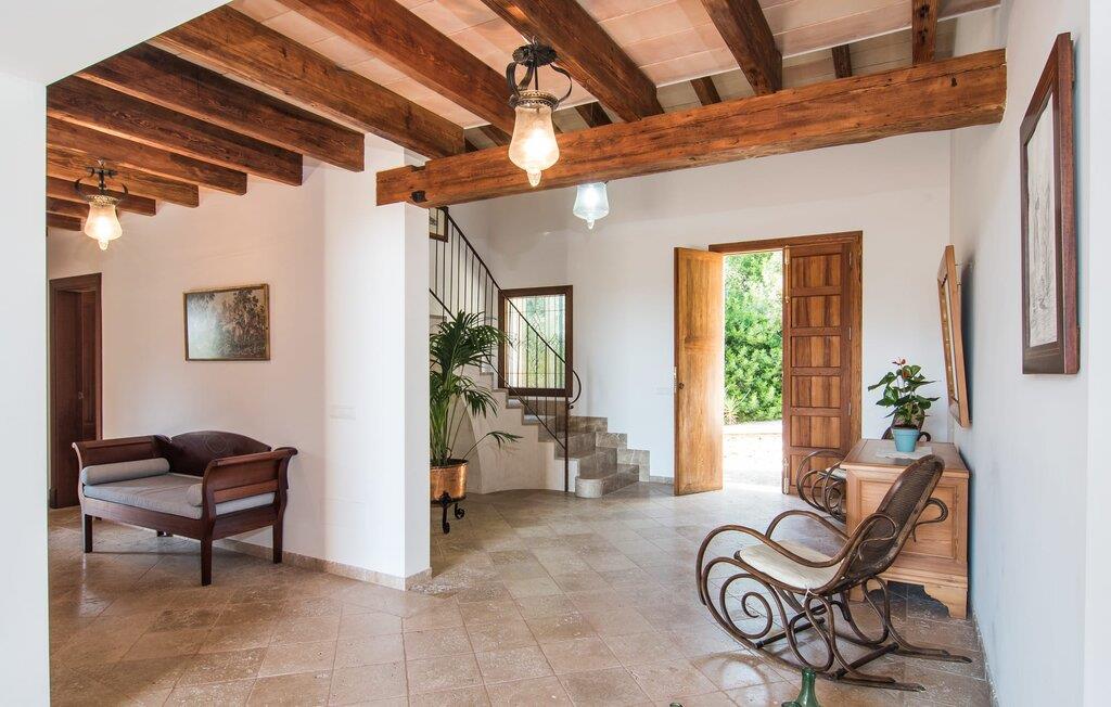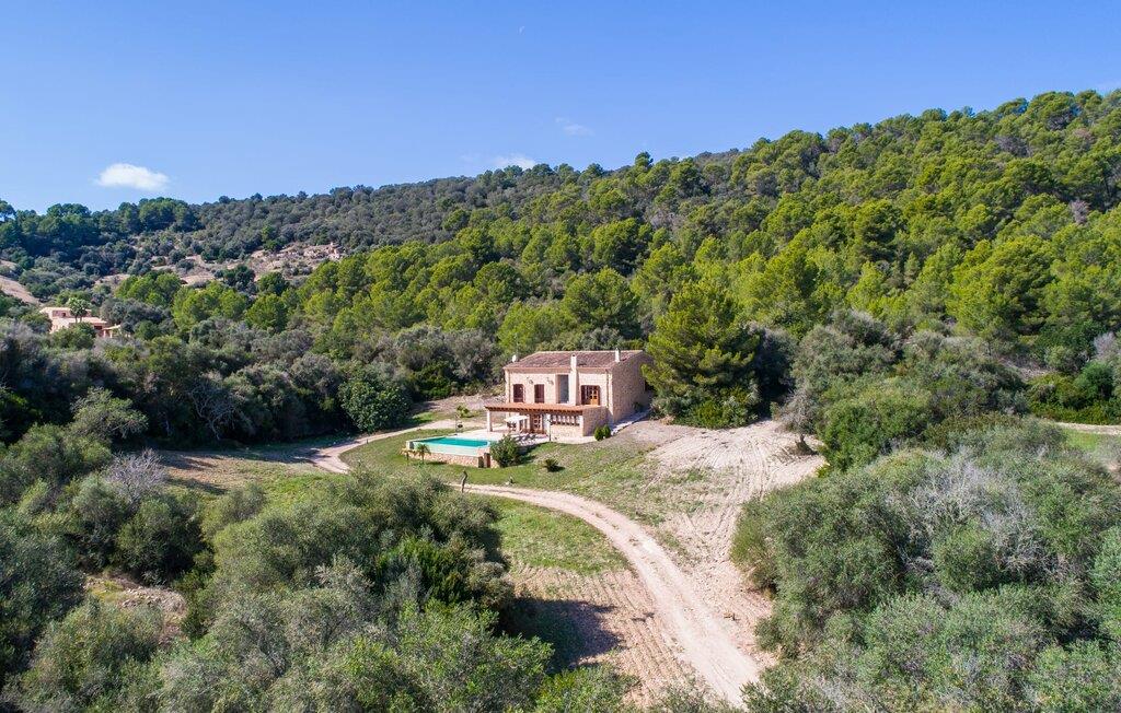 Den statelige naturstensvilla "Horlandis" ligger på en rummelig ejendom midt i de idylliske mallorcanske vidder. Omgivet af skove og marker er det det perfekte sted at slappe af og nyde freden og roen. Ejendommen kan slet ikke overses og tilbyder derfor ubegrænset privatliv. Beliggende i den rummelige naturstensterrasse lover den indbydende infinity-pool at køle af på varme dage og er samtidig stor nok til at svømme et par længder. Efter et hop i det forfriskende vand kan I finde jer tilpas på en af liggestolene omkring poolen og nyde jeres helt idylliske ferie. Hvis det bliver for varmt, finder I masser af skyggefulde pletter på den overdækkede terrasse lige ved siden af huset. Det er også et godt sted at starte dagen med en lækker morgenmad ved det store bord med udsigt over poolen og ejendommen, eller at nyde en skøn grillmiddag om aftenen med et lækkert glas vin og frisklavede delikatesser. Udendørsbelysningen skaber en varm atmosfære, selv når solen er gået ned. Udefra emmer villaen charmen af en rustik sommerhusejendom, som fortsætter inde i huset. Terrassen fører jer direkte til husets køkken. Ligesom mange værelser i villaen er den ekstremt rummelig og kombinerer mallorcansk tradition og moderne bekvemmeligheder. Udover en stor gaskomfur er der også et rummeligt køleskab med fryser og en opvaskemaskine, mens køkkenet i det hele taget er meget praktisk. Et rustikt spisebord og masser af siddepladser inviterer jer til at blive hængende. På samme etage finder I et badeværelse med bruser og toilet. En trappe fører til hjertet af villaen: en kæmpe stue-spisestue med meterhøjt til loftet. Villaens hovedindgang er også placeret her. De synlige tagbjælker i træ samt den rustikke indretning af høj kvalitet skaber en hyggelig atmosfære. Tilbring aftenen på sofaen eller spis ved langbordet med jeres familie og venner. Panoramaudsigten fra den enorme tagterrasse er simpelthen storslået. Tre af de fire soveværelser er også placeret på denne etage, alle med et helt igennem rustikt mallorcansk design. To af værelserne har klassiske himmelsenge i træ, der minder om svundne tider, men er nye og af højeste kvalitet. Et andet soveværelse huser to enkeltsenge. Den klassiske, elegante stil fortsætter også på badeværelserne. Der er to af dem på denne etage - hvoraf den ene er direkte tilgængelig fra et af dobbeltværelserne. På første sal er der endnu et soveværelse med eget badeværelse og stort badekar. Bag huset kan I se Ermita de Bonany hermitage, der ligger på toppen af Puig de Bonany - en 331 hektar stor naturpark. På grund af sin vidunderlige beliggenhed og udseende kaldes kirken også "Bjergkatedralen". Hvis I foretrækker at gå til stranden frem for kirken, er de nærmeste bugter cirka 23 km væk. Der er ingen cafeer eller restauranter på den hvide sandstrand i Torrent des Revellar, men der er uberørt natur. Takket være dens centrale beliggenhed i centrum af øen kan I nå adskillige byer og attraktioner på tværs af Mallorca på mindre end en time. Nabobyen Petra, som er bedst kendt for sine kvalitetsvine, kan nås i bil på kun 15 minutter. Derfra er der kun 15 minutter til smukke Sineu. Det siges at have det bedste farmers market på øen. Det finder sted hver onsdag i Den Gamle By og tiltrækker både lokale og turister i hobetal. Den statelige landvilla “Horlandis” med en kæmpe ejendom ligger helt stille og idyllisk i hjertet af øen. Herfra kan I nyde en vidunderlig panoramaudsigt over det mallorcanske landskab. I kan hurtigt gøre jeres indkøb i de nærliggende feriesteder Petra eller Vilafranca de Bonany, som ligger cirka 15 minutters kørsel fra ejendommen. Den hvide sandstrand Torrent des Revellar med dets utroligt klare vand ligger cirka 23 km væk.