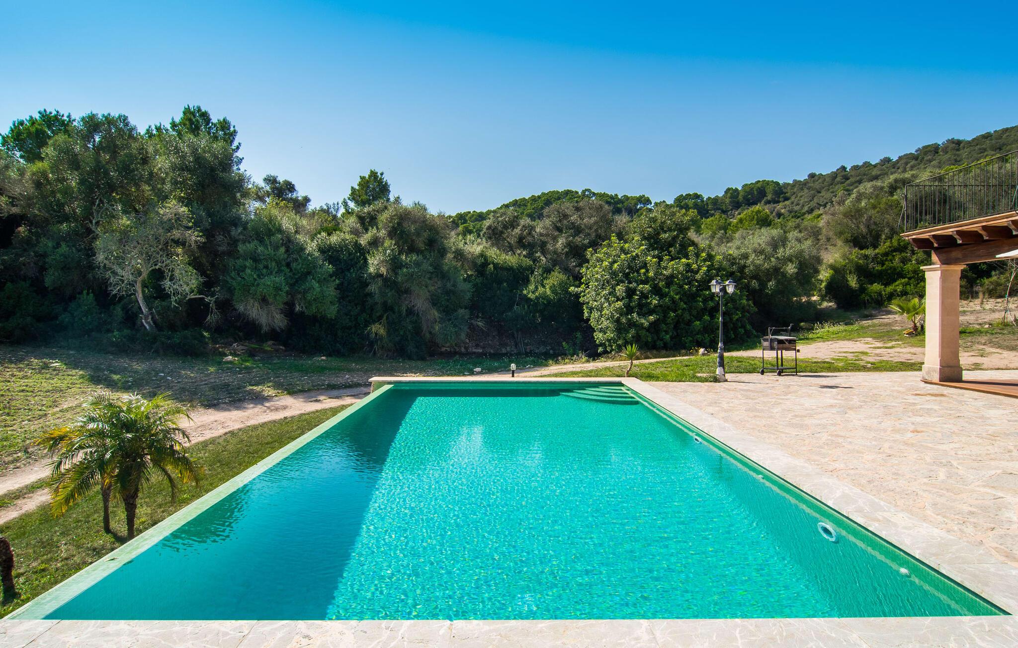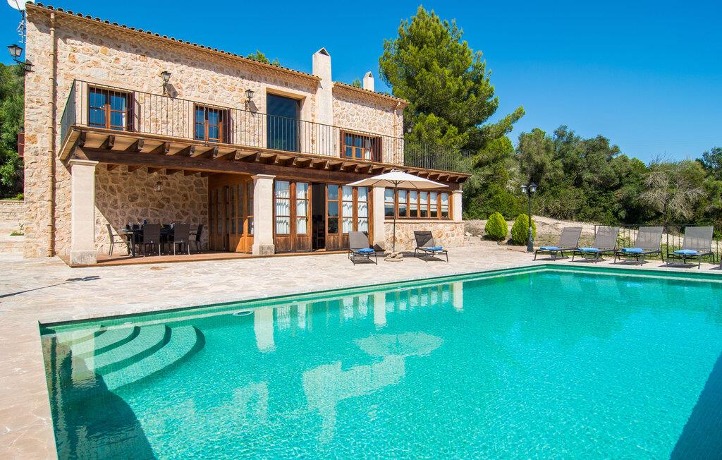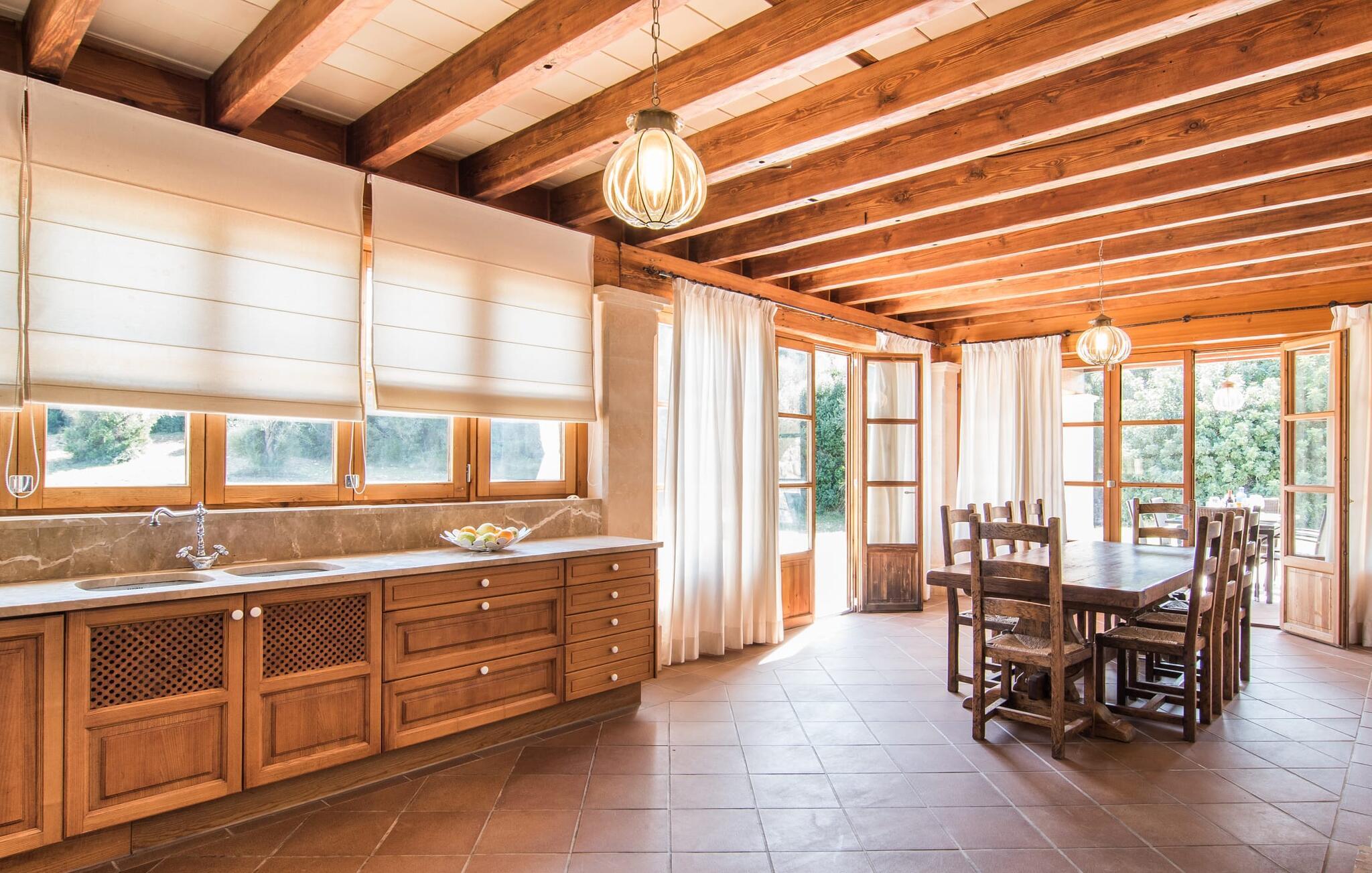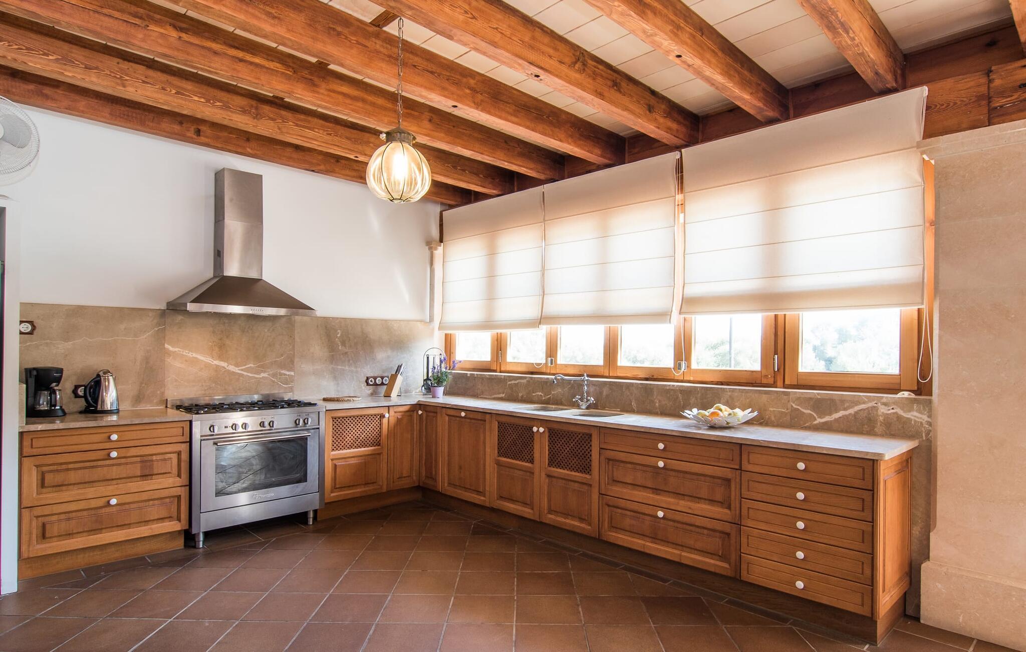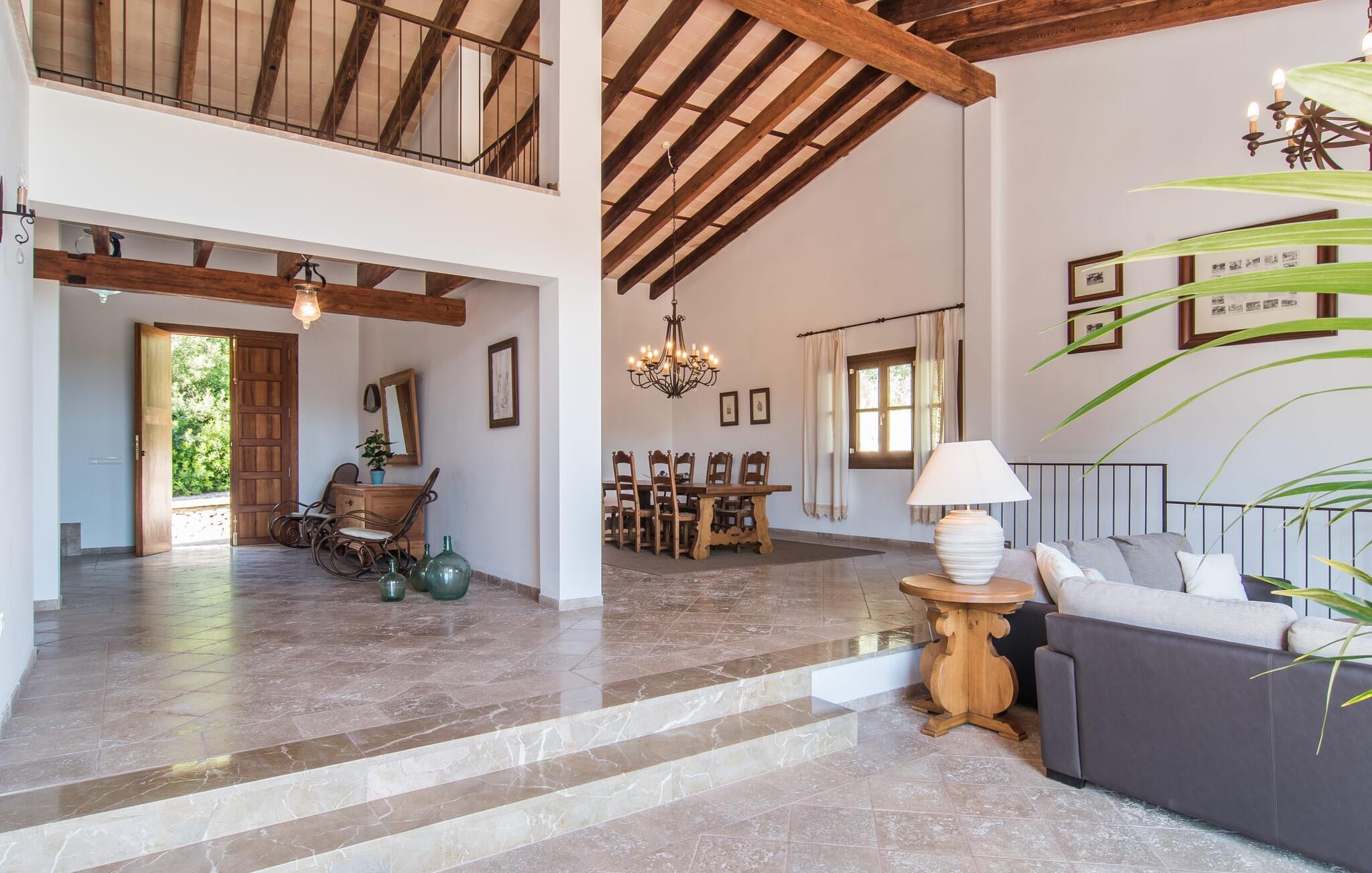 Den statelige naturstensvilla "Horlandis" ligger på en rummelig ejendom midt i de idylliske mallorcanske vidder. Omgivet af skove og marker er det det perfekte sted at slappe af og nyde freden og roen. Ejendommen kan slet ikke overses og tilbyder derfor ubegrænset privatliv. Beliggende i den rummelige naturstensterrasse lover den indbydende infinity-pool at køle af på varme dage og er samtidig stor nok til at svømme et par længder. Efter et hop i det forfriskende vand kan I finde jer tilpas på en af liggestolene omkring poolen og nyde jeres helt idylliske ferie. Hvis det bliver for varmt, finder I masser af skyggefulde pletter på den overdækkede terrasse lige ved siden af huset. Det er også et godt sted at starte dagen med en lækker morgenmad ved det store bord med udsigt over poolen og ejendommen, eller at nyde en skøn grillmiddag om aftenen med et lækkert glas vin og frisklavede delikatesser. Udendørsbelysningen skaber en varm atmosfære, selv når solen er gået ned. Udefra emmer villaen charmen af en rustik sommerhusejendom, som fortsætter inde i huset. Terrassen fører jer direkte til husets køkken. Ligesom mange værelser i villaen er den ekstremt rummelig og kombinerer mallorcansk tradition og moderne bekvemmeligheder. Udover en stor gaskomfur er der også et rummeligt køleskab med fryser og en opvaskemaskine, mens køkkenet i det hele taget er meget praktisk. Et rustikt spisebord og masser af siddepladser inviterer jer til at blive hængende. På samme etage finder I et badeværelse med bruser og toilet. En trappe fører til hjertet af villaen: en kæmpe stue-spisestue med meterhøjt til loftet. Villaens hovedindgang er også placeret her. De synlige tagbjælker i træ samt den rustikke indretning af høj kvalitet skaber en hyggelig atmosfære. Tilbring aftenen på sofaen eller spis ved langbordet med jeres familie og venner. Panoramaudsigten fra den enorme tagterrasse er simpelthen storslået. Tre af de fire soveværelser er også placeret på denne etage, alle med et helt igennem rustikt mallorcansk design. To af værelserne har klassiske himmelsenge i træ, der minder om svundne tider, men er nye og af højeste kvalitet. Et andet soveværelse huser to enkeltsenge. Den klassiske, elegante stil fortsætter også på badeværelserne. Der er to af dem på denne etage - hvoraf den ene er direkte tilgængelig fra et af dobbeltværelserne. På første sal er der endnu et soveværelse med eget badeværelse og stort badekar. Bag huset kan I se Ermita de Bonany hermitage, der ligger på toppen af Puig de Bonany - en 331 hektar stor naturpark. På grund af sin vidunderlige beliggenhed og udseende kaldes kirken også "Bjergkatedralen". Hvis I foretrækker at gå til stranden frem for kirken, er de nærmeste bugter cirka 23 km væk. Der er ingen cafeer eller restauranter på den hvide sandstrand i Torrent des Revellar, men der er uberørt natur. Takket være dens centrale beliggenhed i centrum af øen kan I nå adskillige byer og attraktioner på tværs af Mallorca på mindre end en time. Nabobyen Petra, som er bedst kendt for sine kvalitetsvine, kan nås i bil på kun 15 minutter. Derfra er der kun 15 minutter til smukke Sineu. Det siges at have det bedste farmers market på øen. Det finder sted hver onsdag i Den Gamle By og tiltrækker både lokale og turister i hobetal. Den statelige landvilla “Horlandis” med en kæmpe ejendom ligger helt stille og idyllisk i hjertet af øen. Herfra kan I nyde en vidunderlig panoramaudsigt over det mallorcanske landskab. I kan hurtigt gøre jeres indkøb i de nærliggende feriesteder Petra eller Vilafranca de Bonany, som ligger cirka 15 minutters kørsel fra ejendommen. Den hvide sandstrand Torrent des Revellar med dets utroligt klare vand ligger cirka 23 km væk.