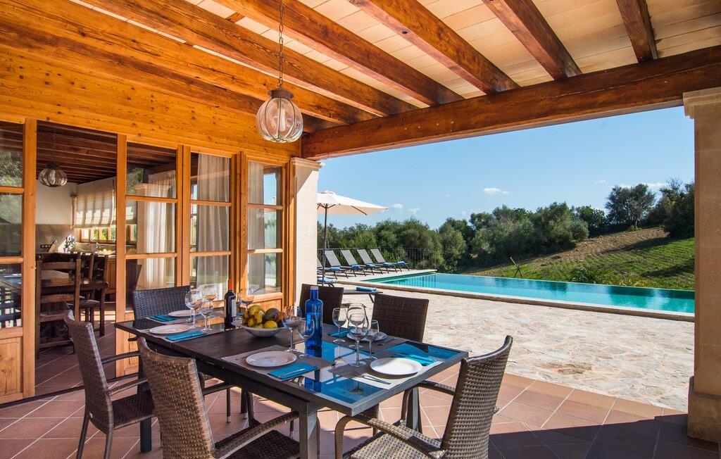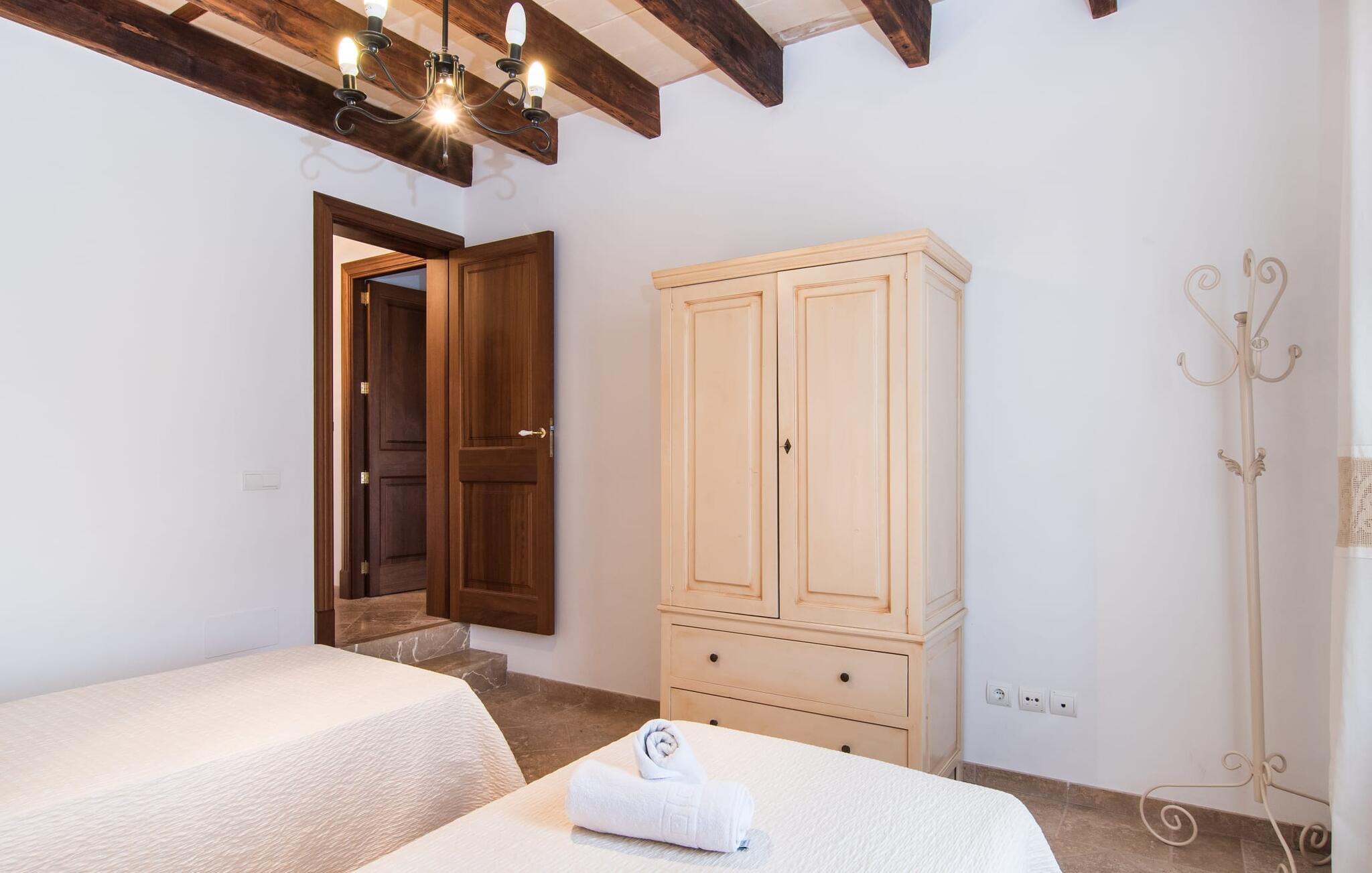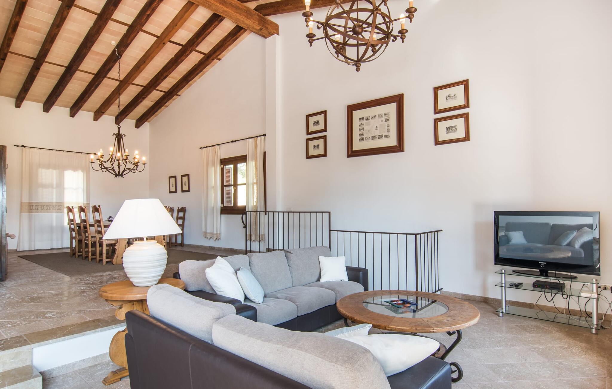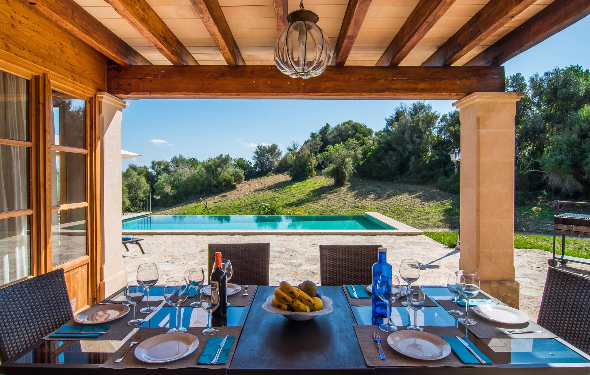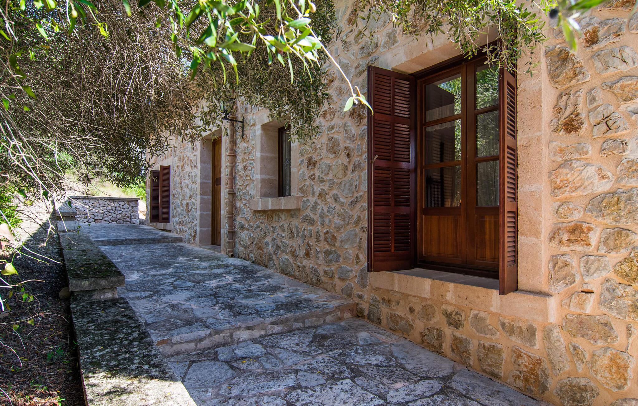 Den statelige naturstensvilla "Horlandis" ligger på en rummelig ejendom midt i de idylliske mallorcanske vidder. Omgivet af skove og marker er det det perfekte sted at slappe af og nyde freden og roen. Ejendommen kan slet ikke overses og tilbyder derfor ubegrænset privatliv. Beliggende i den rummelige naturstensterrasse lover den indbydende infinity-pool at køle af på varme dage og er samtidig stor nok til at svømme et par længder. Efter et hop i det forfriskende vand kan I finde jer tilpas på en af liggestolene omkring poolen og nyde jeres helt idylliske ferie. Hvis det bliver for varmt, finder I masser af skyggefulde pletter på den overdækkede terrasse lige ved siden af huset. Det er også et godt sted at starte dagen med en lækker morgenmad ved det store bord med udsigt over poolen og ejendommen, eller at nyde en skøn grillmiddag om aftenen med et lækkert glas vin og frisklavede delikatesser. Udendørsbelysningen skaber en varm atmosfære, selv når solen er gået ned. Udefra emmer villaen charmen af en rustik sommerhusejendom, som fortsætter inde i huset. Terrassen fører jer direkte til husets køkken. Ligesom mange værelser i villaen er den ekstremt rummelig og kombinerer mallorcansk tradition og moderne bekvemmeligheder. Udover en stor gaskomfur er der også et rummeligt køleskab med fryser og en opvaskemaskine, mens køkkenet i det hele taget er meget praktisk. Et rustikt spisebord og masser af siddepladser inviterer jer til at blive hængende. På samme etage finder I et badeværelse med bruser og toilet. En trappe fører til hjertet af villaen: en kæmpe stue-spisestue med meterhøjt til loftet. Villaens hovedindgang er også placeret her. De synlige tagbjælker i træ samt den rustikke indretning af høj kvalitet skaber en hyggelig atmosfære. Tilbring aftenen på sofaen eller spis ved langbordet med jeres familie og venner. Panoramaudsigten fra den enorme tagterrasse er simpelthen storslået. Tre af de fire soveværelser er også placeret på denne etage, alle med et helt igennem rustikt mallorcansk design. To af værelserne har klassiske himmelsenge i træ, der minder om svundne tider, men er nye og af højeste kvalitet. Et andet soveværelse huser to enkeltsenge. Den klassiske, elegante stil fortsætter også på badeværelserne. Der er to af dem på denne etage - hvoraf den ene er direkte tilgængelig fra et af dobbeltværelserne. På første sal er der endnu et soveværelse med eget badeværelse og stort badekar. Bag huset kan I se Ermita de Bonany hermitage, der ligger på toppen af Puig de Bonany - en 331 hektar stor naturpark. På grund af sin vidunderlige beliggenhed og udseende kaldes kirken også "Bjergkatedralen". Hvis I foretrækker at gå til stranden frem for kirken, er de nærmeste bugter cirka 23 km væk. Der er ingen cafeer eller restauranter på den hvide sandstrand i Torrent des Revellar, men der er uberørt natur. Takket være dens centrale beliggenhed i centrum af øen kan I nå adskillige byer og attraktioner på tværs af Mallorca på mindre end en time. Nabobyen Petra, som er bedst kendt for sine kvalitetsvine, kan nås i bil på kun 15 minutter. Derfra er der kun 15 minutter til smukke Sineu. Det siges at have det bedste farmers market på øen. Det finder sted hver onsdag i Den Gamle By og tiltrækker både lokale og turister i hobetal. Den statelige landvilla “Horlandis” med en kæmpe ejendom ligger helt stille og idyllisk i hjertet af øen. Herfra kan I nyde en vidunderlig panoramaudsigt over det mallorcanske landskab. I kan hurtigt gøre jeres indkøb i de nærliggende feriesteder Petra eller Vilafranca de Bonany, som ligger cirka 15 minutters kørsel fra ejendommen. Den hvide sandstrand Torrent des Revellar med dets utroligt klare vand ligger cirka 23 km væk.