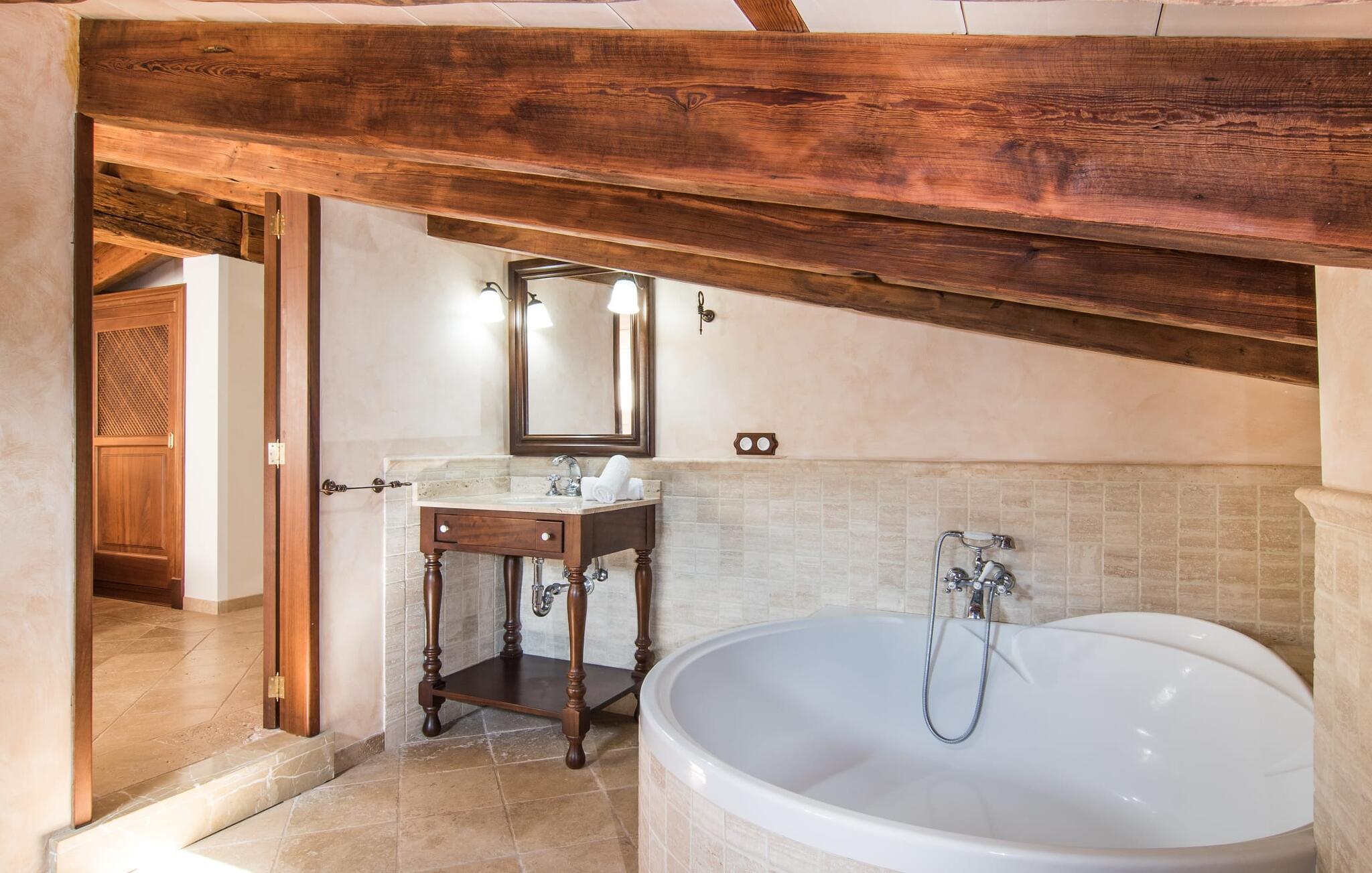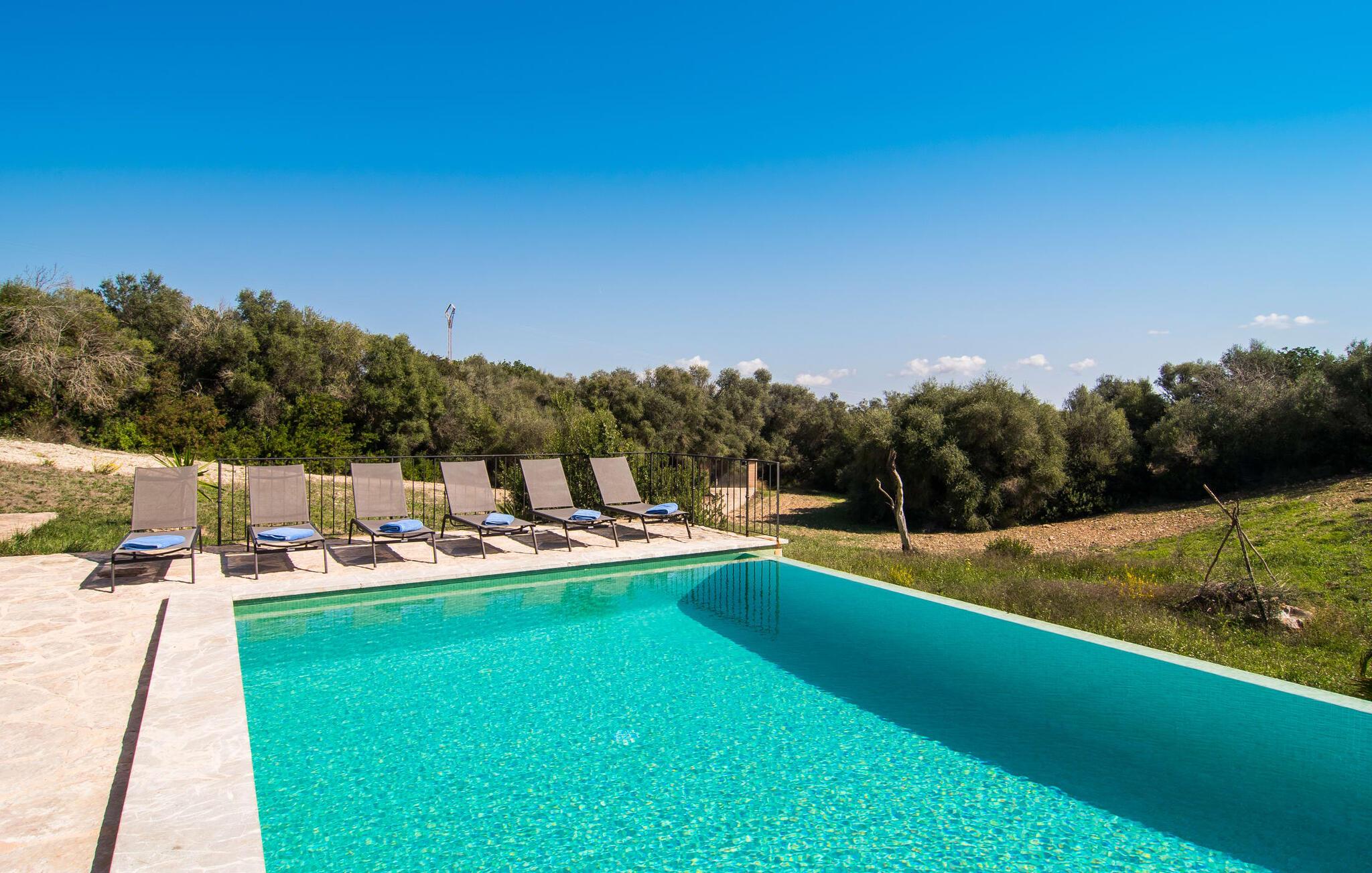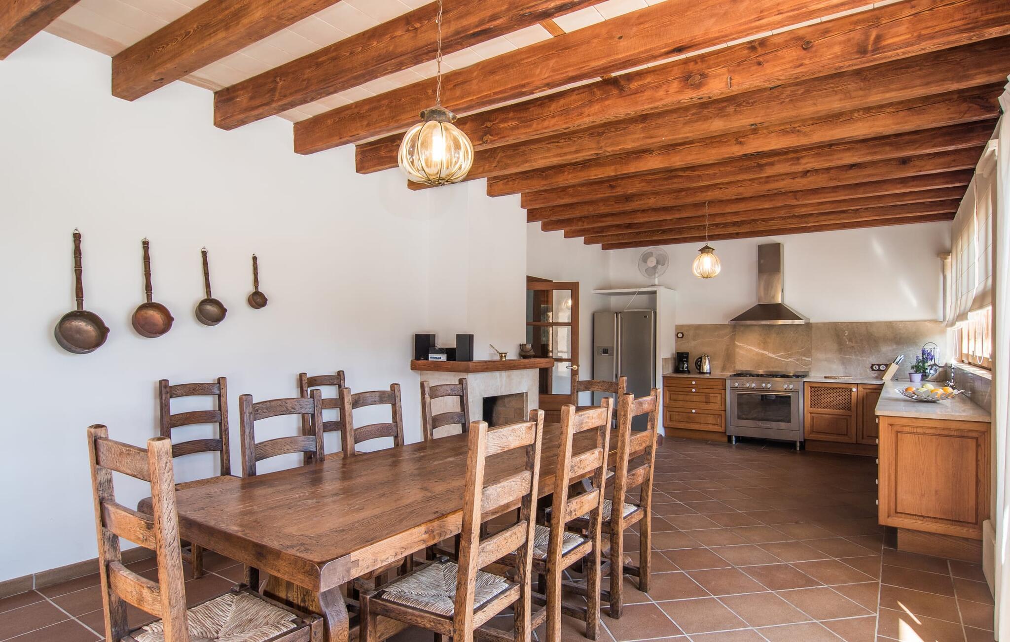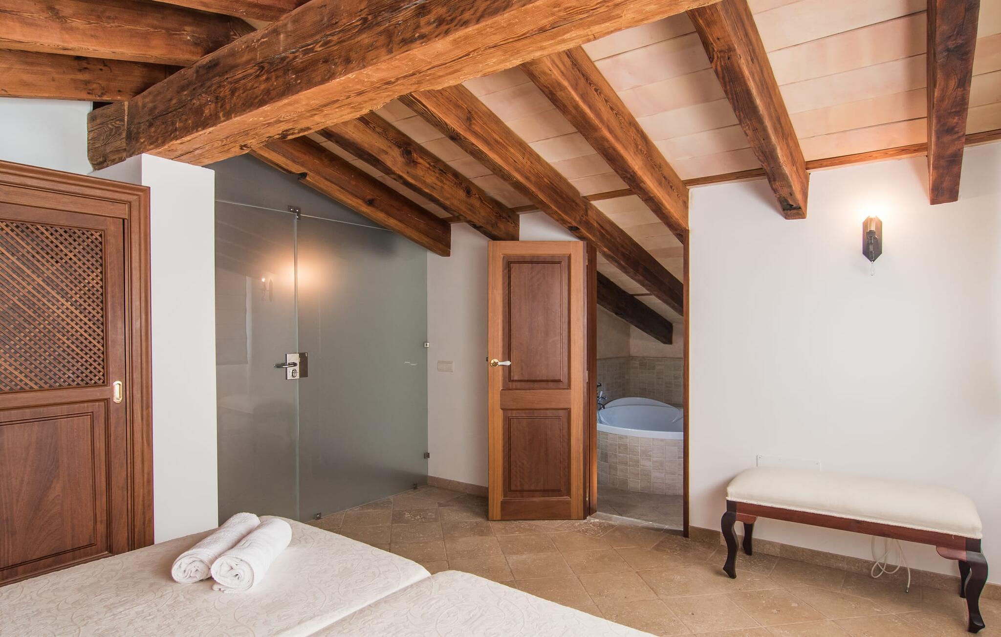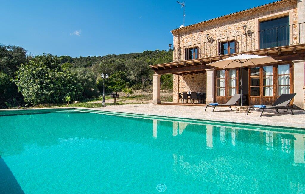 Den statelige naturstensvilla "Horlandis" ligger på en rummelig ejendom midt i de idylliske mallorcanske vidder. Omgivet af skove og marker er det det perfekte sted at slappe af og nyde freden og roen. Ejendommen kan slet ikke overses og tilbyder derfor ubegrænset privatliv. Beliggende i den rummelige naturstensterrasse lover den indbydende infinity-pool at køle af på varme dage og er samtidig stor nok til at svømme et par længder. Efter et hop i det forfriskende vand kan I finde jer tilpas på en af liggestolene omkring poolen og nyde jeres helt idylliske ferie. Hvis det bliver for varmt, finder I masser af skyggefulde pletter på den overdækkede terrasse lige ved siden af huset. Det er også et godt sted at starte dagen med en lækker morgenmad ved det store bord med udsigt over poolen og ejendommen, eller at nyde en skøn grillmiddag om aftenen med et lækkert glas vin og frisklavede delikatesser. Udendørsbelysningen skaber en varm atmosfære, selv når solen er gået ned. Udefra emmer villaen charmen af en rustik sommerhusejendom, som fortsætter inde i huset. Terrassen fører jer direkte til husets køkken. Ligesom mange værelser i villaen er den ekstremt rummelig og kombinerer mallorcansk tradition og moderne bekvemmeligheder. Udover en stor gaskomfur er der også et rummeligt køleskab med fryser og en opvaskemaskine, mens køkkenet i det hele taget er meget praktisk. Et rustikt spisebord og masser af siddepladser inviterer jer til at blive hængende. På samme etage finder I et badeværelse med bruser og toilet. En trappe fører til hjertet af villaen: en kæmpe stue-spisestue med meterhøjt til loftet. Villaens hovedindgang er også placeret her. De synlige tagbjælker i træ samt den rustikke indretning af høj kvalitet skaber en hyggelig atmosfære. Tilbring aftenen på sofaen eller spis ved langbordet med jeres familie og venner. Panoramaudsigten fra den enorme tagterrasse er simpelthen storslået. Tre af de fire soveværelser er også placeret på denne etage, alle med et helt igennem rustikt mallorcansk design. To af værelserne har klassiske himmelsenge i træ, der minder om svundne tider, men er nye og af højeste kvalitet. Et andet soveværelse huser to enkeltsenge. Den klassiske, elegante stil fortsætter også på badeværelserne. Der er to af dem på denne etage - hvoraf den ene er direkte tilgængelig fra et af dobbeltværelserne. På første sal er der endnu et soveværelse med eget badeværelse og stort badekar. Bag huset kan I se Ermita de Bonany hermitage, der ligger på toppen af Puig de Bonany - en 331 hektar stor naturpark. På grund af sin vidunderlige beliggenhed og udseende kaldes kirken også "Bjergkatedralen". Hvis I foretrækker at gå til stranden frem for kirken, er de nærmeste bugter cirka 23 km væk. Der er ingen cafeer eller restauranter på den hvide sandstrand i Torrent des Revellar, men der er uberørt natur. Takket være dens centrale beliggenhed i centrum af øen kan I nå adskillige byer og attraktioner på tværs af Mallorca på mindre end en time. Nabobyen Petra, som er bedst kendt for sine kvalitetsvine, kan nås i bil på kun 15 minutter. Derfra er der kun 15 minutter til smukke Sineu. Det siges at have det bedste farmers market på øen. Det finder sted hver onsdag i Den Gamle By og tiltrækker både lokale og turister i hobetal. Den statelige landvilla “Horlandis” med en kæmpe ejendom ligger helt stille og idyllisk i hjertet af øen. Herfra kan I nyde en vidunderlig panoramaudsigt over det mallorcanske landskab. I kan hurtigt gøre jeres indkøb i de nærliggende feriesteder Petra eller Vilafranca de Bonany, som ligger cirka 15 minutters kørsel fra ejendommen. Den hvide sandstrand Torrent des Revellar med dets utroligt klare vand ligger cirka 23 km væk.