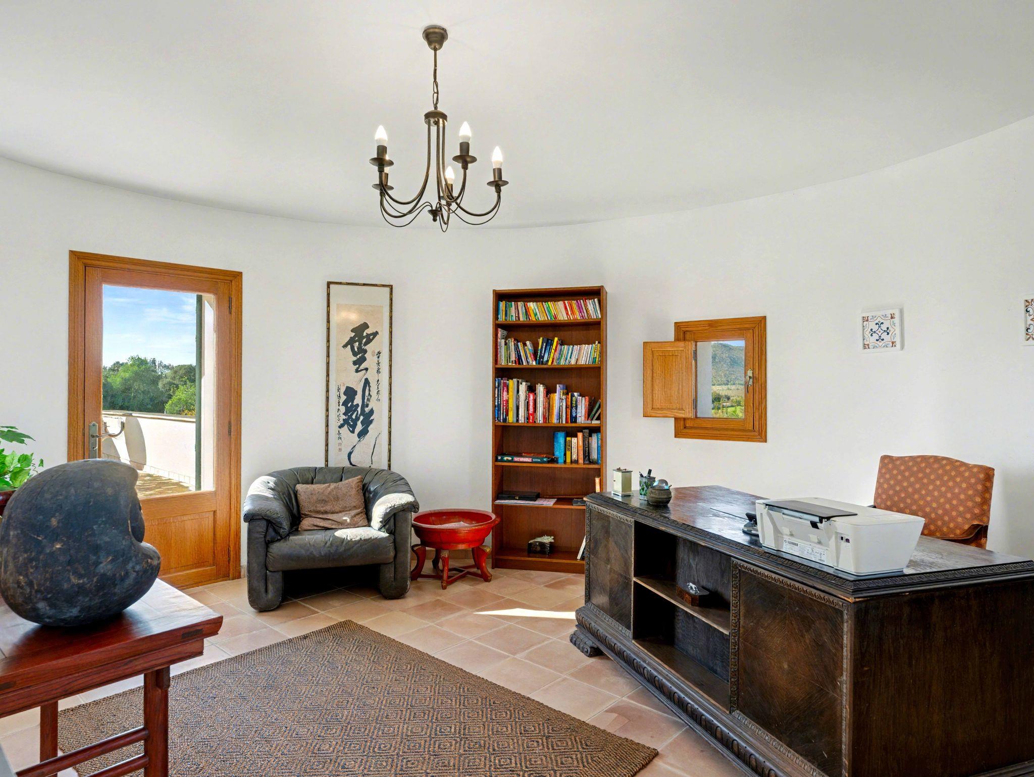 Ein besonderes Highlight ist der Turm, erreichbar über eine elegante Wendeltreppe. Dieser Raum eignet sich ideal als Leseecke oder ruhiges Homeoffice. Von der angrenzenden Dachterrasse genießen Sie einen traumhaften Panoramablick über die mallorquinische Landschaft.