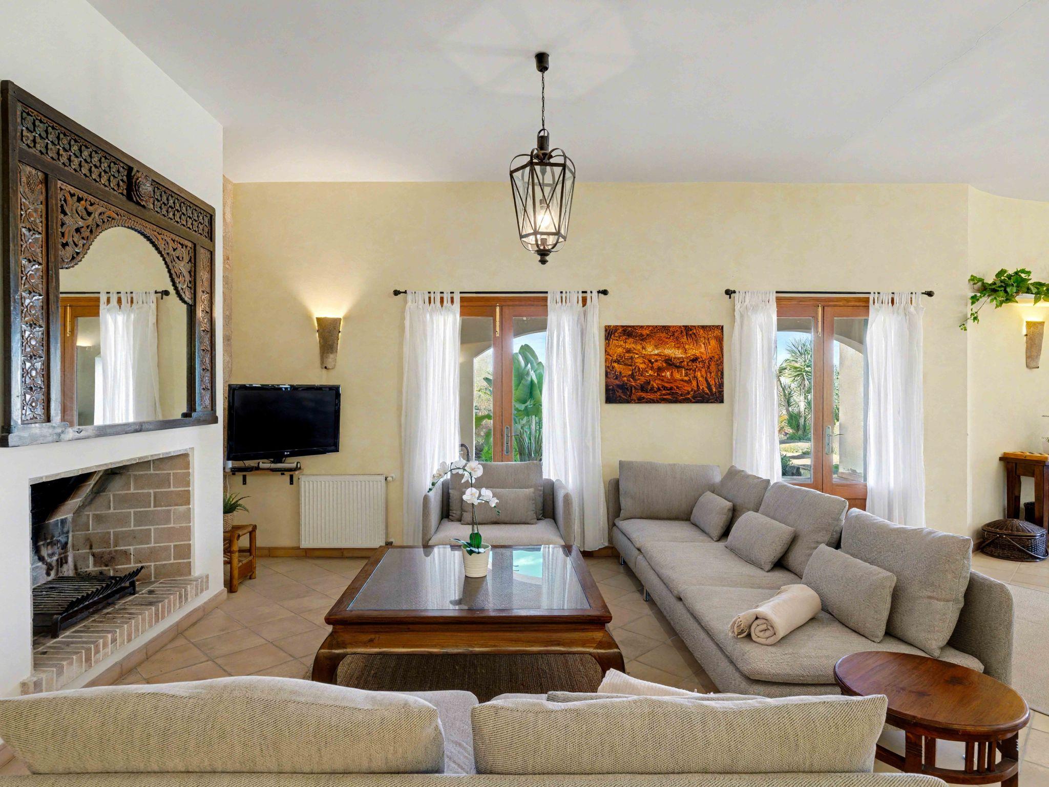 Der liebevoll gestaltete Außenbereich ist ein echtes Highlight. Die große, flache Infinity-Poolanlage lädt zum Entspannen ein und wird von einer großzügigen Terrasse mit Natursteinmauer umrahmt. Direkt am Haus befindet sich eine überdachte Terrasse mit gemütlichem Essbereich und mobiler Gasgrill, ideal für gemeinsame Mahlzeiten im Freien. Von hier genießen Sie den Blick auf den gepflegten mediterranen Garten und die umliegende Landschaft ? perfekt für romantische Abende bei Kerzenschein.