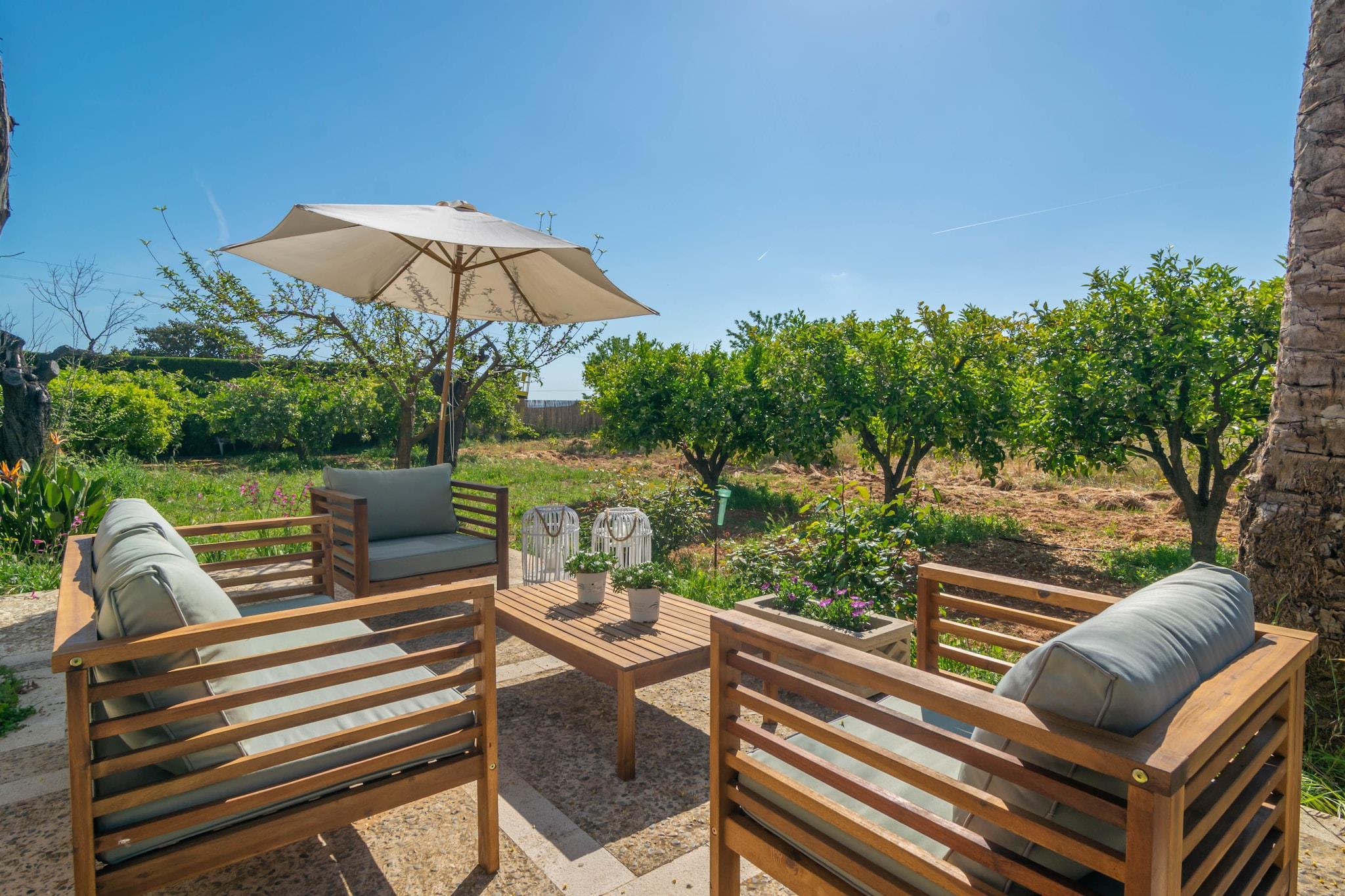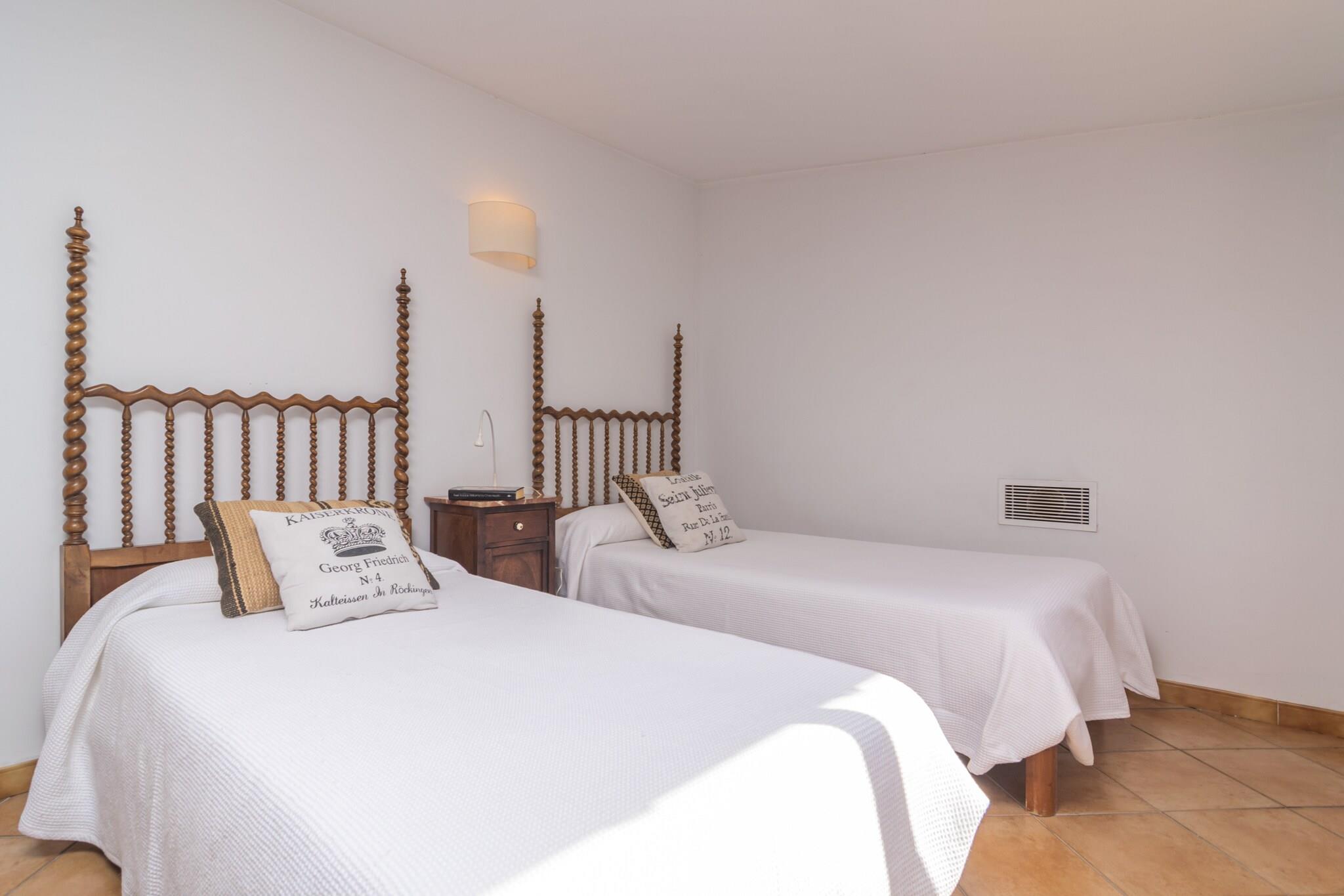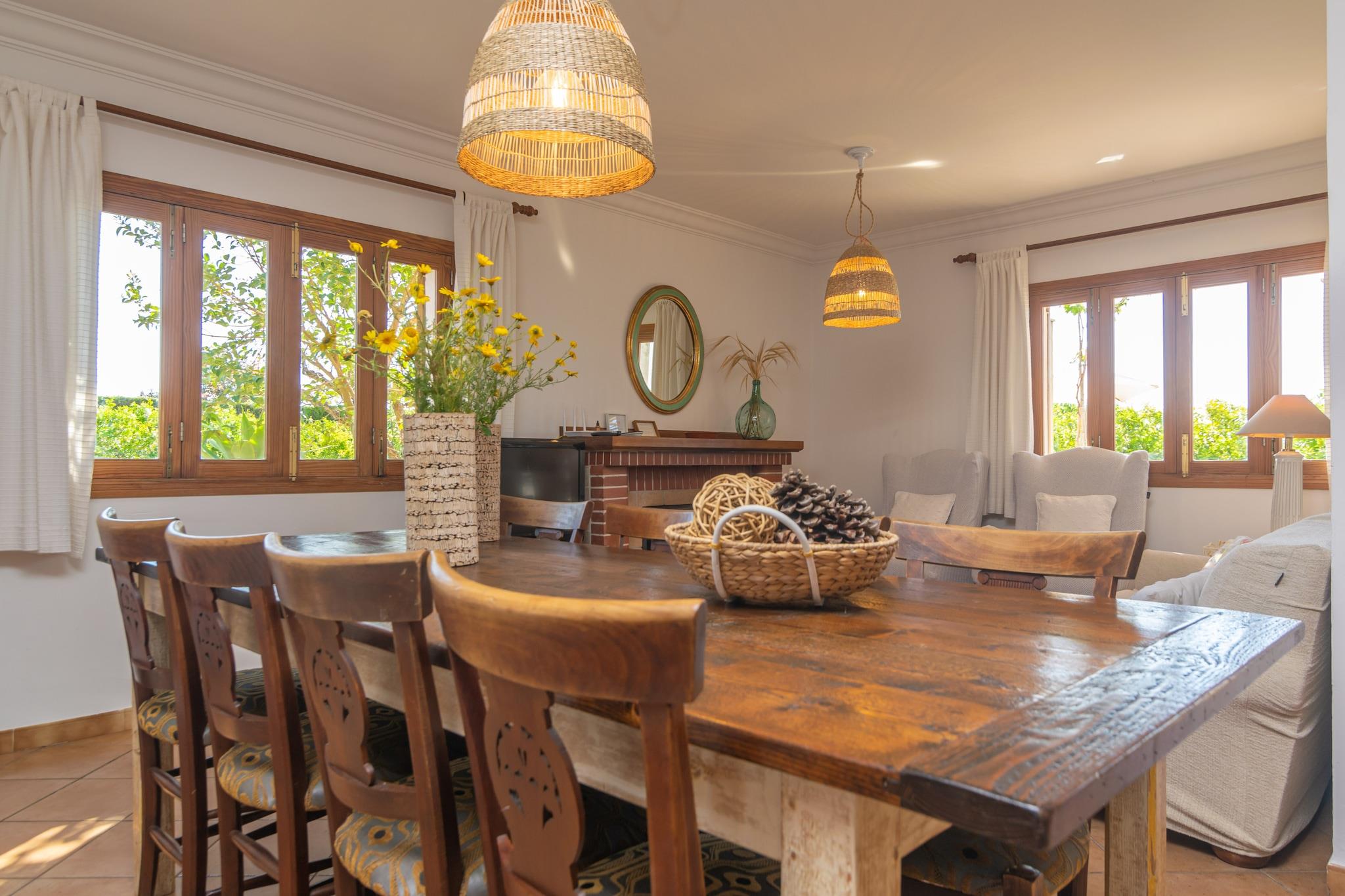 Fredeligt landligt tilbagetog Denne charmerende villa inviterer til afslapning midt i de rolige marker omkring ejendommen. Det ydre er designet til nydelse og byder på en naturlig dam med fisk, en møbleret terrasse med grill og en terrasse foran med liggestole og borde, hvor du kan nyde alfresco-måltider eller morgenkaffe. Villaen er indhegnet og tilbyder privatliv, mens den forbliver en del af et indbydende kvarter. Komfortable opholdsrum Indenfor strækker villaen sig over to etager med en rummelig stue/spisestue udstyret med aircondition og satellit-tv, ideel til familiesammenkomster. Det uafhængige køkken har gaskomfur, ovn og traditionel mallorcansk stil. Tre soveværelser rummer gæster komfortabelt: en dobbelt og en enkelt på stueetagen, og to singler ovenpå med et lille opholdsområde. To badeværelser med bruser, en vaskemaskine, strygejern og strygebræt fuldender de praktiske faciliteter. En vugge og høj stol er til rådighed for små børn. Ideel Ø-beliggenhed Villaen ligger kun 1,3 km fra Incas centrum og giver nem adgang til butikker, barer, restauranter og supermarkeder. Udforsk det historiske torsdagsmarked for lokale produkter, eller tag til nærliggende strande som Playa de Muro (27,3 km) med fint sand og krystalklart vand. Golfentusiaster kan nå Golf Alcanada på 29,5 km, og øens hovedattraktioner er alle inden for rimelig køreafstand. Bemærk: Gæster under 30 skal være ledsaget af familie. Kæledyr er ikke tilladt, og arrangementer er forbudt.