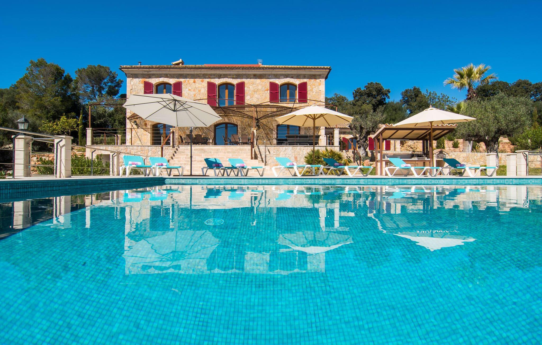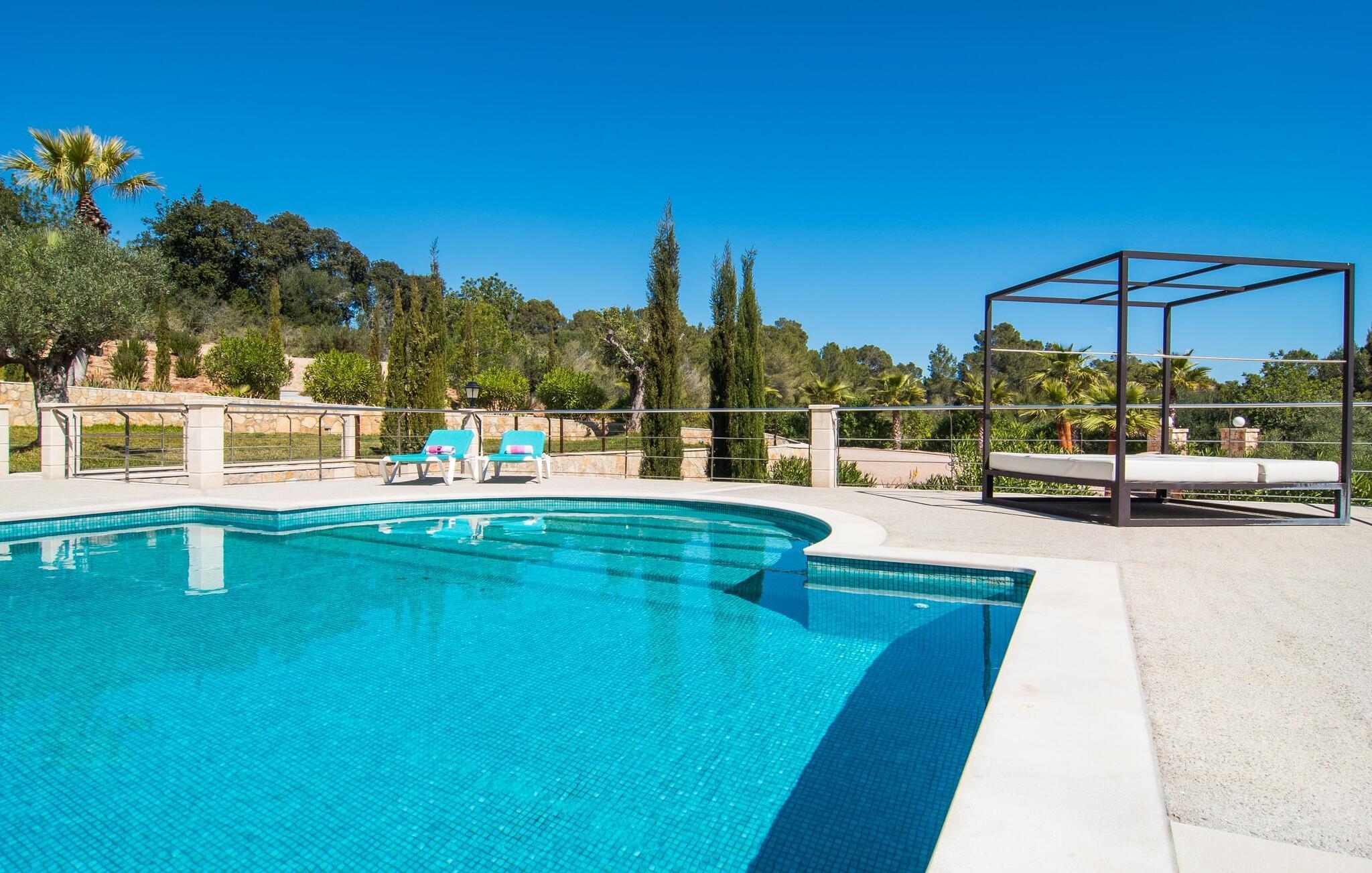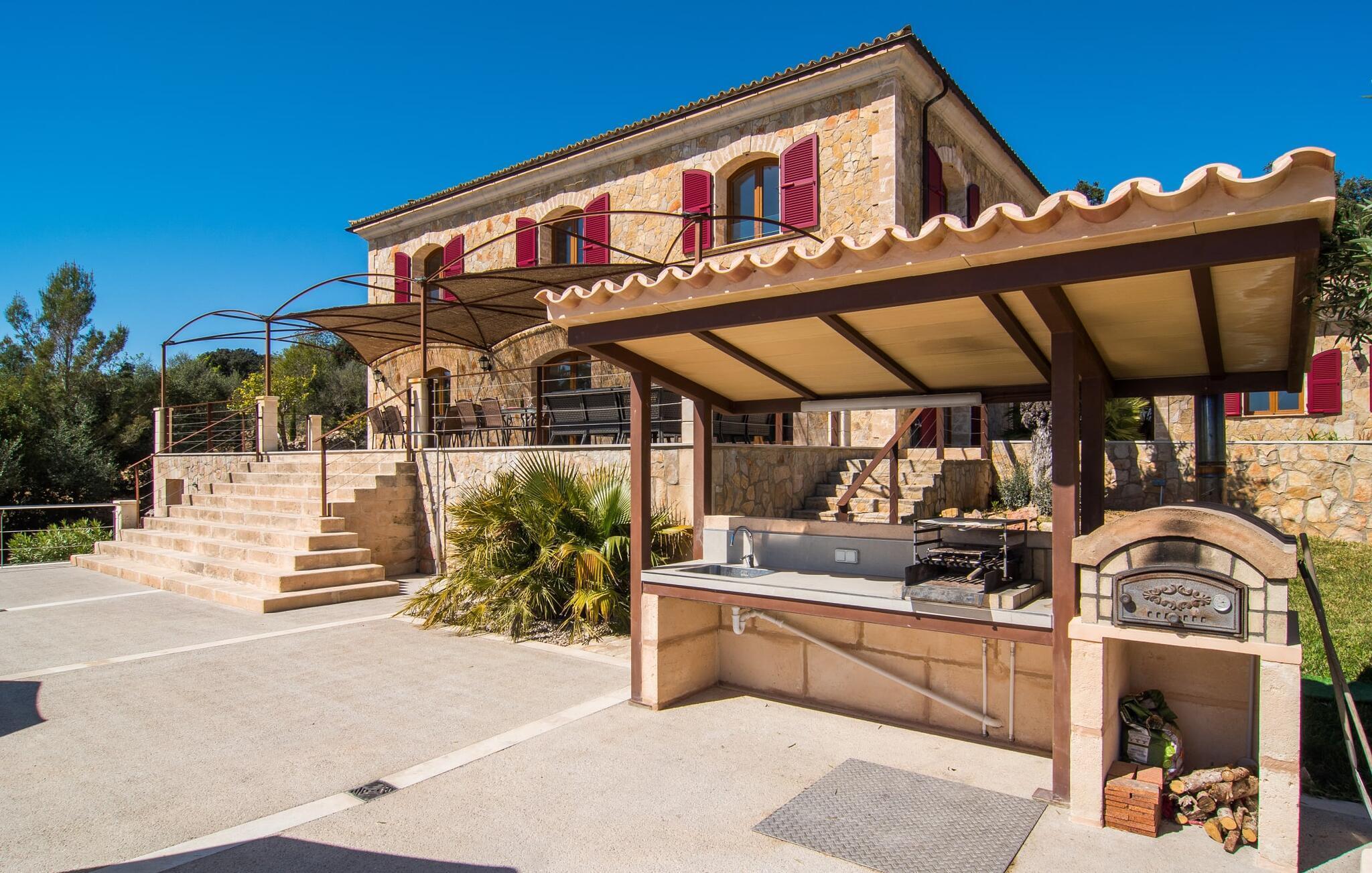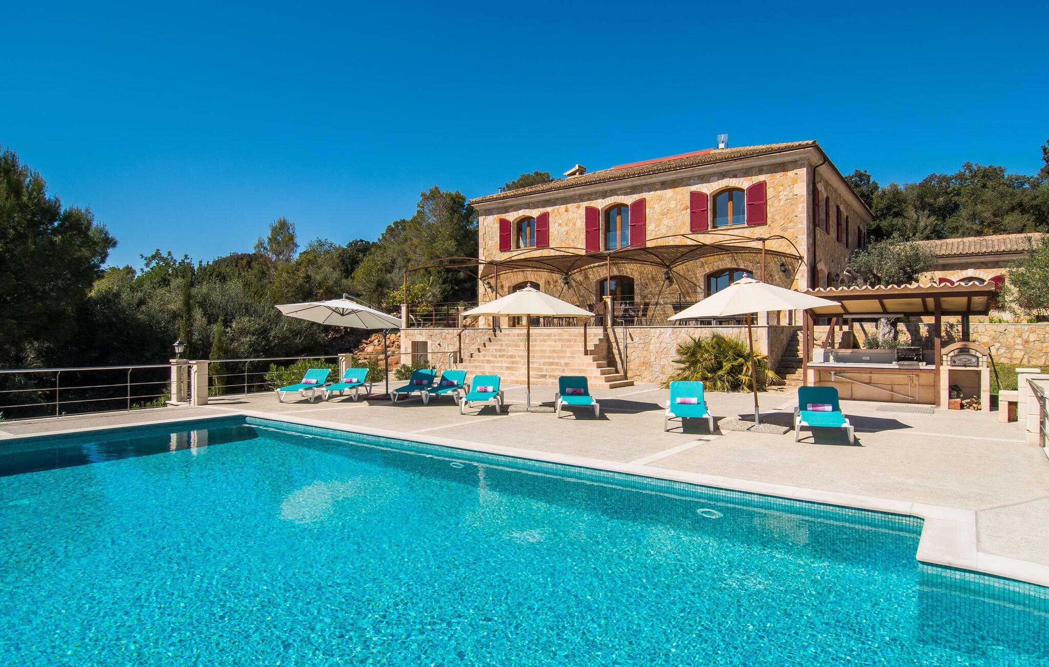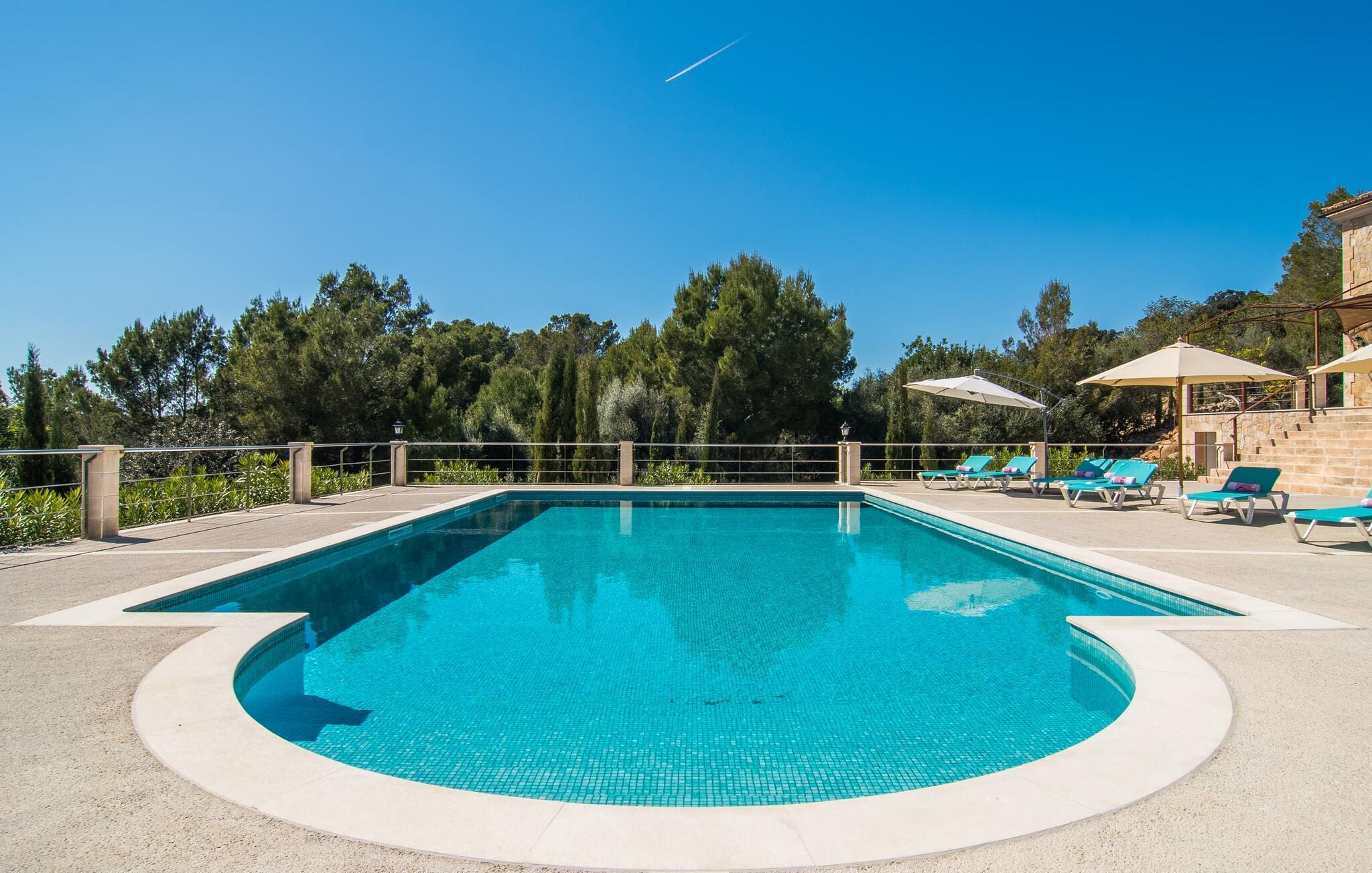 Velkommen til dit udsøgte feriehus, Villa "Inka" - beliggende på det sydlige Mallorca i den lille kommune Porreres. Denne sublime, okkerfarvede juvel rejser sig over 28.000 m² af næsten uberørt natur, som var den hugget i sten. Den rummelige ejendom med en parklignende have byder på plads nok til store familier og rejsegrupper. En stærk træbestand, frodige palmer og store grønne græsplæner pryder ejendommen - Moder Natur var meget generøs her. At kigge ind i den tilsyneladende uendelige afstand tillader dine tanker at vandre, og du glemmer alt, jeg mener alt, omkring dig - tro modtoet: fri hverdag, ferie på! Du krydser indgangen til villaen via en landevej typisk for Mallorca og parkerer på grusparkeringspladsen, som har ti parkeringspladser. Nu er det tid til at komme ind! Når du er ankommet, giver den overdækkede terrasse med en enestående udsigt over poolen skygge til dine daglige samvær og grill - og der er endda en pizzaovn i udekøkkenet! Få skridt fra den smukke villa tager dig direkte til den azurblå pool med panoramaudsigt, som allerede venter dig under den mallorcanske sol. Omkring poolen inviterer komfortable liggestole og en udendørs dagseng af høj kvalitet dig til at tage en eftermiddagslur eller læse din yndlingsbog. Majestætisk boligareal på utrolige 600 m². De store vinduer, nogle med smukke røde skodder, tjener som privatliv og solafskærmning og dekorerer den detaljerede udvendige facade. Den harmonisk koordinerede farvepalet fra sand til røde toner løber gennem villaens elegante interiør. På øverste etage er der fem lyse og klimatiserede soveoaser, hver med en dobbeltseng. Elegante stoffer omslutter dit himmelske soveområde og garanterer søde drømme og afslappende søvn. Udover tv, loftsventilatorer og luksuriøse badeværelser kan du nyde komfort i topklasse. Det sjette soveværelse med en luksuriøs dobbeltseng (1,40 x 1,90 m) og et tilstødende badeværelse er i stueetagen. Hvert soveværelse har nok opbevaringsplads til dine ejendele, og du kan trygt opbevare dine værdigenstande i pengeskabet. Den storslåede og førsteklasses stue-spisestue udgør hjertet i drømmevillaen. Det er her I mødes og har sjove stunder som en stor gruppe eller familie. Det rustikke chikke i det luksuriøse lædersofa- og lænestollandskab af høj kvalitet er bevis på perfekt smag med en garanteret feel-good atmosfære. Det kolde-varme klimaanlæg garanterer en perfekt rumtemperatur. Det åbne luksuskøkken med kogeø byder på scene til show cooking. Alle kan frit vælge deres plads på de elegante barstole eller ved det lange spisebord. Villaen "Inka" har endnu flere ekstraudstyr i vente til dig: Det absolutte højdepunkt er det separate, moderne billardrum. Elsker du lidt mere action? Hvert spil ved bordfodboldbordet gør dig i godt humør og har en masse sjov. Hvis du kan lide at holde dig i form med fitnessudstyr, kan du gøre det i fitnessrummet. Om tirsdagen kan du køre til det ugentlige marked i den rolige by Porreres via den nærliggende landevej, som let kan høres afhængig af vindforholdene. Du kan finde alt her: solmodnet frugt og grønt, god vin, men også husholdningsartikler og tøj. Oplev markedets travlhed i de små gader og nyd de lokales varme gæstfrihed på de mange restauranter og caféer. Turistattraktioner, der er værd at se, omfatter sognekirken Senyora de Cosolació, bygget i det 17. århundrede, og Santuari di Monti-Sion-klosteret, omkring 4 km væk. Du kan nå klosteret til fods eller i bil. Der kan du få en uforglemmelig udsigt over øen. Og vi har også noget at byde på til alle dem, der elsker havet – nemlig en anbefaling til en forlænget strandtur. Du vil hurtigt finde lettelse: mange smukke strande kan nås på cirka 10 minutter. 20 minutter i bil. Den fantastiske villa "Inka" med pool er beliggende i den sydlige del af Mallorca - i den rolige kommune Porreres. Ejendommen strækker sig over hele 28.000 m² med panoramaudsigt over det idylliske landskab. Landevejen fører dig direkte til det ugentlige marked i Porreres, supermarkeder er i umiddelbar nærhed og de smukkeste strande på denne populære ø kan nås på cirka 10 minutter. 20 minutter i bil. Dette er et Fincallorca feriehus.