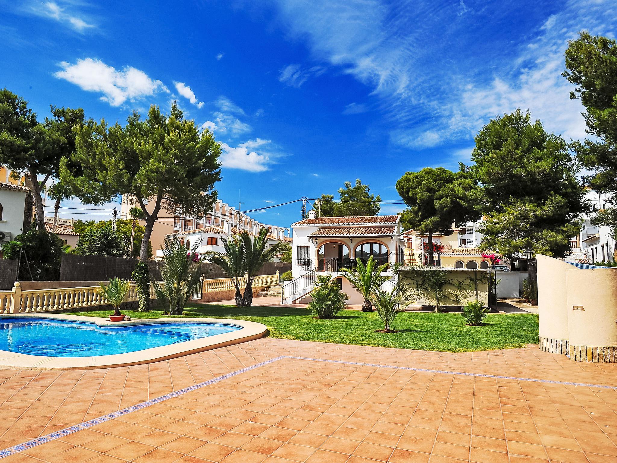 House "Patrai". In the district of Montañar II, in a quiet, sunny position, 200 m from the sea, in a cul-de-sac. Private: garden 1'000 m2 with lawn, swimming pool (5 x 9 m, seasonal availability: 01.Jan. - 31.Dec.) with internal staircase. Outdoor shower. Shop, supermarket, restaurant 900 m, bus stop 1 km, sandy beach "Arenal" 900 m, shingle beach "Caleta" 200 m. The owner does not accept any youth groups. Neighbourhood highly sensitive to noise. Quietness and good behaviour expected.