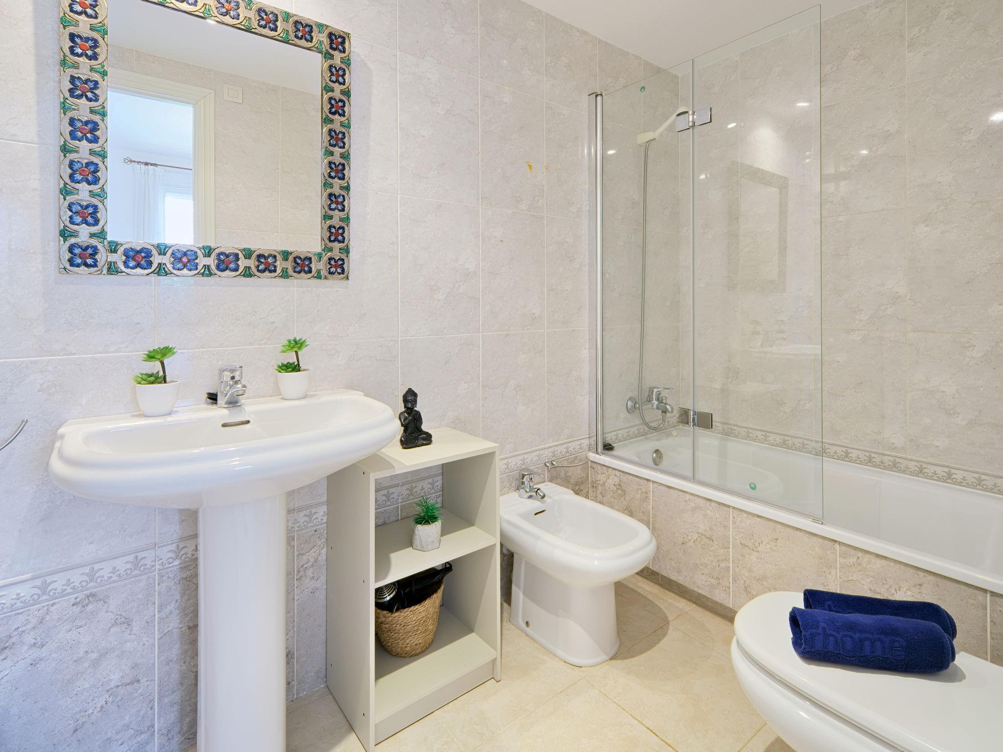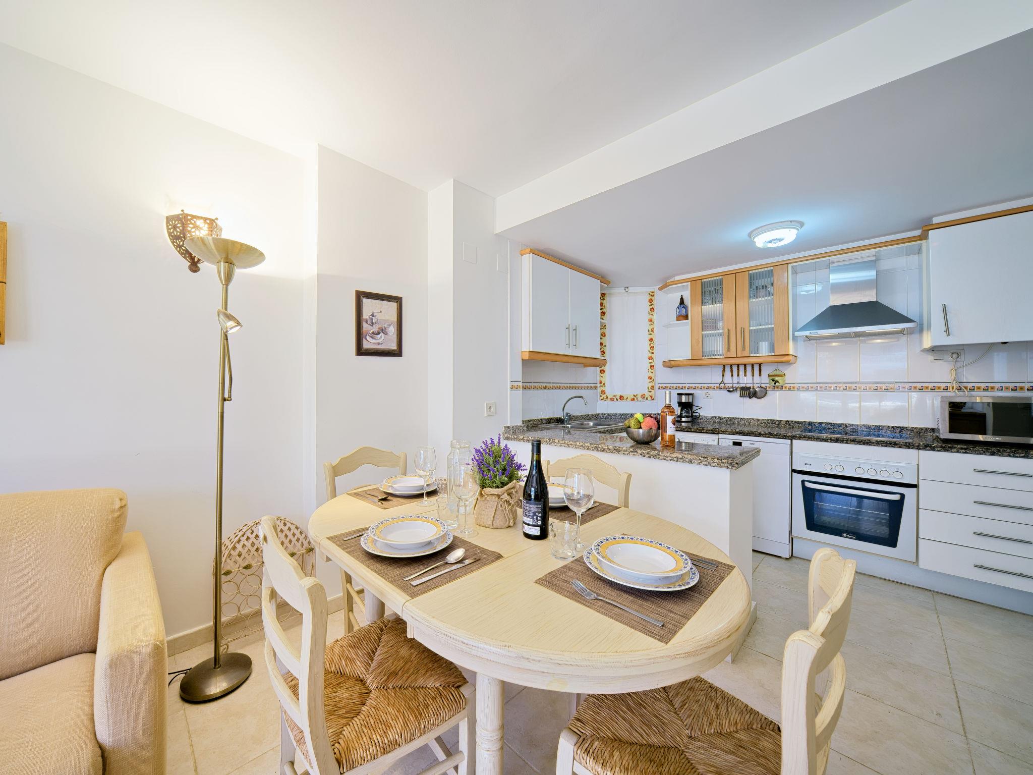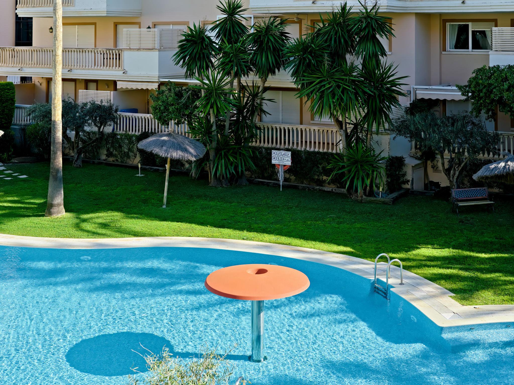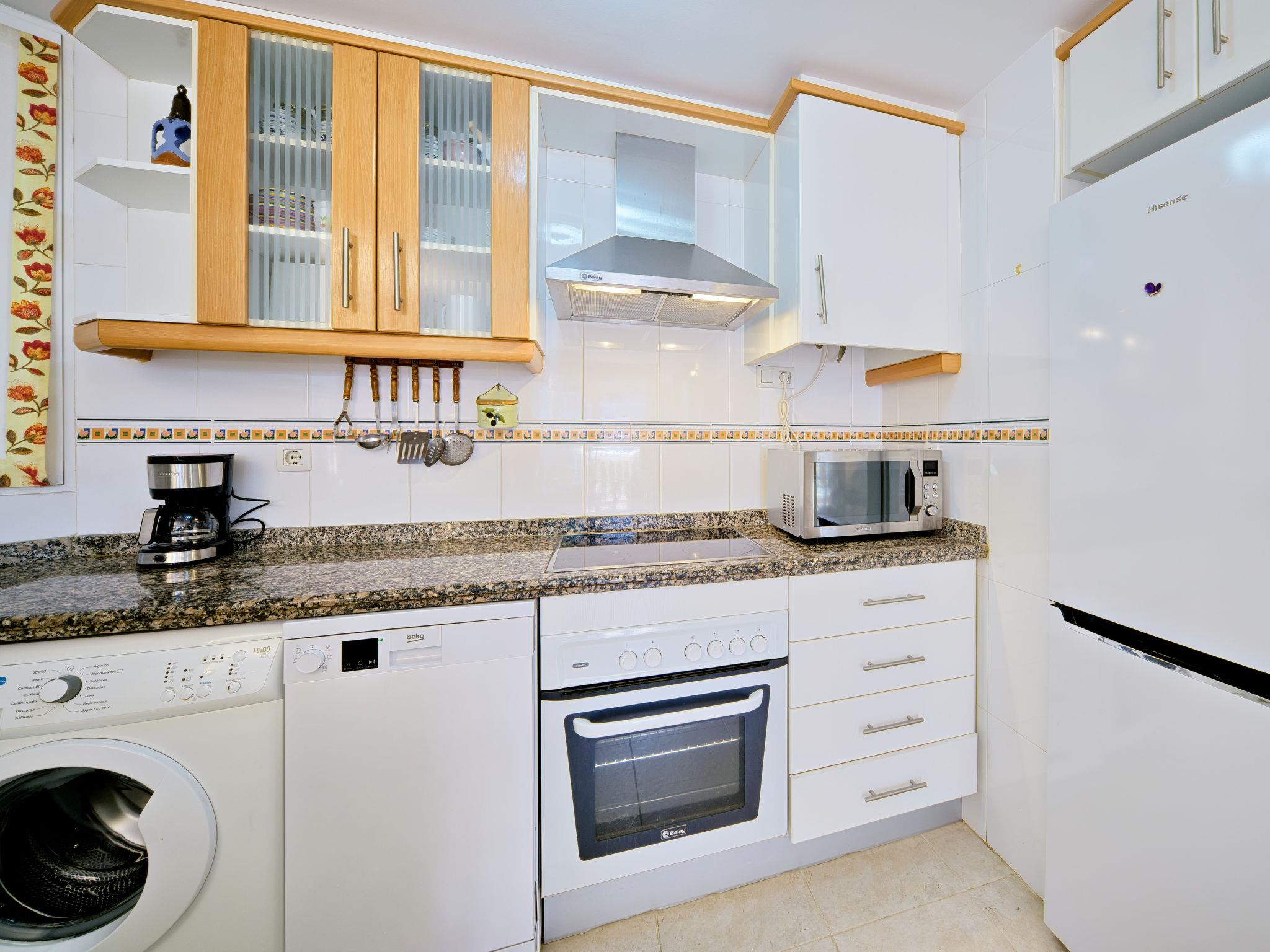 "Nou Fontana", 3-room apartment 60 m2. Comfortable and stylish furnishings: living/dining room with digital TV, air conditioning and forced-air heating. Exit to the terrace. 1 room with 1 french bed (150 cm, length 200 cm), bath/bidet/WC, air conditioning and forced-air heating. 1 room with 1 x 2 bunk beds (80 cm, length 190 cm). Open kitchen (dishwasher, 4 ceramic glass hob hotplates, toaster, kettle, microwave, freezer, electric coffee machine). Shower/WC. Large terrace 12 m2. Terrace furniture. View of the swimming pool and the garden. Facilities: washing machine, iron, hair dryer. Internet (WiFi, free). Parking space n 29 (roofed, fenced 1 car). Please note: TV only ES. VT-512940-A // Reg. Nr.: ESFCTU00000307100048420300000000000000000VT-512940-A4
