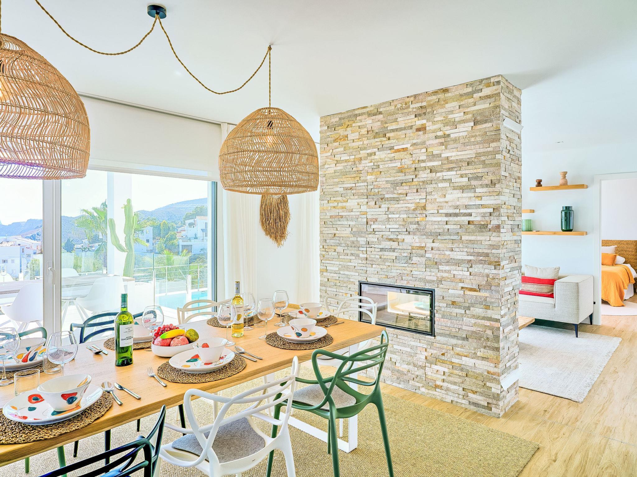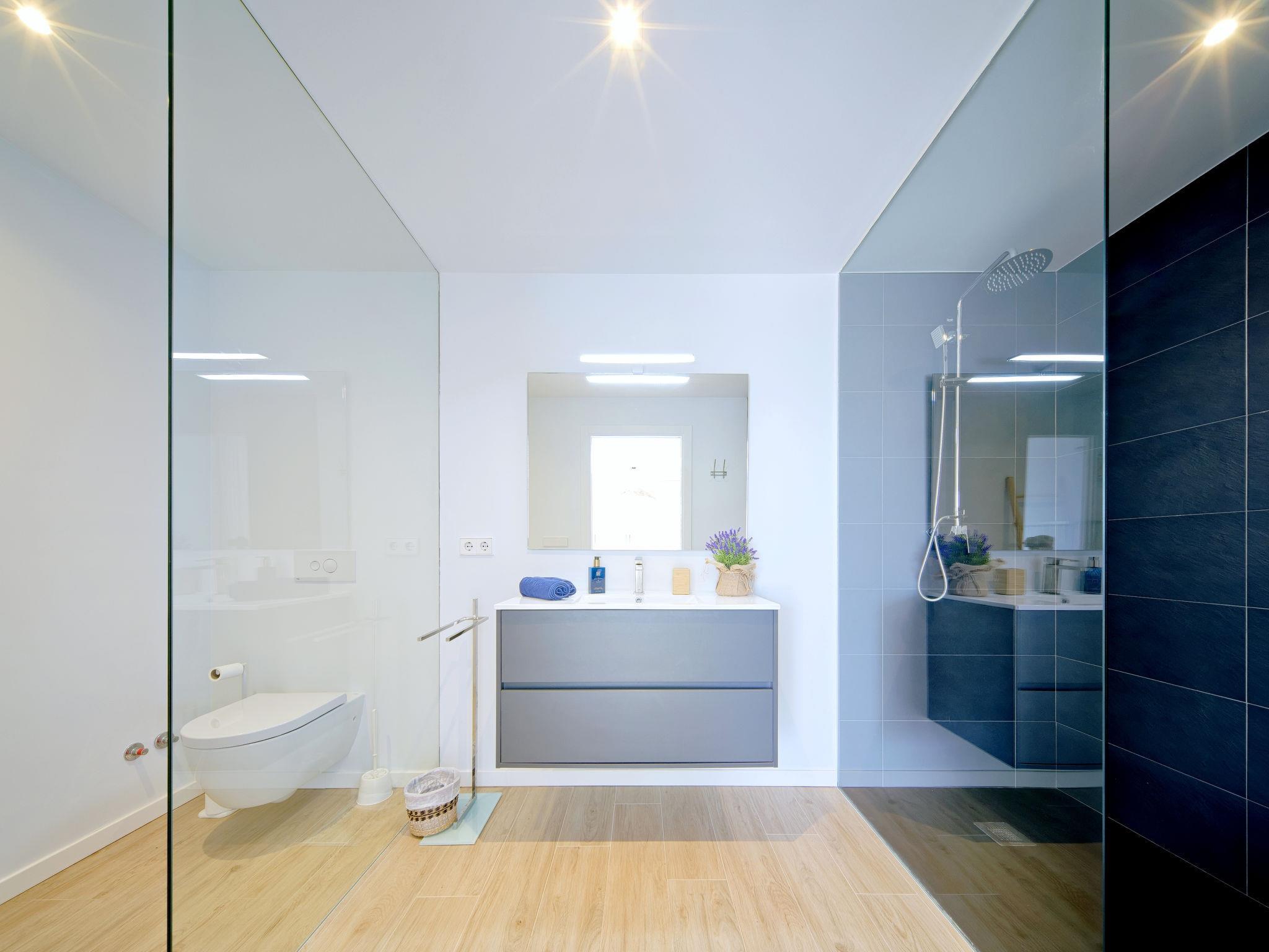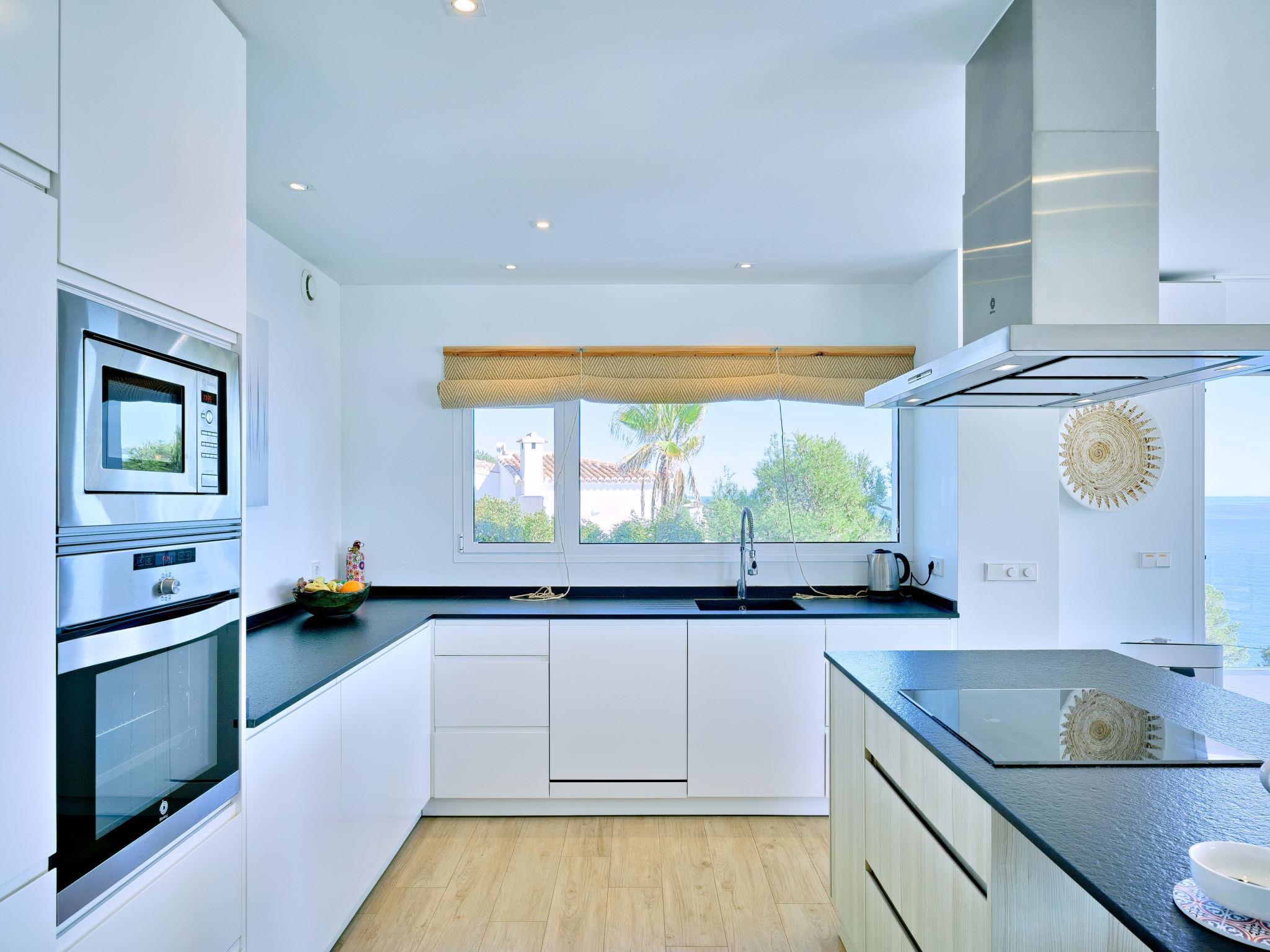 Very large, very modern, luxurious villa "Ola", 2 storeys. In the district of La Marina, in a quiet, sunny position, 300 m from the sea, 3 km from the beach. Private: large, beautiful, well-kept terraced garden, swimming pool angular (10 x 5 m, depth 160 - 160 cm, seasonal availability: 01.Jan. - 31.Dec.) with internal staircase. Outdoor shower, garden furniture, barbecue. Steep motor access. Stepped path to the house. Parking. Supermarket 1.7 km, restaurant 850 m, bus stop 6 m, sandy beach "El Arenal" 6 km, shingle beach "La Granadella" 3 km, rocky beach "Portitxol" 4 km. Surf school 3 km, sailing school 3 km, tennis 1.7 km. Please note: not suitable for small children. The owner does not accept any youth groups.