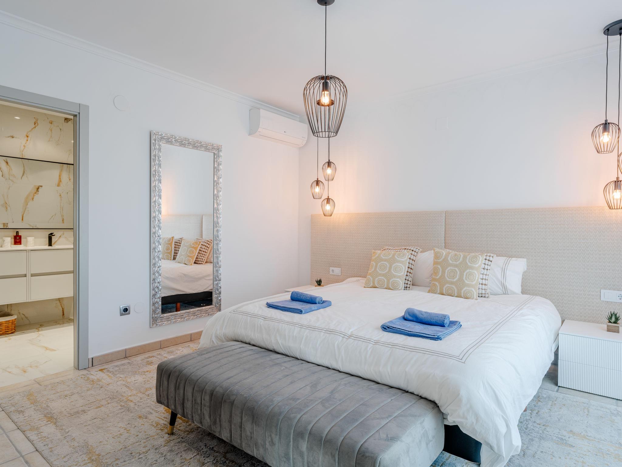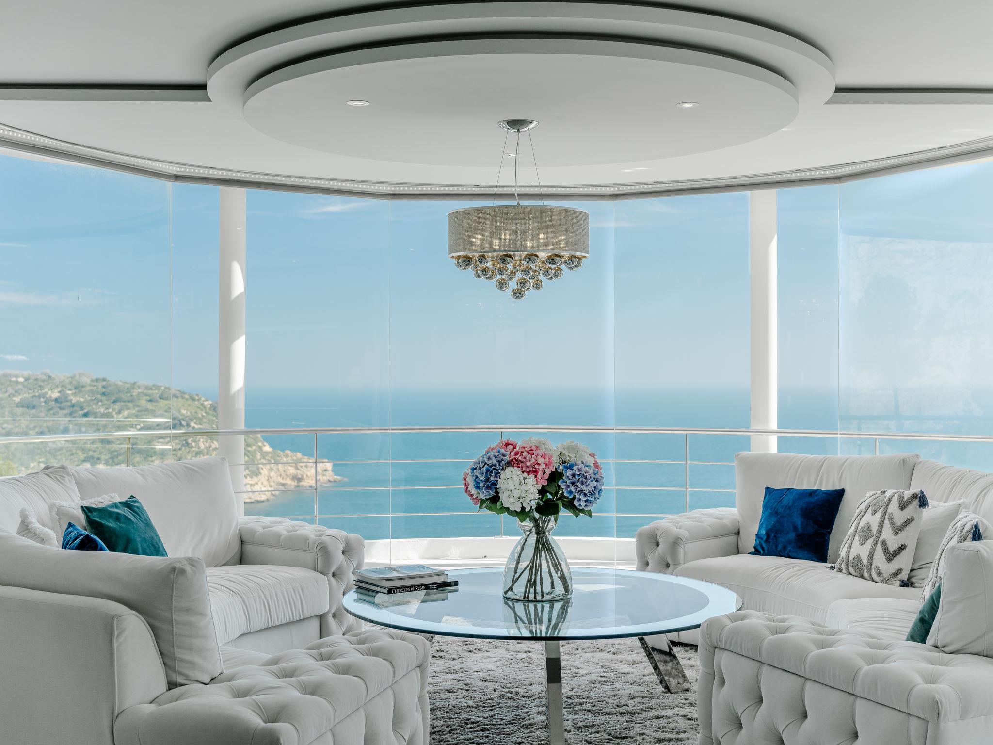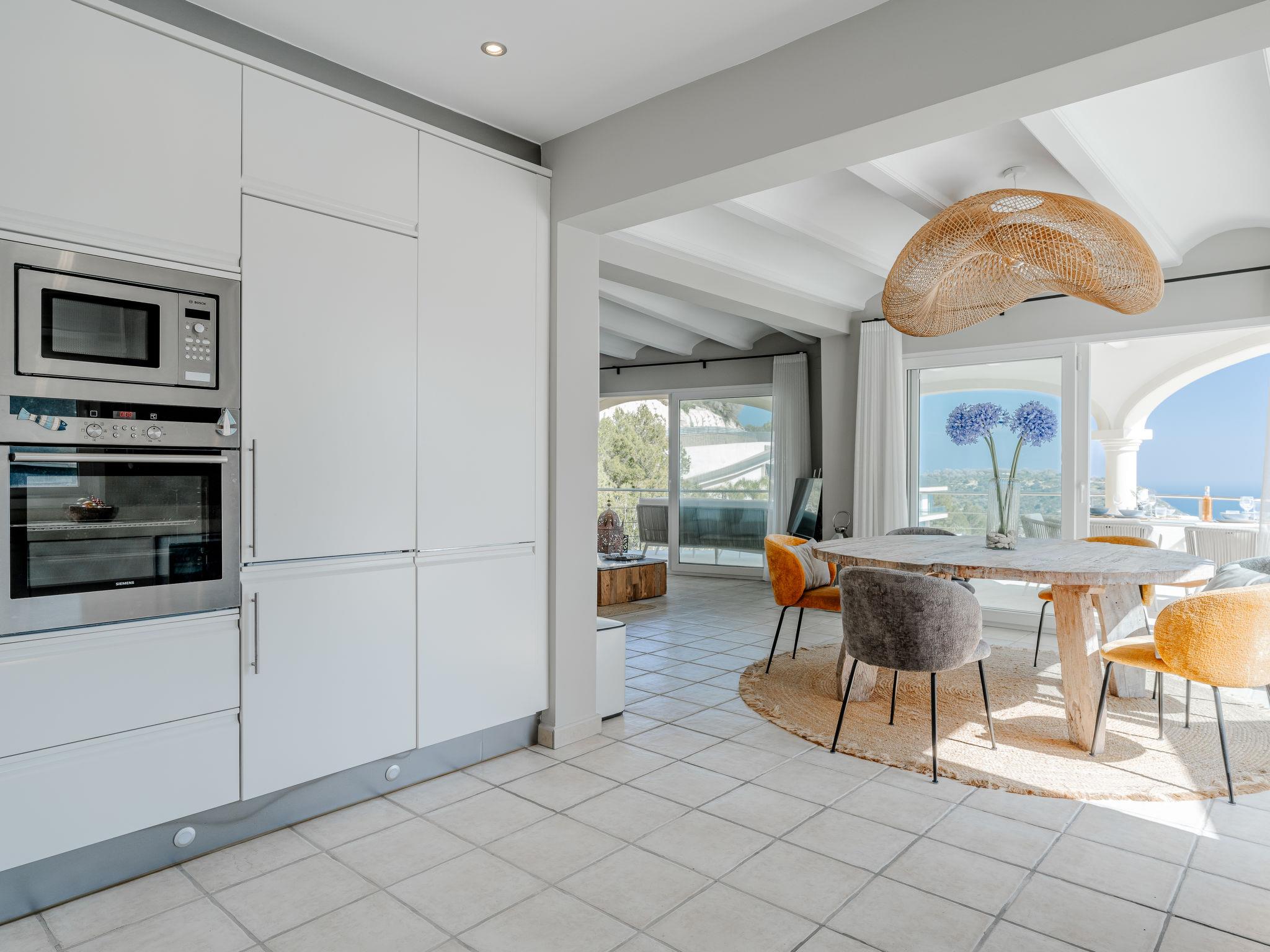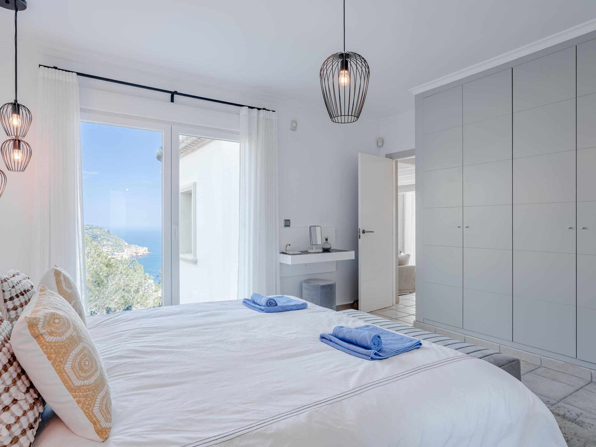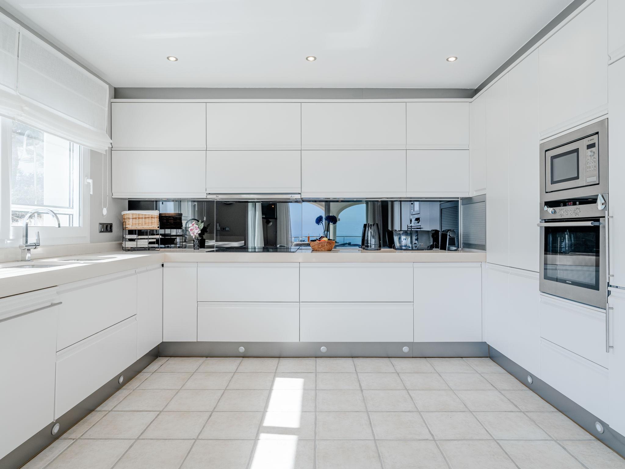 "Villa Tintorera Mar Azul", 6-room villa 300 m2 on 3 levels. Spacious and bright, renovated, very beautiful and stylish furnishings: living/dining room with satellite TV, air conditioning and forced-air heating. Exit to the terrace, to the swimming pool. 1 room with 1 french bed (200 cm, length 200 cm), bath/shower/WC, double hand-basin, air conditioning and forced-air heating. Exit to the terrace. Large, open kitchen (oven, dishwasher, 4 induction hot plates, toaster, kettle, microwave, freezer, electric coffee machine). Sep. WC. On the lower ground floor: living room with air conditioning and forced-air heating. 1 room with 1 french bed (200 cm, length 200 cm), bath/shower/WC, air conditioning and forced-air heating. Shower/WC. Upper floor: living room with satellite TV, air conditioning and forced-air heating. Exit to the terrace. 1 room with 1 french bed (180 cm, length 200 cm), bath/WC, air conditioning and forced-air heating. 1 room with 1 french bed (180 cm, length 200 cm), bath/WC, air conditioning and forced-air heating. 2 large terraces. Terrace furniture, barbecue, covered balcony, sitting area. Marvellous panoramic view of the sea and the valley. Facilities: washing machine, dryer, iron, mosquito net, children's high chair, baby cot, hair dryer. Internet (WiFi, free). Parking. Not suitable for small children. CV-VUT0520549-A // Reg. Nr.: ESFCTU0000030710004370560000000000000CV-VUT0520549-A2