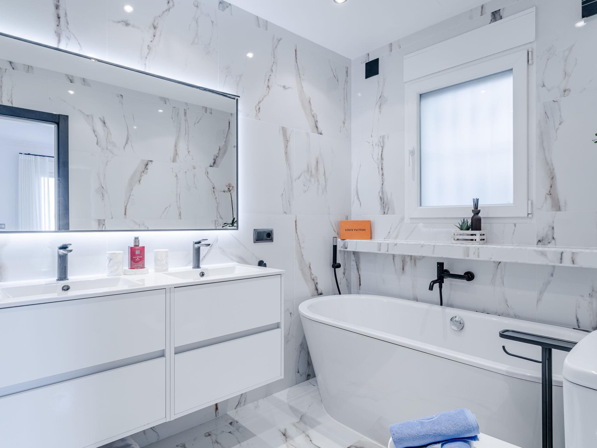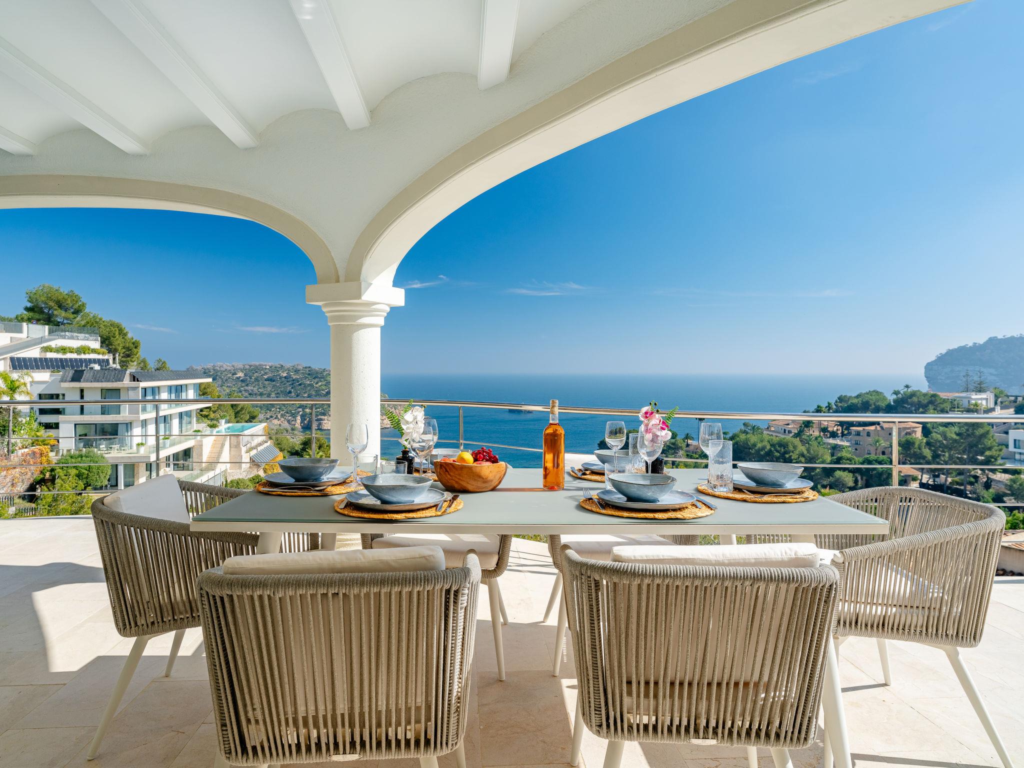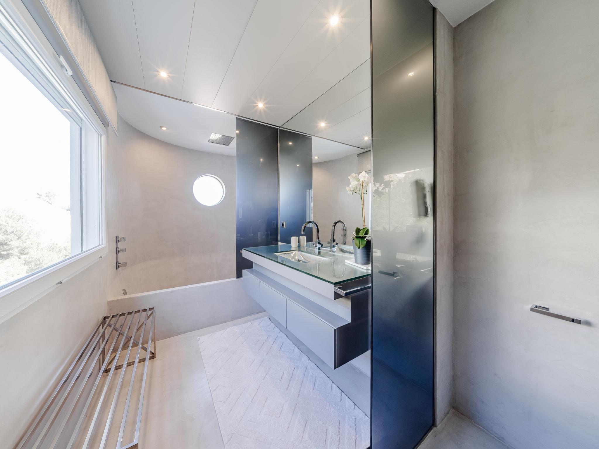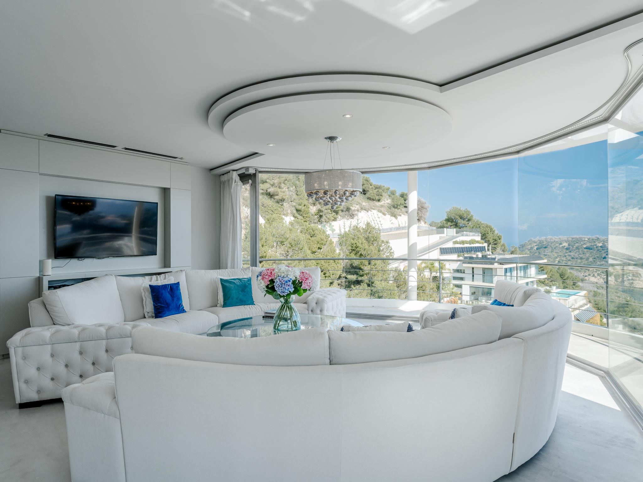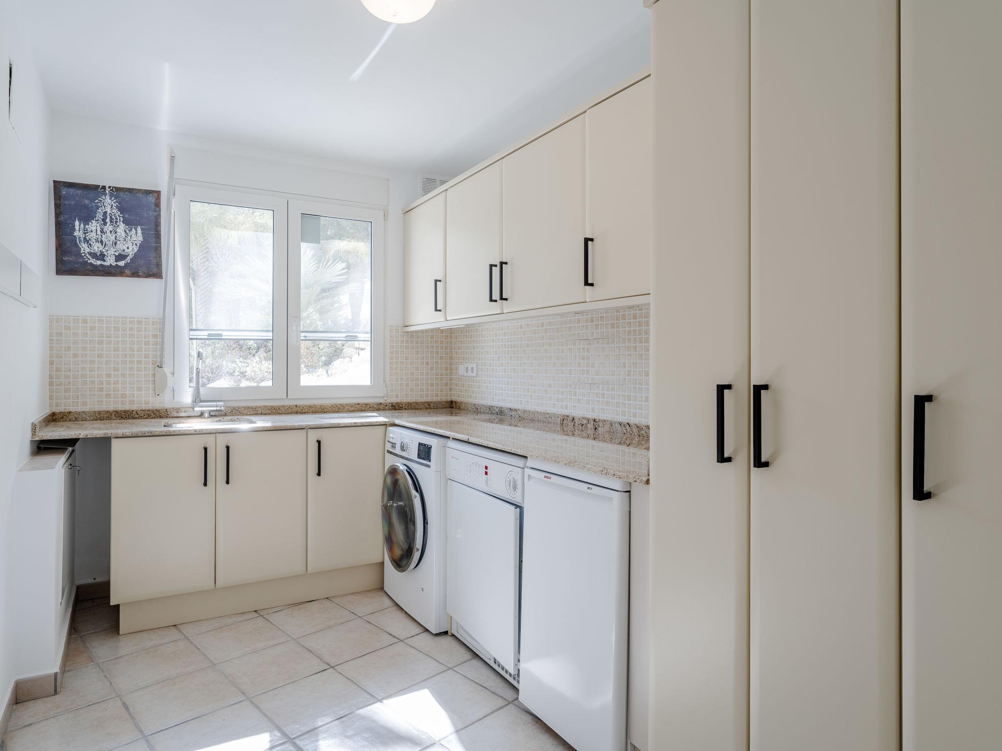 "Villa Tintorera Mar Azul", 6-room villa 300 m2 on 3 levels. Spacious and bright, renovated, very beautiful and stylish furnishings: living/dining room with satellite TV, air conditioning and forced-air heating. Exit to the terrace, to the swimming pool. 1 room with 1 french bed (200 cm, length 200 cm), bath/shower/WC, double hand-basin, air conditioning and forced-air heating. Exit to the terrace. Large, open kitchen (oven, dishwasher, 4 induction hot plates, toaster, kettle, microwave, freezer, electric coffee machine). Sep. WC. On the lower ground floor: living room with air conditioning and forced-air heating. 1 room with 1 french bed (200 cm, length 200 cm), bath/shower/WC, air conditioning and forced-air heating. Shower/WC. Upper floor: living room with satellite TV, air conditioning and forced-air heating. Exit to the terrace. 1 room with 1 french bed (180 cm, length 200 cm), bath/WC, air conditioning and forced-air heating. 1 room with 1 french bed (180 cm, length 200 cm), bath/WC, air conditioning and forced-air heating. 2 large terraces. Terrace furniture, barbecue, covered balcony, sitting area. Marvellous panoramic view of the sea and the valley. Facilities: washing machine, dryer, iron, mosquito net, children's high chair, baby cot, hair dryer. Internet (WiFi, free). Parking. Not suitable for small children. CV-VUT0520549-A // Reg. Nr.: ESFCTU0000030710004370560000000000000CV-VUT0520549-A2