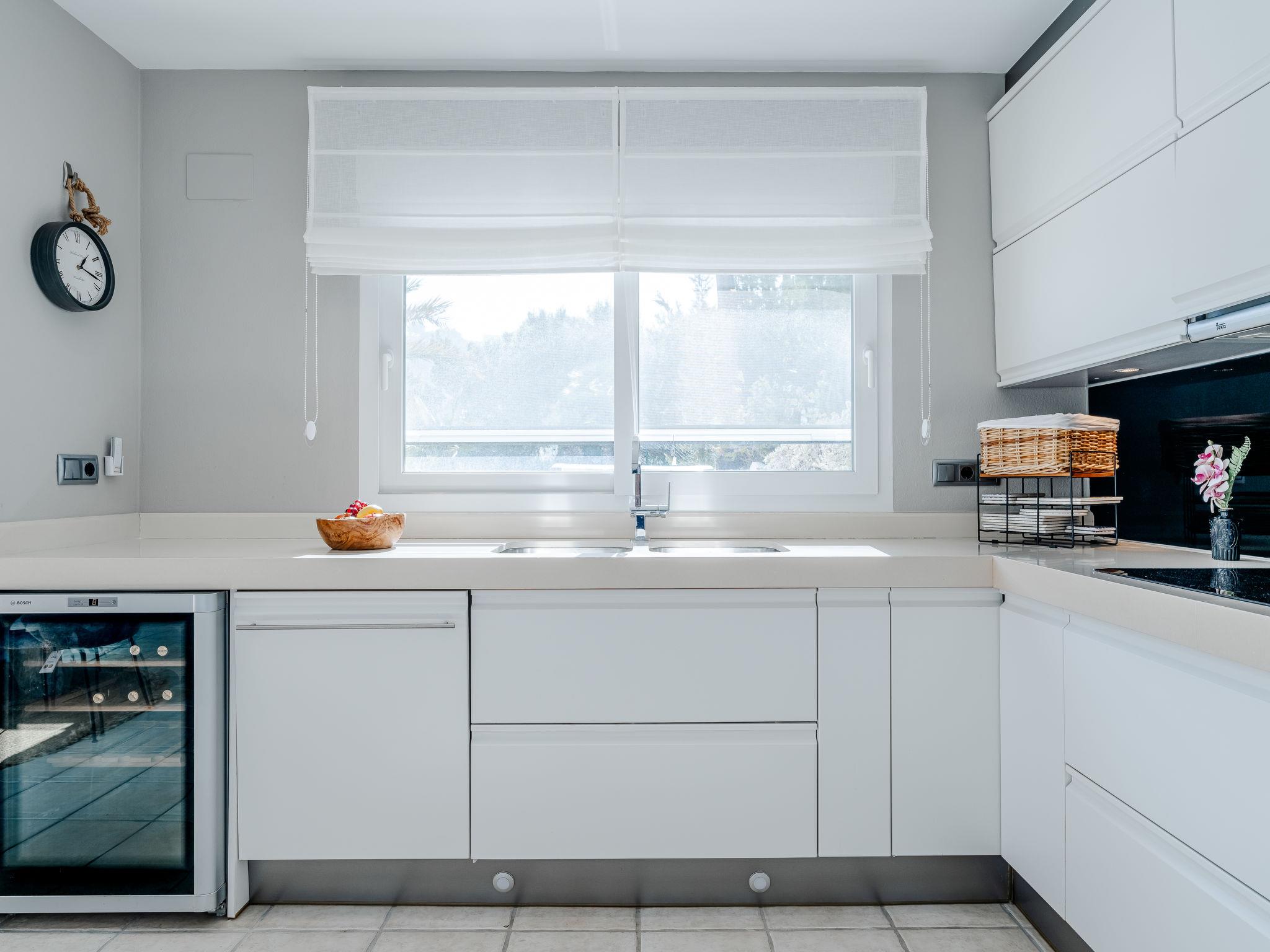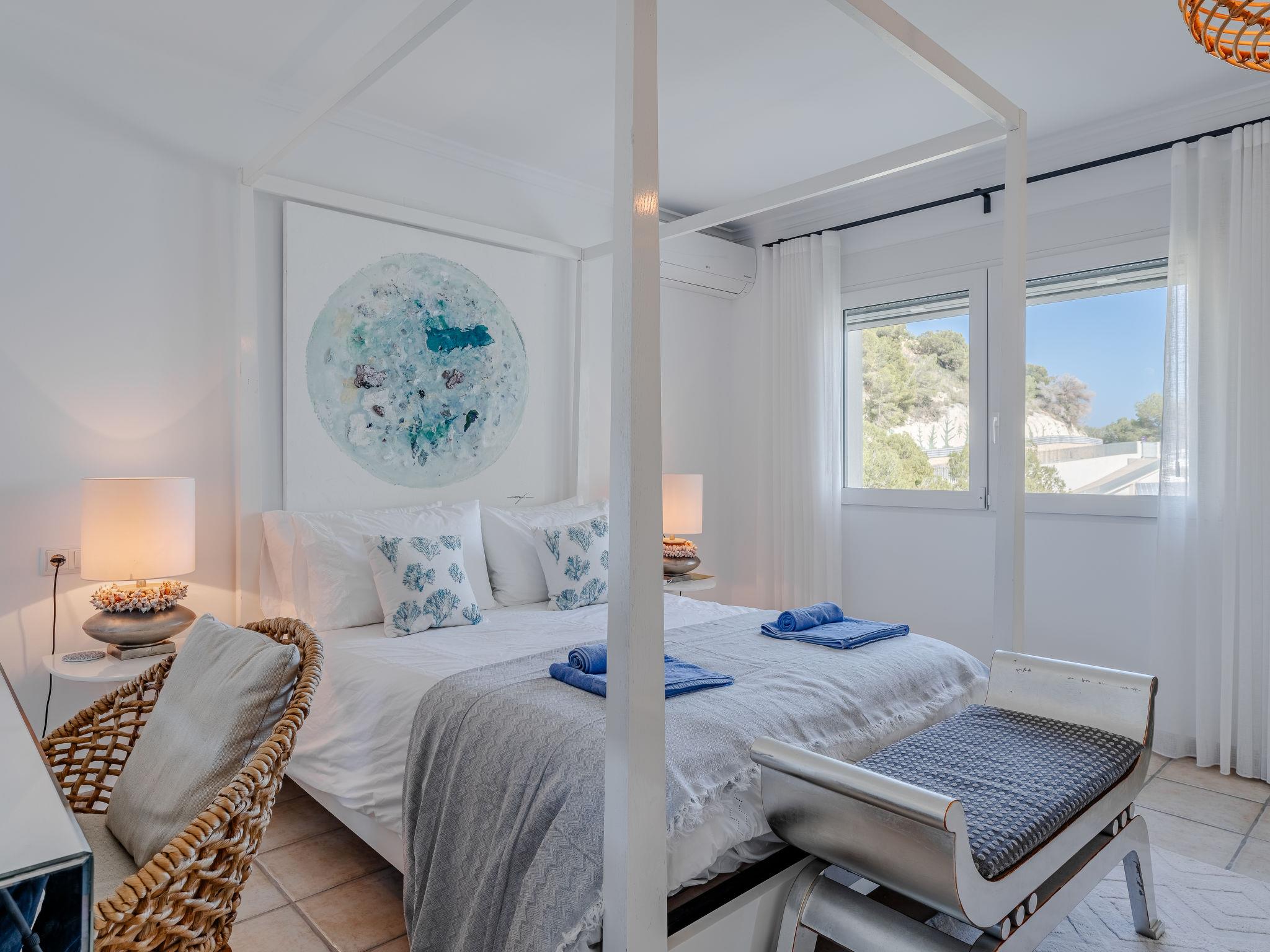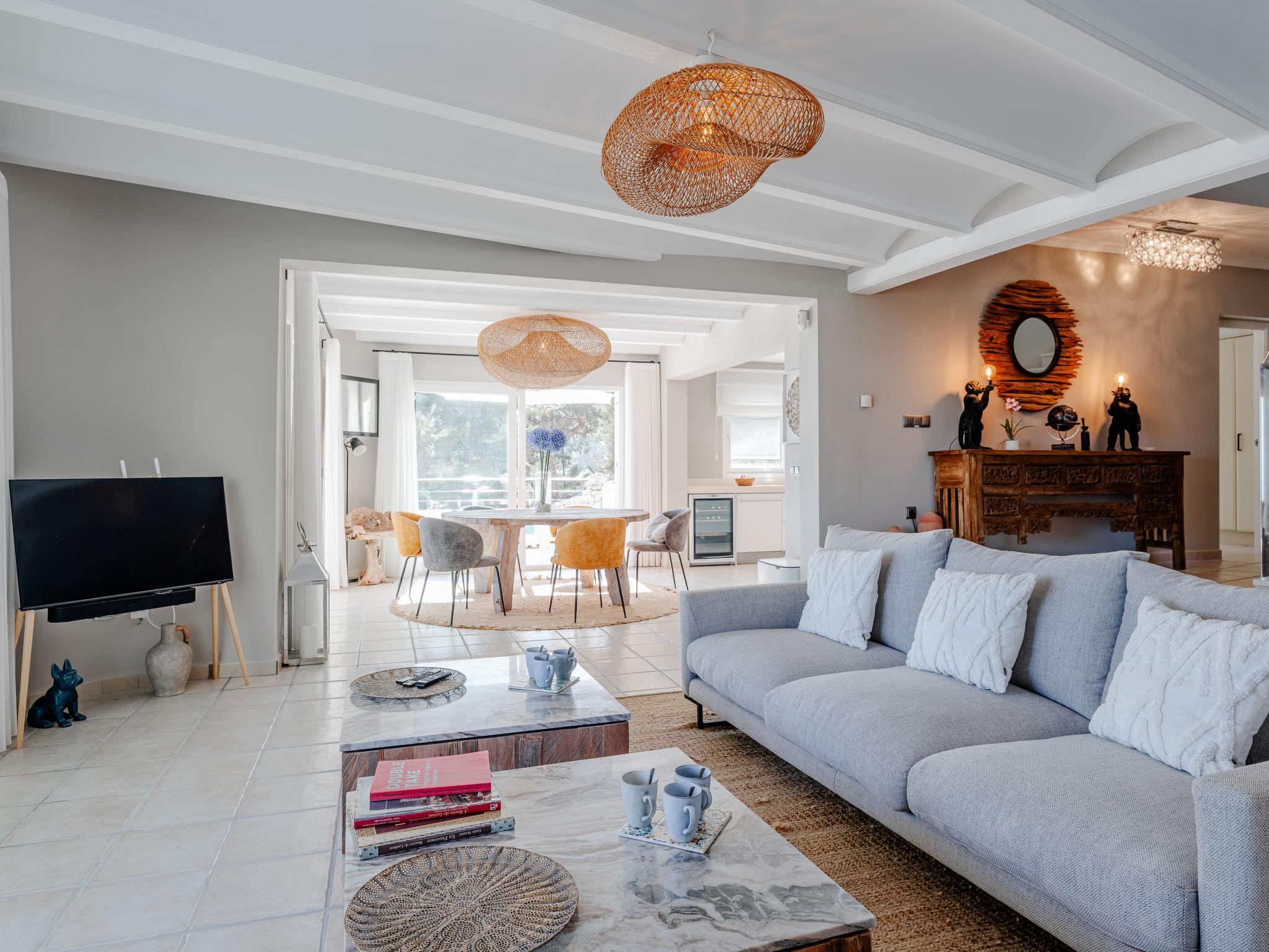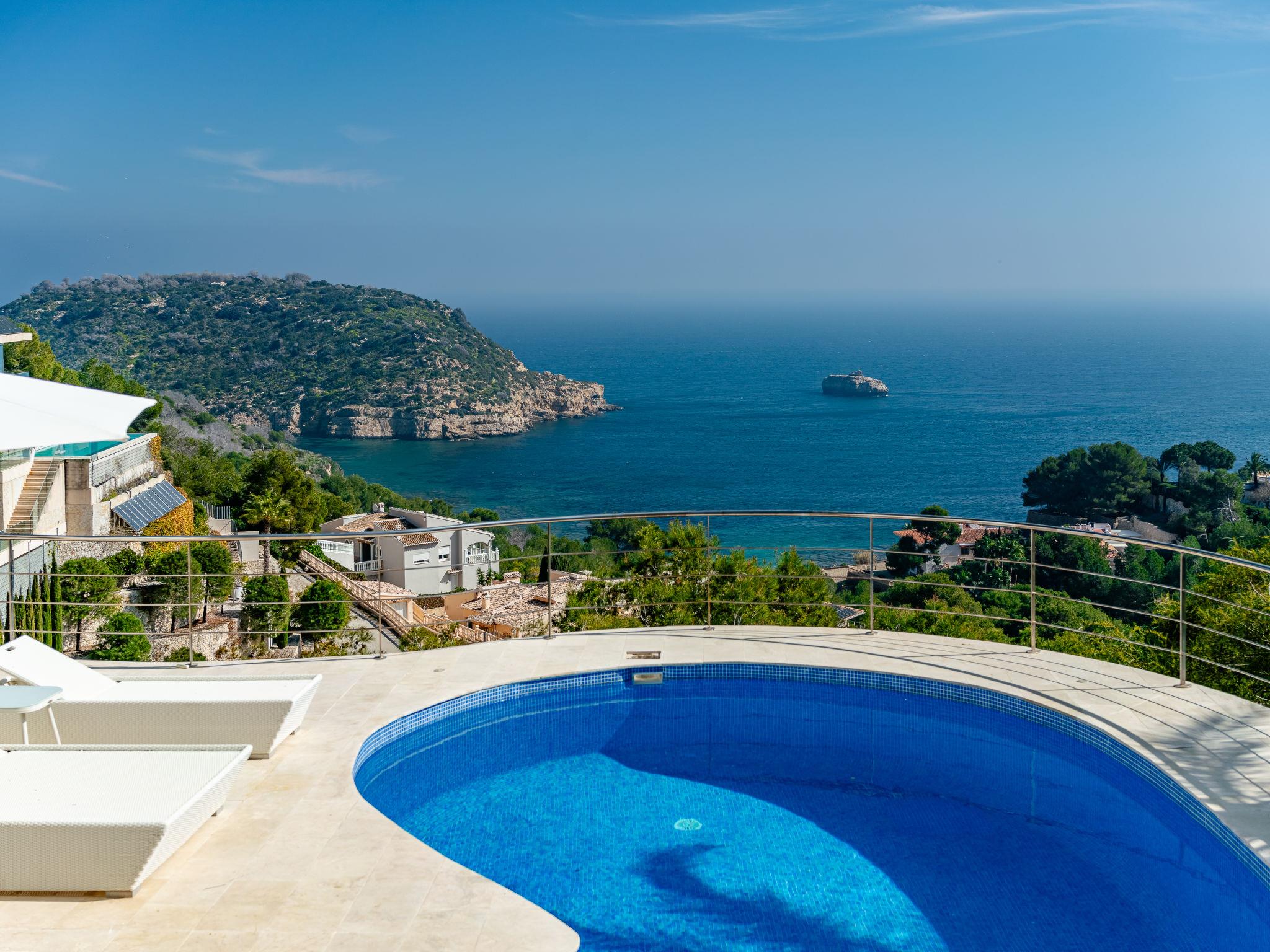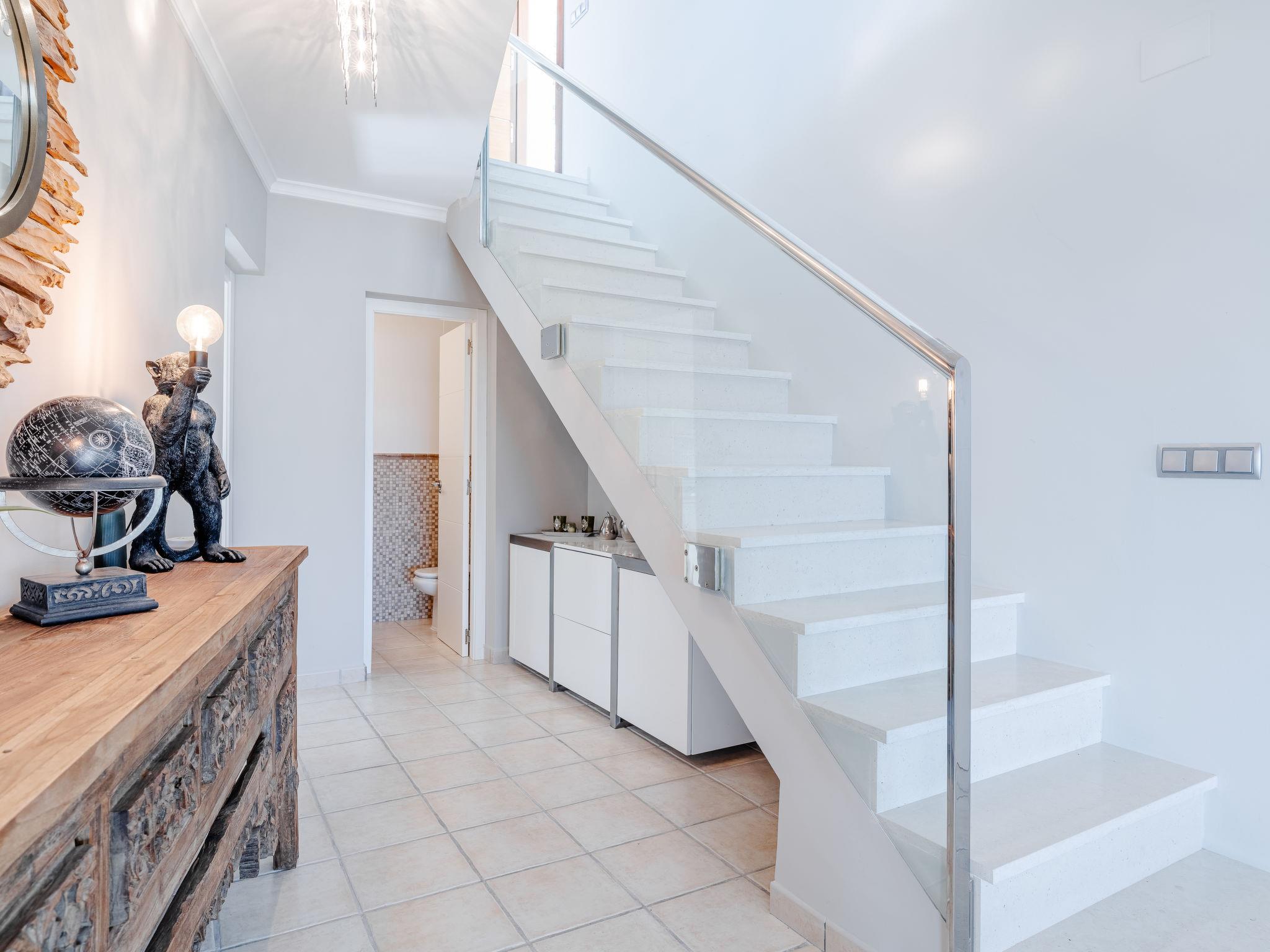 Very large, modern, very luxurious villa "Tintorera Mar Azul", 3 storeys, built in 2021. In the district of Mar Azul - Portitchol, in a quiet, sunny position, 900 m from the sea, 900 m from the beach, in a cul-de-sac. Private: large, beautiful, well-kept terraced garden with wildlife garden and trees, swimming pool kidney shaped, heated (9 x 4 m, depth 110 - 160 cm, seasonal availability: 01.Jan. - 31.Dec.) with internal staircase. Outdoor shower, pergola, terrace, garden furniture, barbecue house. In the house: central heating system, air conditioning, laundry, washing machine, tumble dryer. Parking (for 3 cars) on the premises. Shop 2.7 km, supermarket 3.7 km, restaurant, café 950 m, bus stop "Parada Toscamar" 3.2 km, sandy beach "El Arenal" 5 km, shingle beach "Cala Barraca o Portitxol" 950 m. Surf school 950 m, tennis 3.7 km. Please note: not suitable for small children. The owner does not accept any youth groups.