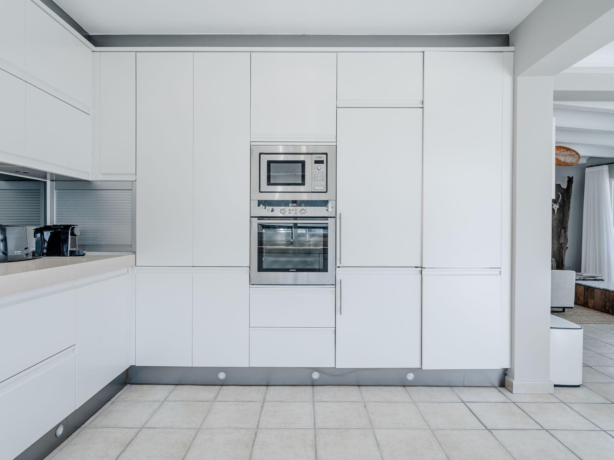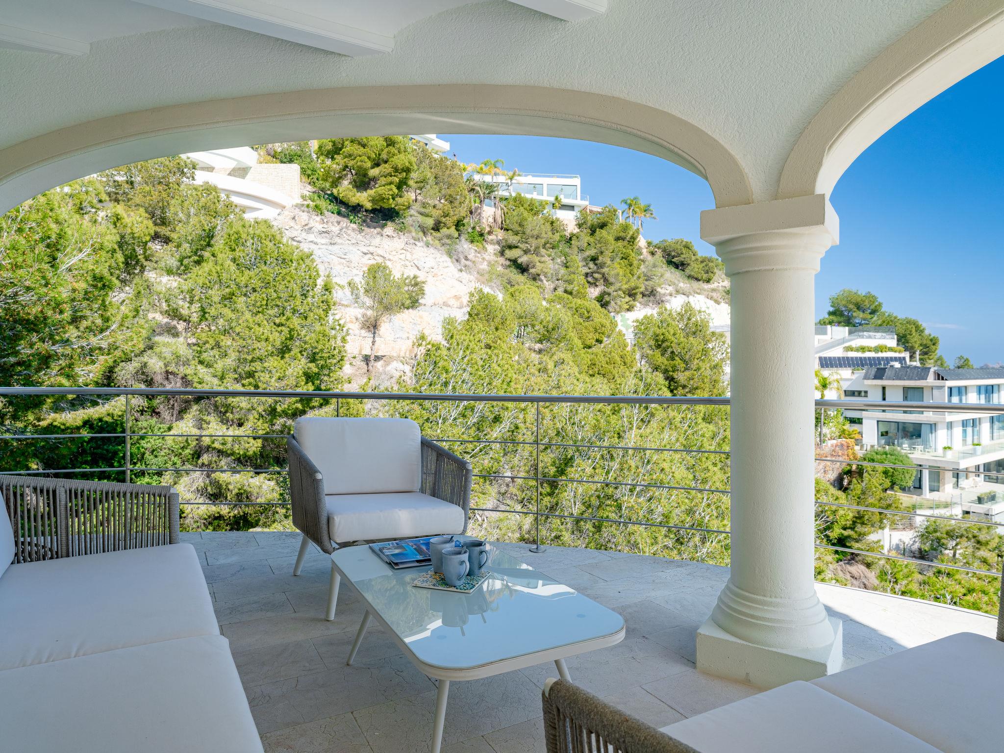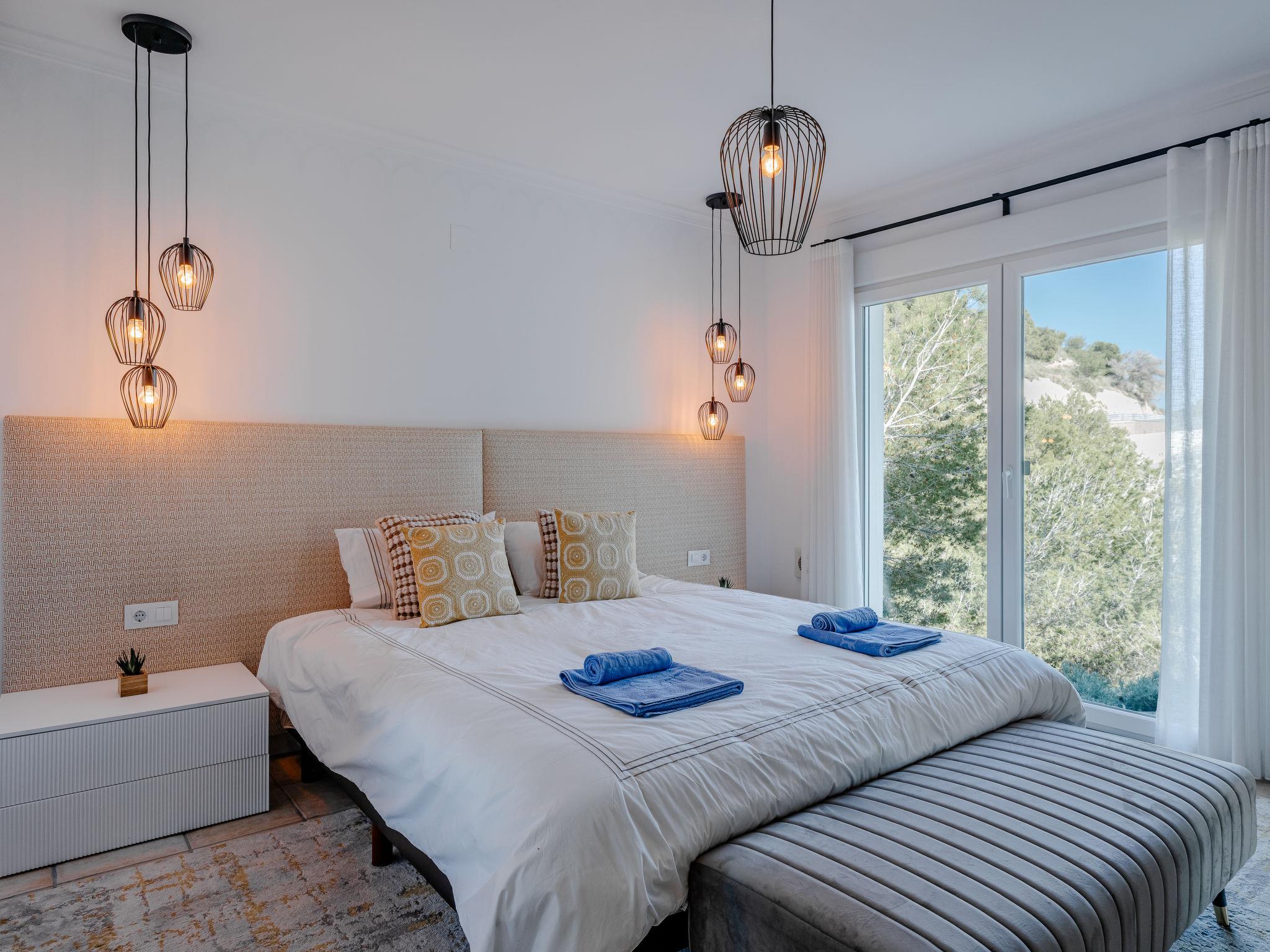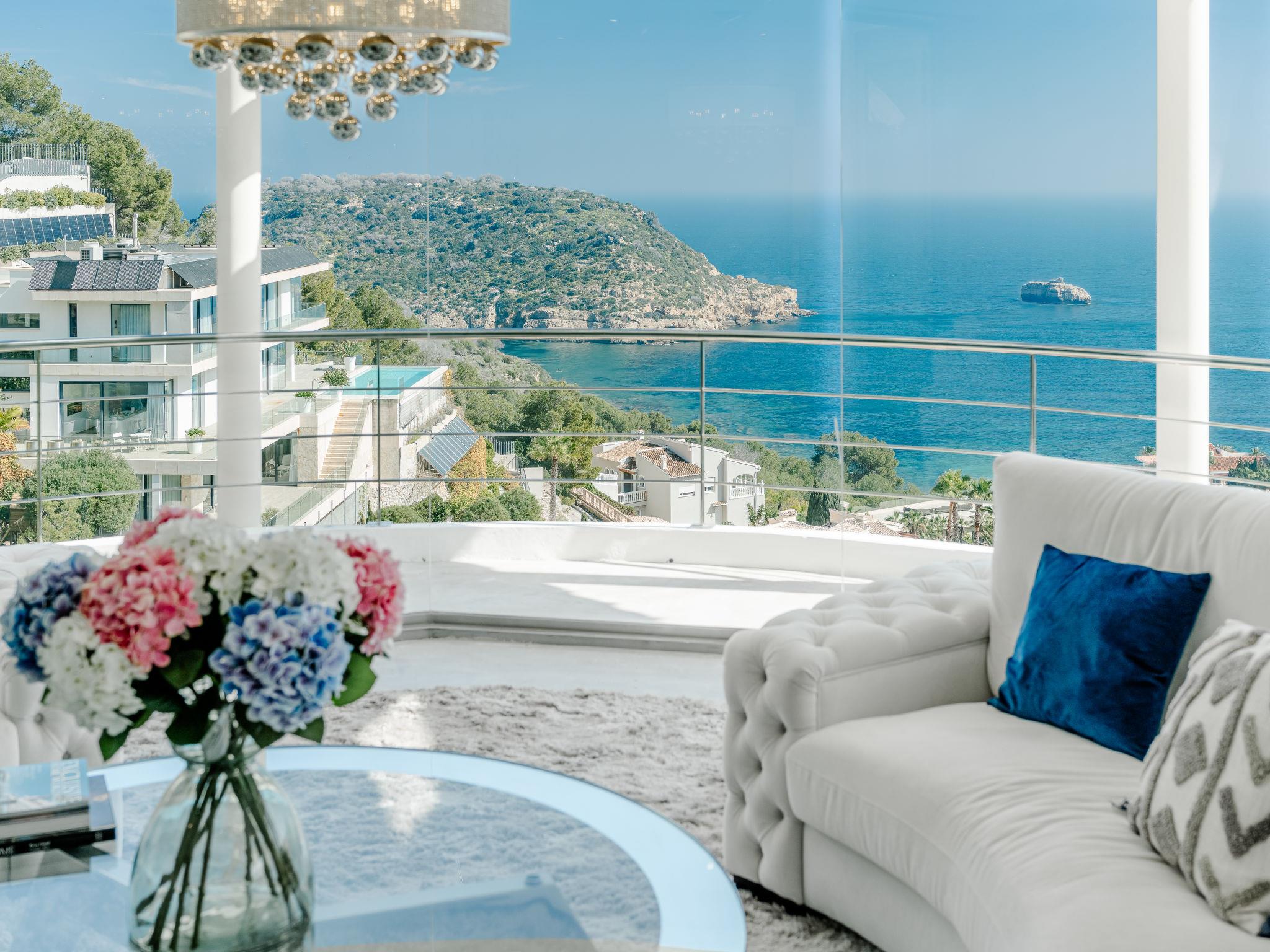 Very large, modern, very luxurious villa "Tintorera Mar Azul", 3 storeys, built in 2021. In the district of Mar Azul - Portitchol, in a quiet, sunny position, 900 m from the sea, 900 m from the beach, in a cul-de-sac. Private: large, beautiful, well-kept terraced garden with wildlife garden and trees, swimming pool kidney shaped, heated (9 x 4 m, depth 110 - 160 cm, seasonal availability: 01.Jan. - 31.Dec.) with internal staircase. Outdoor shower, pergola, terrace, garden furniture, barbecue house. In the house: central heating system, air conditioning, laundry, washing machine, tumble dryer. Parking (for 3 cars) on the premises. Shop 2.7 km, supermarket 3.7 km, restaurant, café 950 m, bus stop "Parada Toscamar" 3.2 km, sandy beach "El Arenal" 5 km, shingle beach "Cala Barraca o Portitxol" 950 m. Surf school 950 m, tennis 3.7 km. Please note: not suitable for small children. The owner does not accept any youth groups.